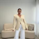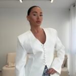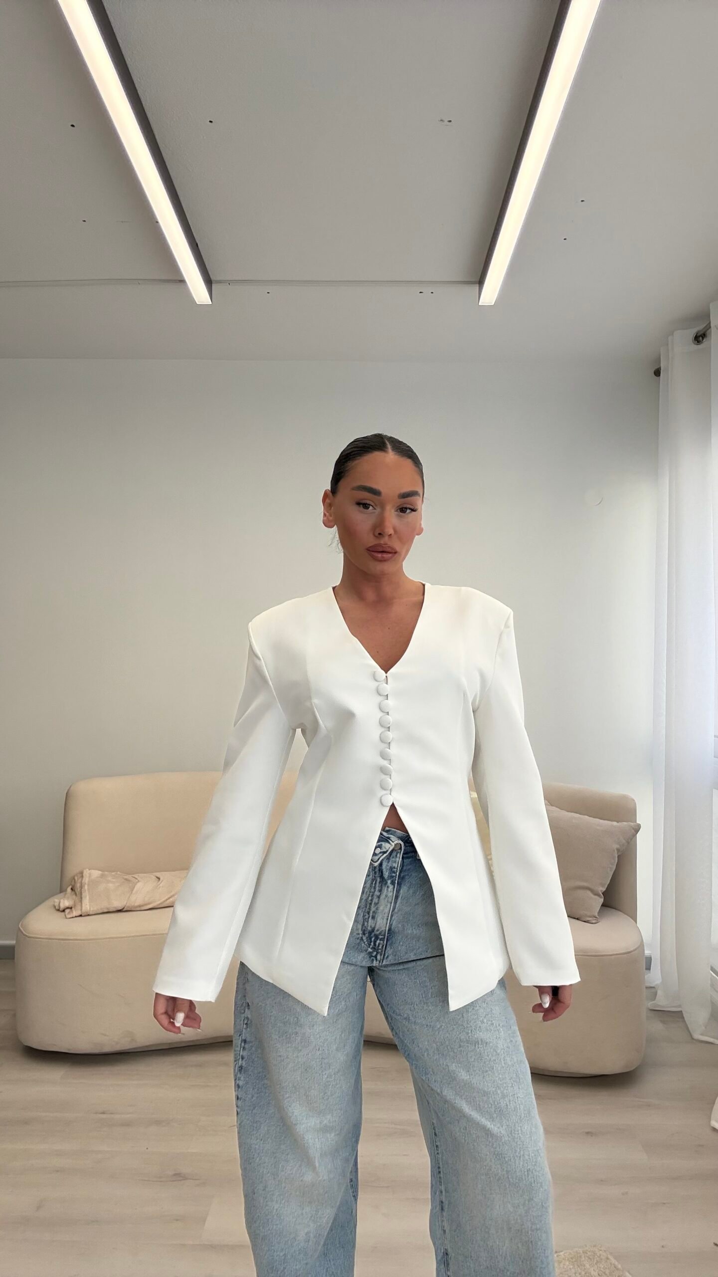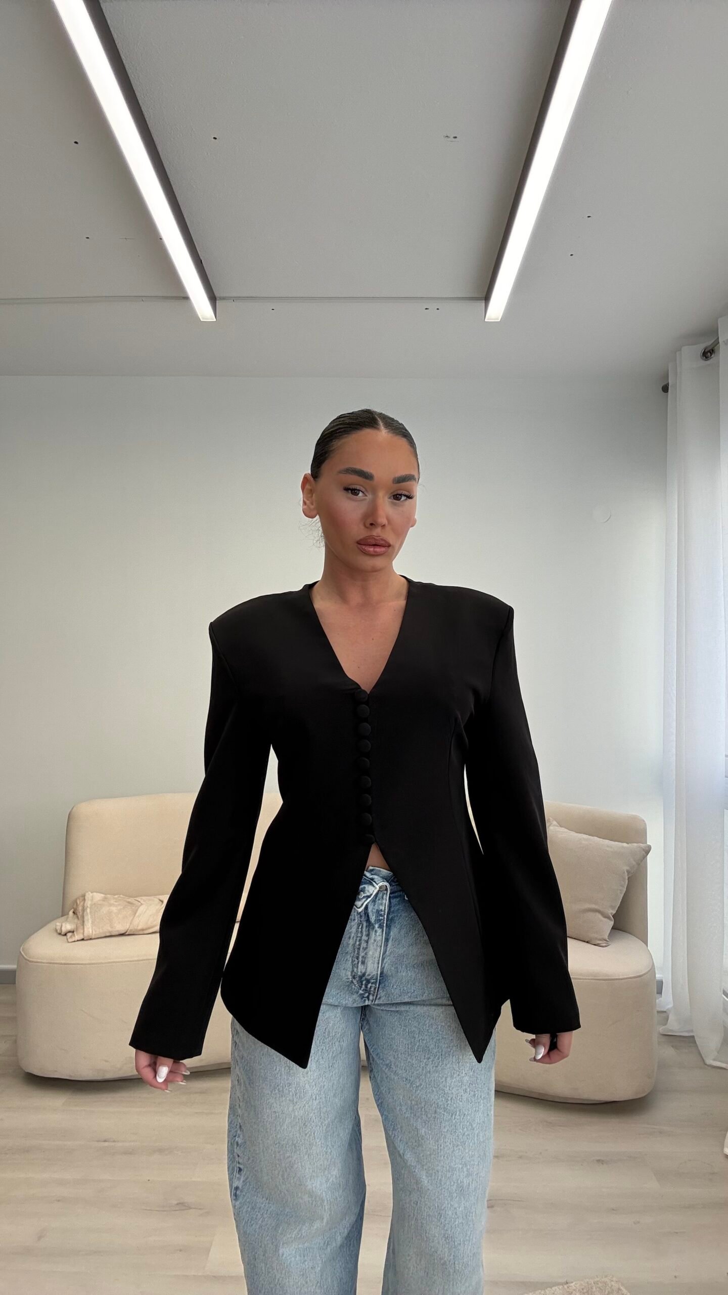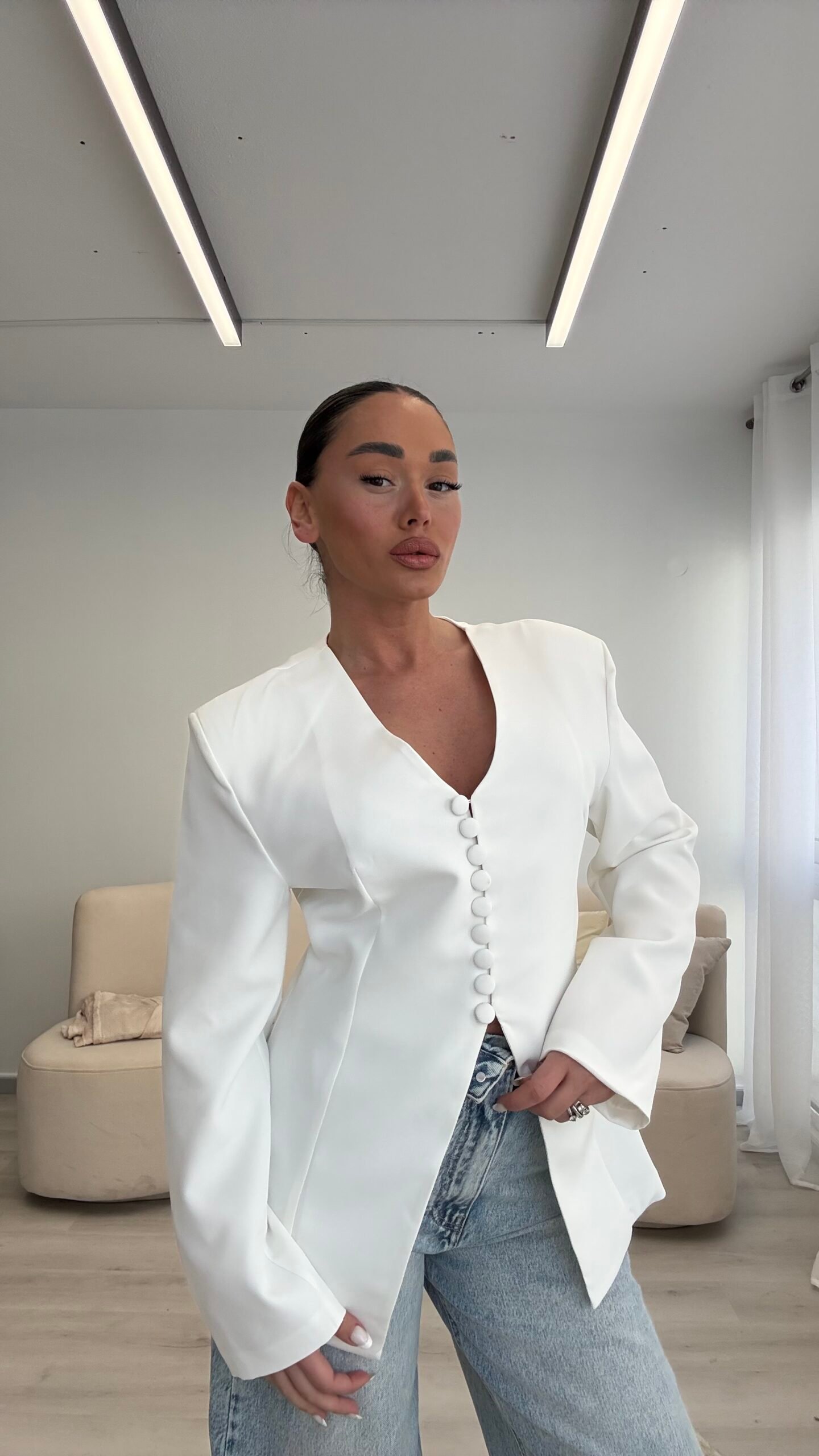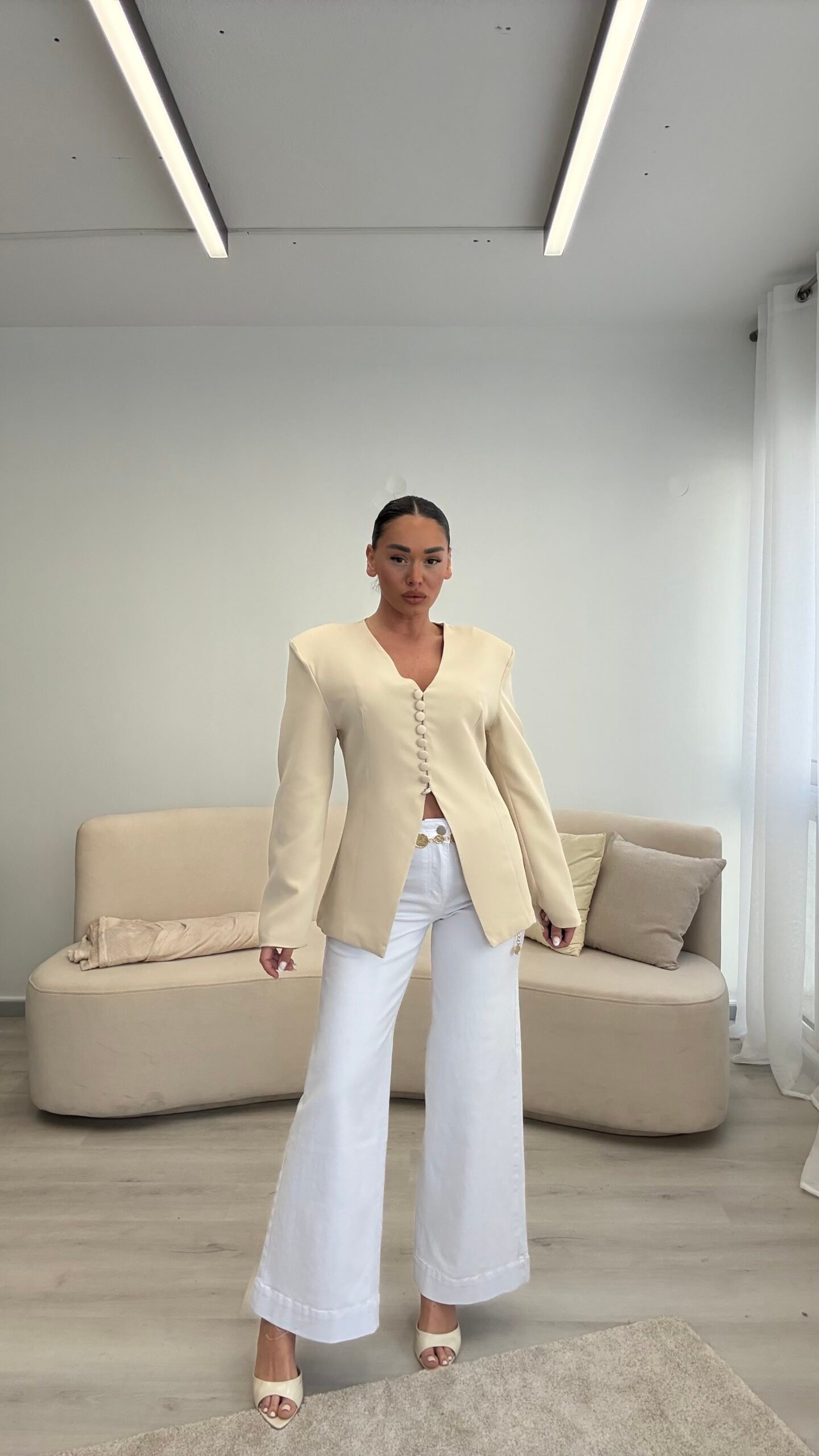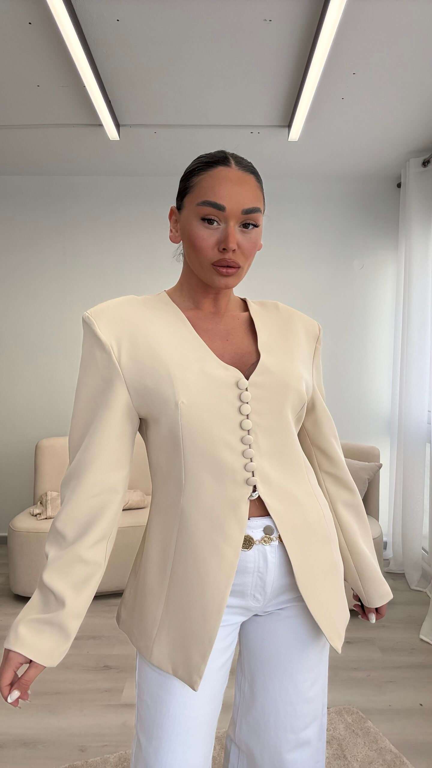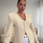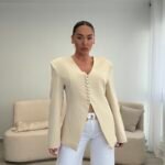 Blazer elegant me prerje të strukturuar që thekson siluetën dhe krijon një pamje moderne dhe shumë të rafinuar. Dizajni me jakë V dhe kopsa funksionale përpara i jep një stil minimalist dhe shumë chic. Ideale për kombinime të ndryshme, nga look casual me xhinse deri tek veshje më elegante për evente apo dalje në qytet. Një pjesë klasike dhe shumë e lehtë për t’u stiluar në çdo sezon.