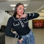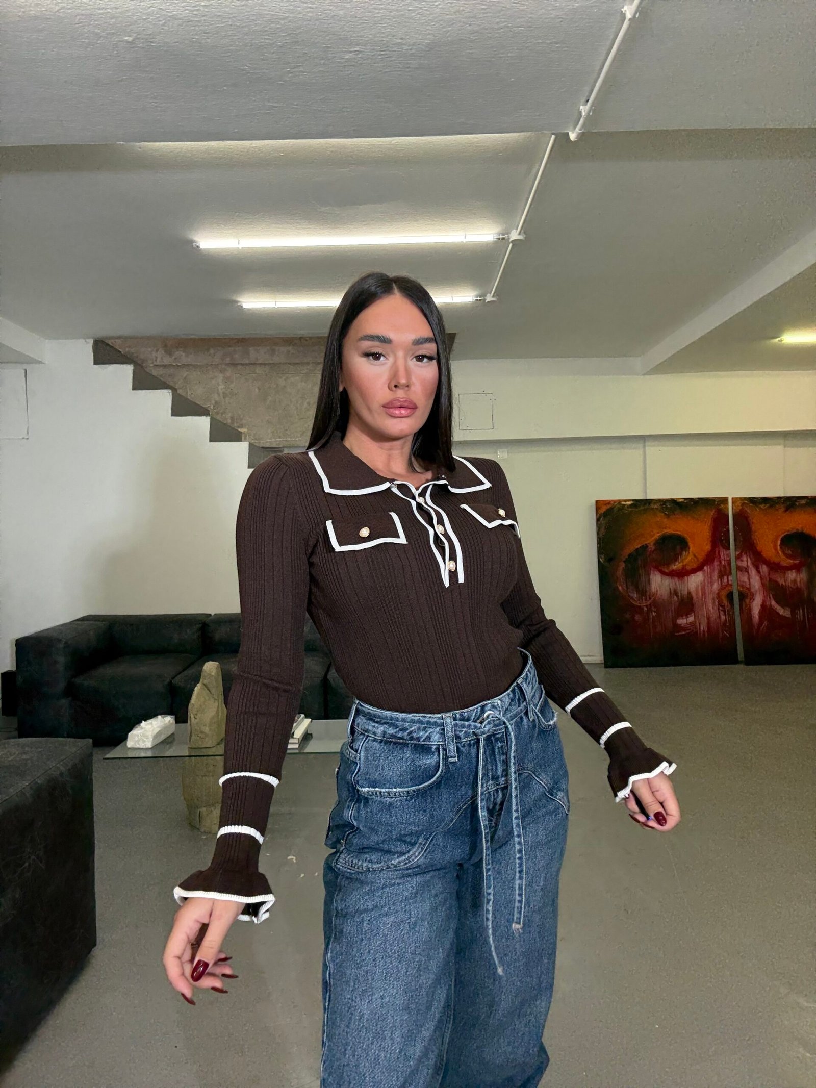 Bluze elegante me stil klasik e modern njëkohësisht, me detaje të bardha kontrasti përgjatë jakës, mëngëve dhe xhepave dekorativë. Kopsat me efekt perle shtojnë një prekje luksoze dhe femërore.