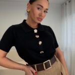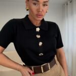 Bluzë fine me jakë klasike dhe kopsa dekorative gold statement, model elegant që krijon look të kuruar. Material i butë dhe elastik, ideal për kombinime zyre, darke apo smart casual.