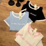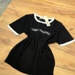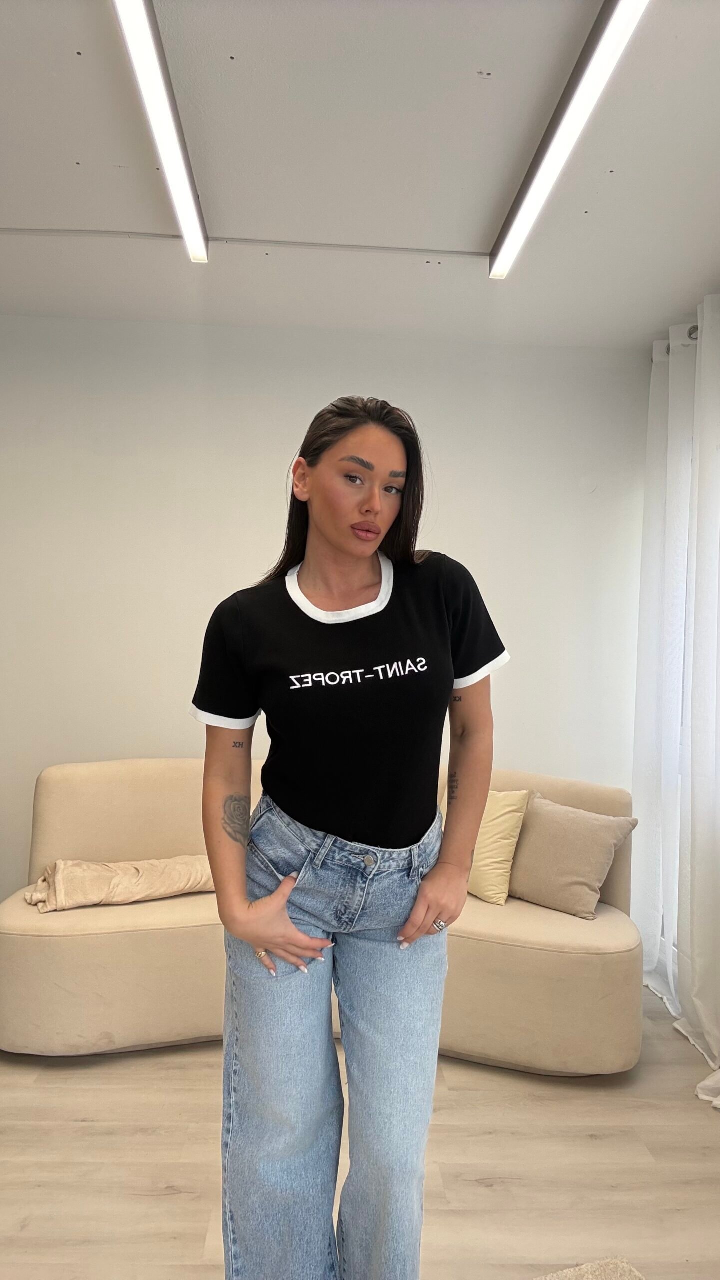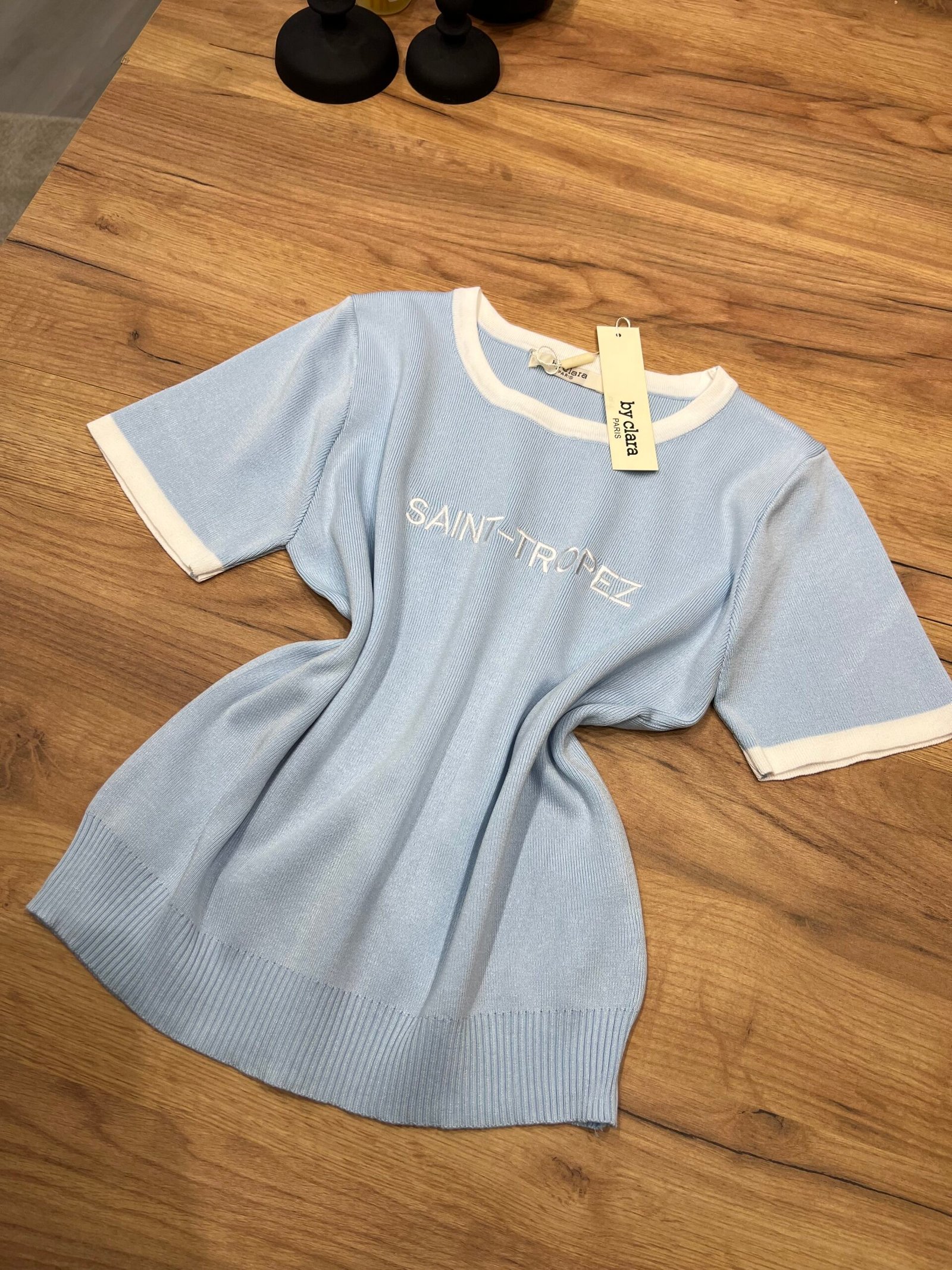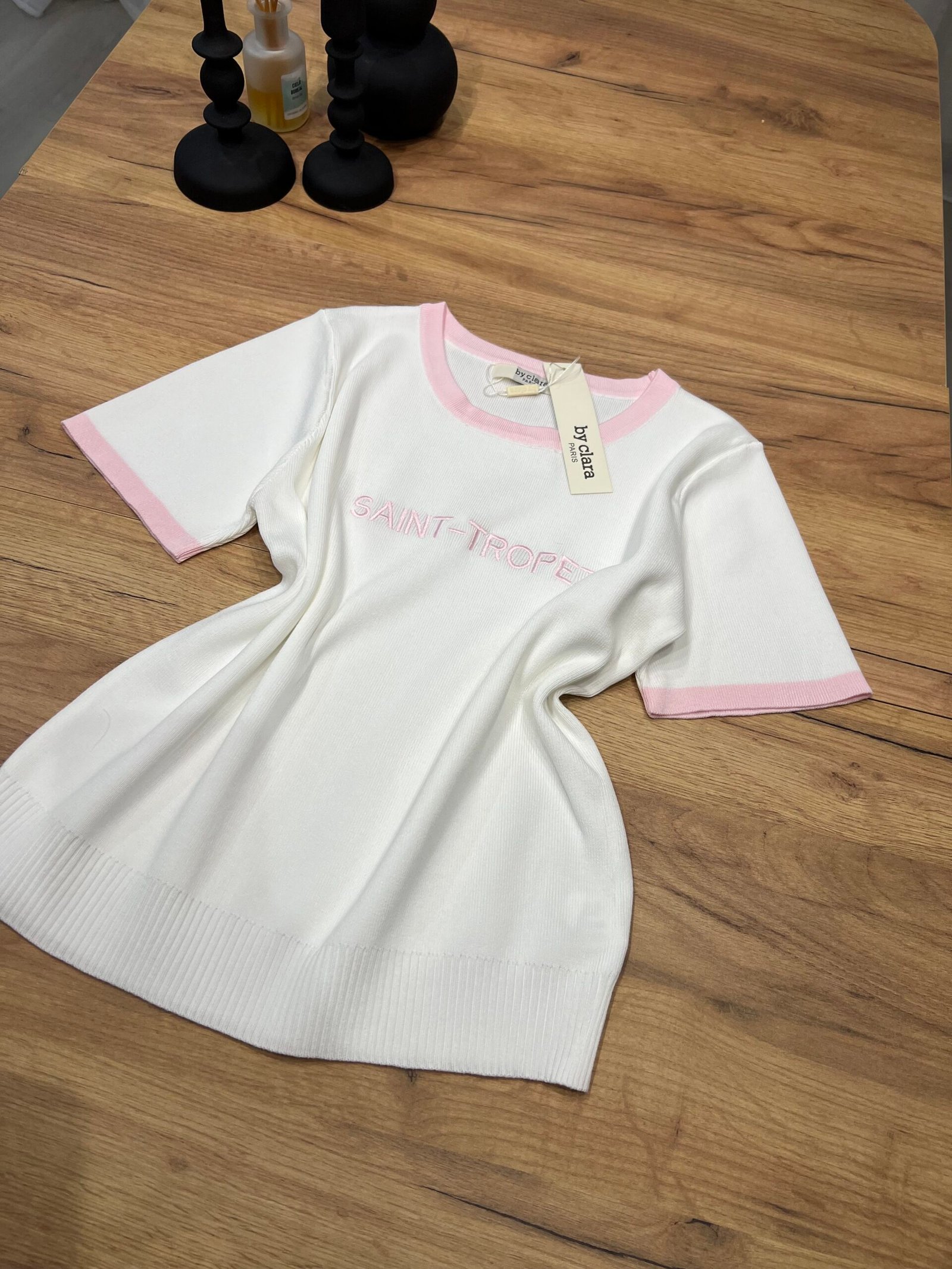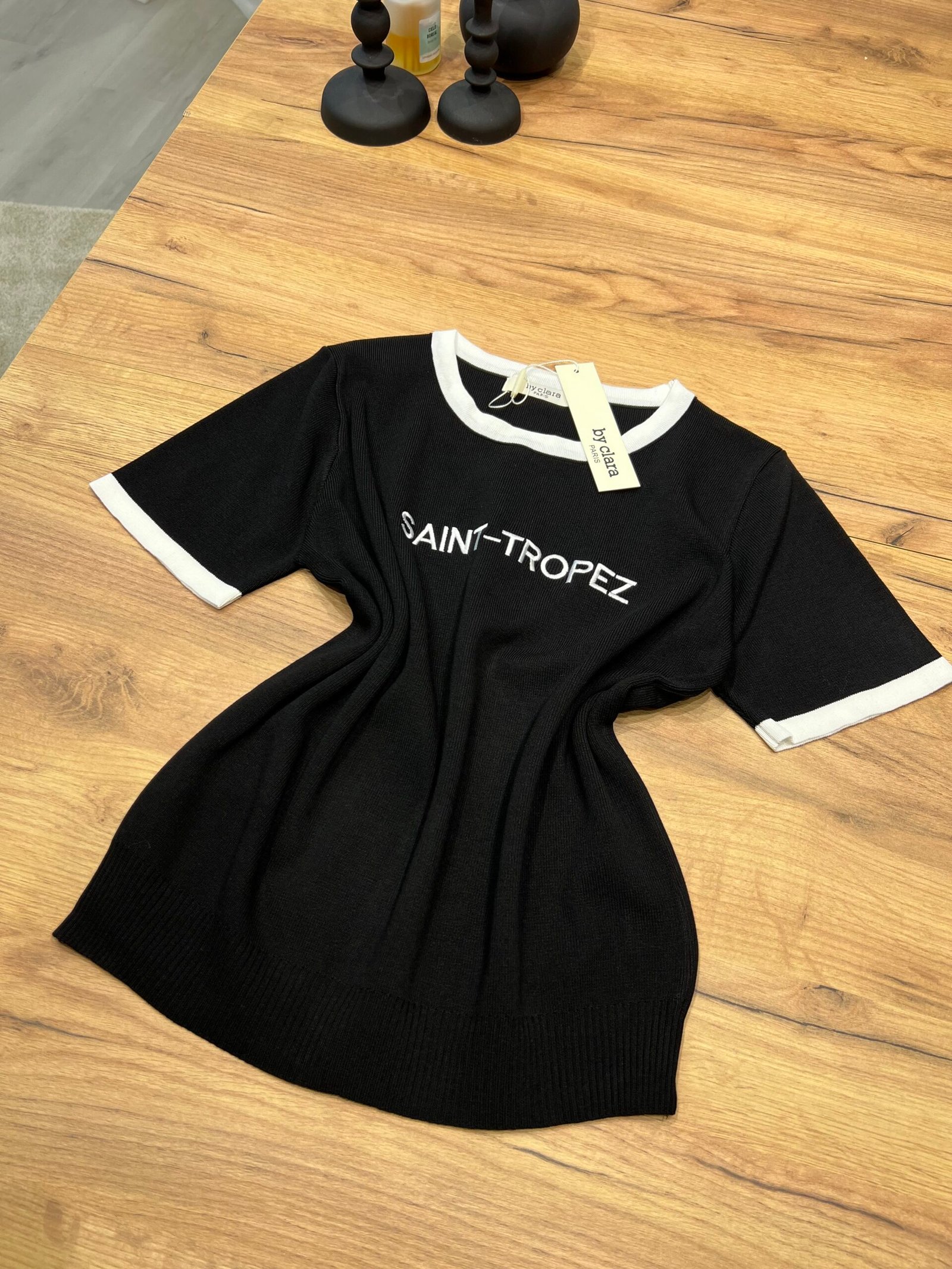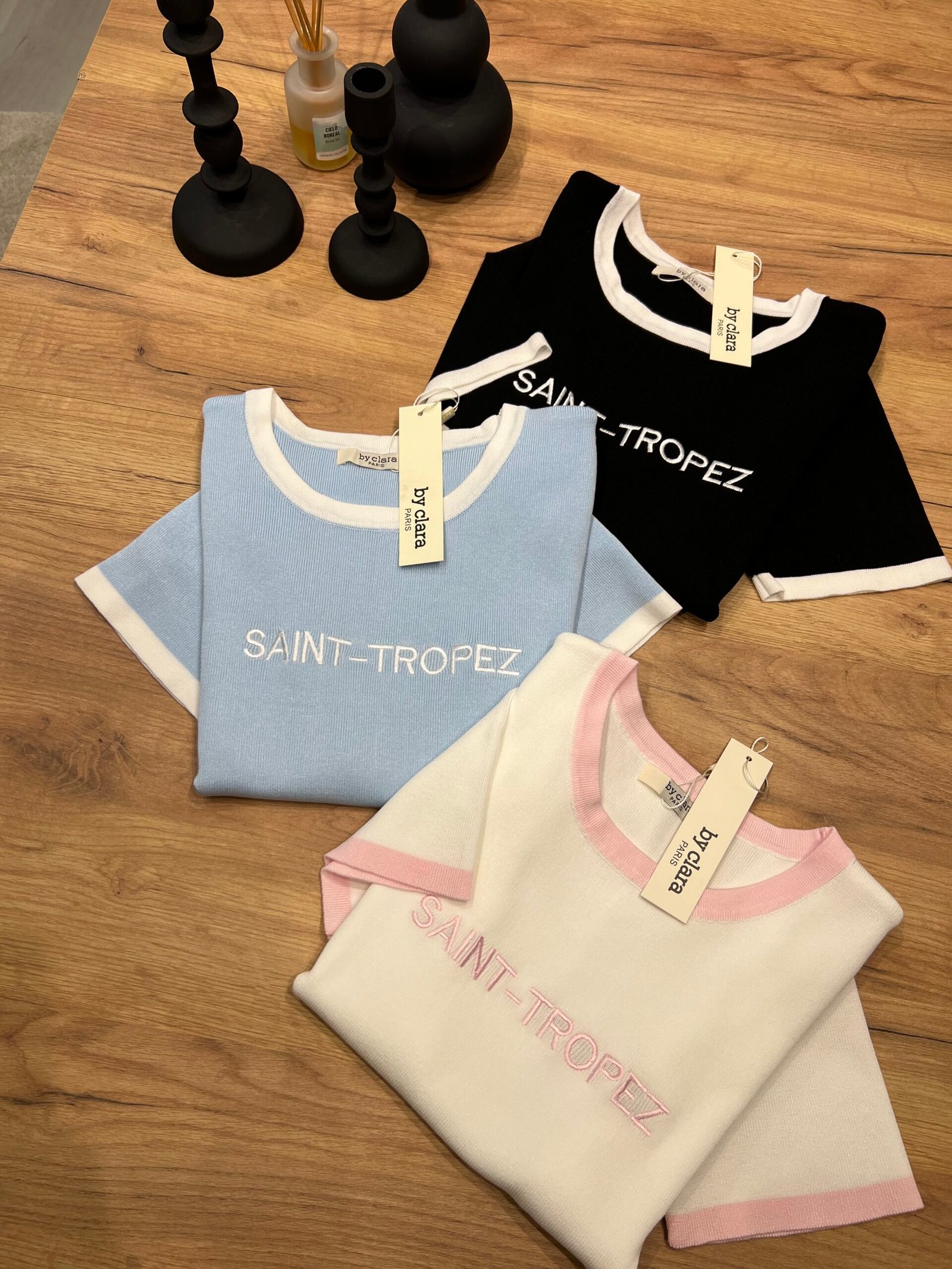 Bluzë fine me mëngë të shkurtra dhe detaje kontrasti në jakë dhe mëngë, e personalizuar me logo “Saint-Tropez”. Model elegant casual që përqafon siluetën dhe krijon look veror, fresh dhe minimal.