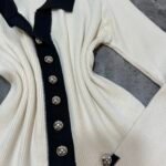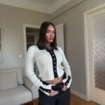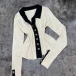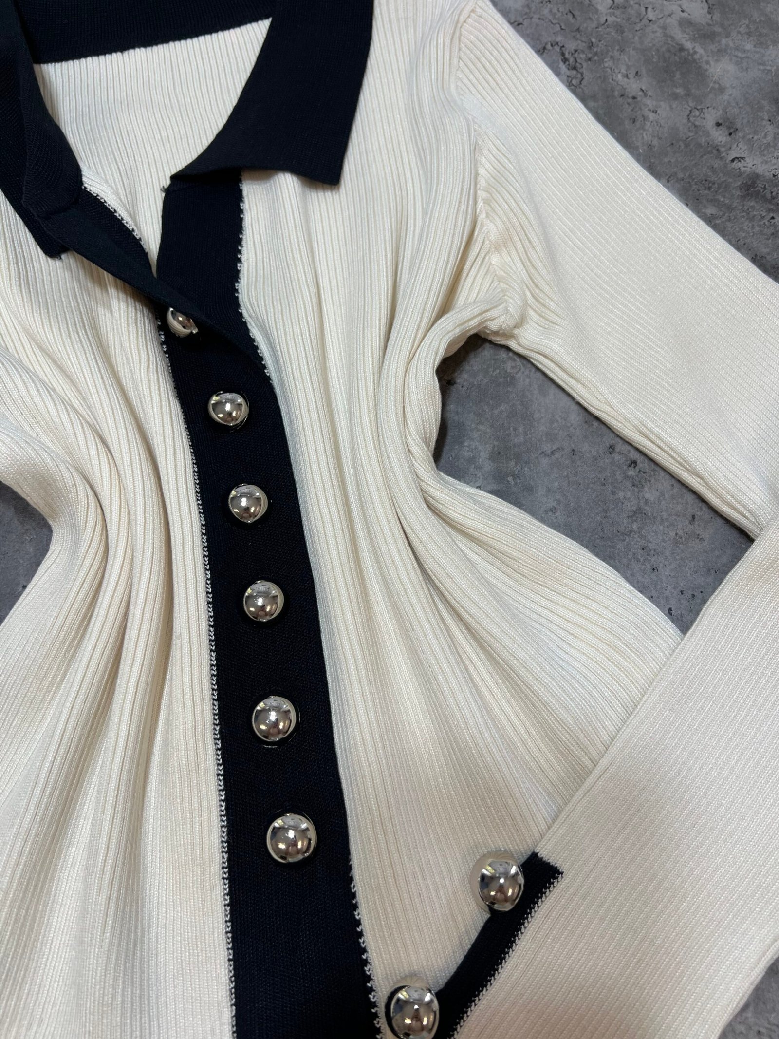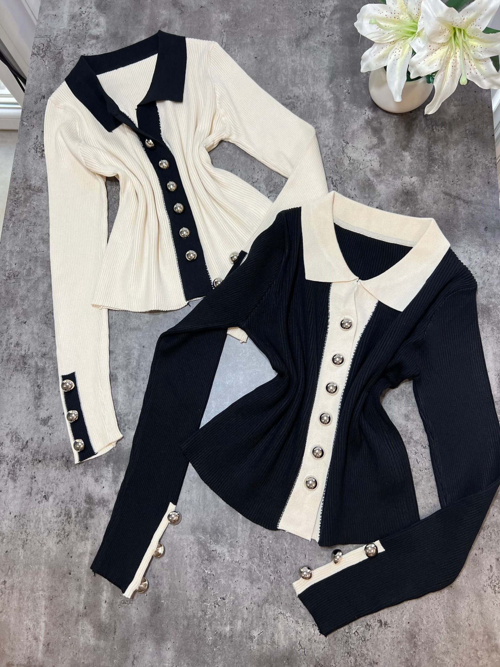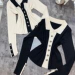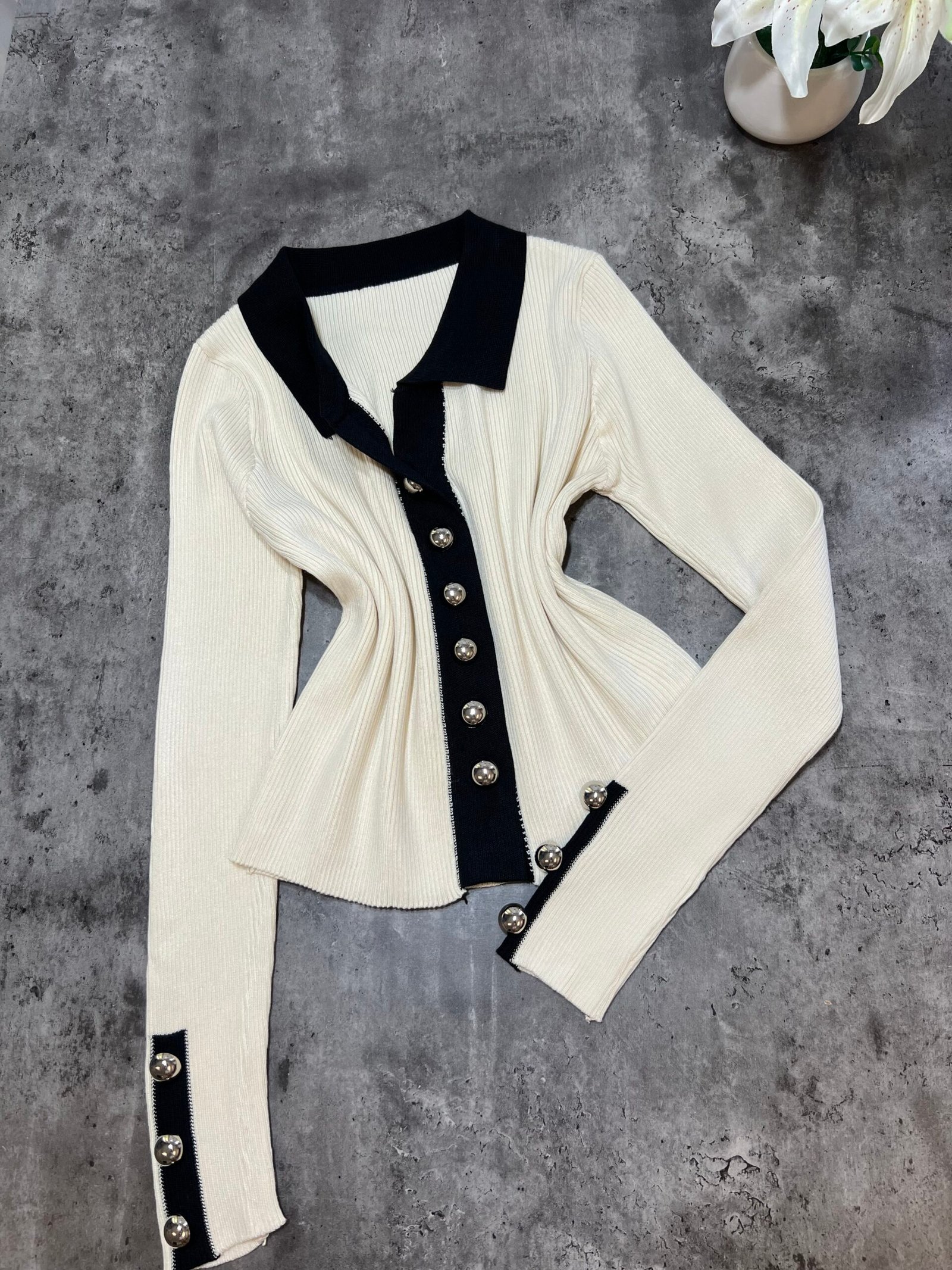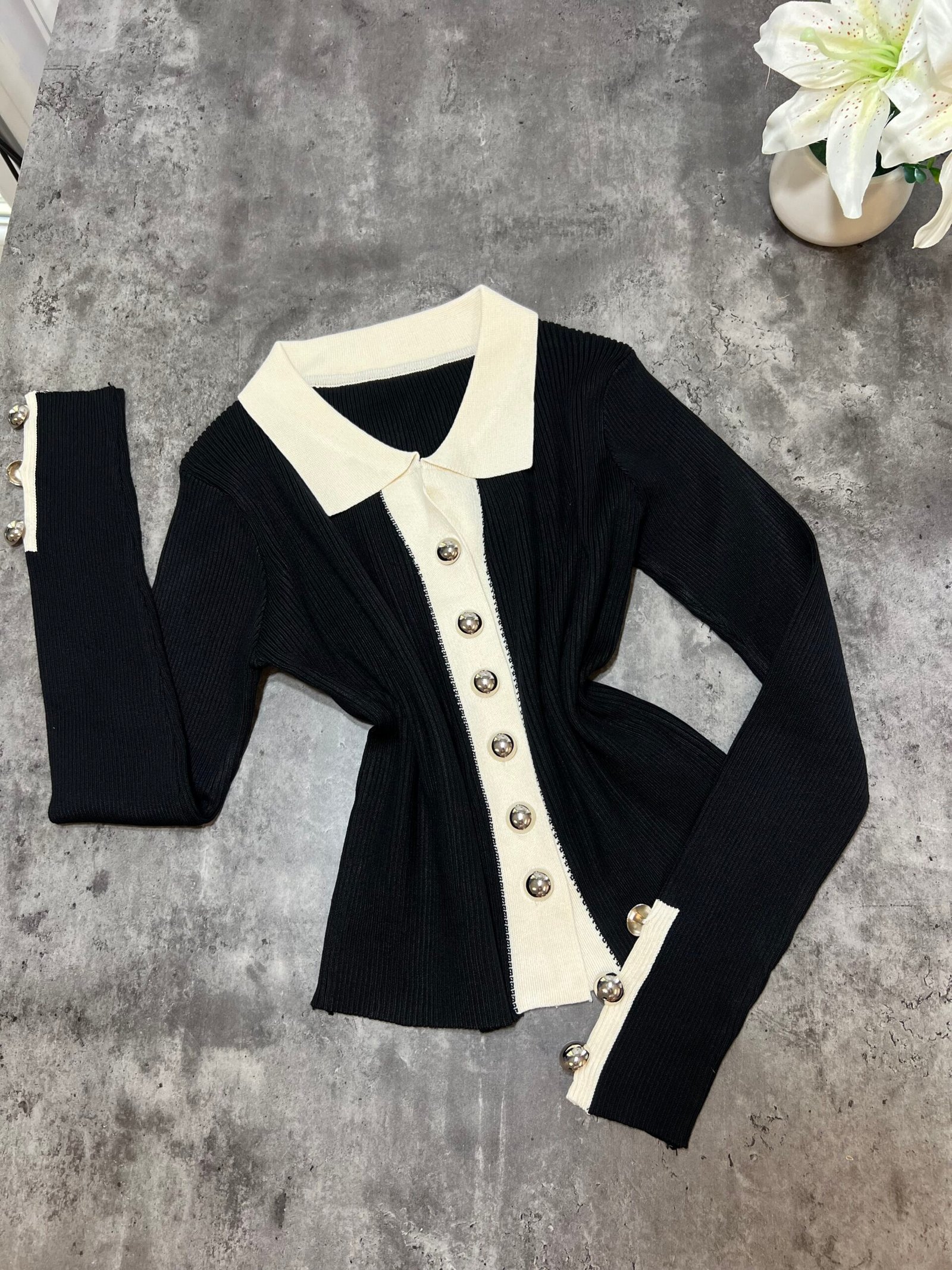 Një bluzë e rafinuar që kombinon elegancën klasike me stilin modern. Me kontrast ngjyrash dhe kopsat dekorative të mëdha, është një pjesë që tërheq vëmendjen menjëherë. Copë e punuar me damarë, elastike.