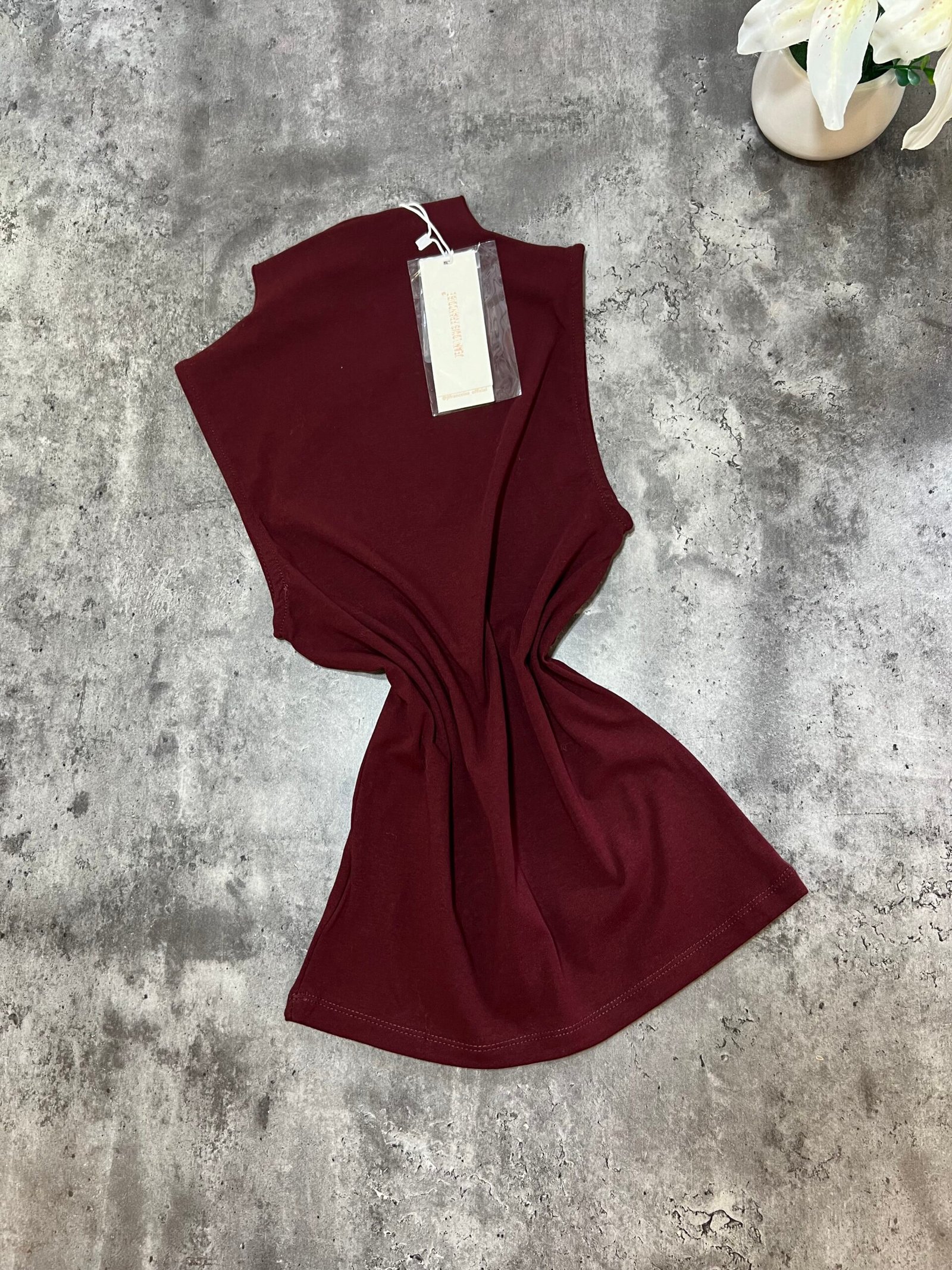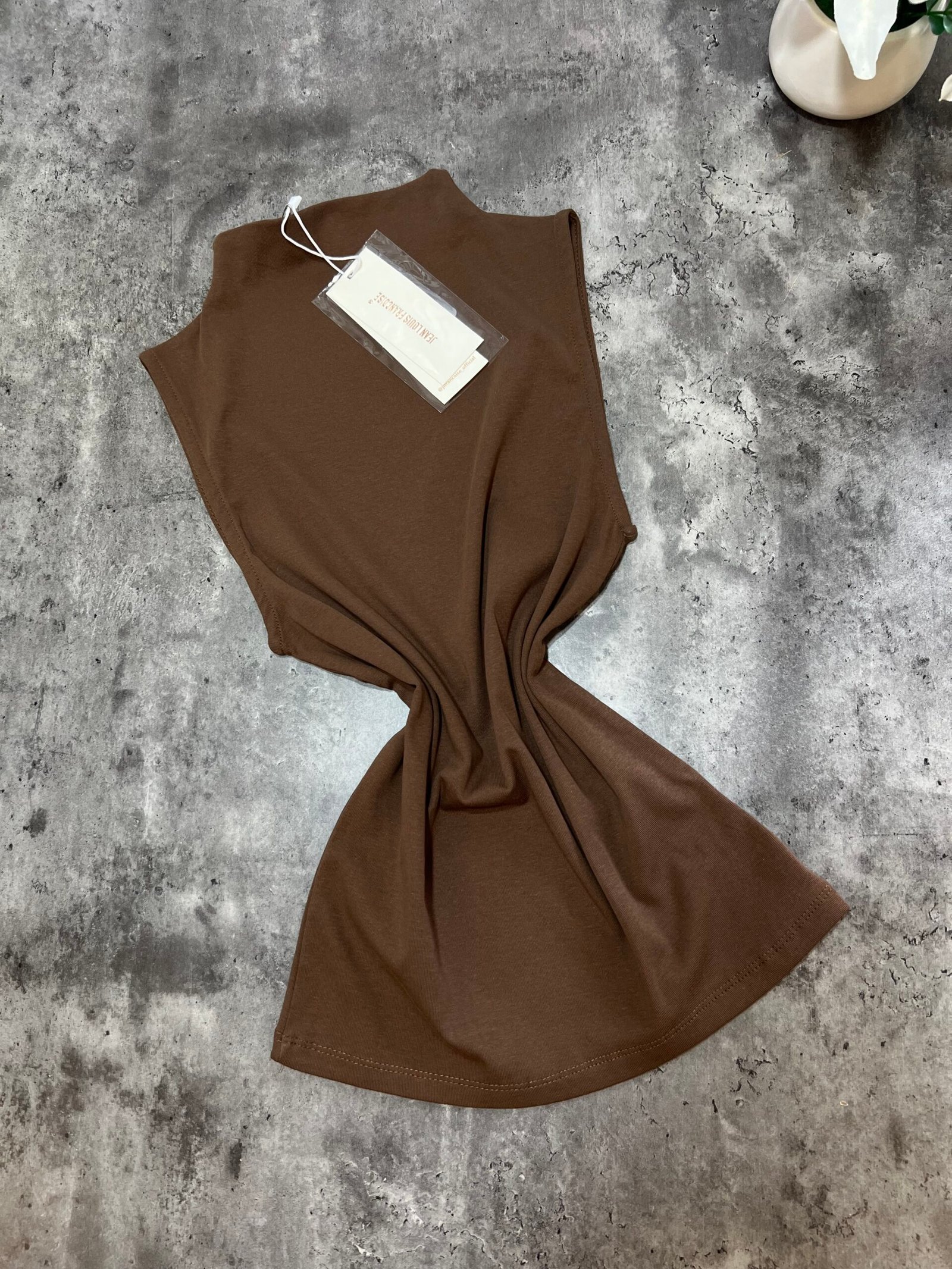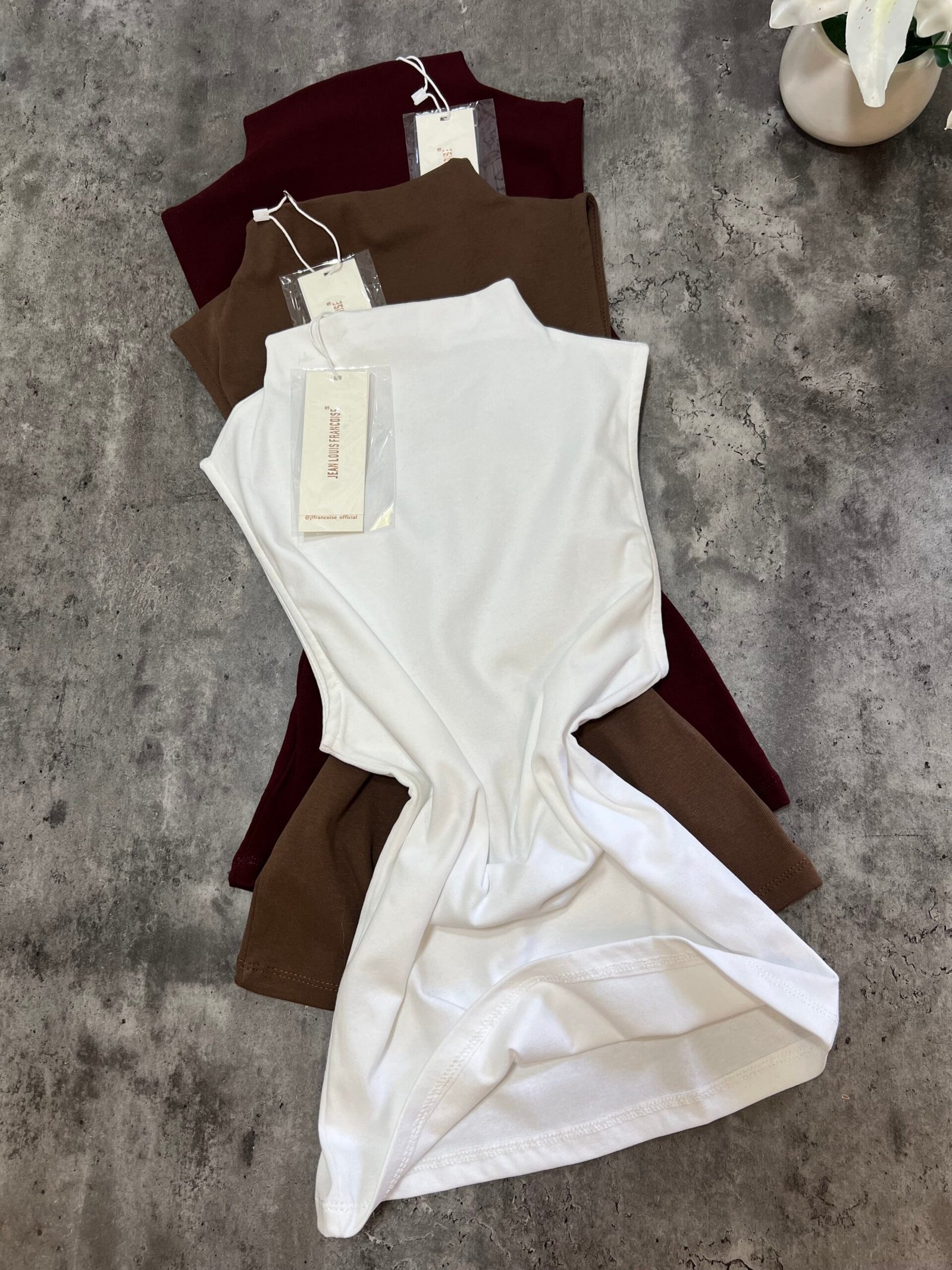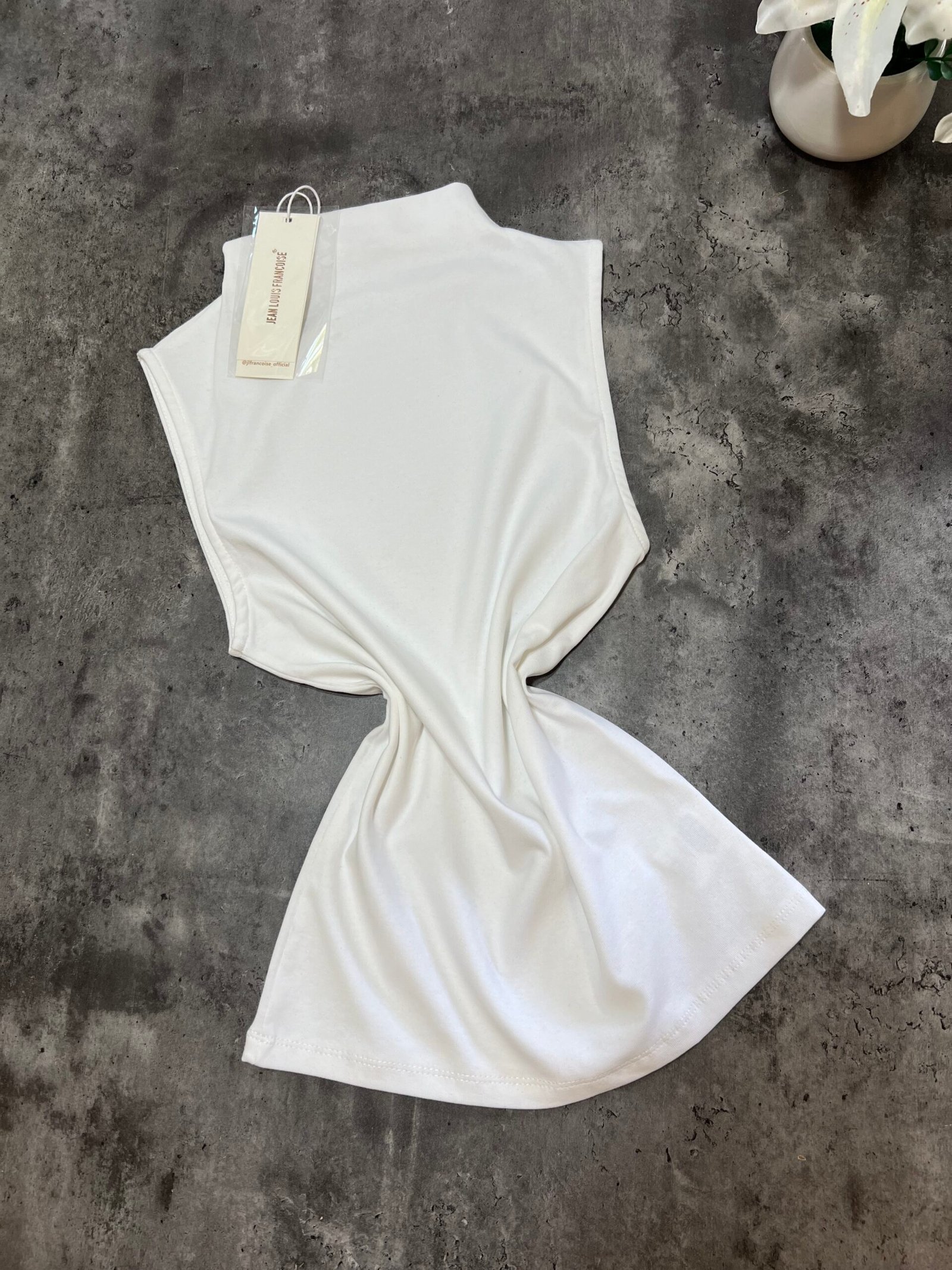 Kjo bluzë bazike pa mëngë me jakë të lartë është perfekte për kombinime moderne dhe të thjeshta, duke u përshtatur lehtësisht si me xhinse ashtu edhe me funde elegante. Në material 100% pambuk, me nje fitting perfekt për shkak te copës elastike, është një pjesë esenciale e garderobës për çdo stinë.