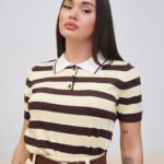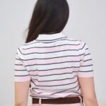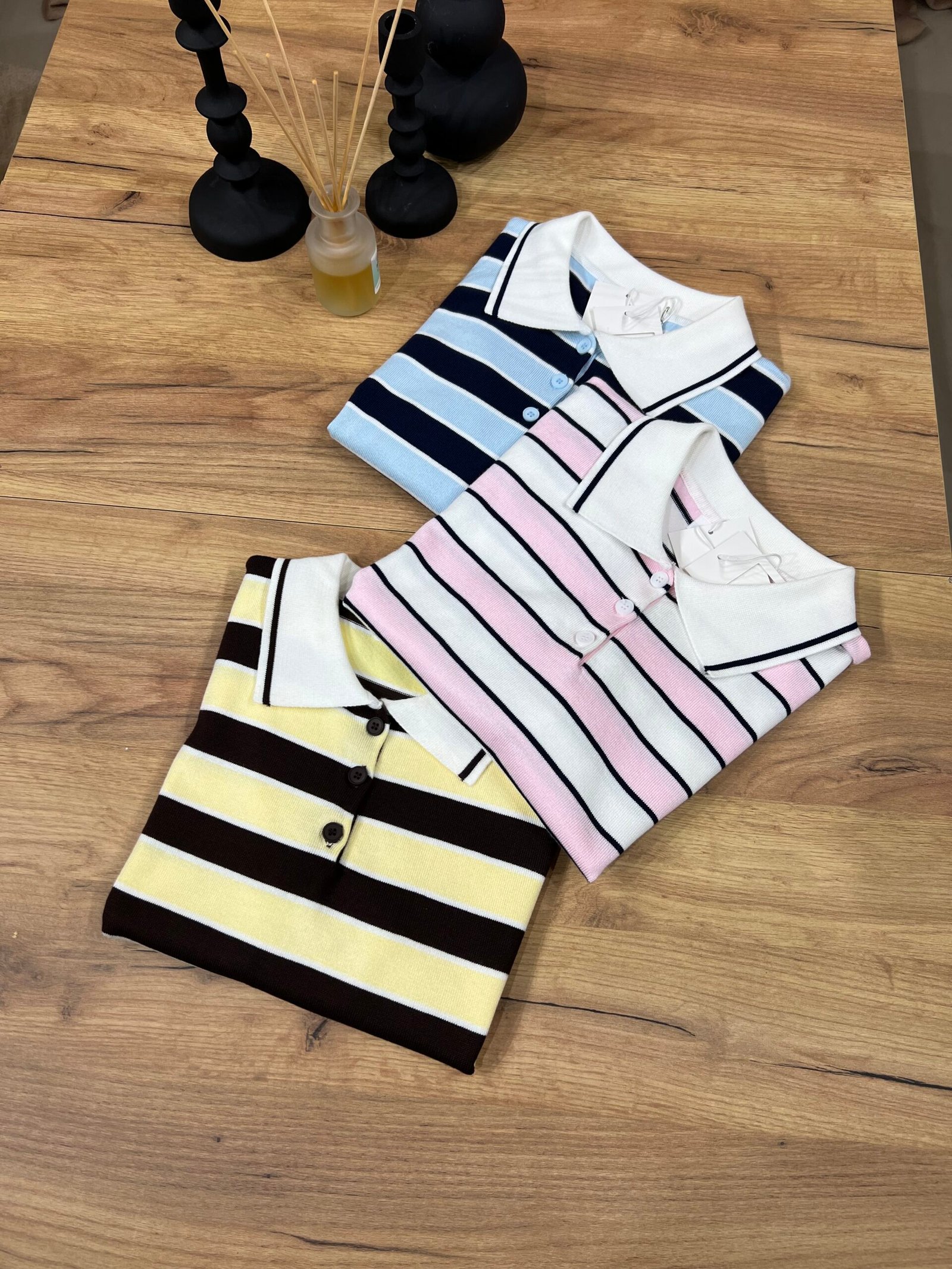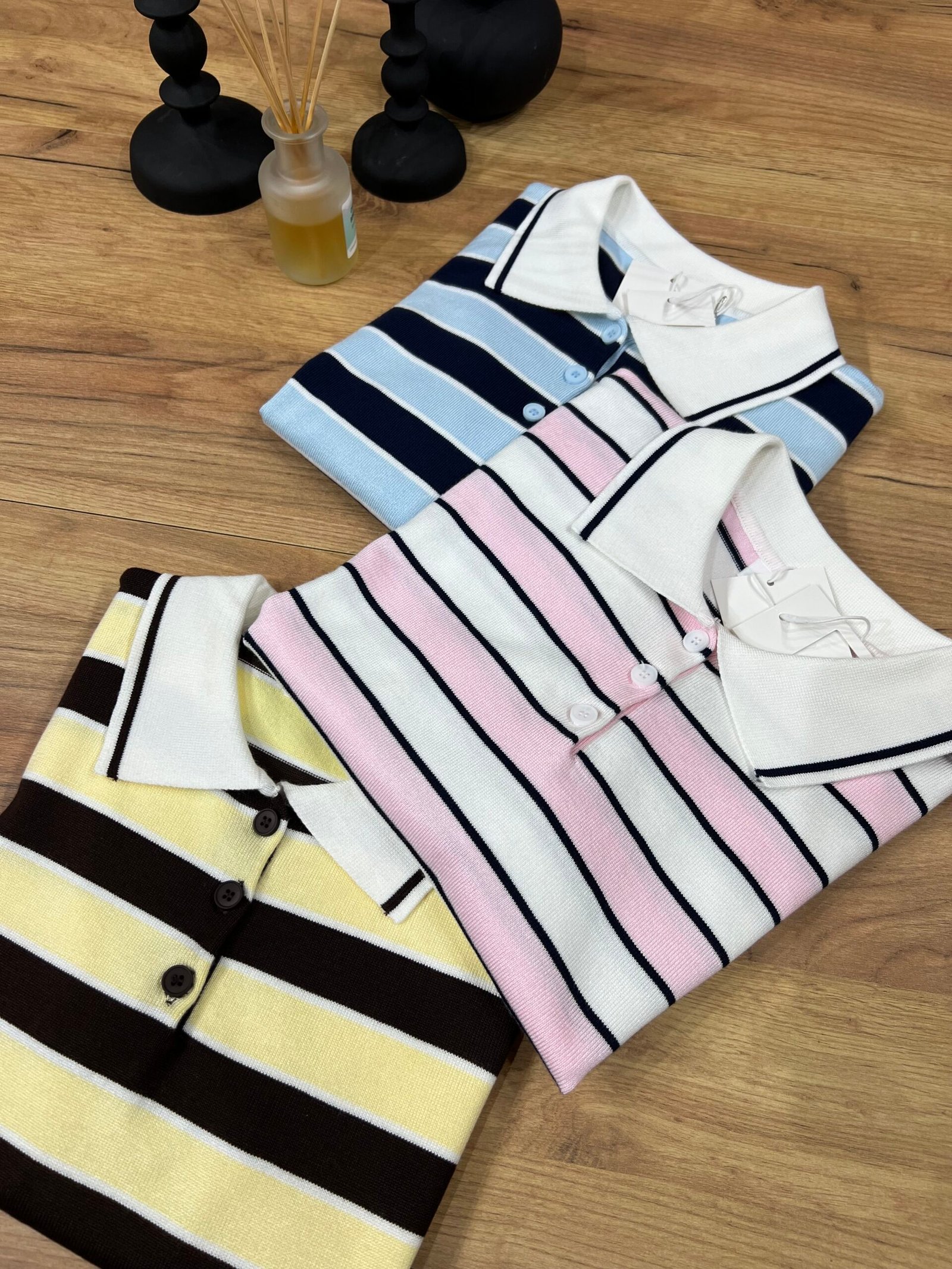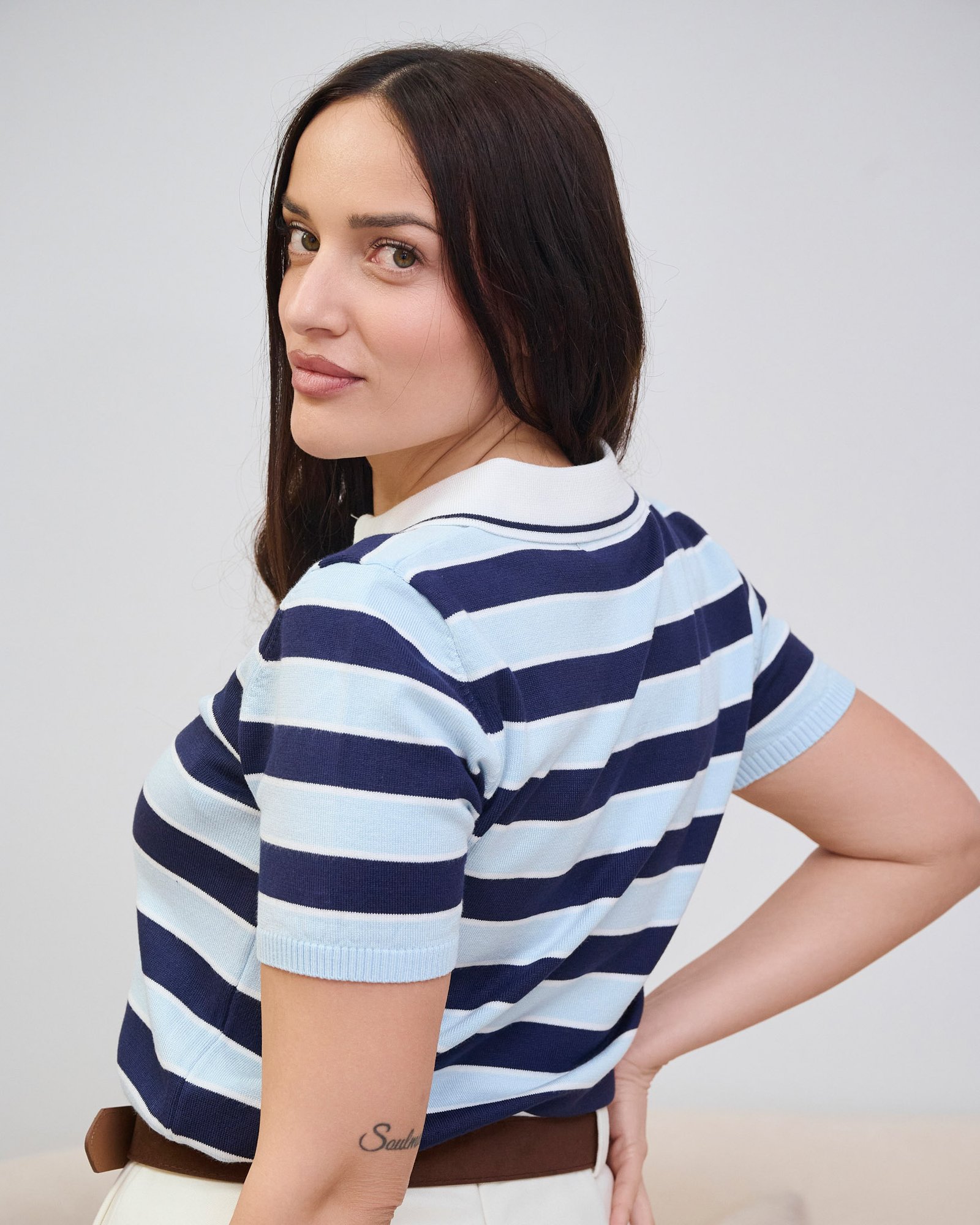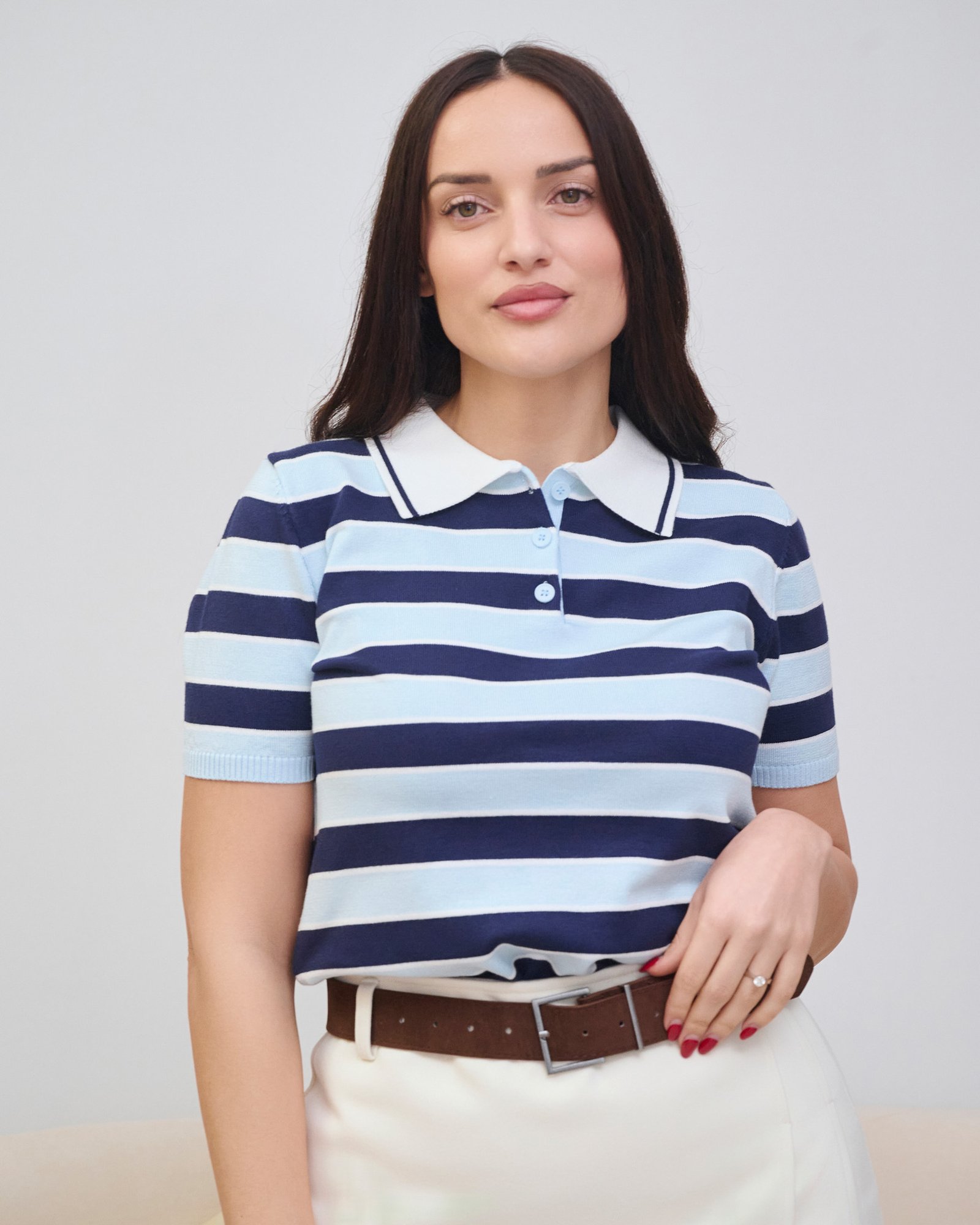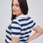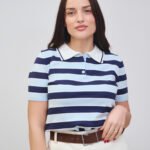 Bluzë polo fine knit me dizajn elegant me vija horizontale dhe jakë të bardhë kontrastuese, që sjell një stil classic, clean dhe feminin. Materiali i butë dhe elastik ofron rehati të lartë dhe përshtatje perfekte në trup, duke e bërë ideale për veshje të përditshme ose kombinime smart casual.