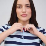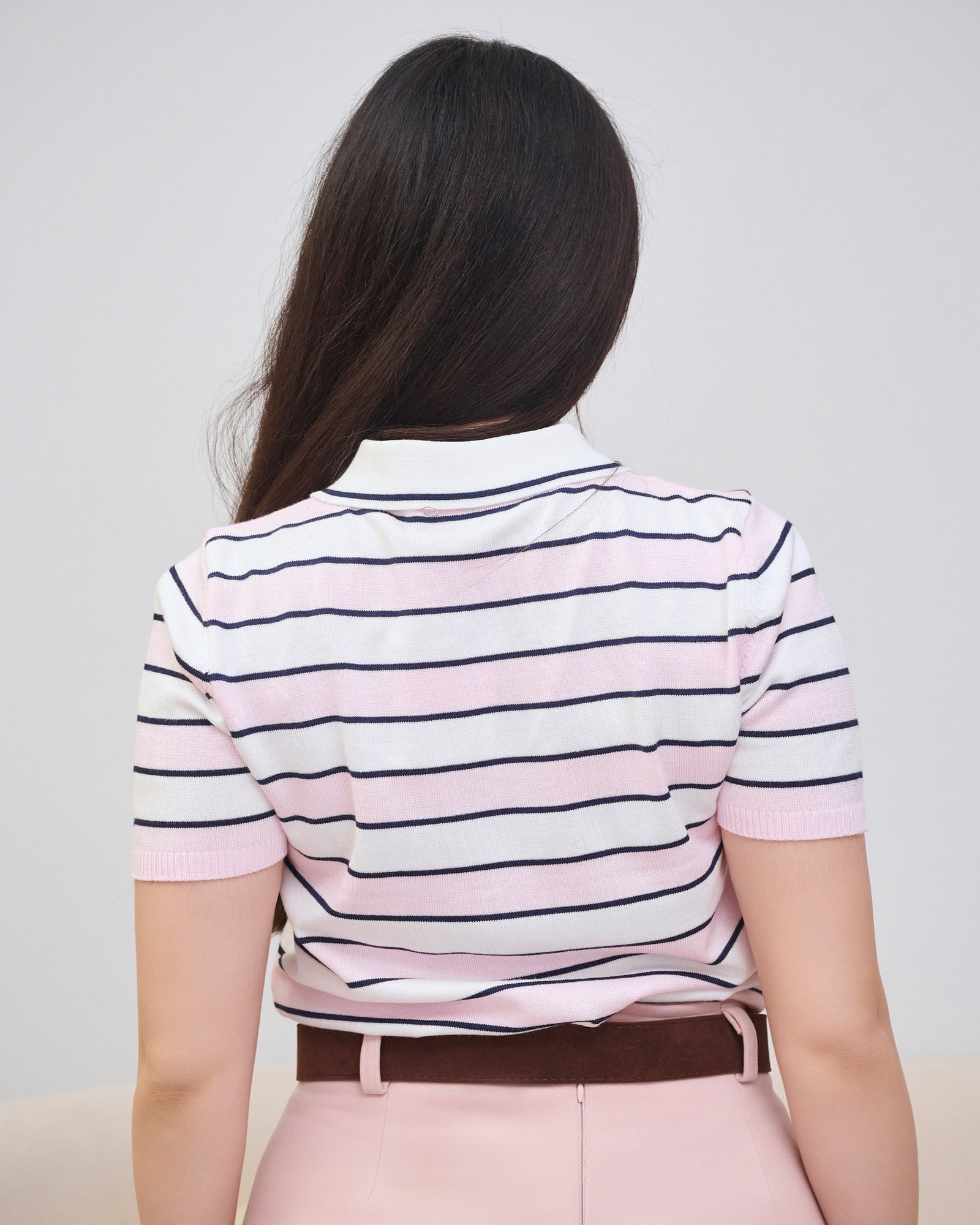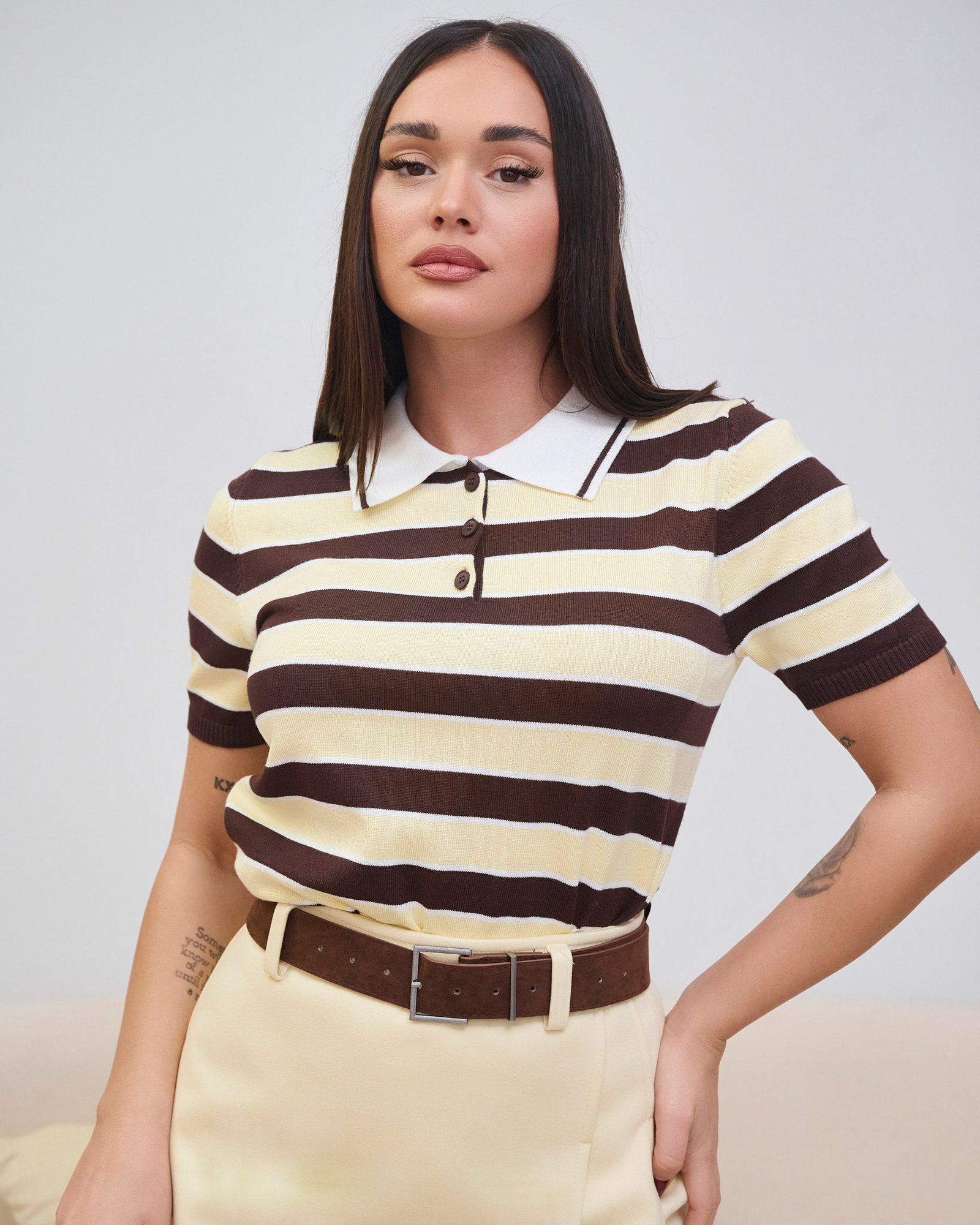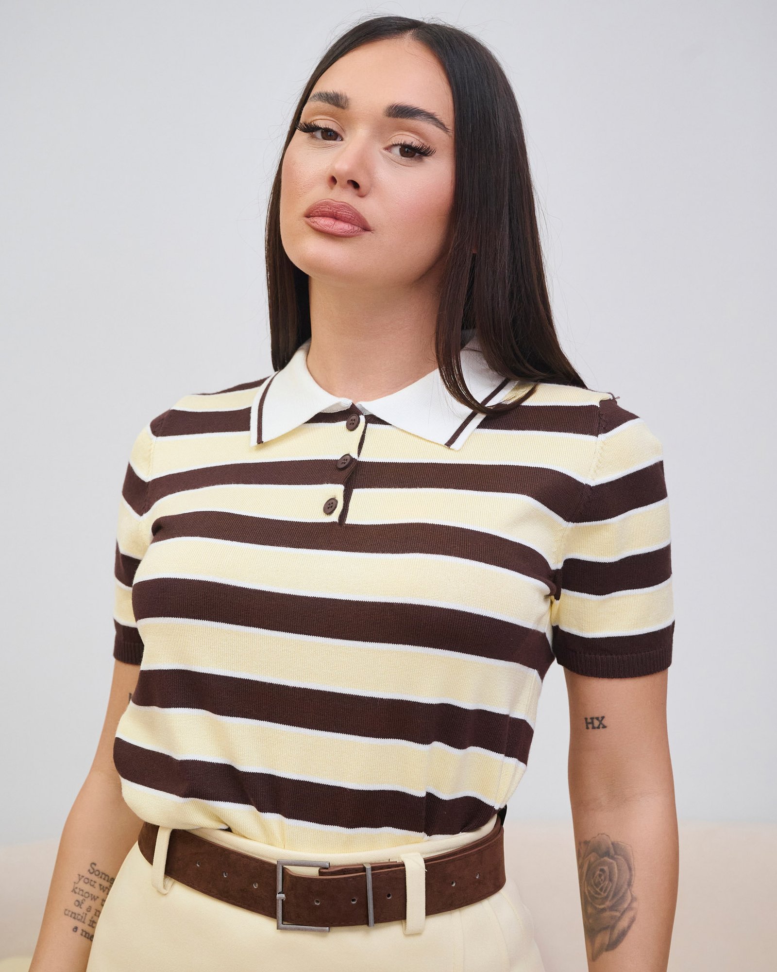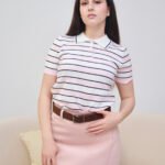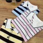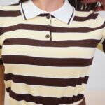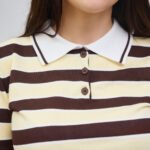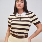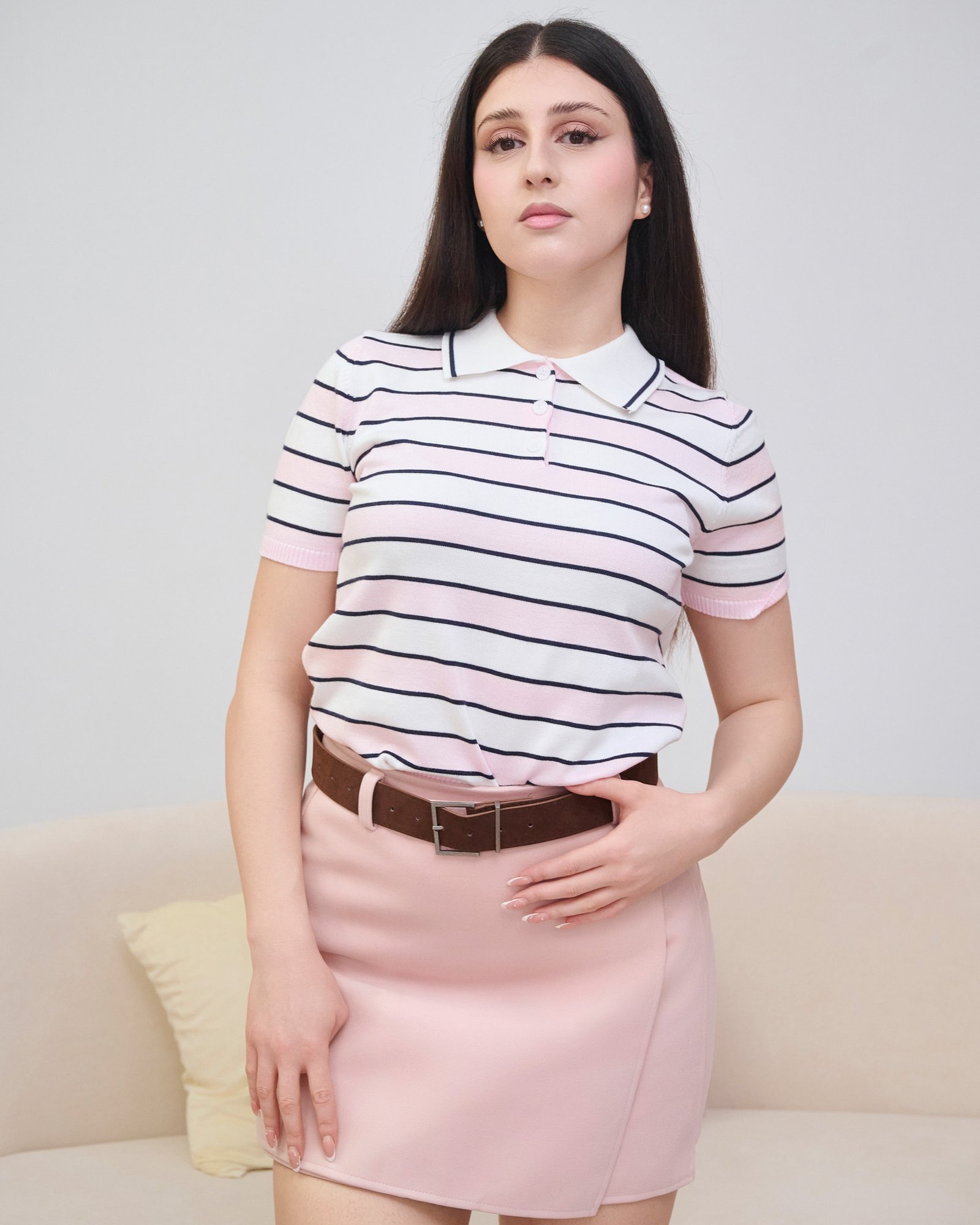 Bluzë polo fine knit me dizajn elegant me vija horizontale dhe jakë të bardhë kontrastuese, që sjell një stil classic, clean dhe feminin. Materiali i butë dhe elastik ofron rehati të lartë dhe përshtatje perfekte në trup, duke e bërë ideale për veshje të përditshme ose kombinime smart casual.
