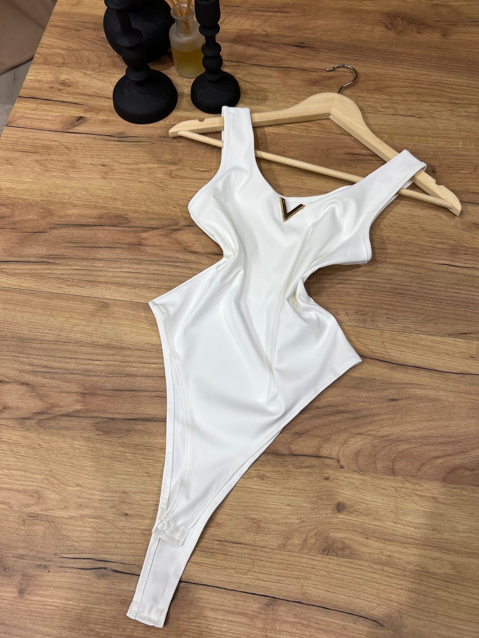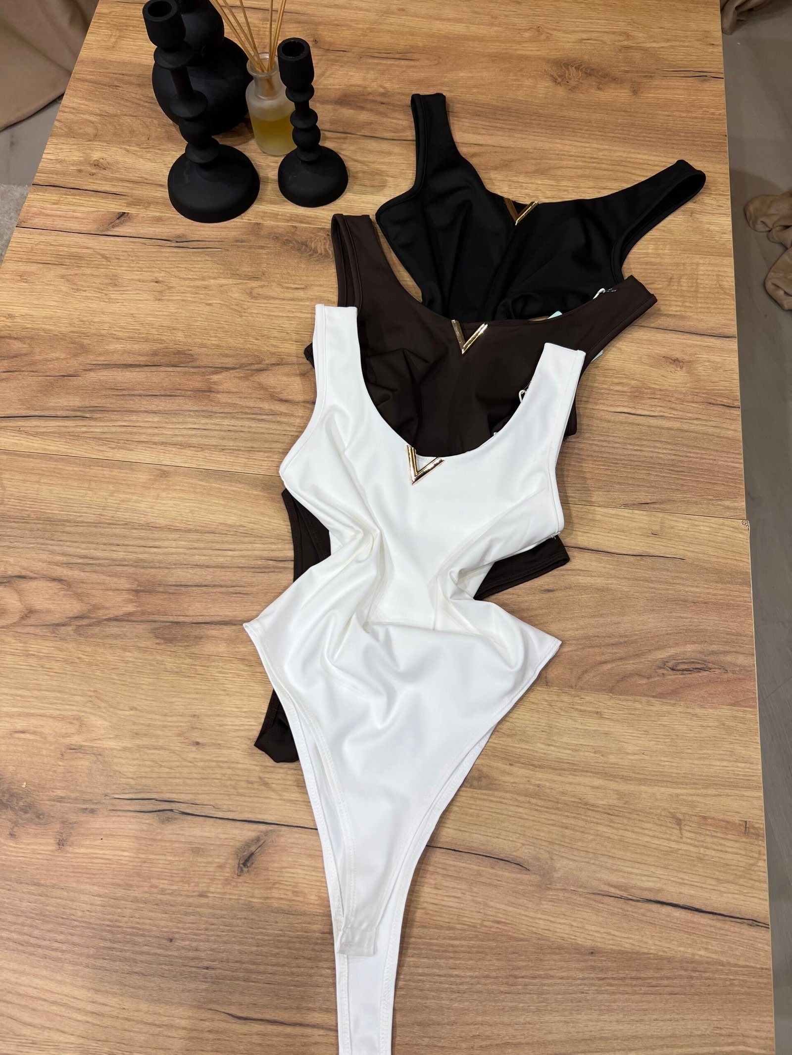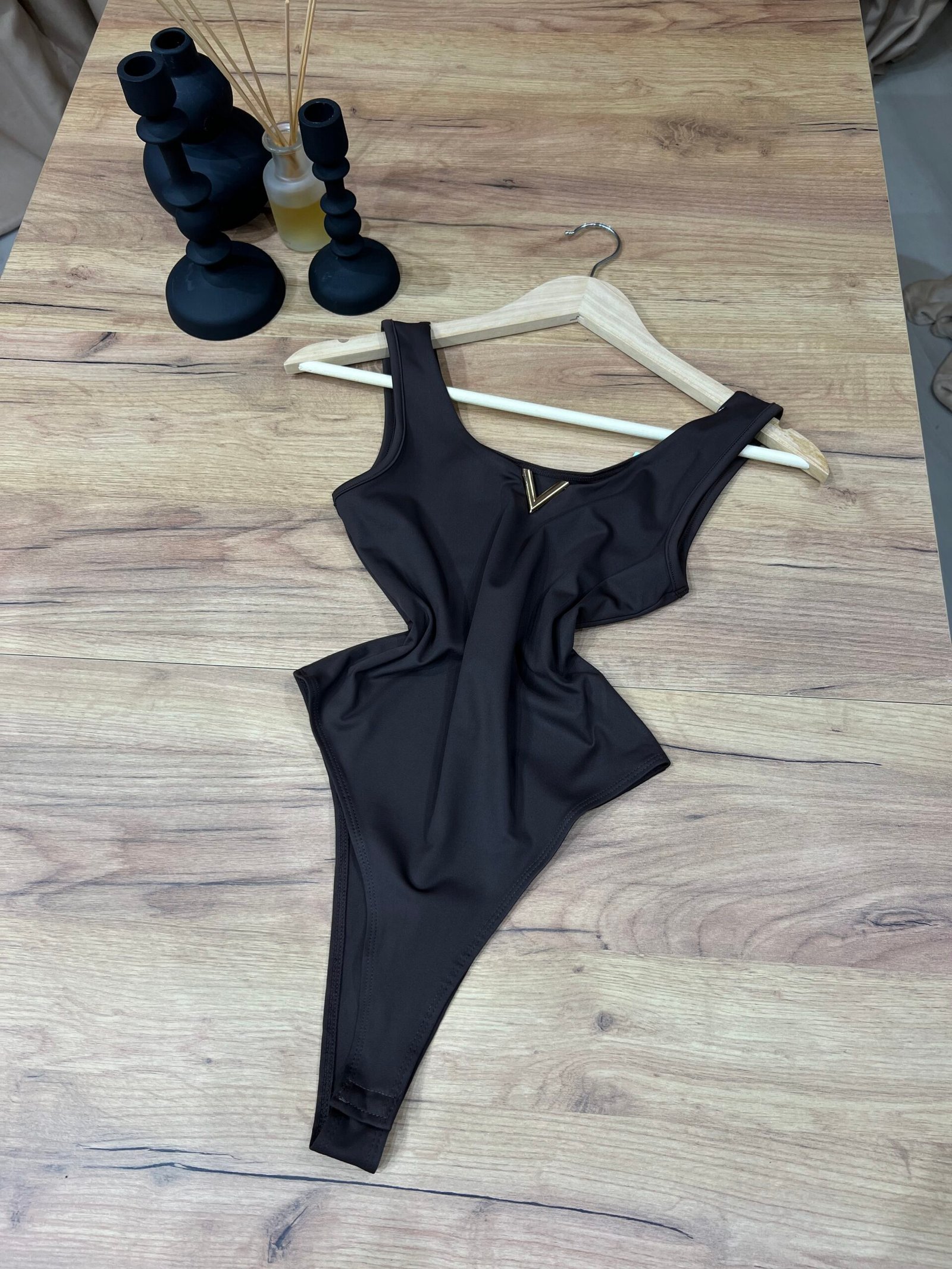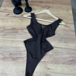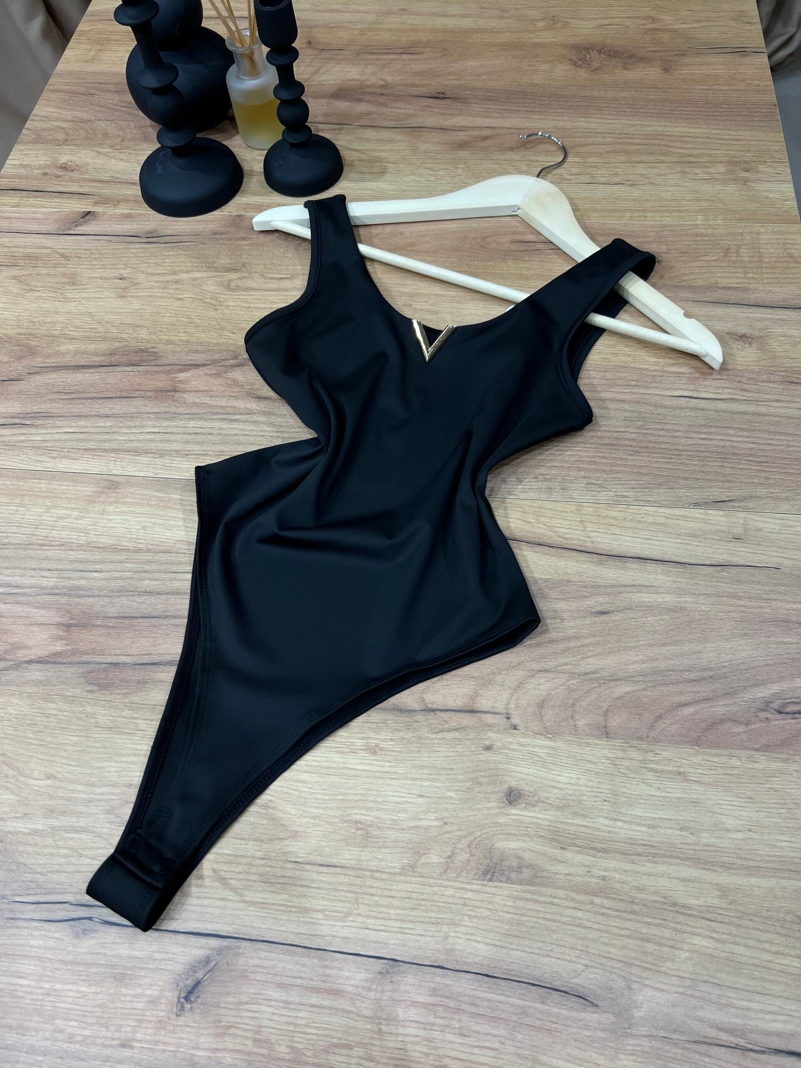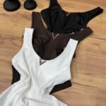 Body elegant me dekolte V dhe detaj metalik gold në pjesën e gjoksit, dizajnuar për të theksuar siluetën dhe për të modeluar trupin në mënyrë natyrale. Material elastik, i butë dhe komod që përshtatet perfekt pas trupit.