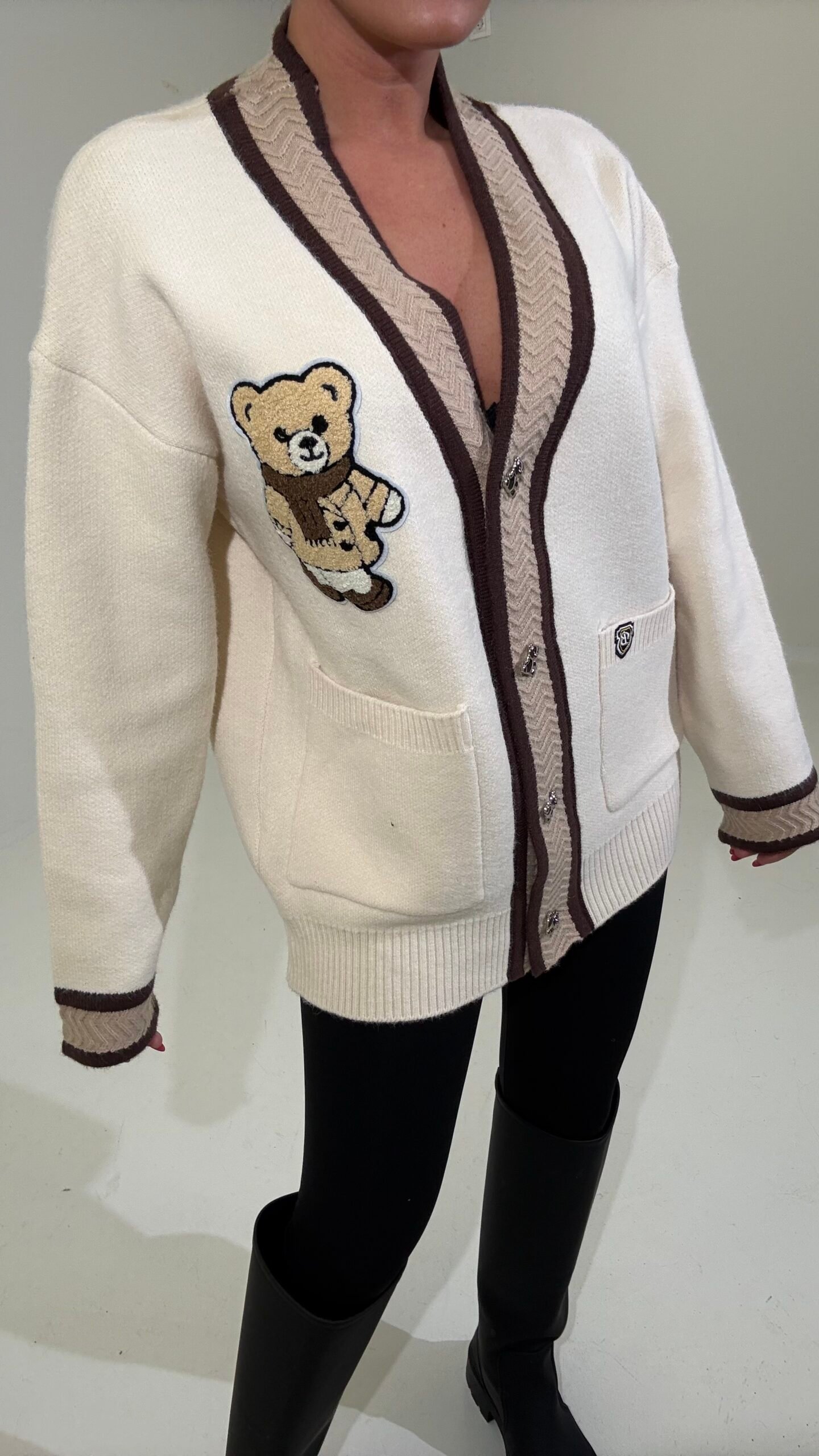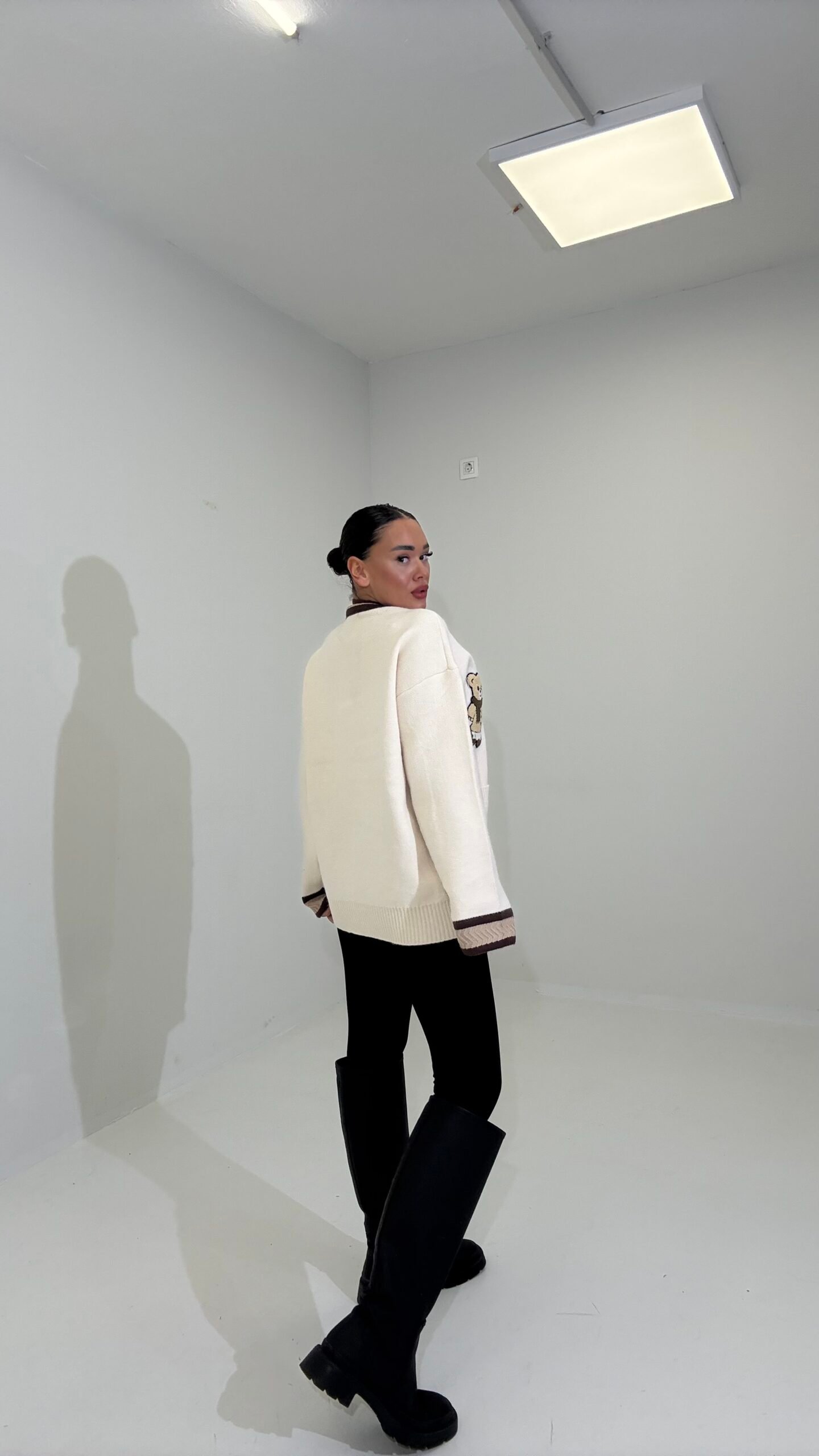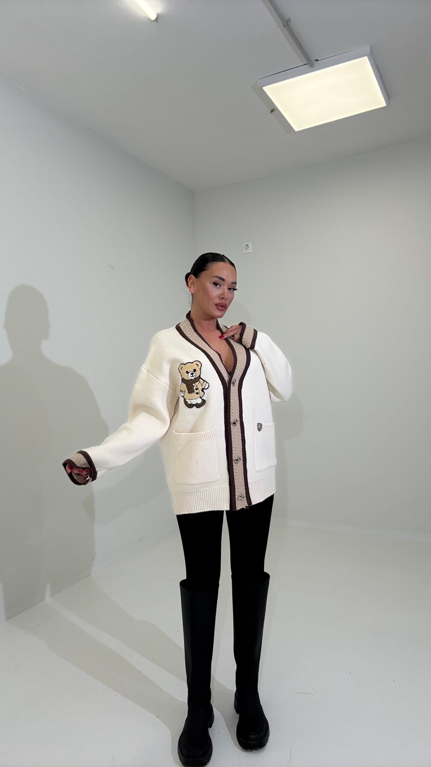 Cardigan i butë dhe komod me dizajn kontrastues dhe detaj arushi të qëndisur që i jep një pamje të ëmbël dhe të veçantë. Prerja oversize dhe materialet e ngrohta e bëjnë perfekt për veshje të përditshme, duke shtuar stil dhe rehati në çdo kombinim.