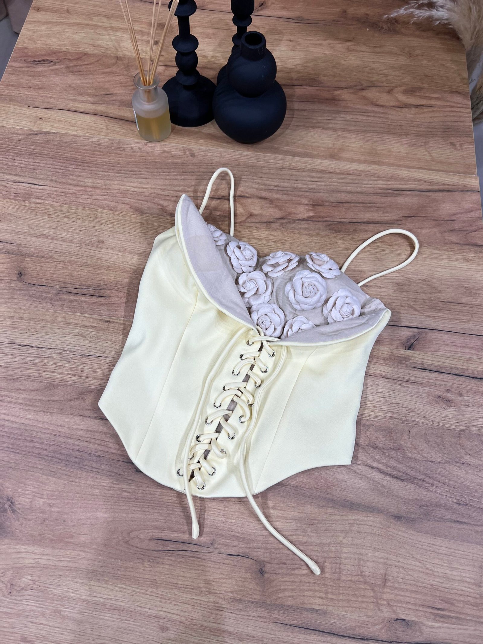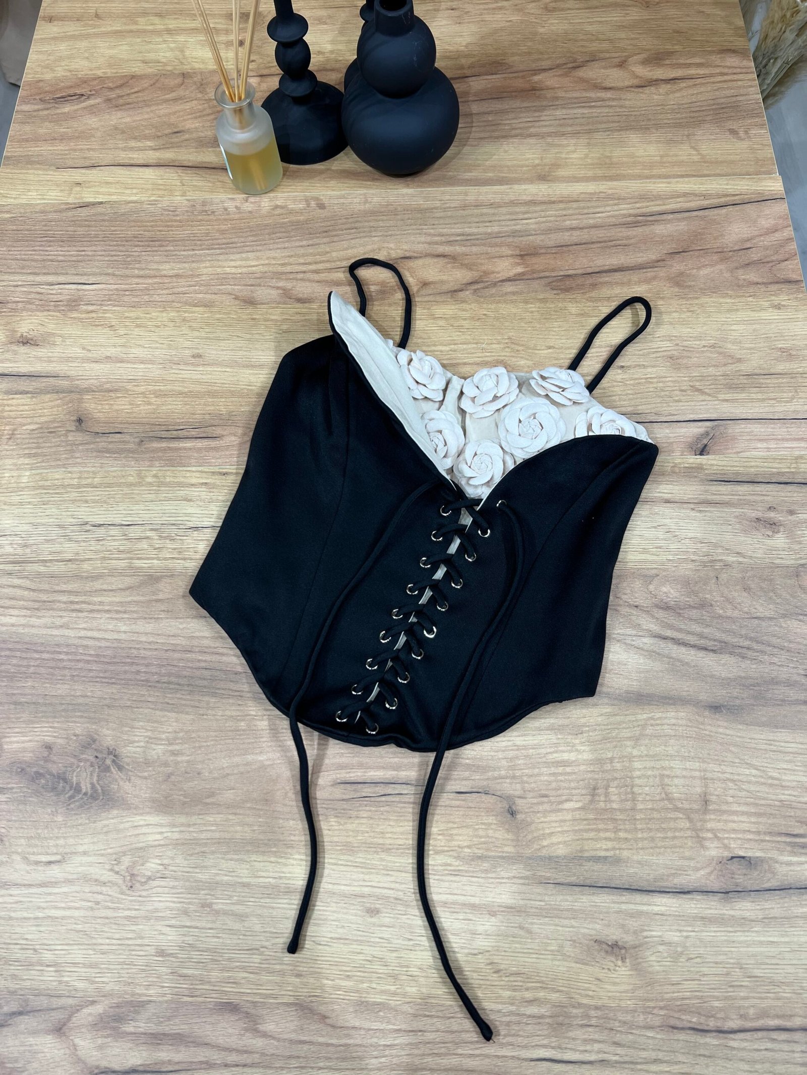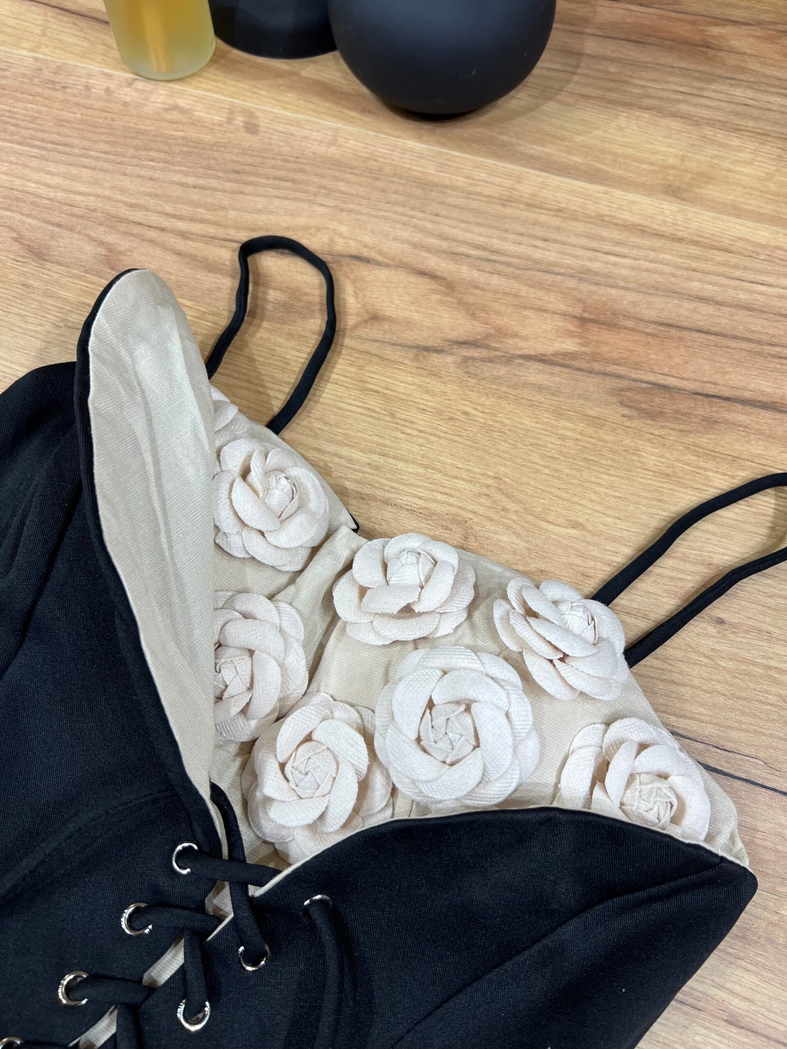 Corset elegant me dizajn feminin, i pasuruar me detaje lulesh 3D dhe lidhje klasike përpara që theksojnë belin dhe formën e trupit. Prerja strukturore dhe materiali cilësor krijojnë një siluetë të fortë, sensuale dhe shumë trendi. Ideal për evente speciale, kombinime evening apo stilime fashion-forward me karakter unik.
