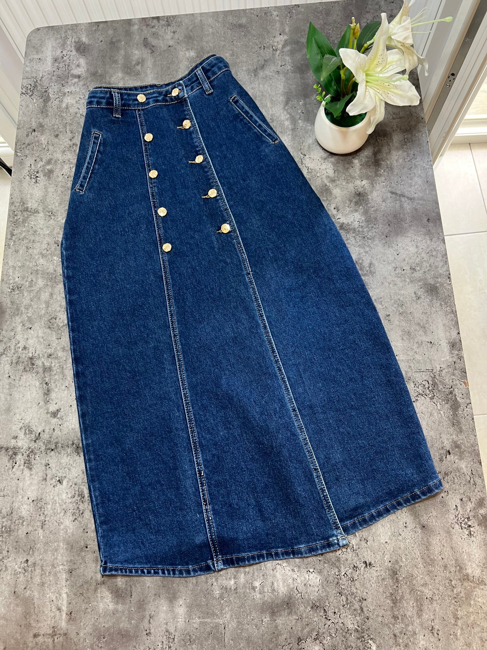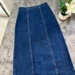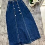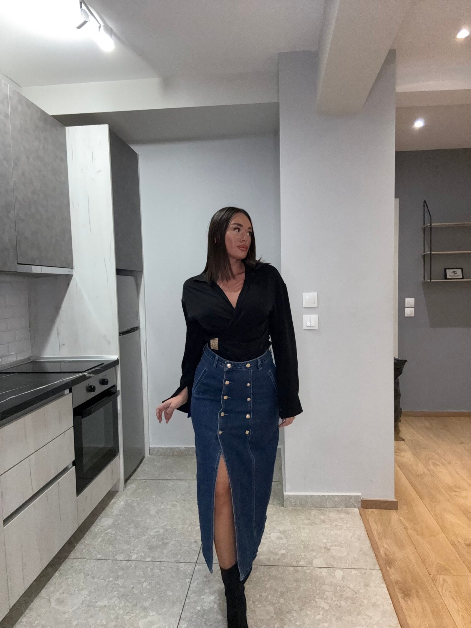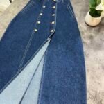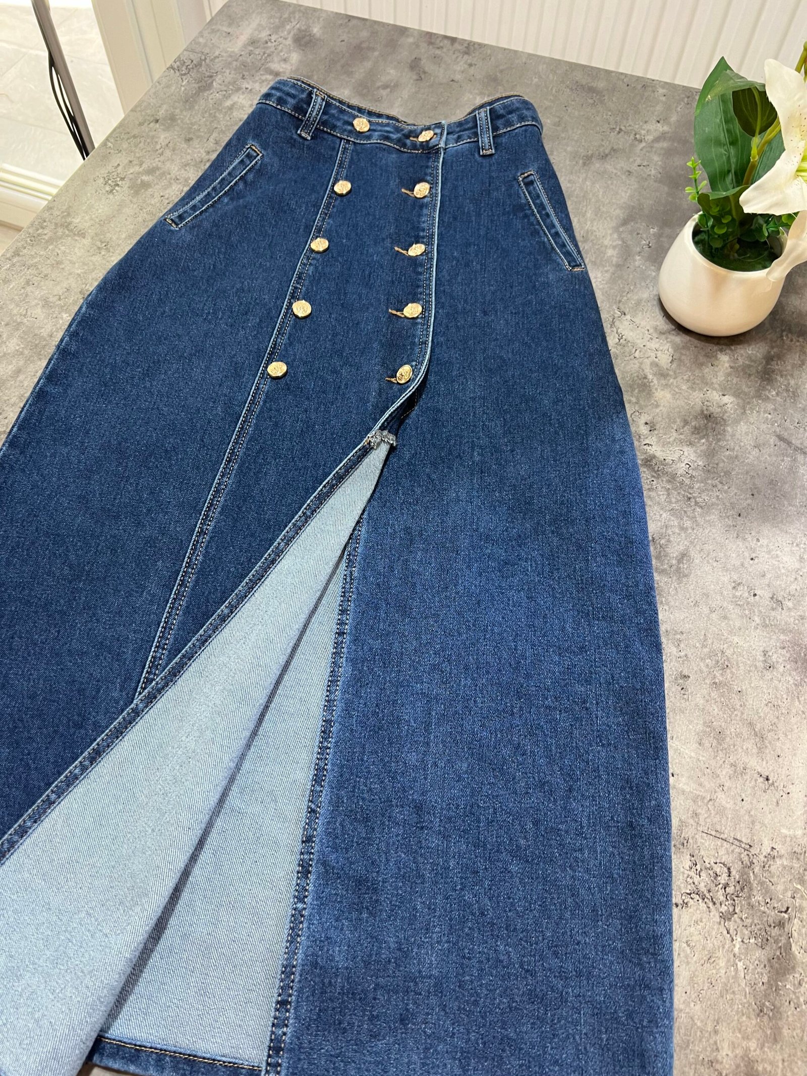 Fund i gjatë xhinsi me prerje të drejtë dhe çarje elegante në pjesën e përparme që thekson linjat e trupit. Ka mbyllje me rresht kopsash metalike dhe bel të lartë që siguron përshtatje perfekte. Materiali i trashë prej denim cilësor ruan formën dhe jep një pamje moderne e të sofistikuar për çdo ditë.