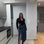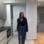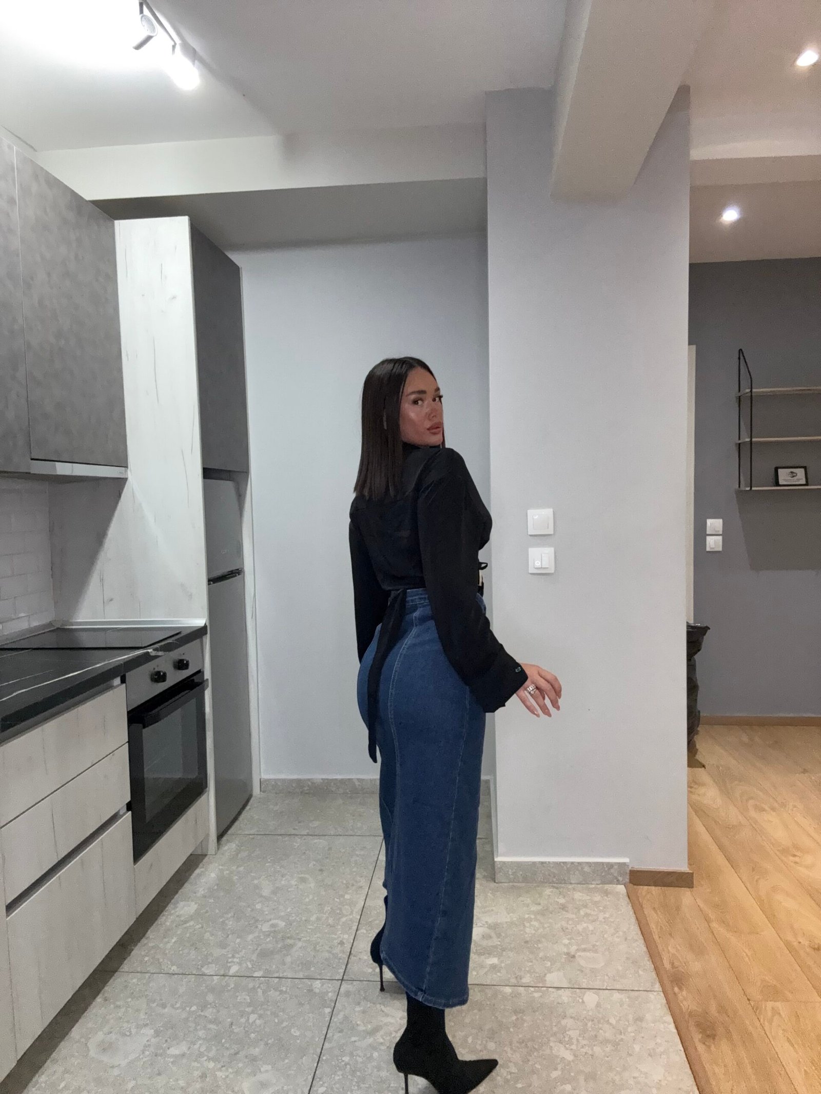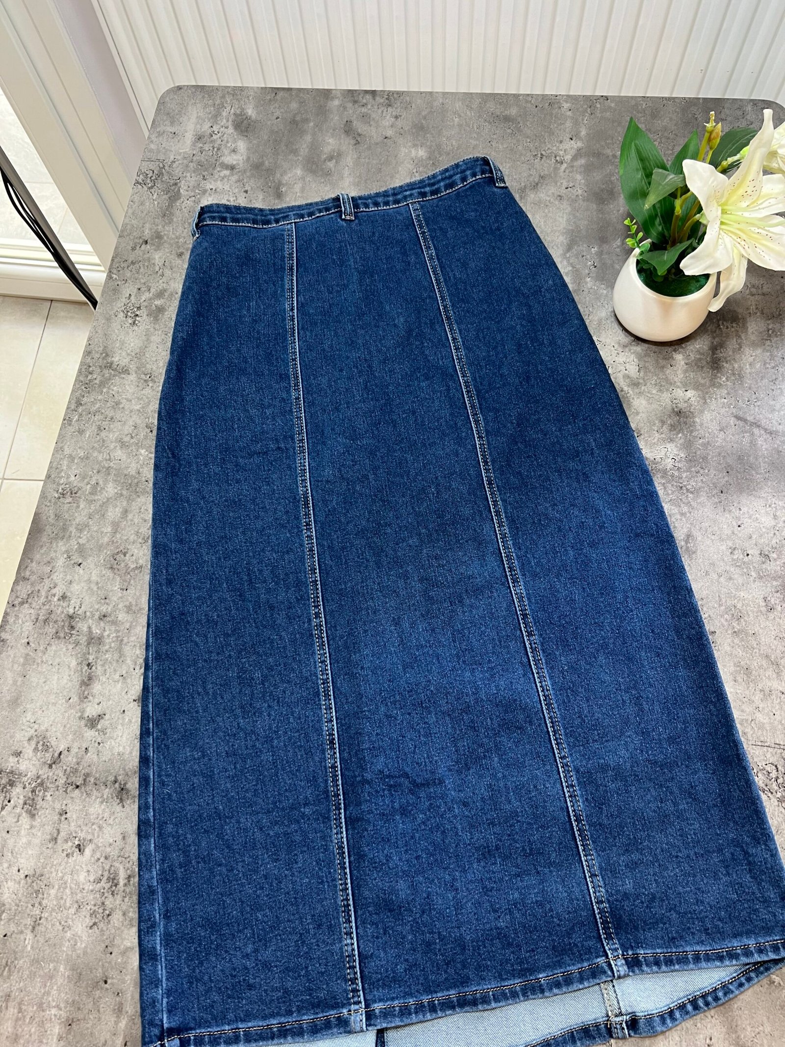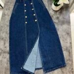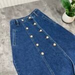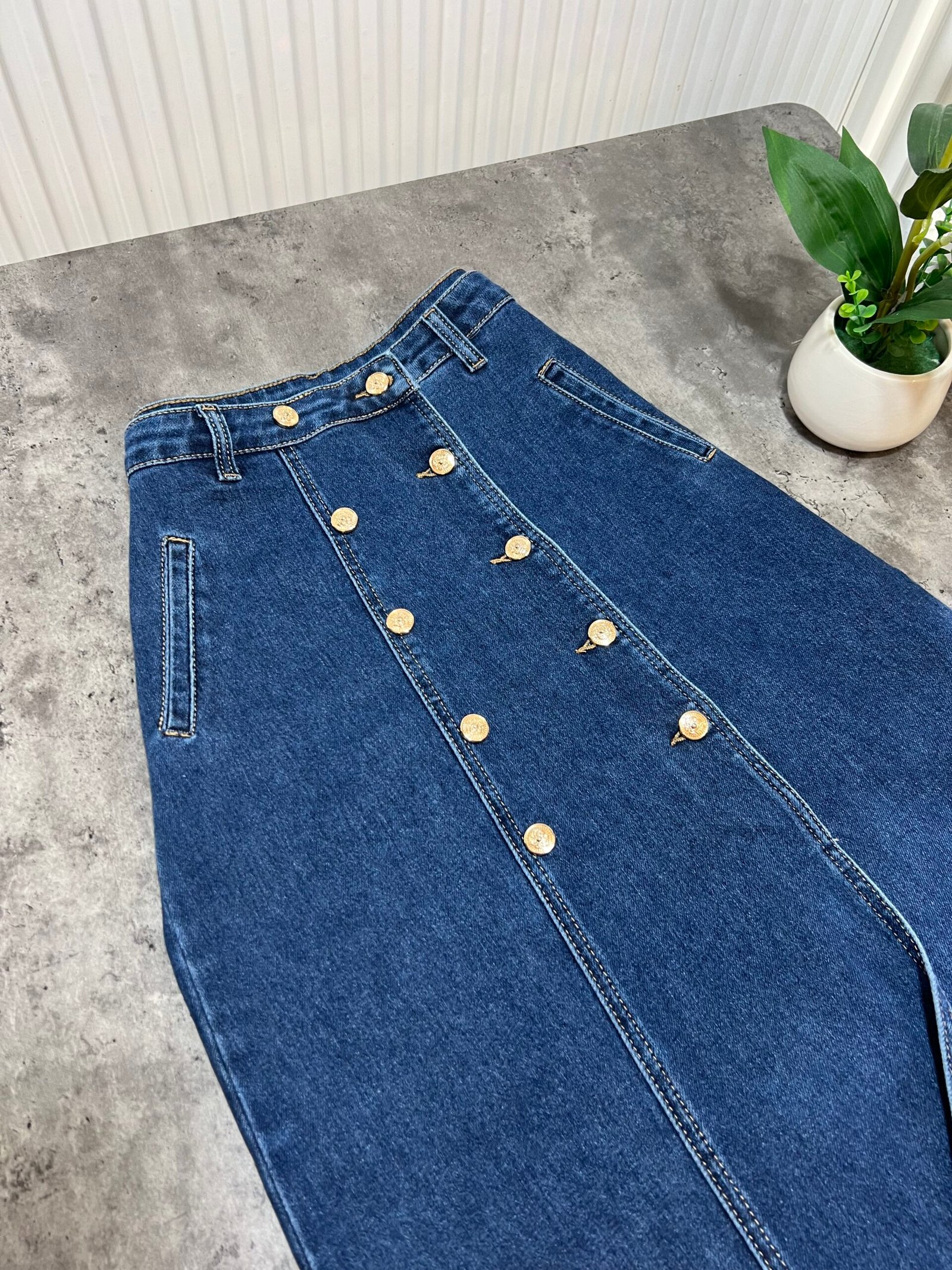 Fund i gjatë xhinsi me prerje të drejtë dhe çarje elegante në pjesën e përparme që thekson linjat e trupit. Ka mbyllje me rresht kopsash metalike dhe bel të lartë që siguron përshtatje perfekte. Materiali i trashë prej denim cilësor ruan formën dhe jep një pamje moderne e të sofistikuar për çdo ditë.