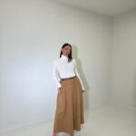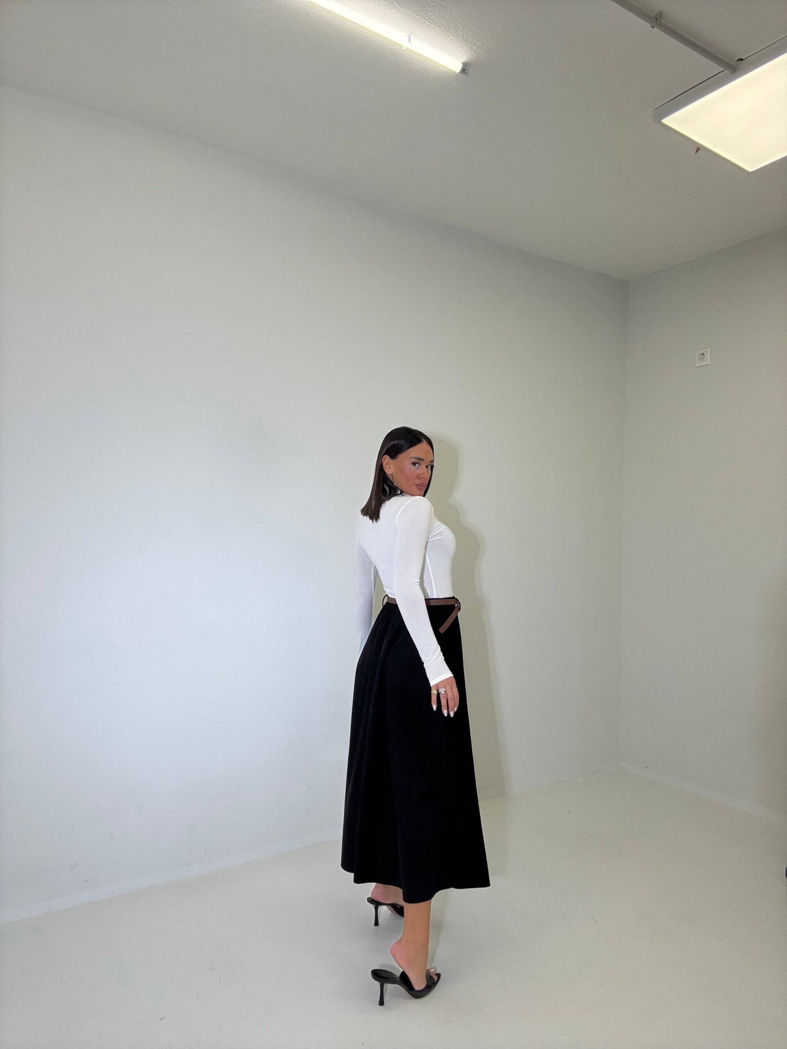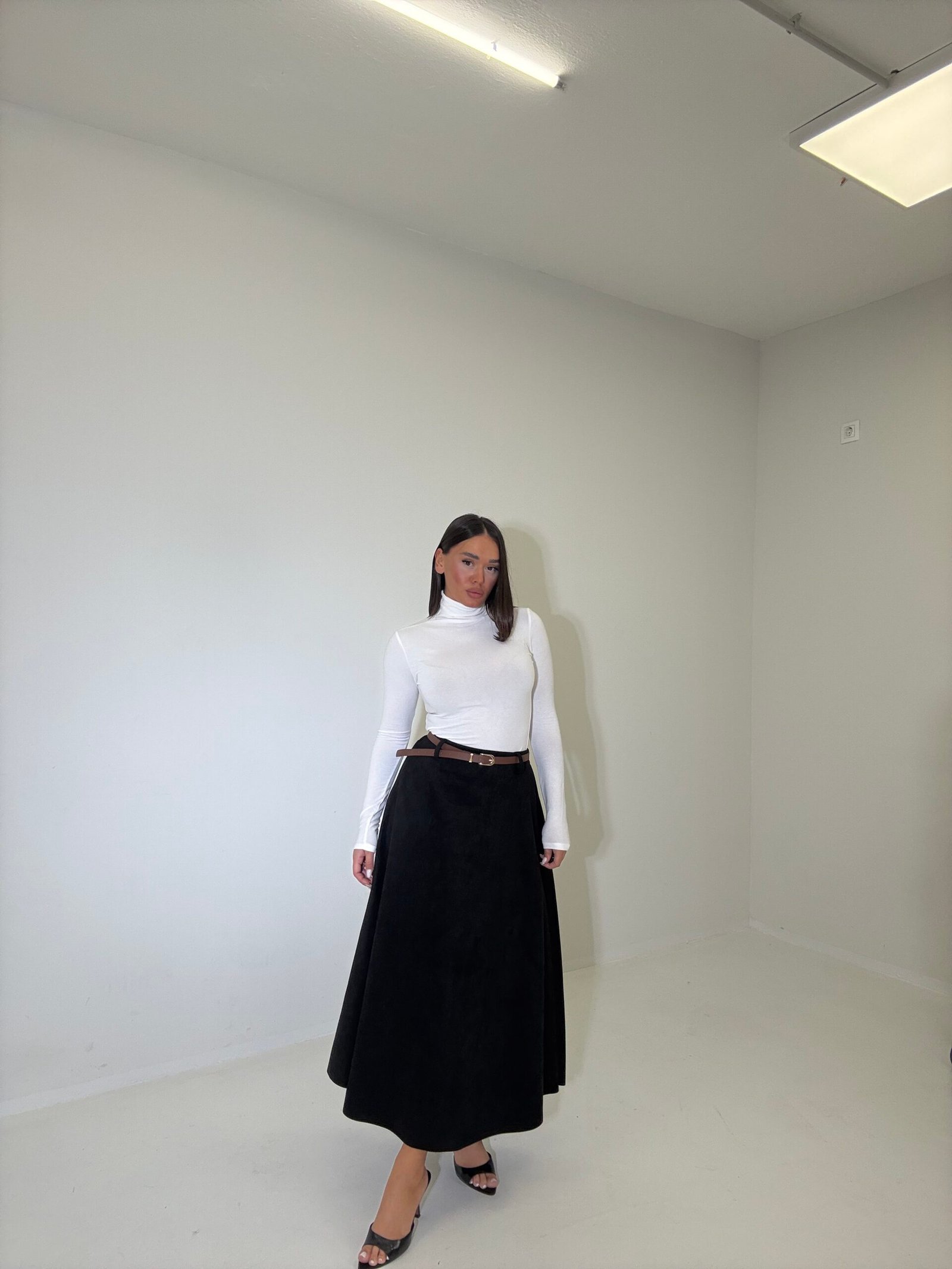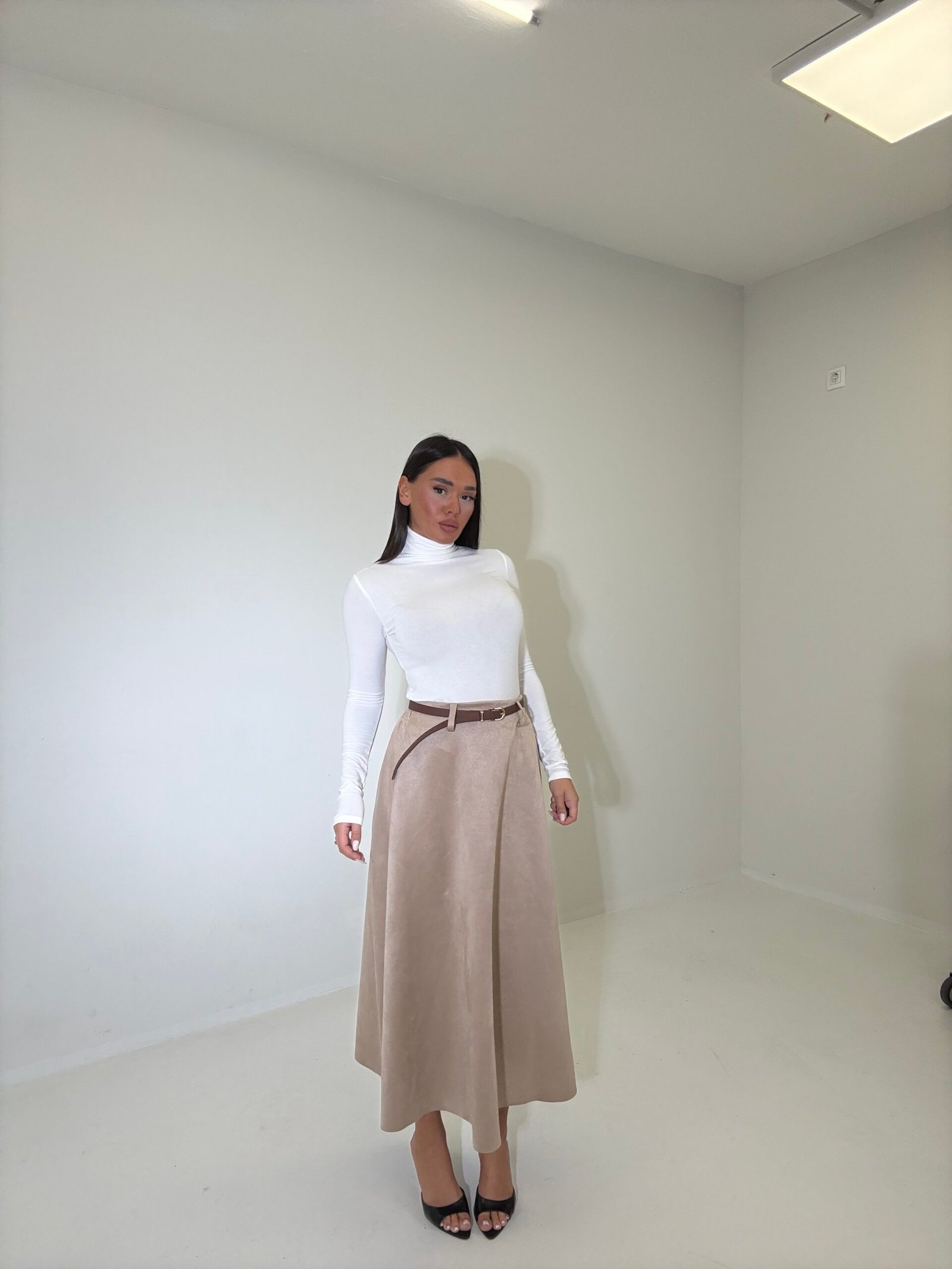 Fund elegant me prerje A që thekson belin dhe krijon siluetë femërore. Materiali i butë dhe struktura e gjerë i japin lëvizje natyrale, perfekt për kombinime klasike ose moderne gjatë ditës.