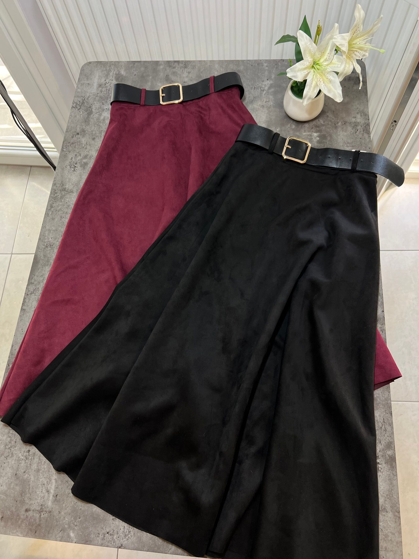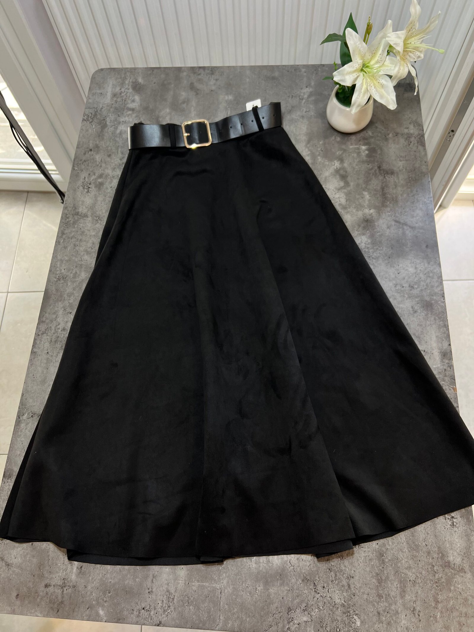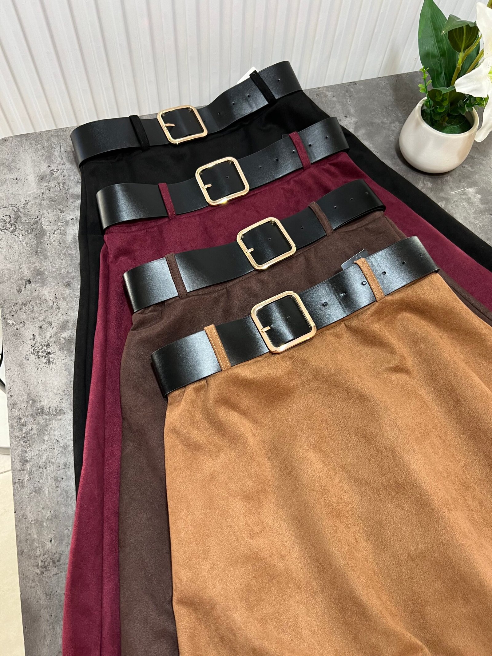 Fund elegant me material suede që kombinon finesën me komoditetin. Rripi me tokëz metalike në bel shton një prekje moderne dhe ndihmon të theksohet silueta femërore. Ideale për kombinime me triko, bluza apo çizme për një pamje të ngrohtë dhe shik gjatë sezonit të ftohtë.