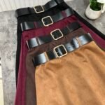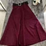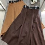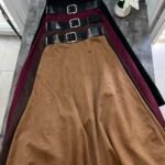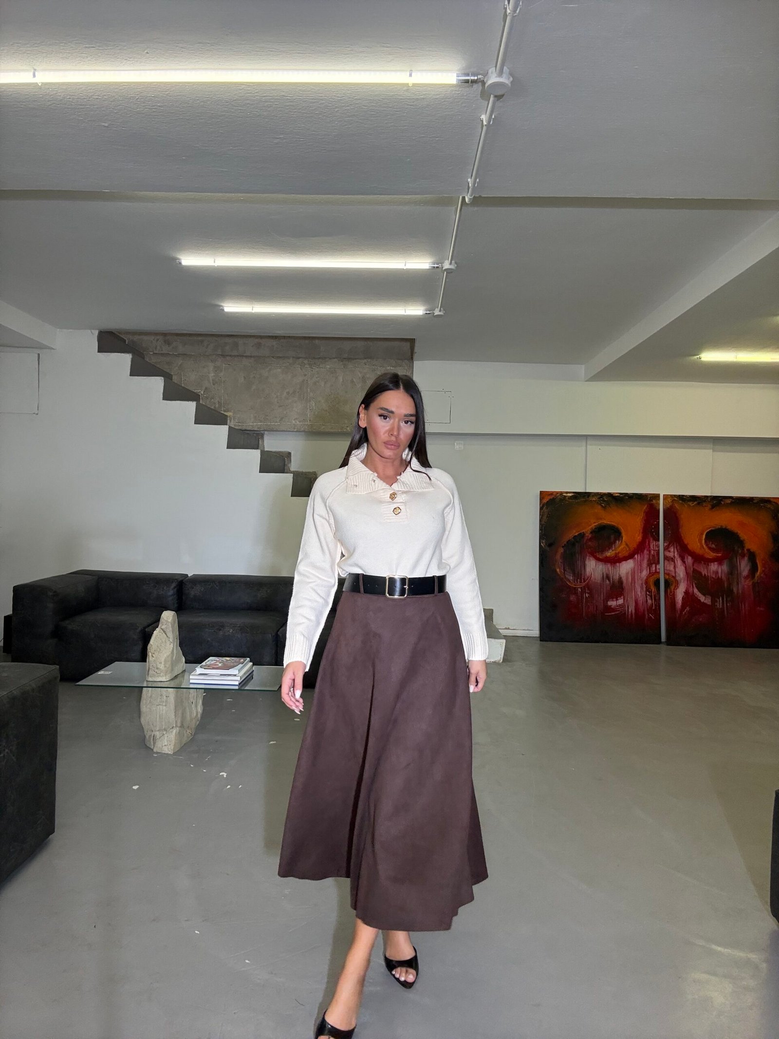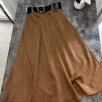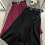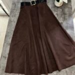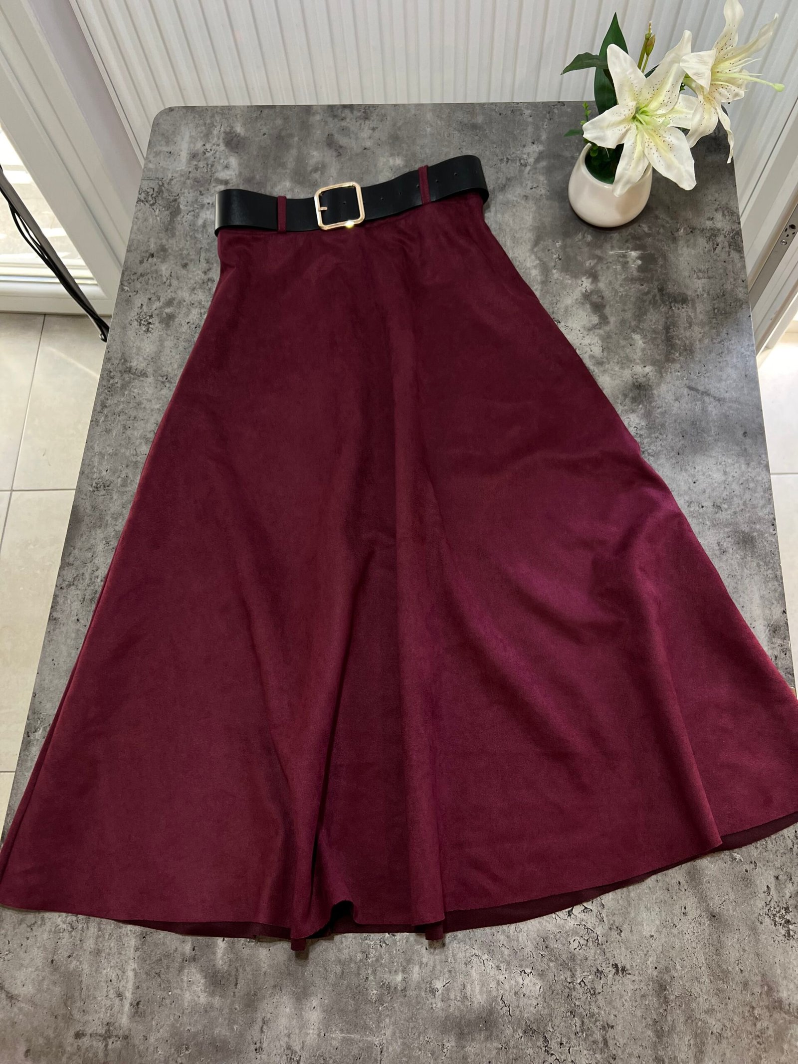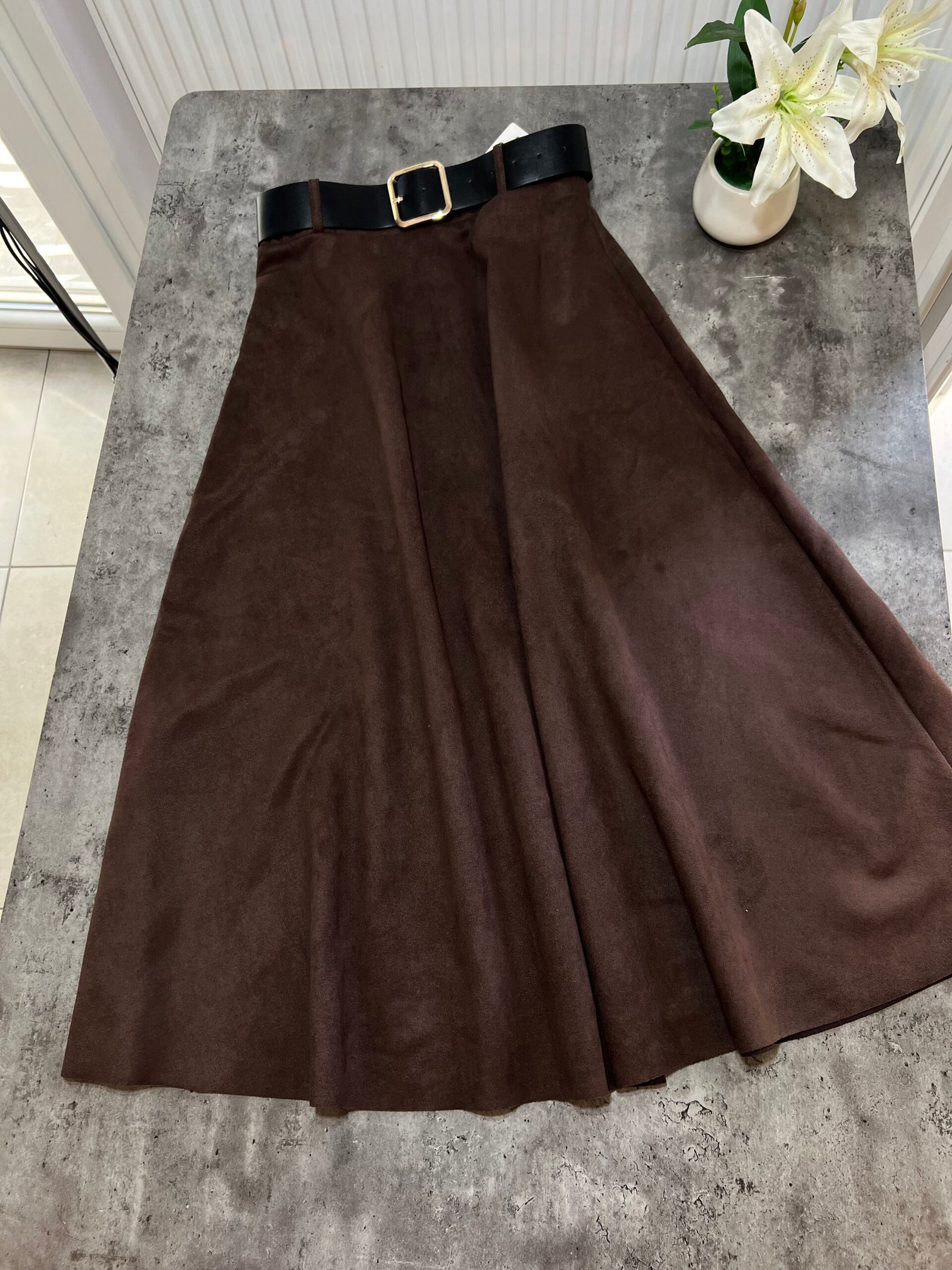 Fund elegant me material suede që kombinon finesën me komoditetin. Rripi me tokëz metalike në bel shton një prekje moderne dhe ndihmon të theksohet silueta femërore. Ideale për kombinime me triko, bluza apo çizme për një pamje të ngrohtë dhe shik gjatë sezonit të ftohtë.