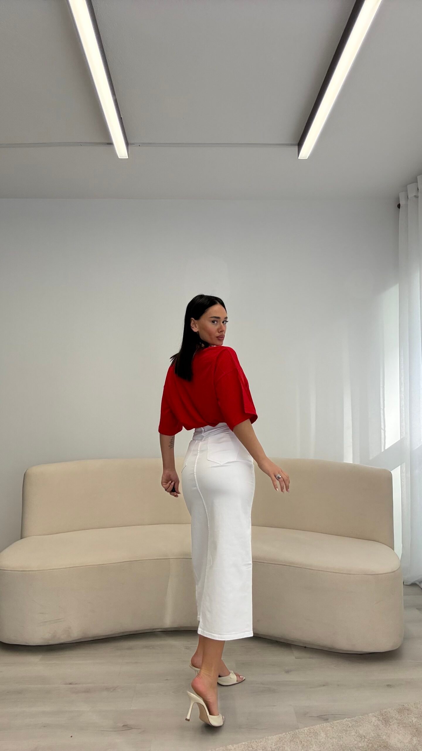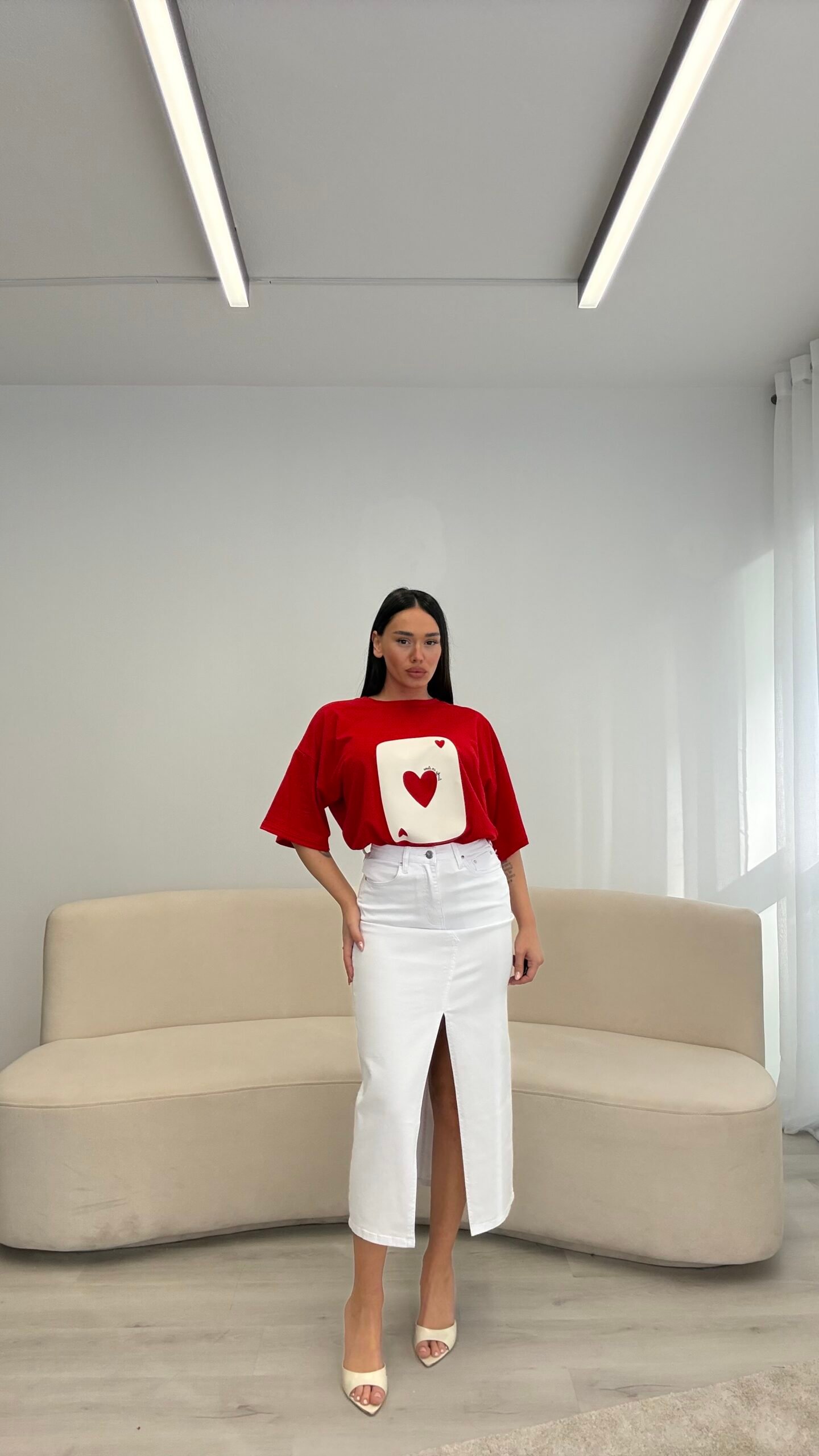 Fund jeans i gjatë elastik me prerje që përshtatet bukur me trupin, duke theksuar linjat në mënyrë elegante. Çarja përpara i jep lëvizje dhe një prekje feminiteti, ndërsa materiali ofron strukturë dhe rehati për përdorim të përditshëm.