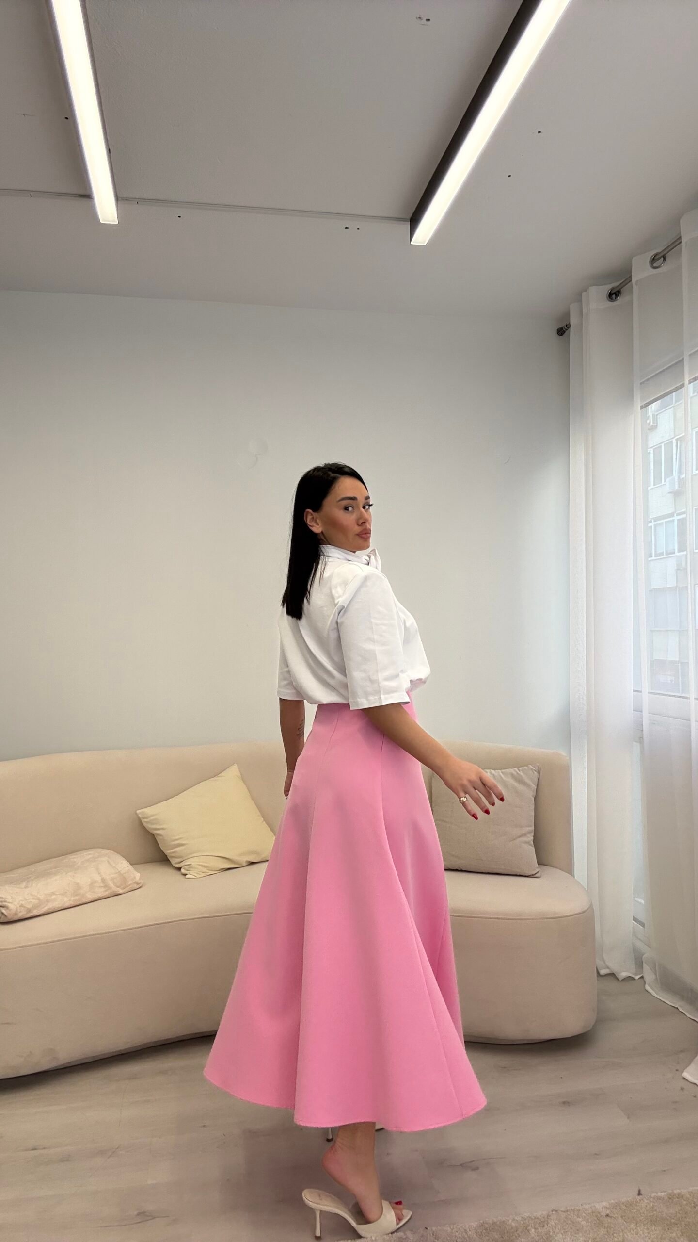 Fund midi me prerje A-line qe krijon levizje elegante dhe thekson bukur belin. Dizajni i paster dhe linja e rrjedhshme i japin nje pamje femerore dhe te sofistikuar, perfekte per kombinime si me bluza minimaliste ashtu edhe me kemisha elegante. Nje model chic dhe modern qe funksionon shume mire si per look casual ashtu edhe per raste me stil.