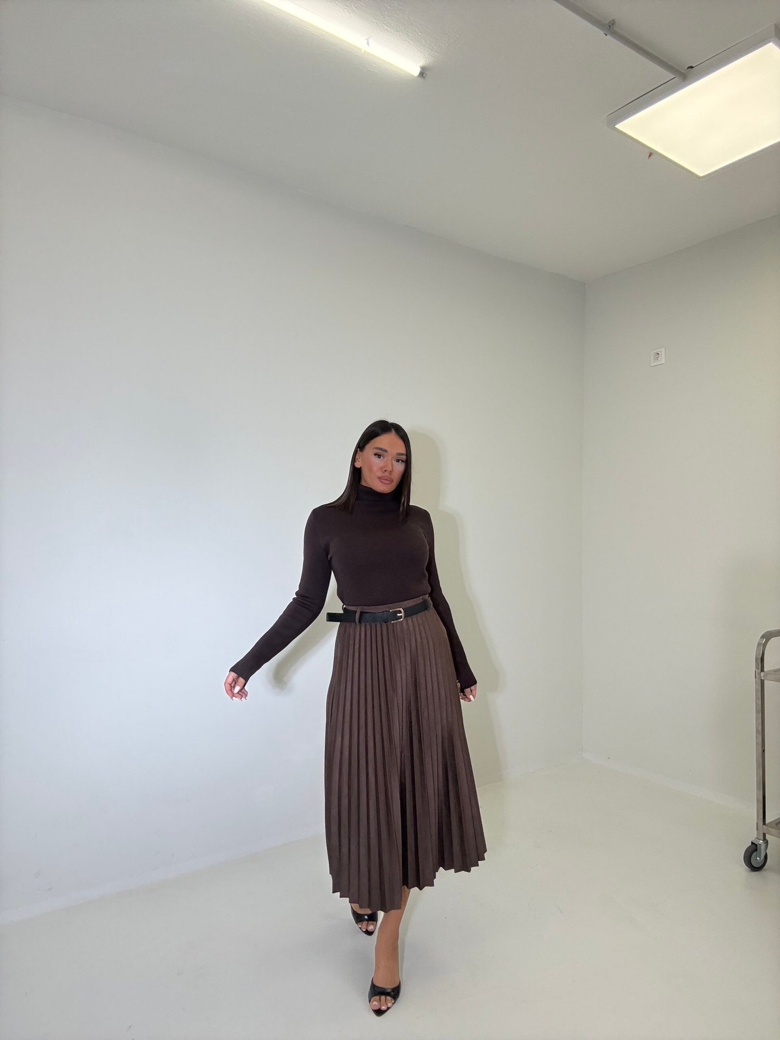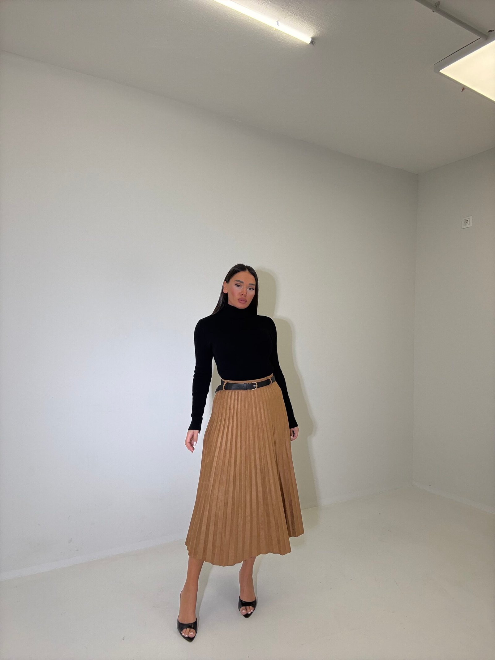 Fund me dizajn me pala dhe rrip që thekson belin duke krijuar siluetë elegante. Materiali suede dhe prerja klasike e bëjnë ideal për kombinime të përditshme ose raste më të veçanta me stil të rafinuar.