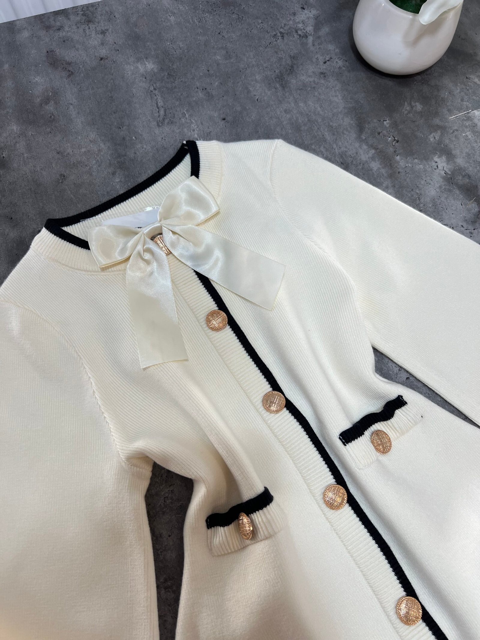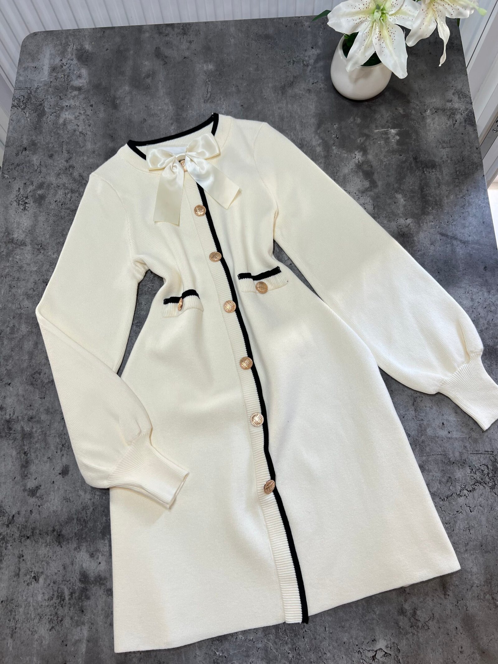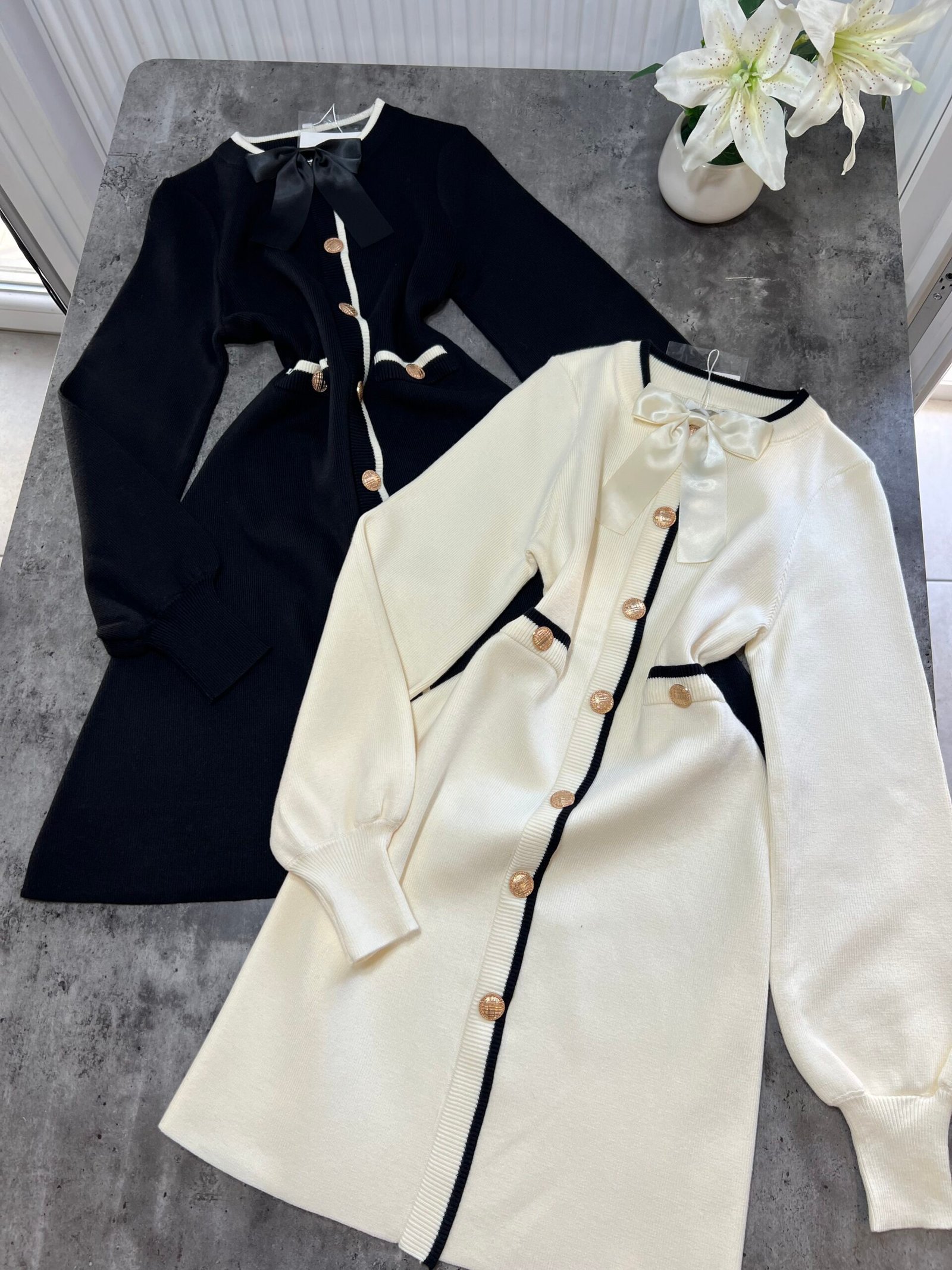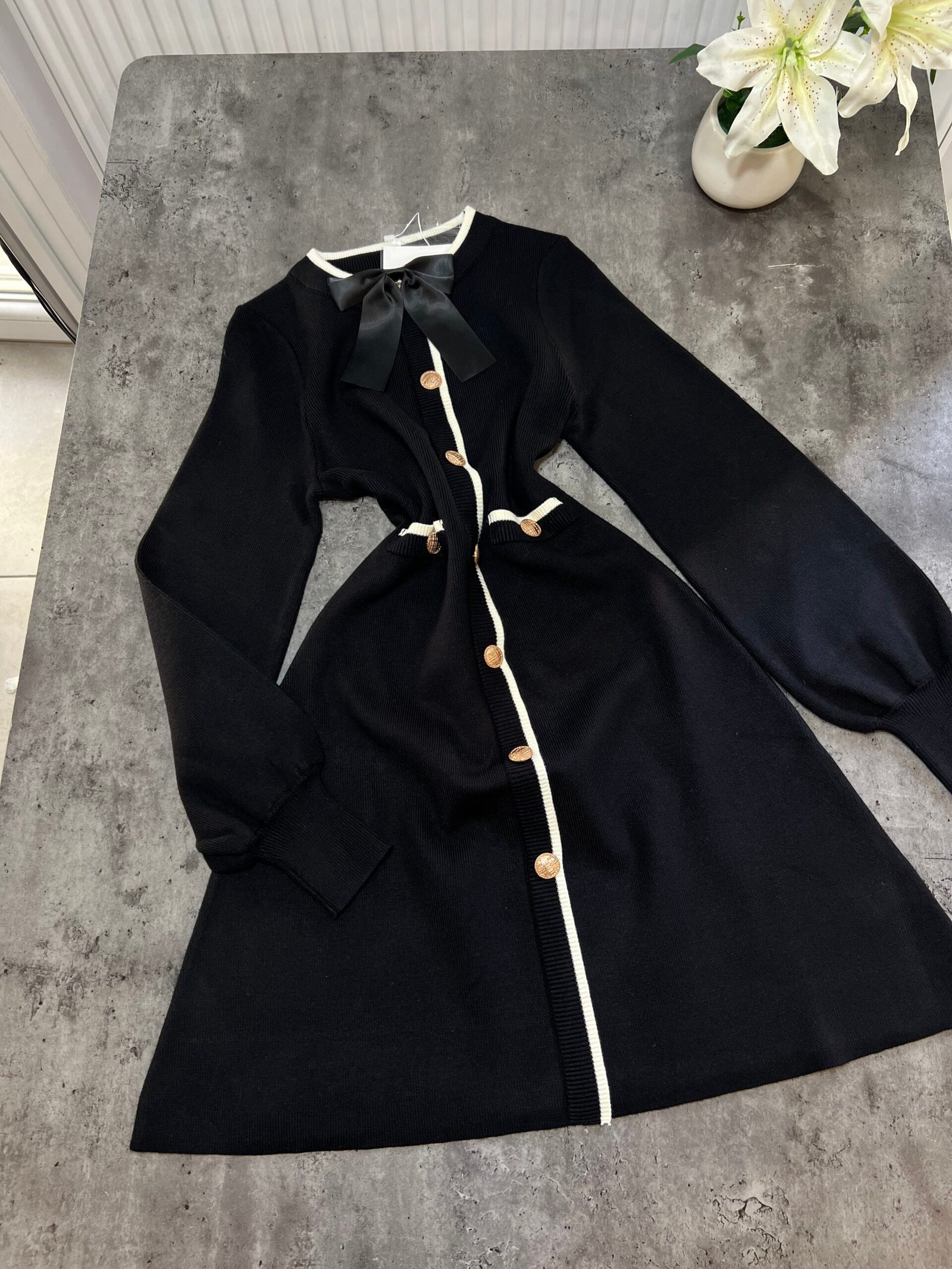Fustan elegant me stil klasik dhe prekje moderne, i realizuar me material të butë dhe të strukturuar që ofron rehati dhe formë të bukur gjatë veshjes. Dizajni me detaje dekorative metalike dhe xhepa të theksuar krijon një pamje të kuruar dhe shumë femërore, ndërsa fjongoja në pjesën e sipërme shton finesë dhe elegancë. Një zgjedhje ideale për paraqitje të rregullta ditore apo raste ku kërkohet stil i pastër dhe i rafinuar.