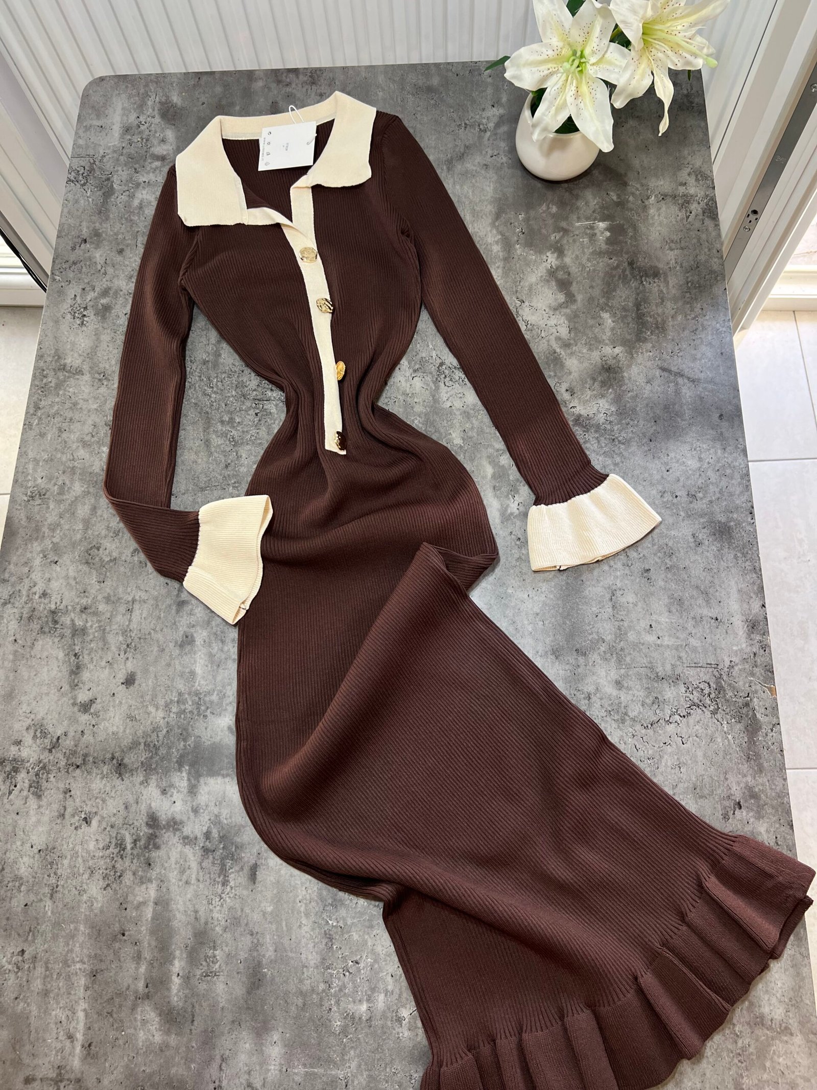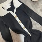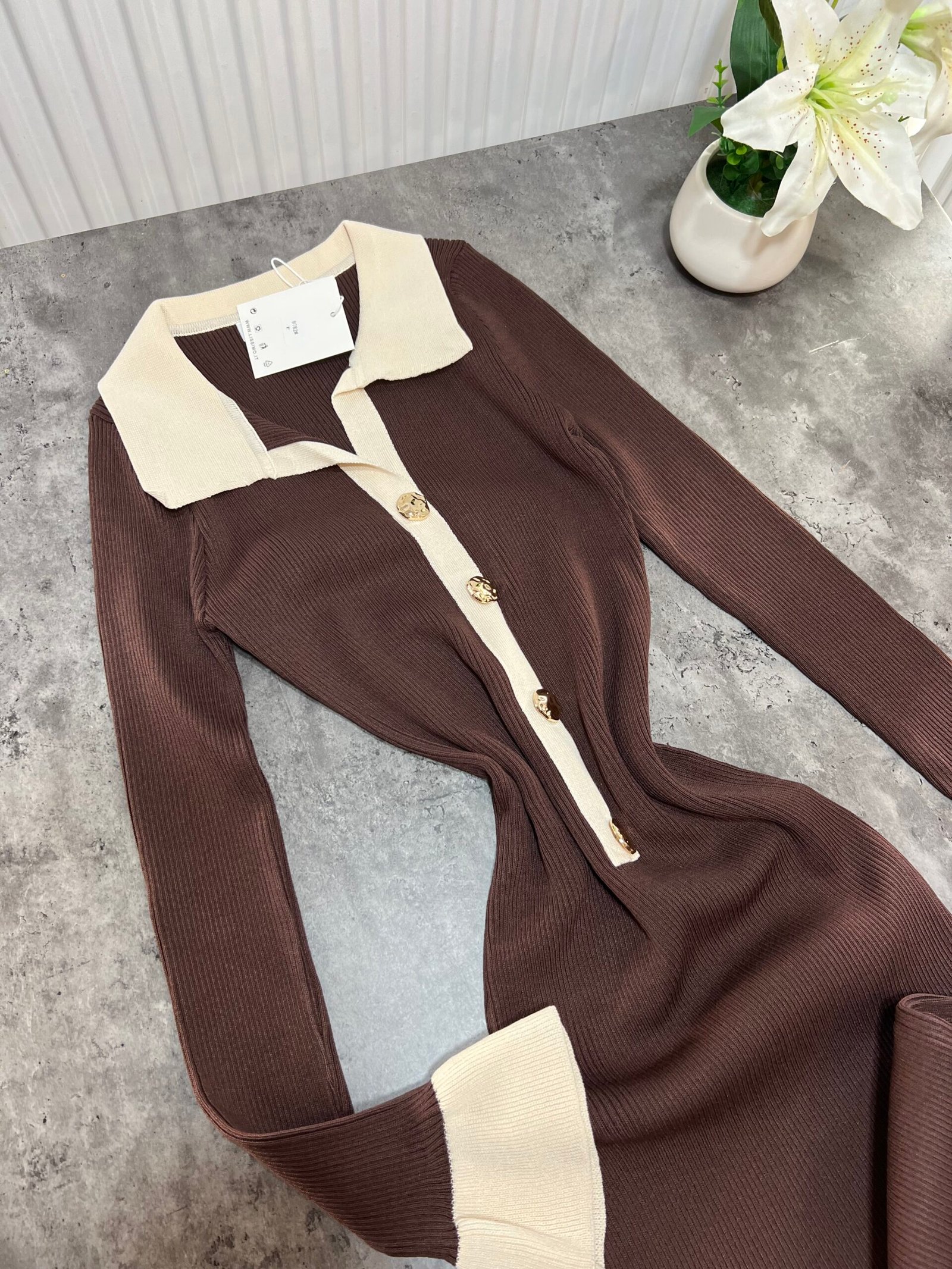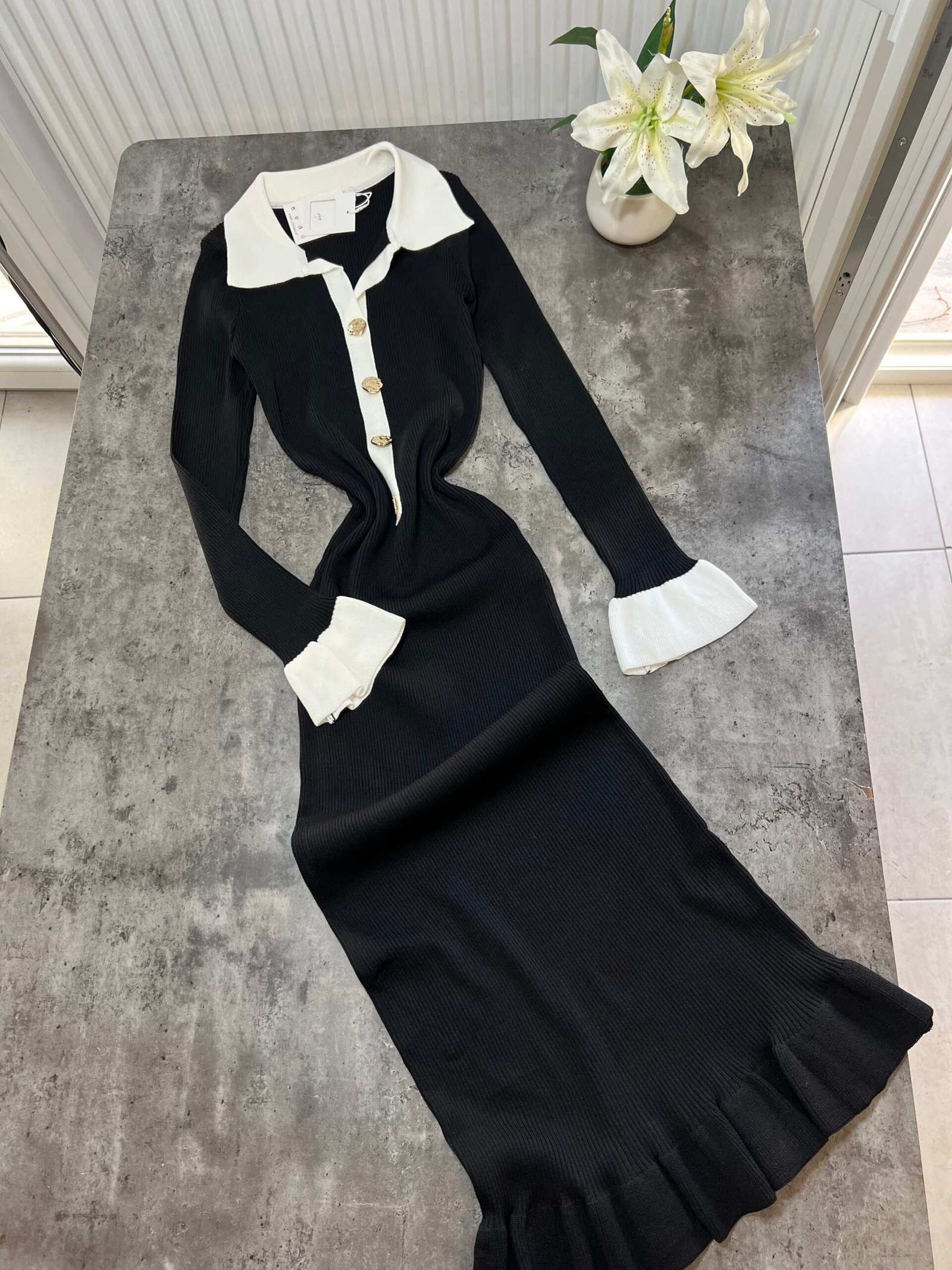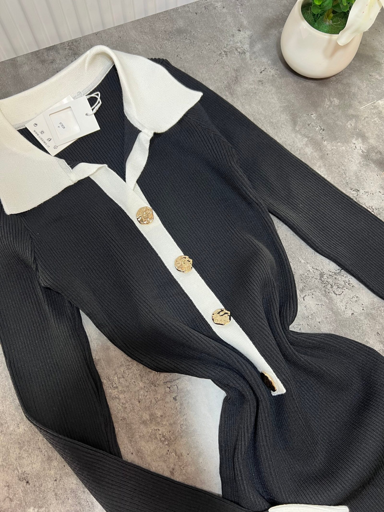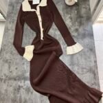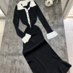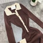 Fustan femëror i kuruar, i realizuar me material elastik me teksturë rib që përshtatet bukur me trupin dhe thekson siluetën. Dizajni me jakë klasike, mansheta të theksuara dhe detaje dekorative në pjesën e përparme krijon një pamje elegante dhe moderne, ndërsa prerja e poshtme me valëzim të lehtë i jep lëvizje dhe finesë veshjes.