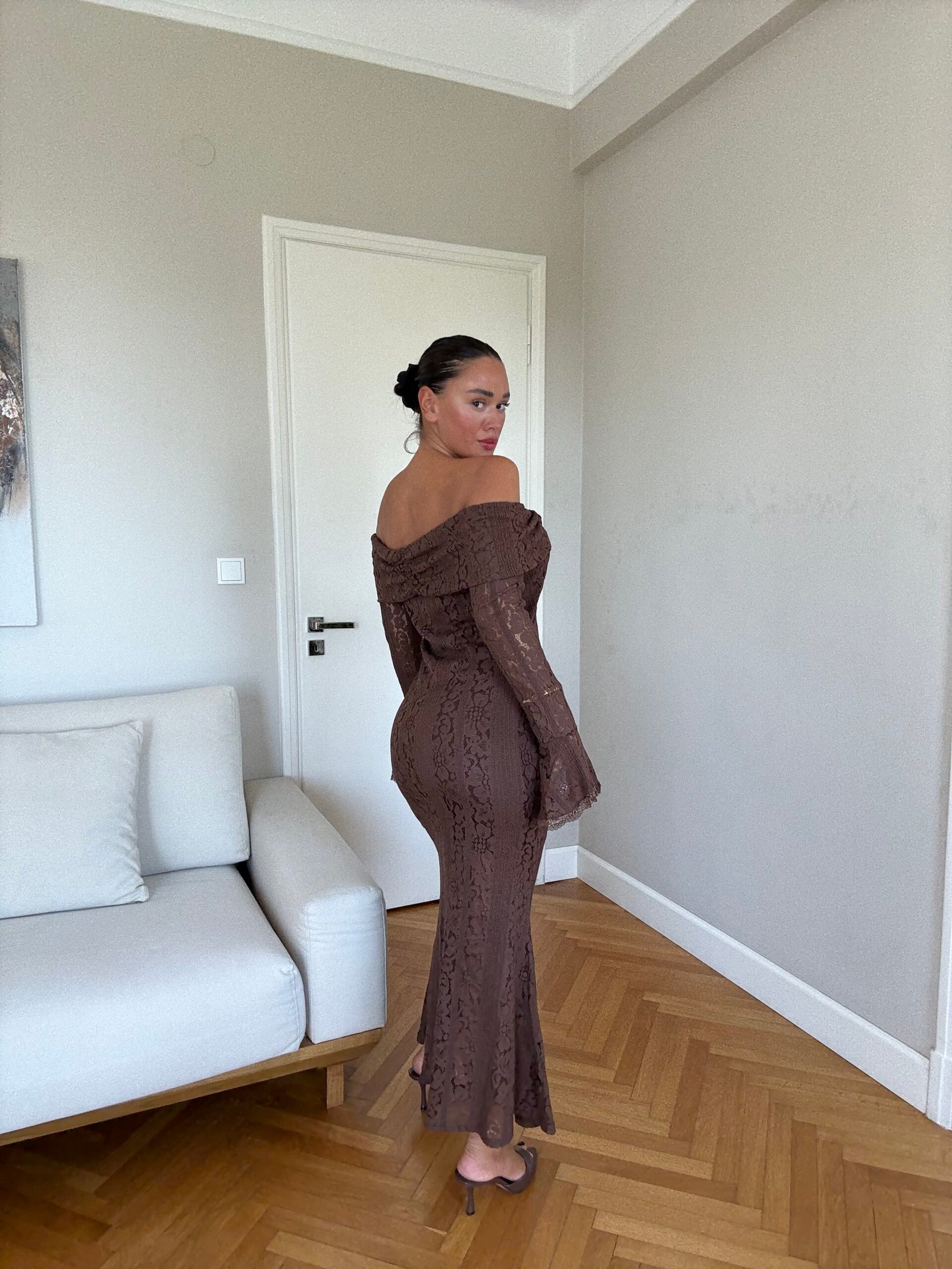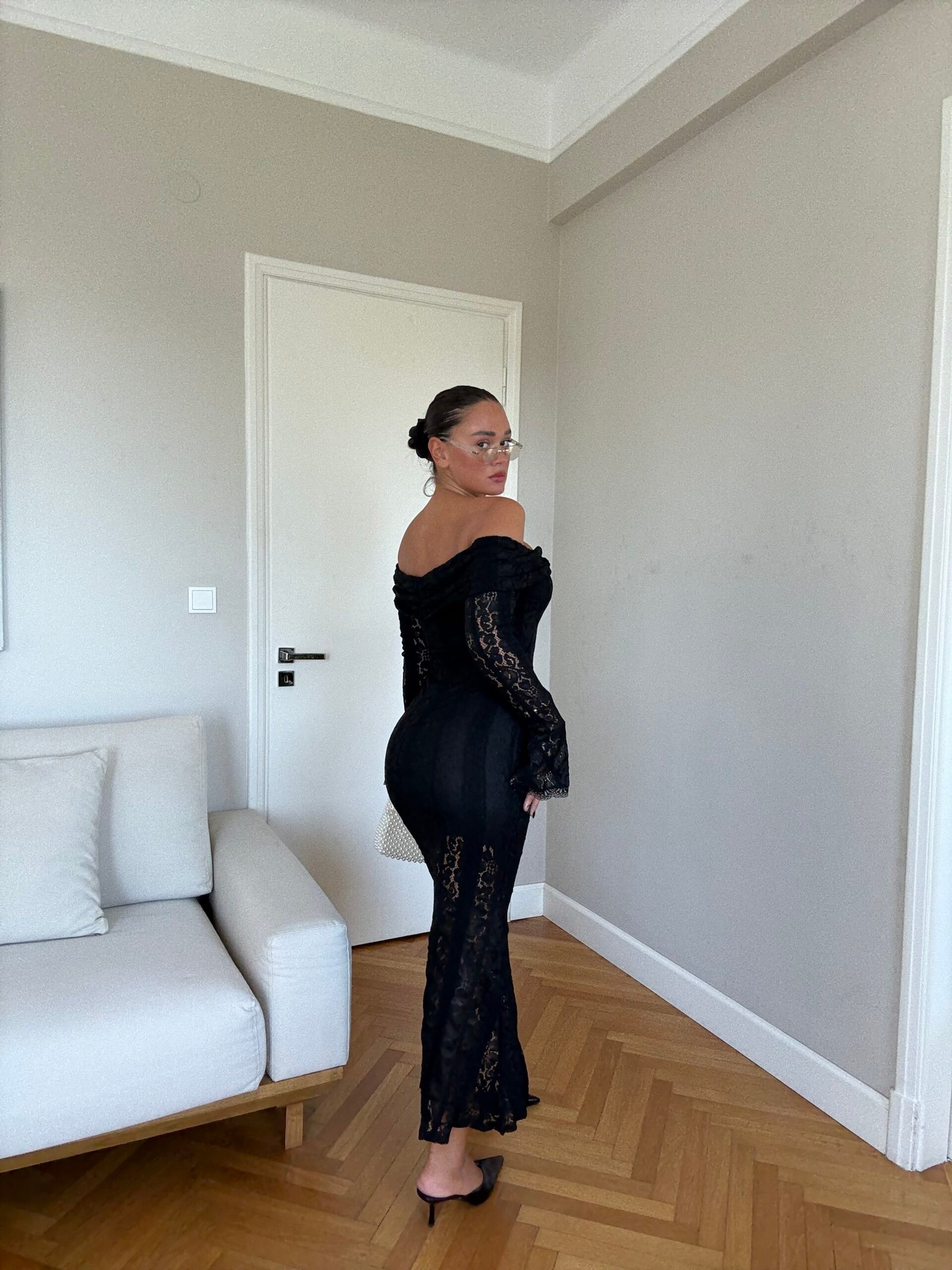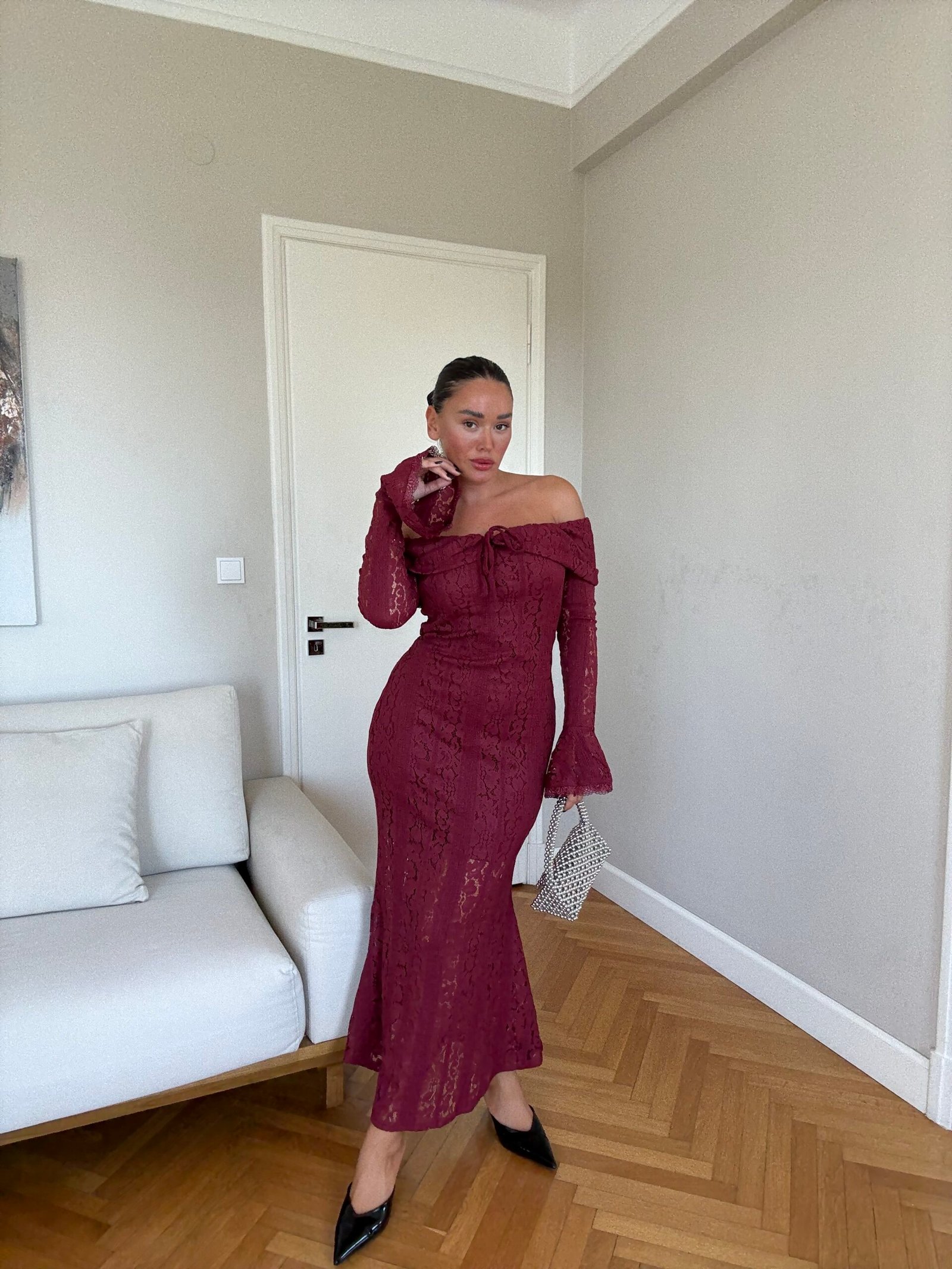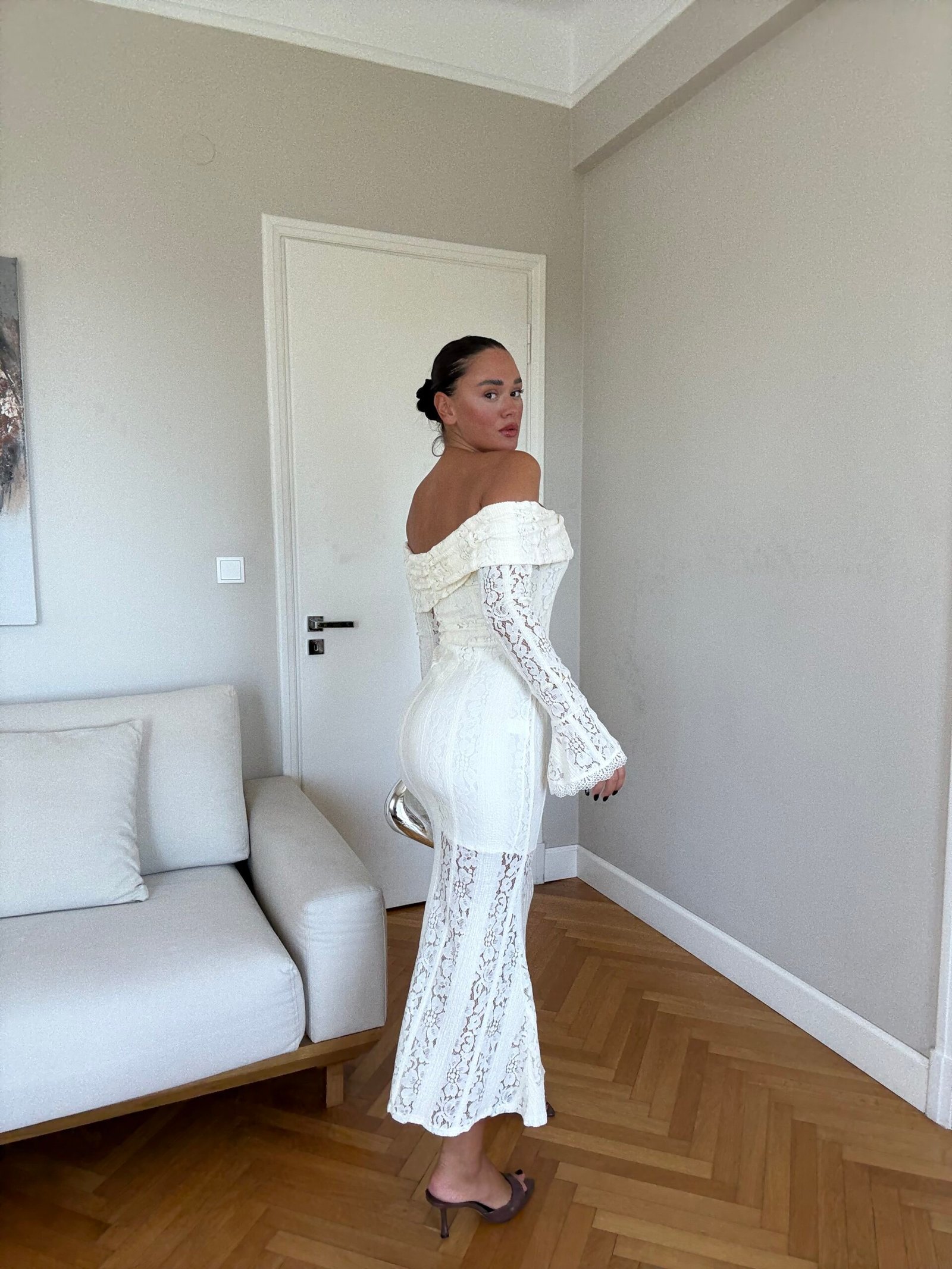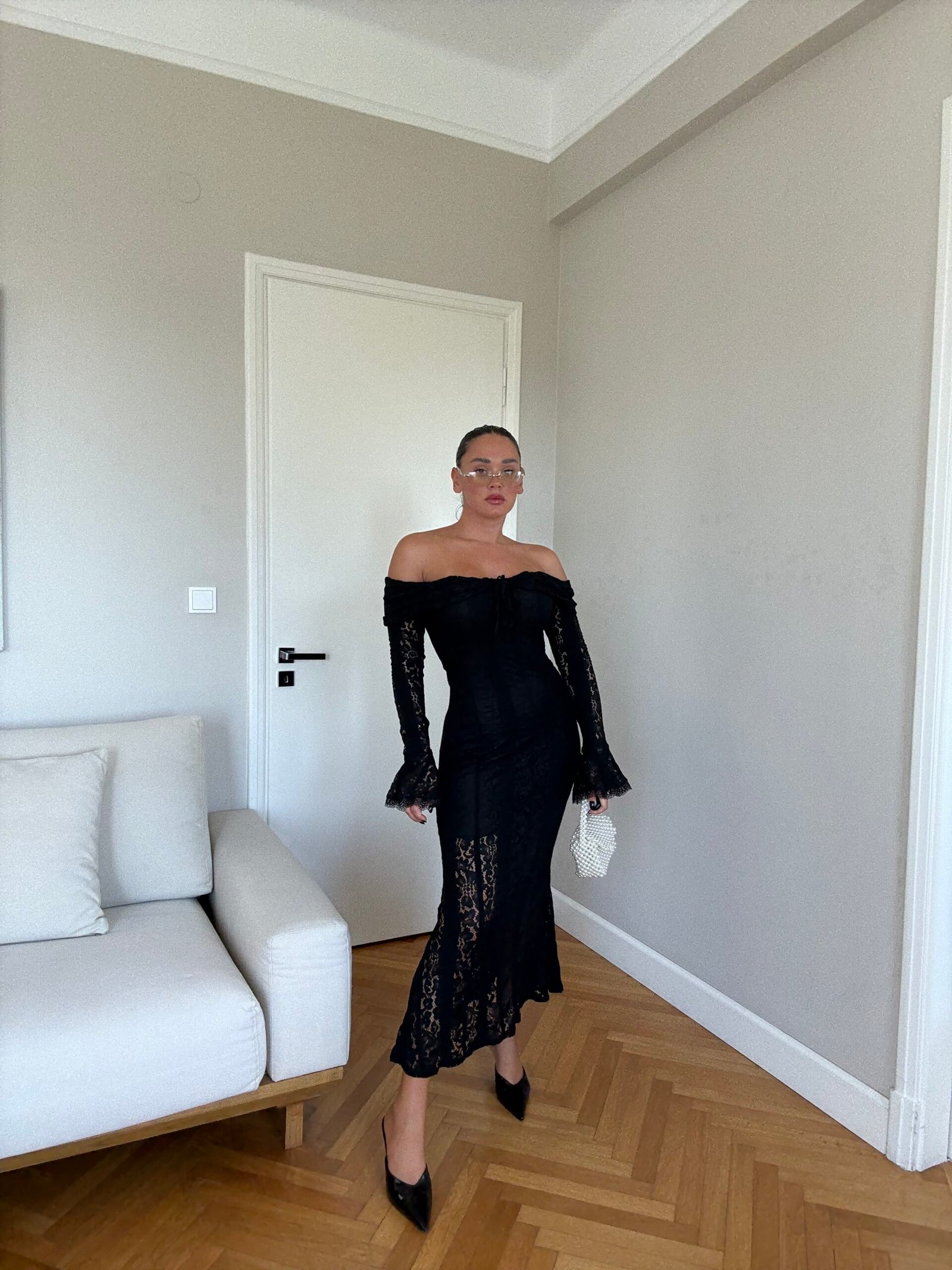 Ky fustan i gjatë me dantellë është një zgjedhje elegante dhe sensuale për mbrëmje apo evente speciale. Modeli off-shoulder nxjerr në pah shpatullat, ndërsa prerja e ngushtë thekson linjat e trupit me finesë. Mëngët e gjata me fund të lehtë të valëzuar i shtojnë delikatesë dhe stil romantik.