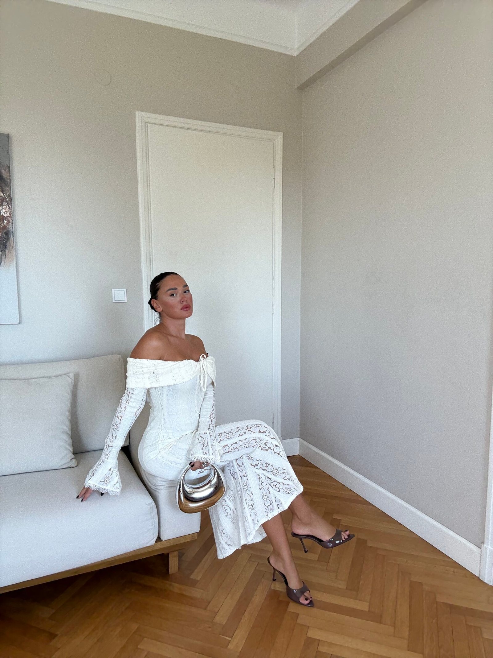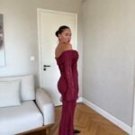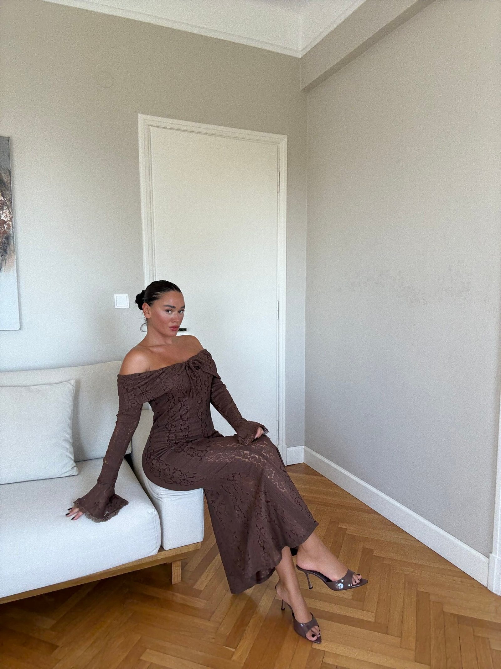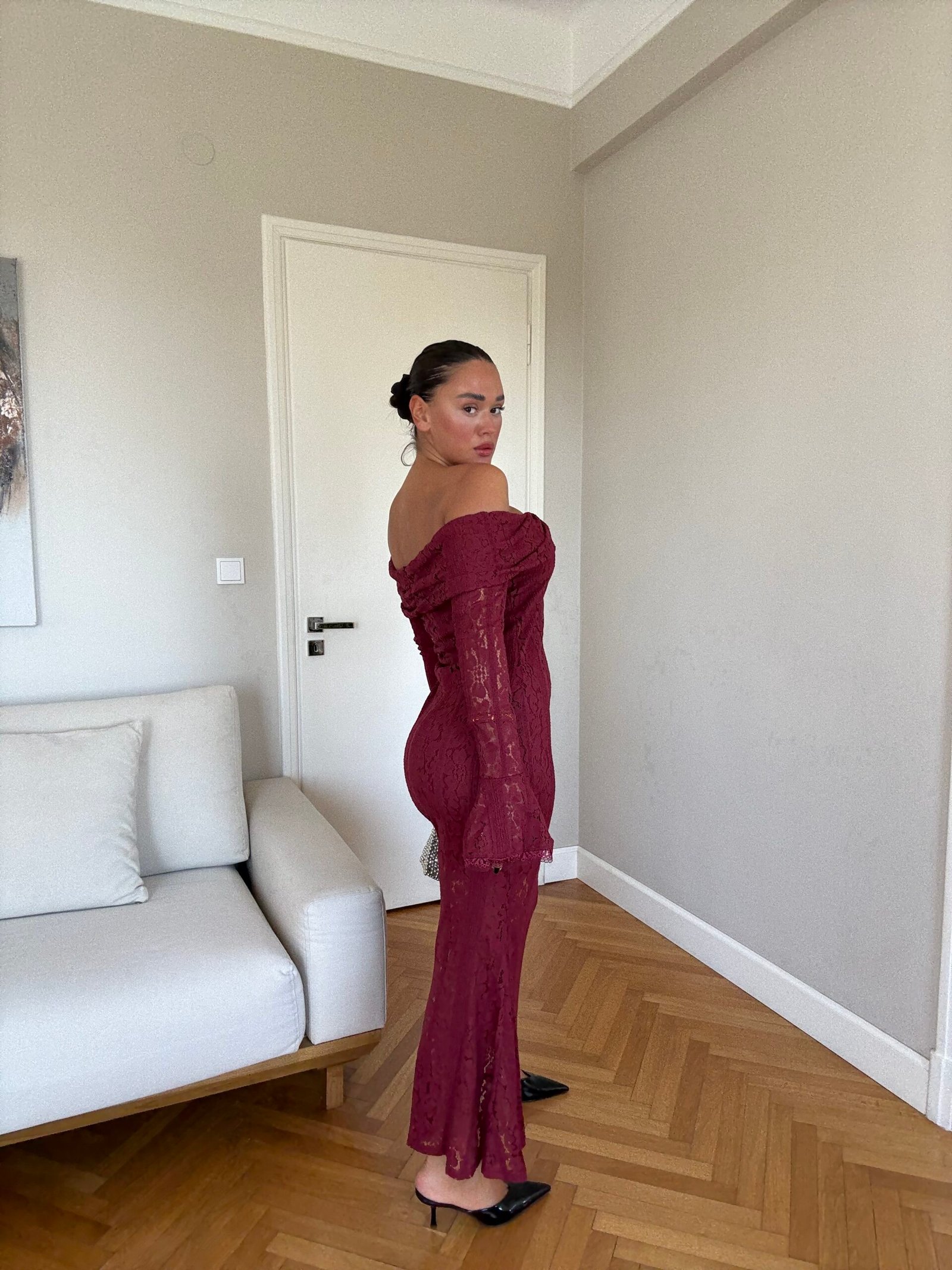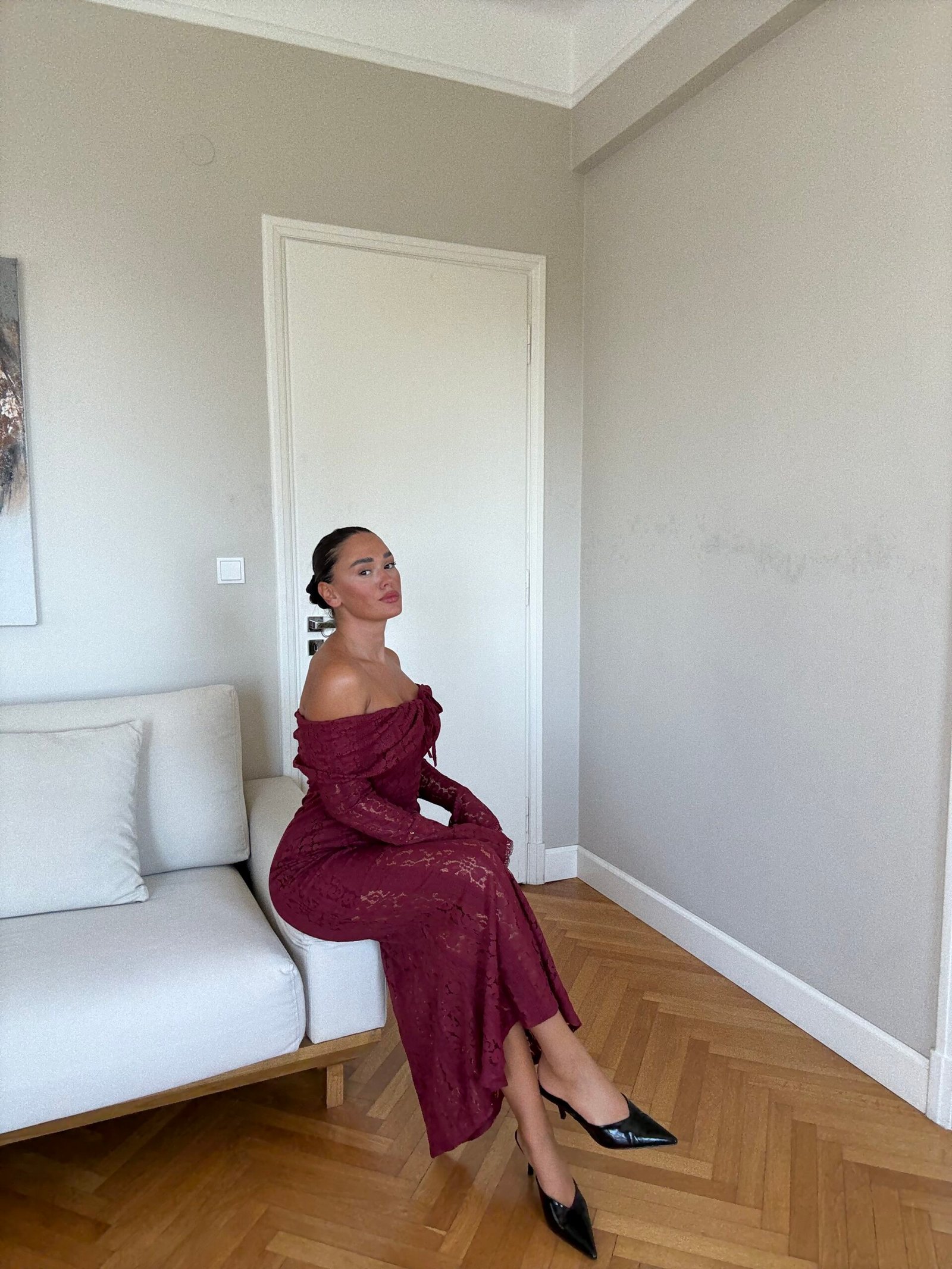 Ky fustan i gjatë me dantellë është një zgjedhje elegante dhe sensuale për mbrëmje apo evente speciale. Modeli off-shoulder nxjerr në pah shpatullat, ndërsa prerja e ngushtë thekson linjat e trupit me finesë. Mëngët e gjata me fund të lehtë të valëzuar i shtojnë delikatesë dhe stil romantik.