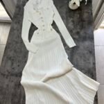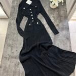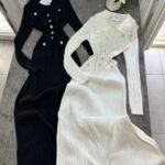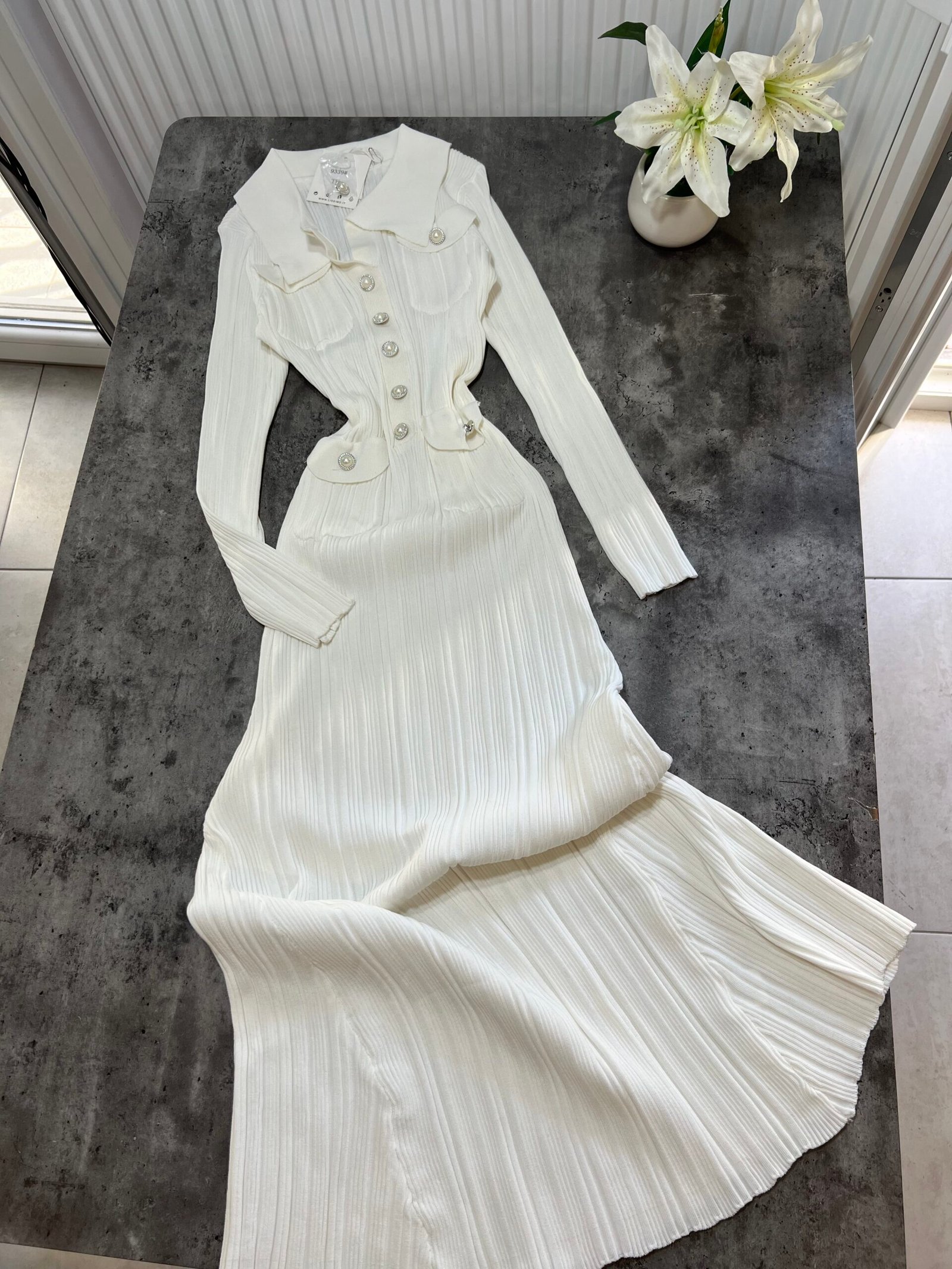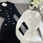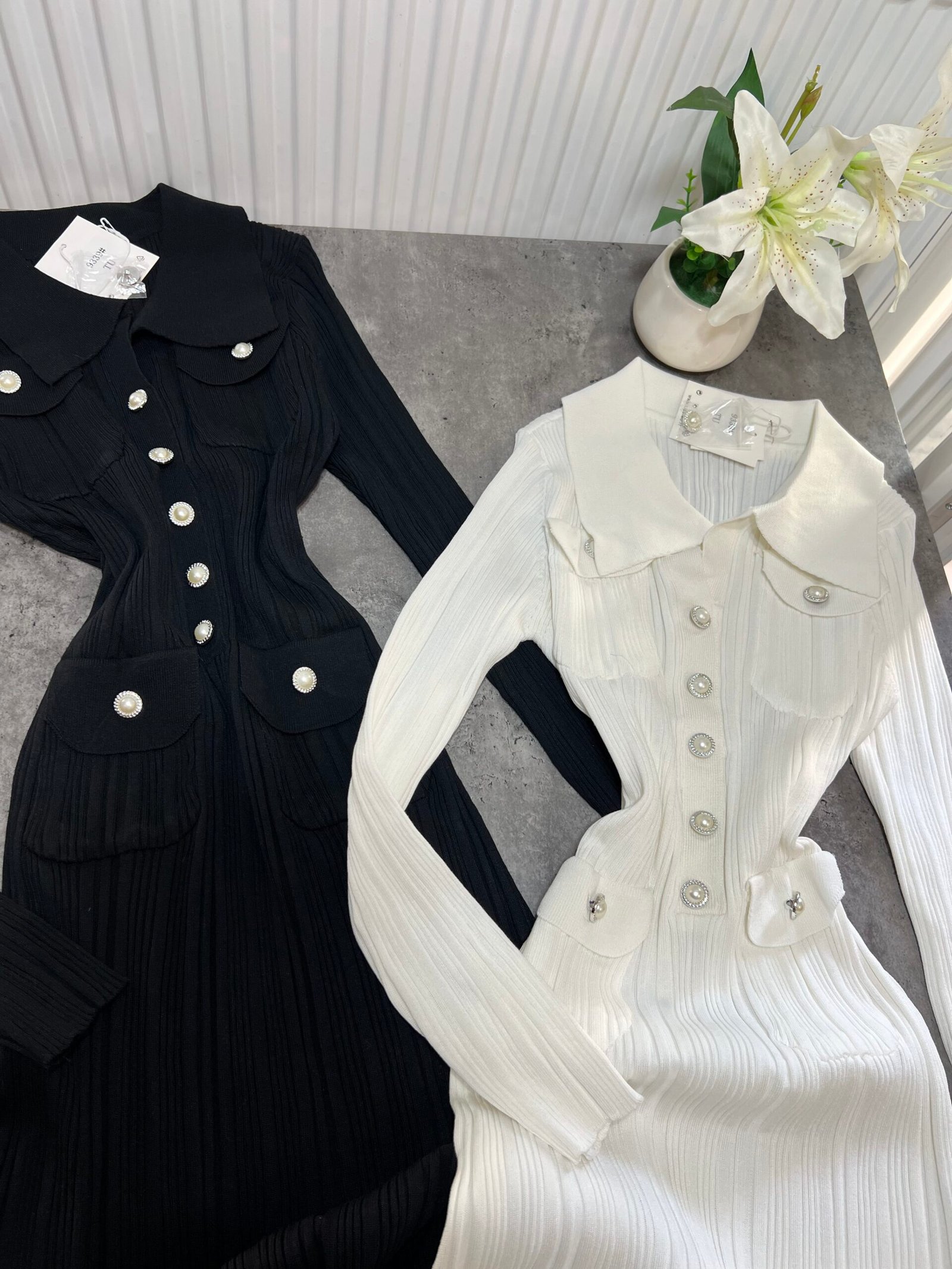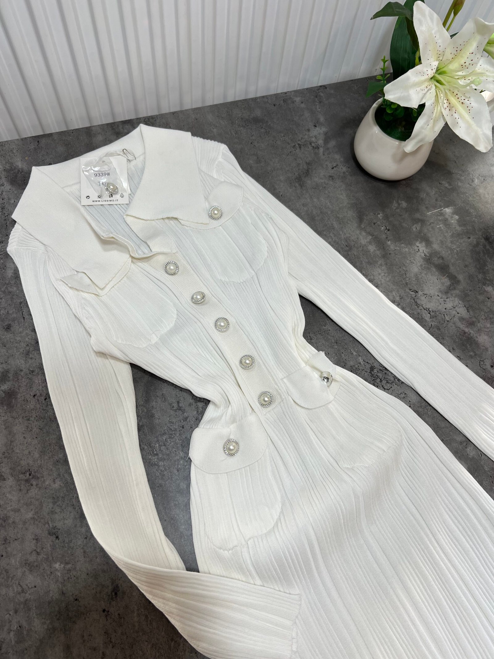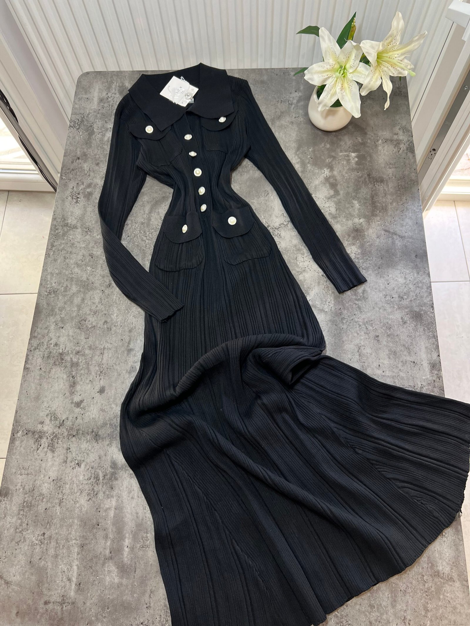 Fustan i rafinuar me prerje femërore dhe material elastik me teksturë rib që përshtatet bukur me trupin dhe krijon një siluetë elegante. Dizajni me jakë klasike dhe detaje dekorative në pjesën e përparme i jep një stil modern dhe të kuruar, duke e bërë ideal si për ditë ashtu edhe për dalje më të veçanta. Kombinon rehati dhe elegancë në një veshje të vetme që bie në sy pa qenë e tepruar
