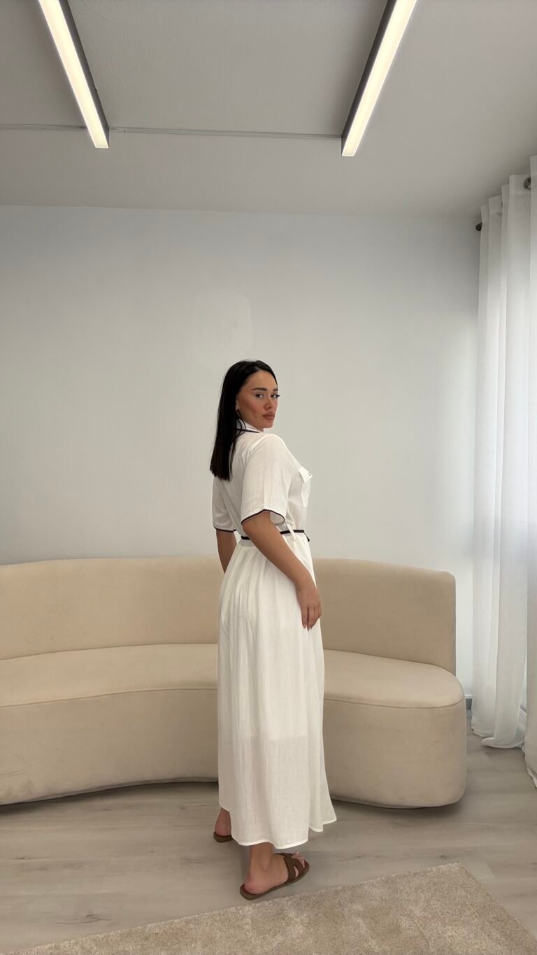 Fustan maxi stil këmishë me prerje të rrjedhshme dhe rrip në bel që krijon një siluetë elegante dhe femërore. Detajet kontrast përgjatë butonave dhe mëngëve i japin karakter unik, ndërsa materiali i lehtë e bën ideal për ditët e ngrohta. Një zgjedhje perfekte për një look të pastër, classy dhe effortless gjatë gjithë sezonit.