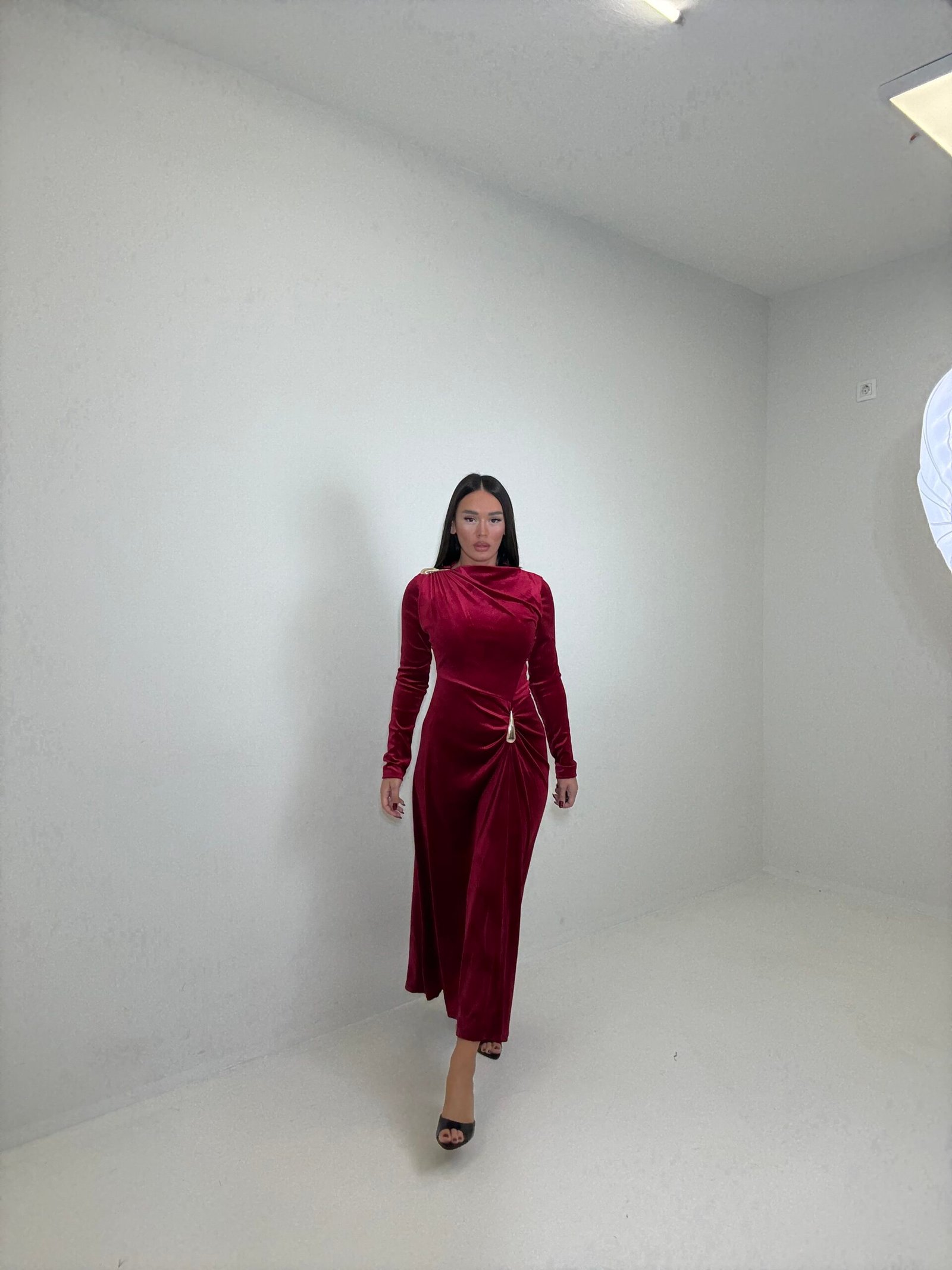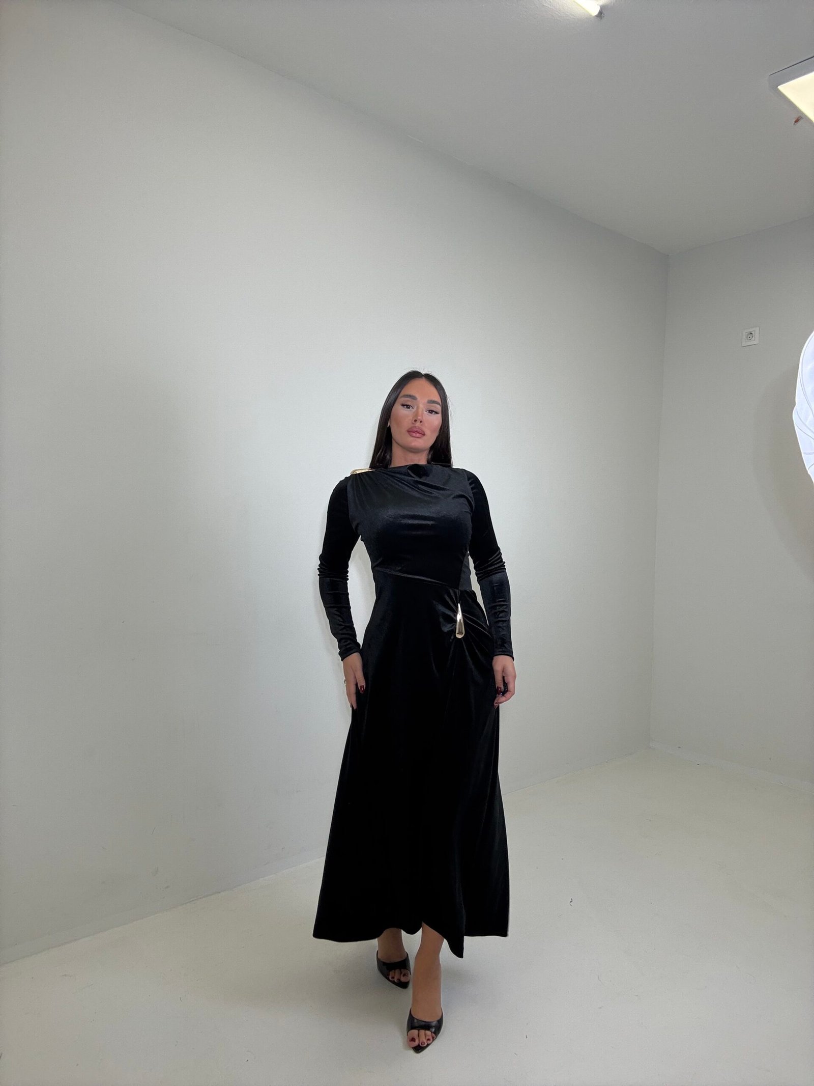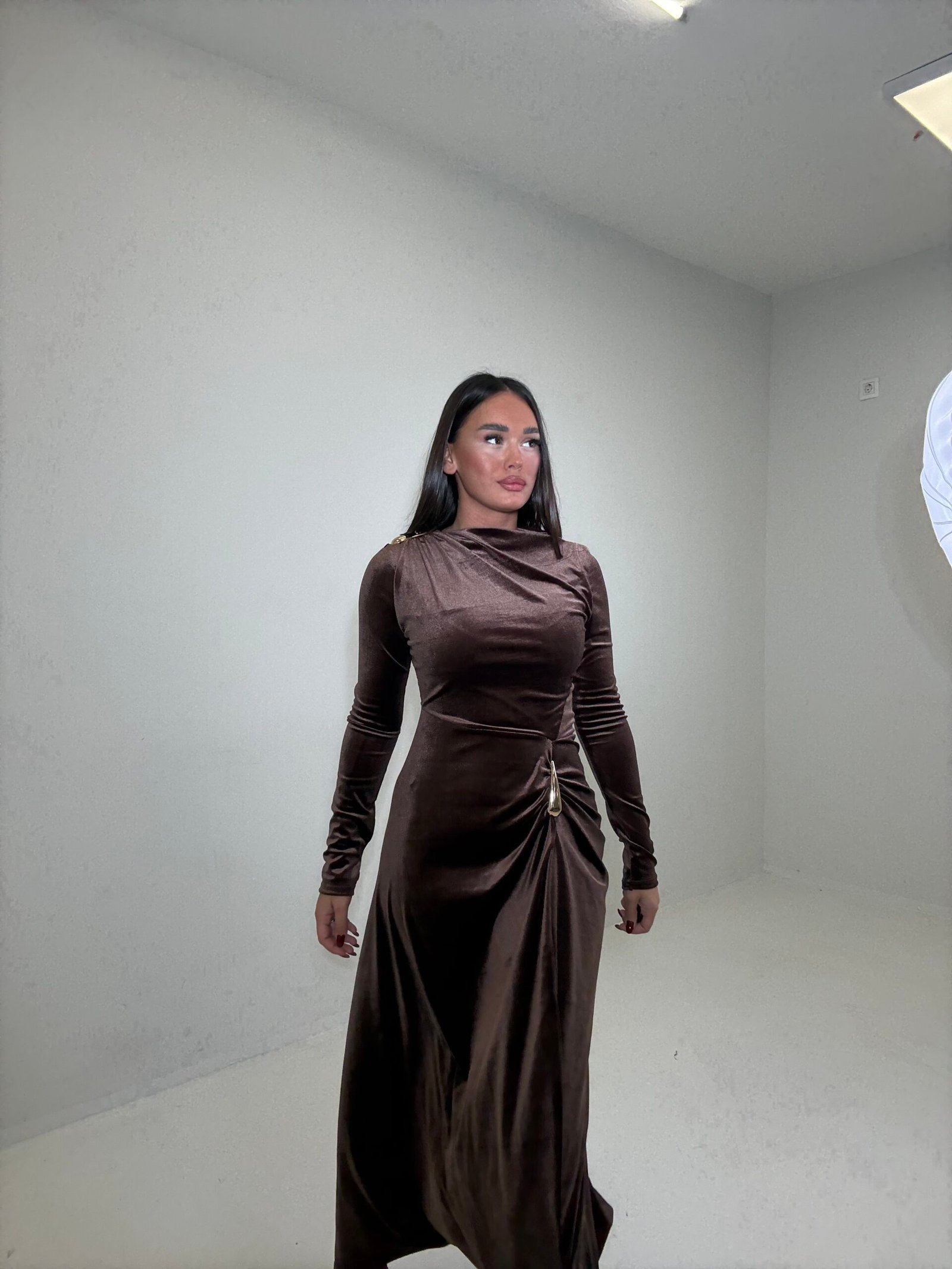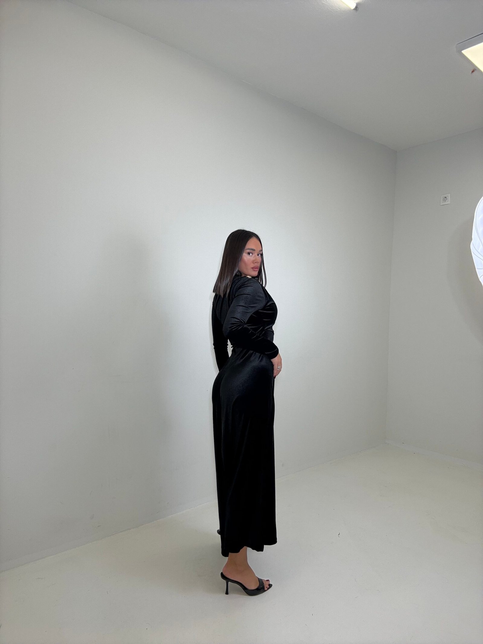 Fustan elegant i gjatë, i punuar nga material velvet me shkëlqim të butë. Ka mëngë të gjata dhe detaj të rrudhur në bel që thekson siluetën. Përshtatet në mënyrë perfekte për mbrëmje ose evente, duke ofruar një pamje të sofistikuar dhe femërore.
