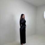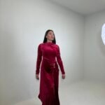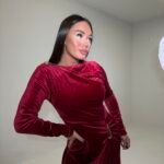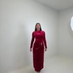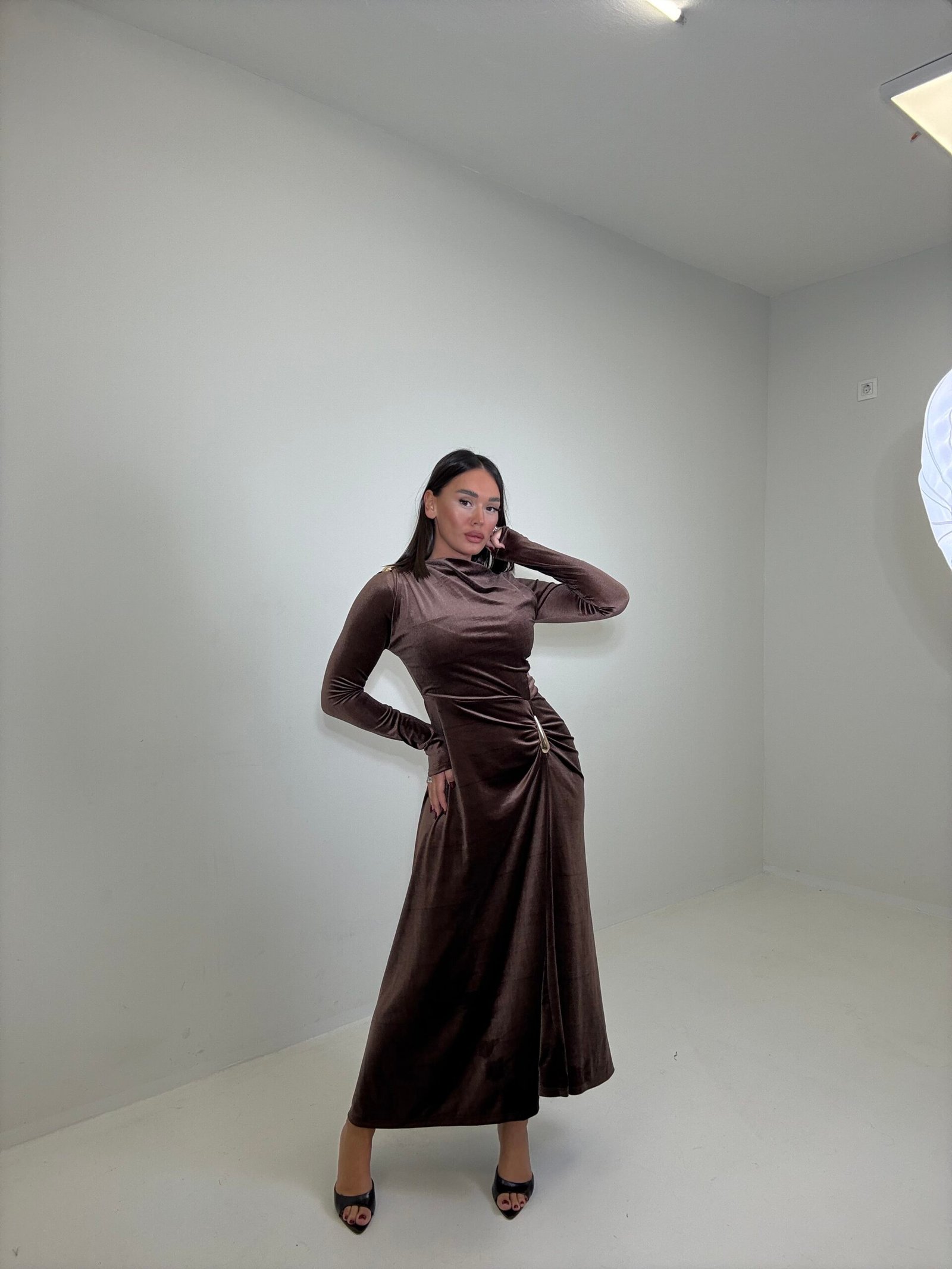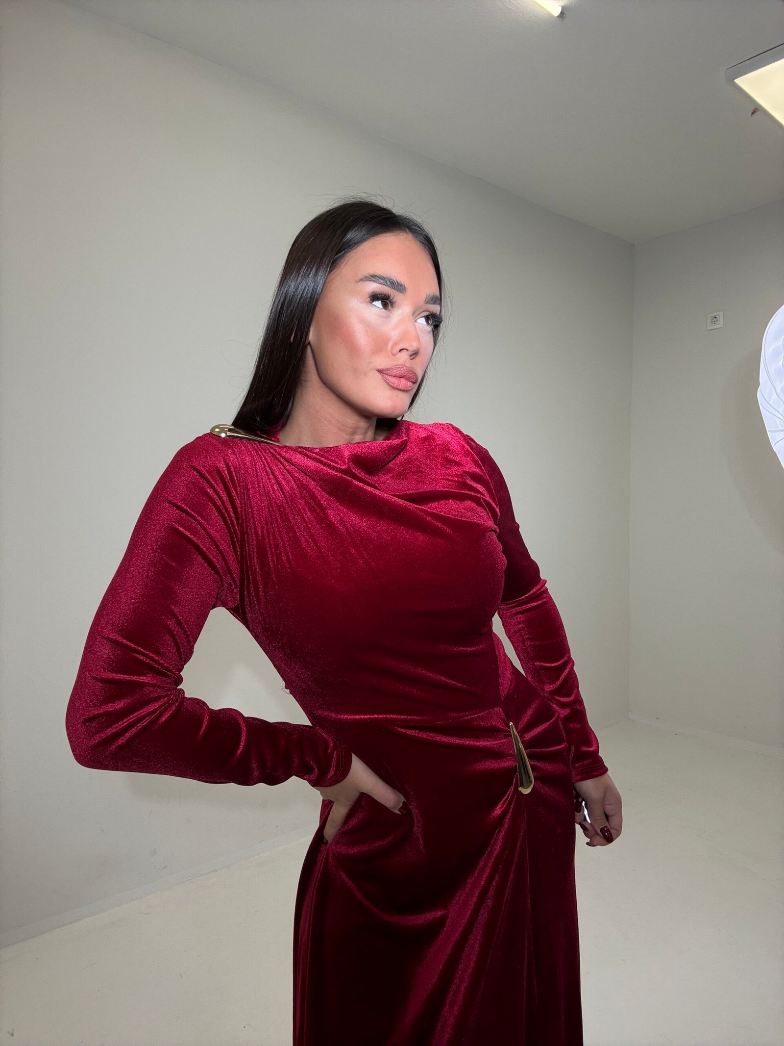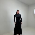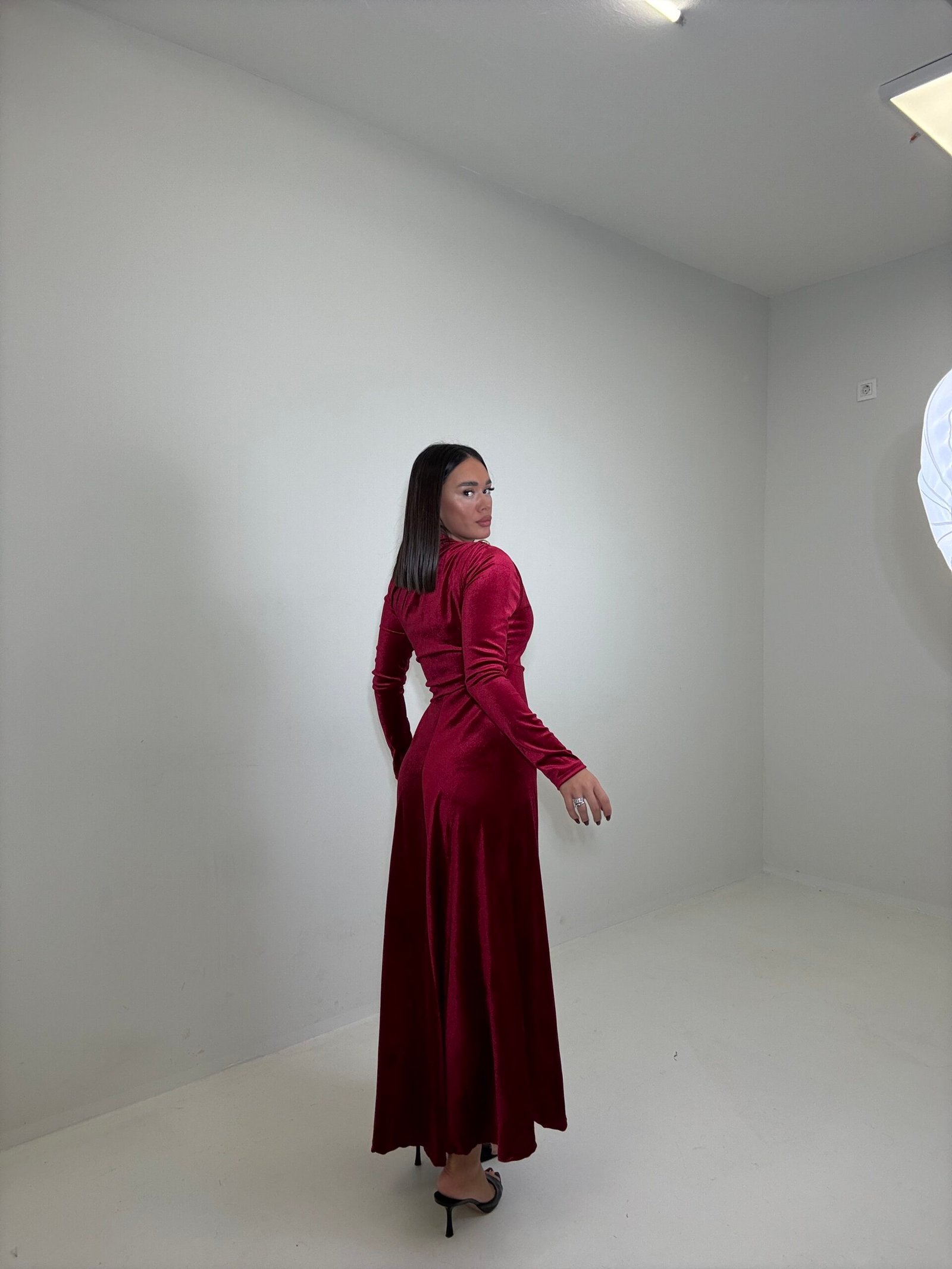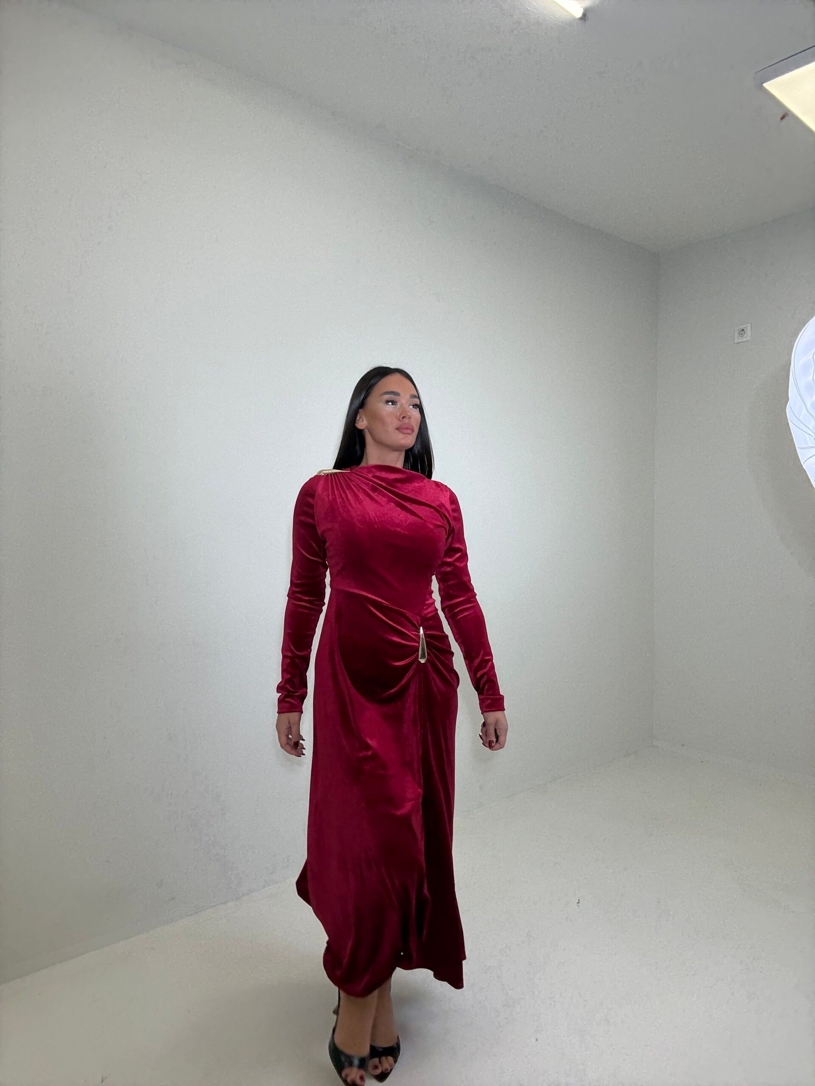 Fustan elegant i gjatë, i punuar nga material velvet me shkëlqim të butë. Ka mëngë të gjata dhe detaj të rrudhur në bel që thekson siluetën. Përshtatet në mënyrë perfekte për mbrëmje ose evente, duke ofruar një pamje të sofistikuar dhe femërore.