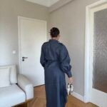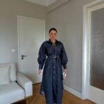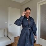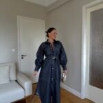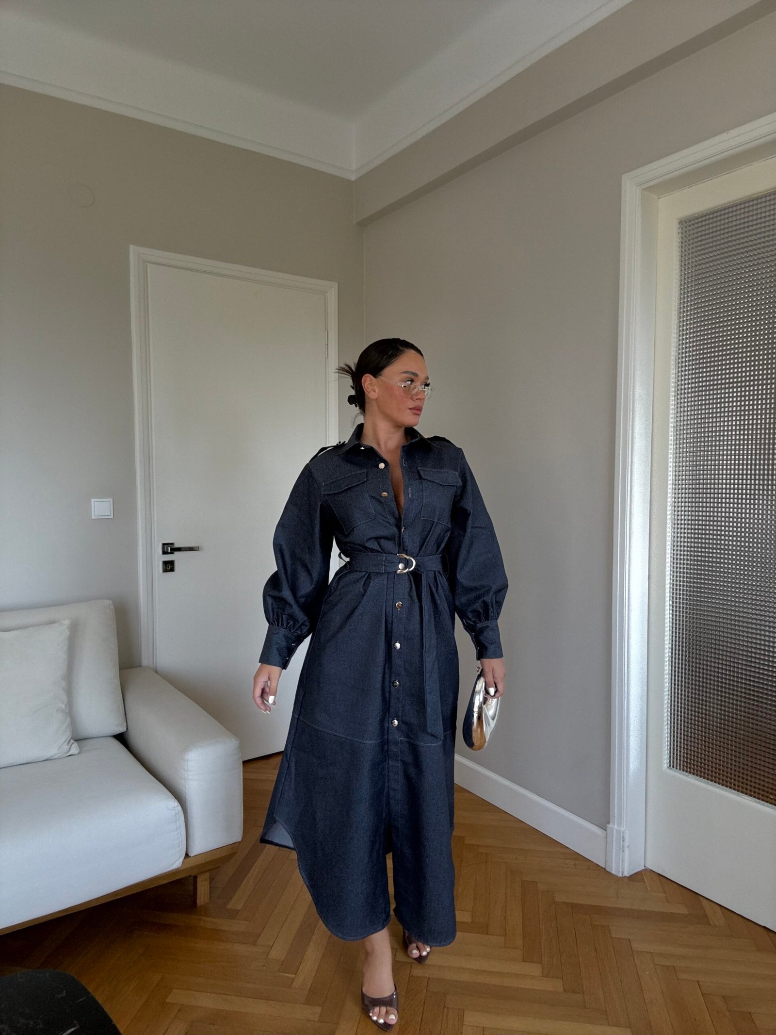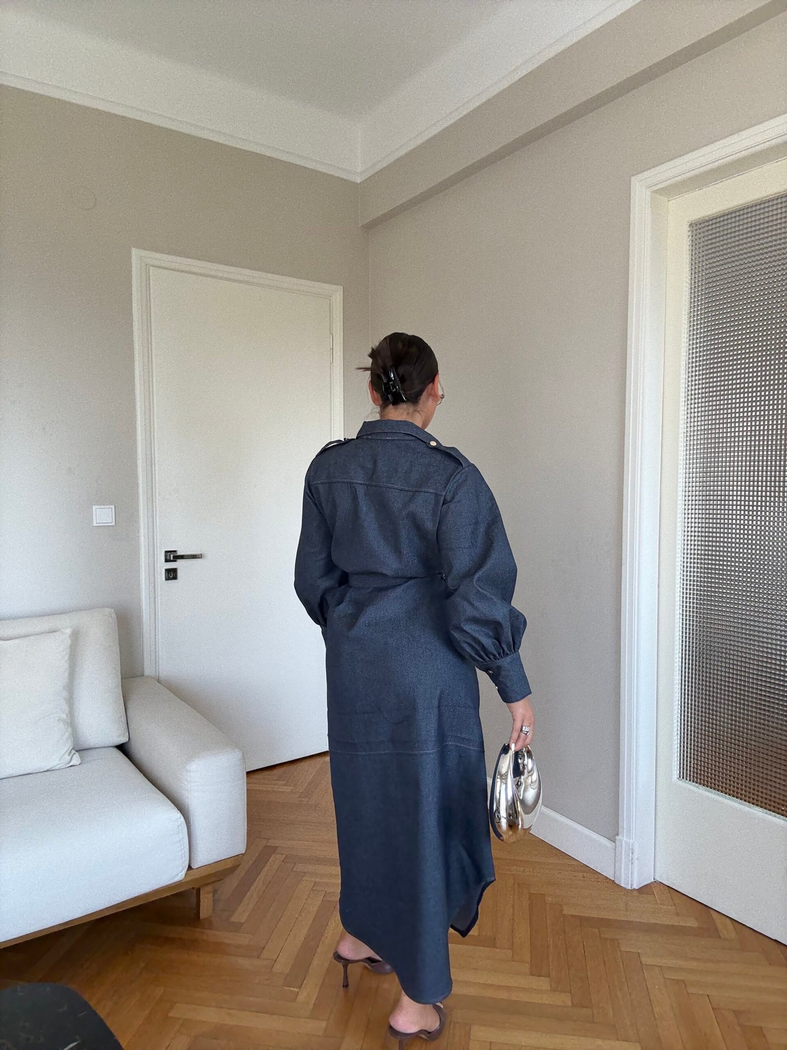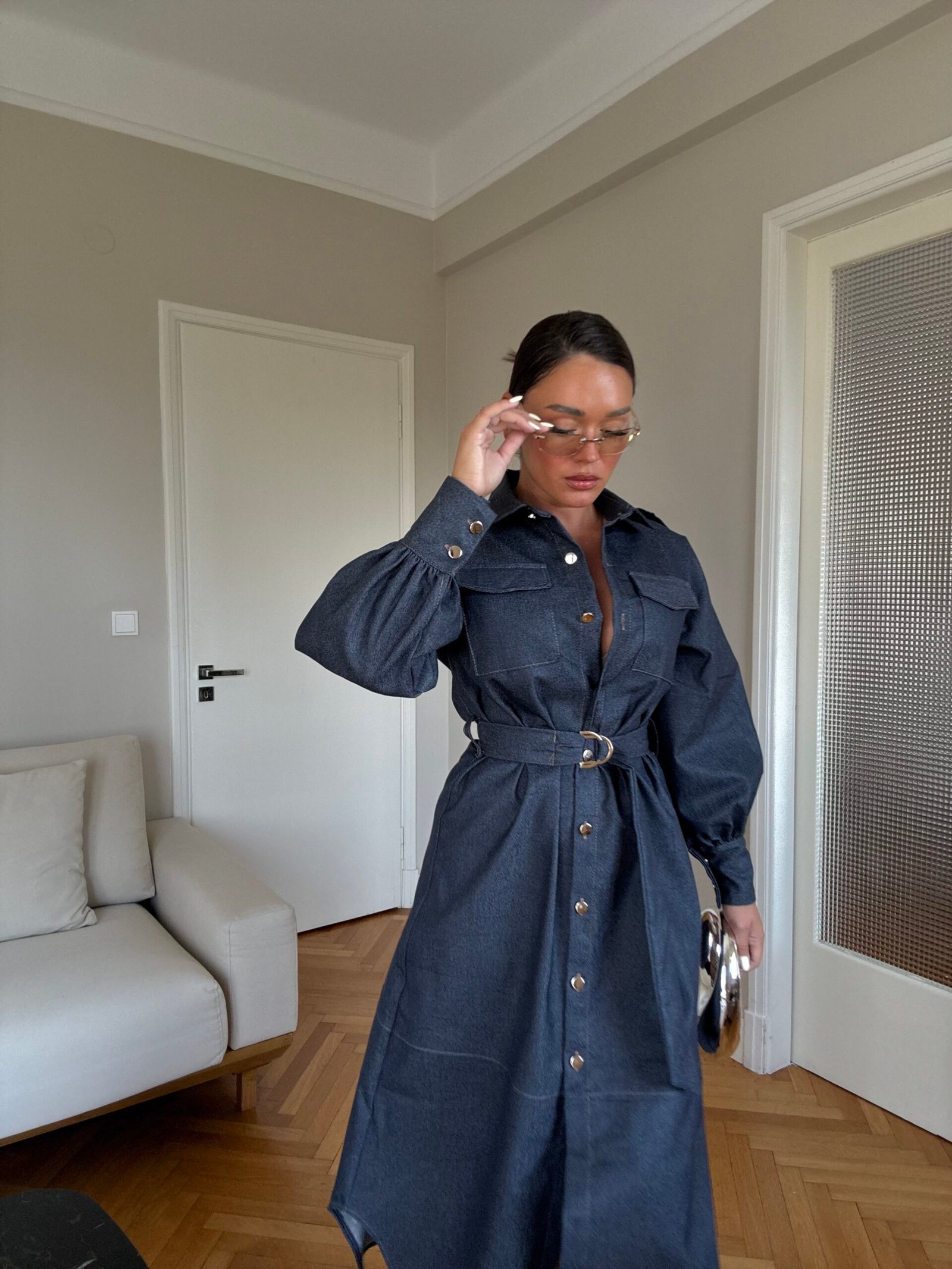 Ky fustan xhins i gjatë është një zgjedhje moderne dhe funksionale që kombinon komoditetin e përditshëm me stilin elegant. Me mëngë të gjata me fryrje të lehtë, kopsa metalike në pjesën e përparme dhe rrip në bel për theksimin e siluetës, ai krijon një pamje të balancuar mes chic dhe casual.