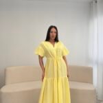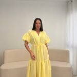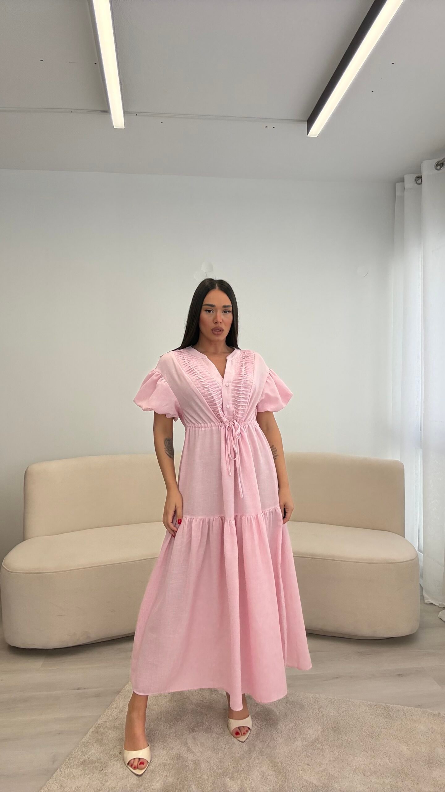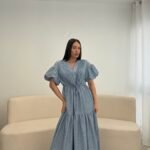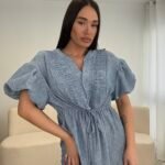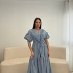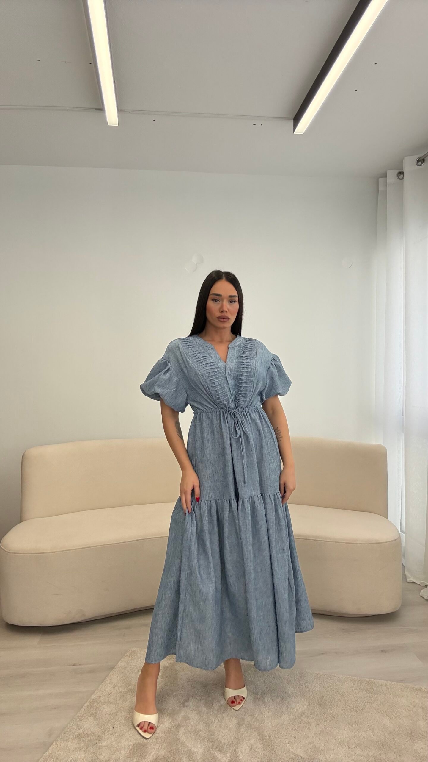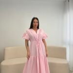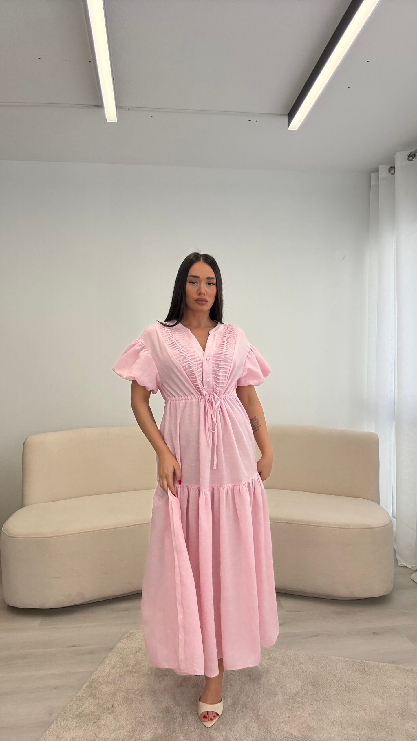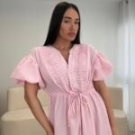 Fustan me prerje të lirshme dhe bel të rregullueshëm që thekson siluetën. Detajet me pala në pjesën e sipërme dhe mëngët voluminoze i japin një look romantik dhe chic. Material i lehtë dhe i rehatshëm, ideal për ditë të ngrohta, evente dhe dalje elegante.