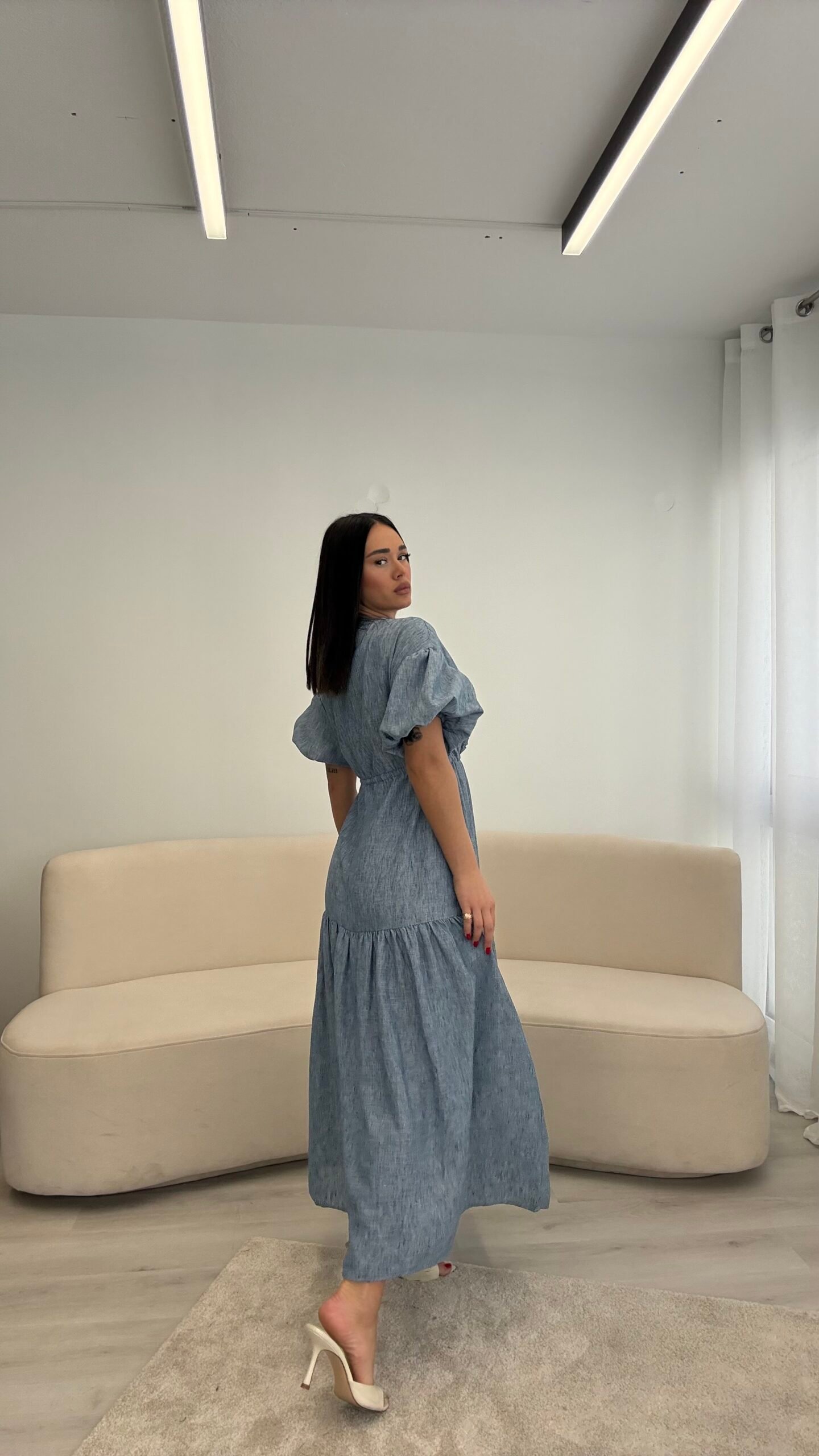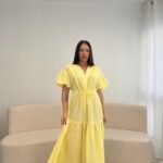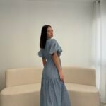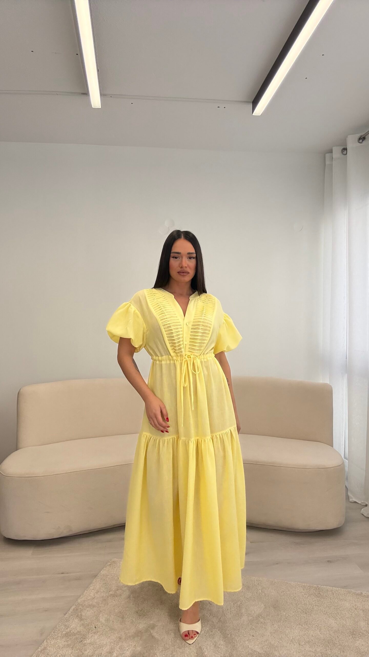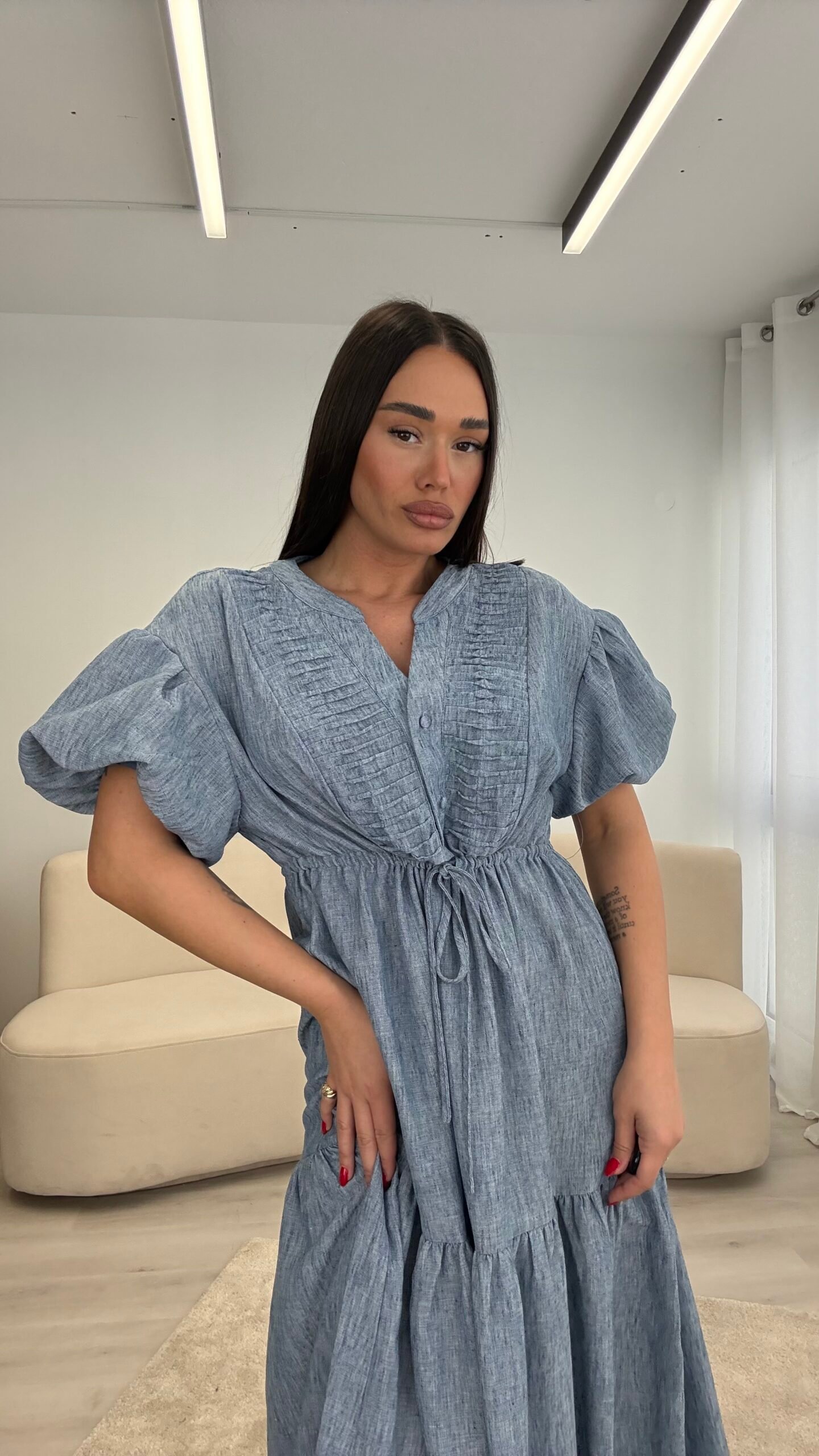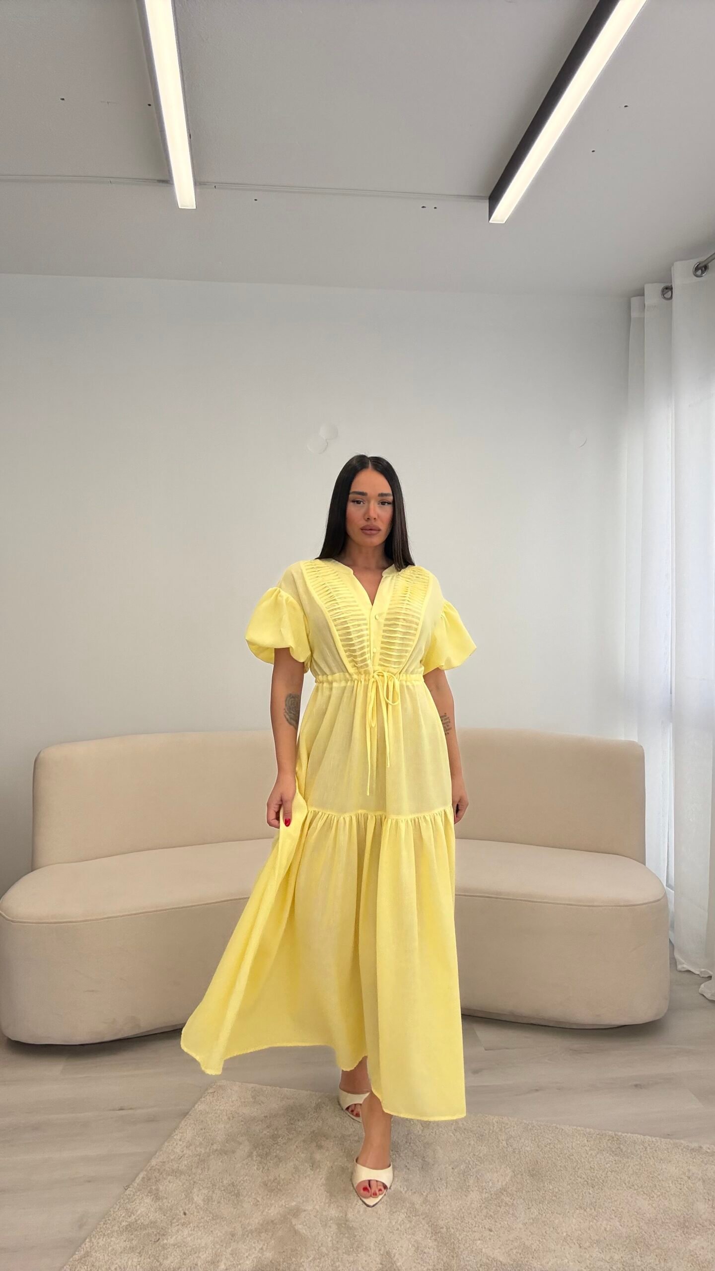 Fustan me prerje të lirshme dhe bel të rregullueshëm që thekson siluetën. Detajet me pala në pjesën e sipërme dhe mëngët voluminoze i japin një look romantik dhe chic. Material i lehtë dhe i rehatshëm, ideal për ditë të ngrohta, evente dhe dalje elegante.