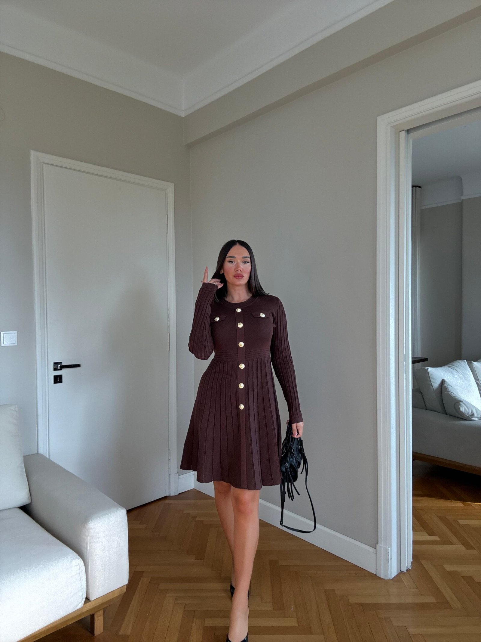 Ky fustan i shkurtër i thurur me mëngë të gjata është një zgjedhje elegante dhe praktike për çdo rast. Dizajni i tij përfshin kopsa dekorative në pjesën e përparme që i japin një prekje klasike, ndërsa prerja e lehtë në fund krijon lëvizshmëri dhe finesë. Materiali i butë dhe elastik siguron komoditet gjatë gjithë ditës.Një fustan që kombinon thjeshtësinë me stilin modern, i lehtë për t’u kombinuar me taka apo çizme për një pamje gjithmonë në trend.