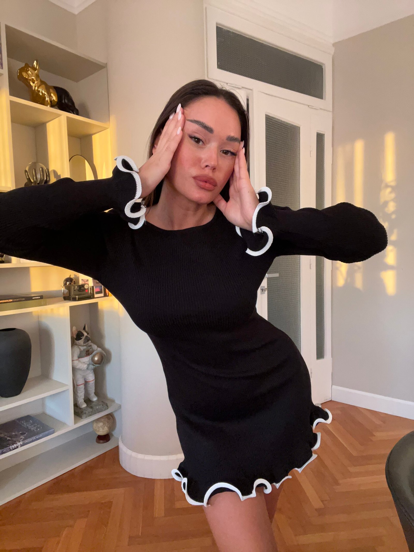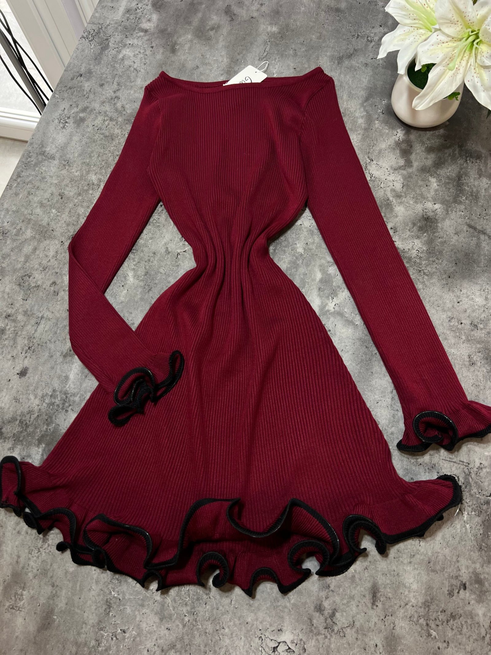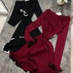 Në copë elastike në punim me riga. Jakë në prerje ovale. Me prerje në bel.
