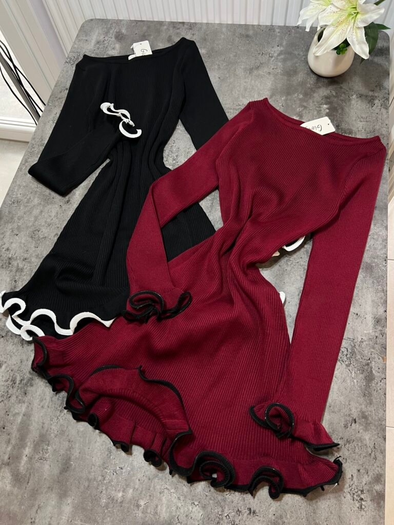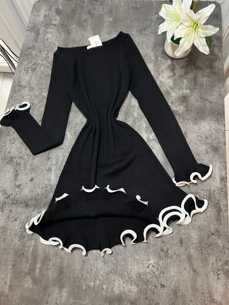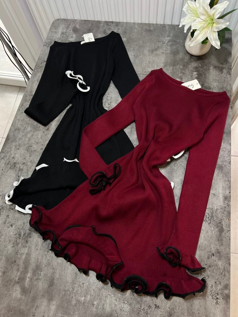 Në copë elastike në punim me riga. Jakë në prerje ovale. Me prerje në bel.