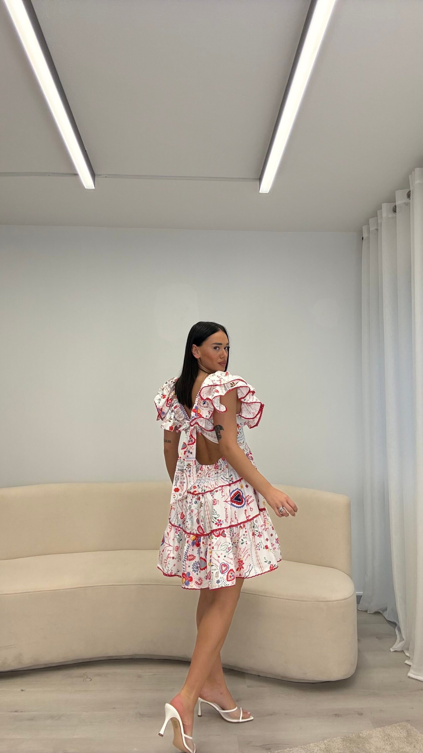 Fustan veror me printe të veçanta dhe volane që krijojnë lëvizje dhe elegancë, me prerje që thekson belin dhe i jep një vibe femëror, romantik dhe “effortless chic” çdo daljeje.