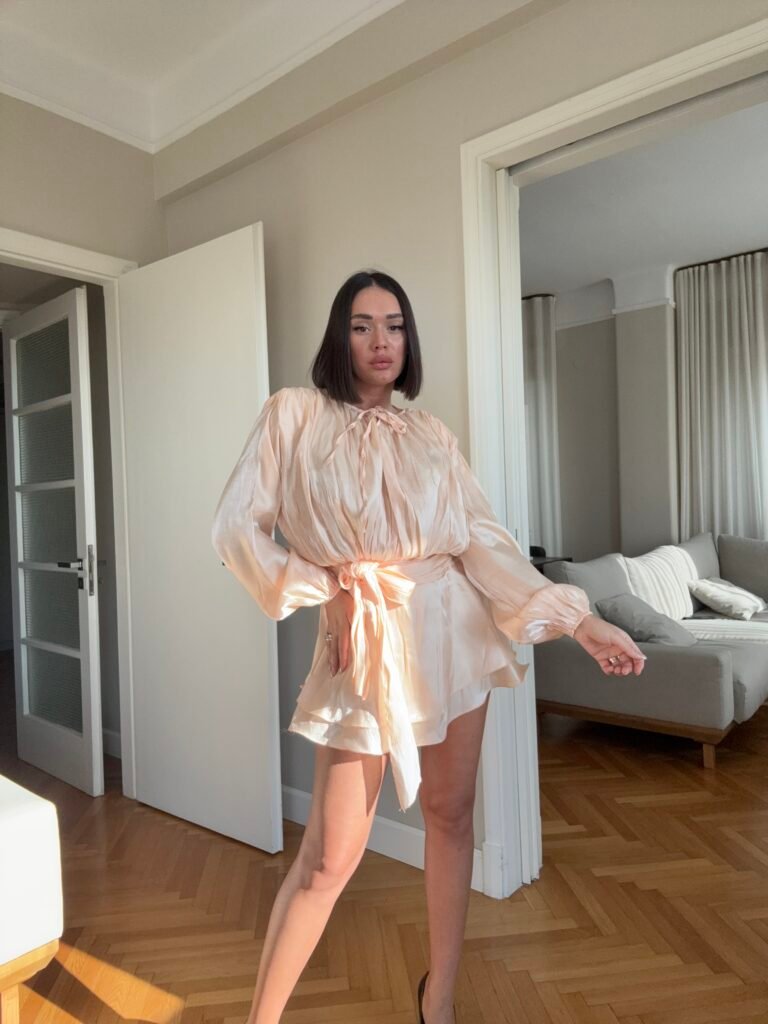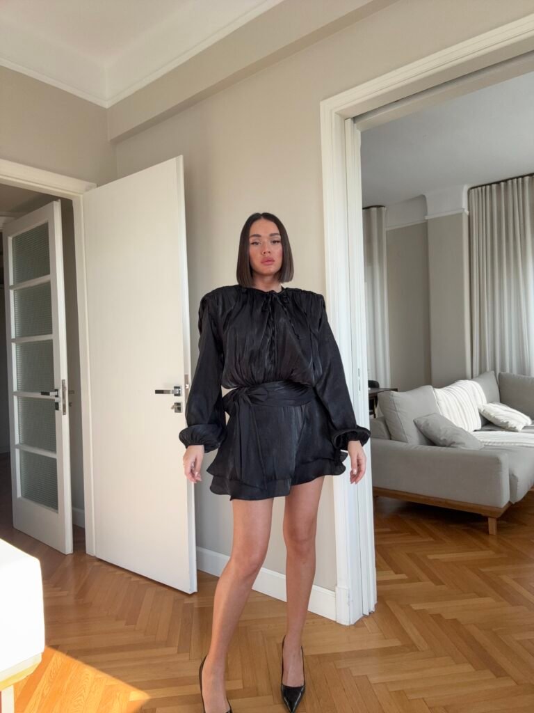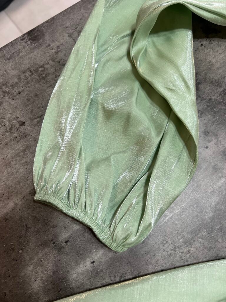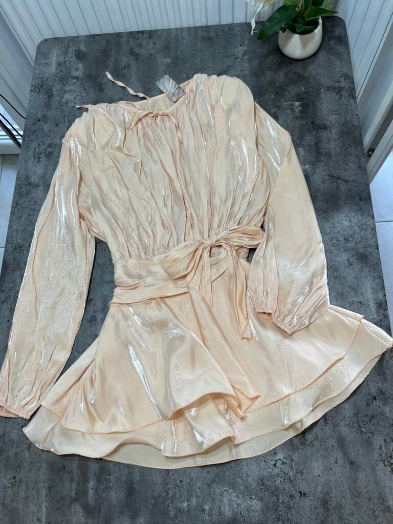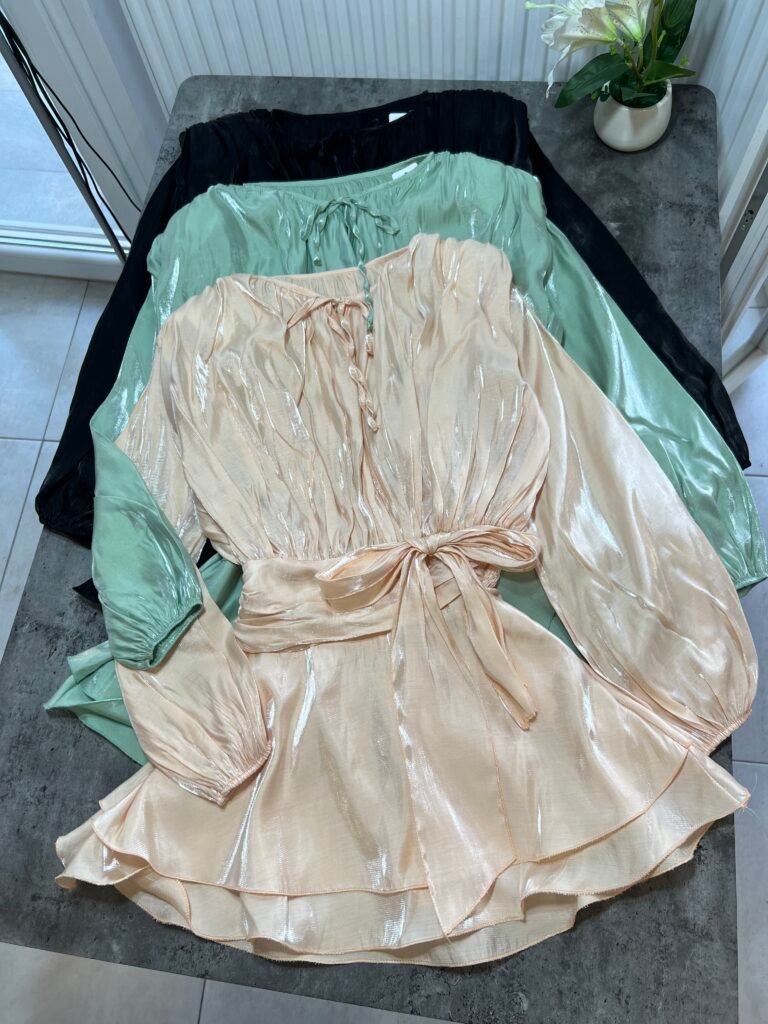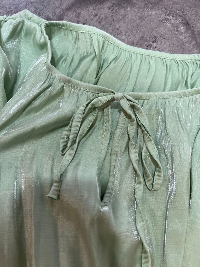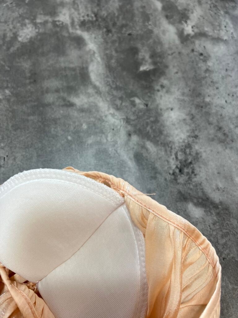 Me punim rrudhe në pjesën e siperme, vjen i lirshëm. Në bel përshtatet në bazë të llastikut, në fund punim me pala. Përmban lidhese anësore në formeë fjongo.