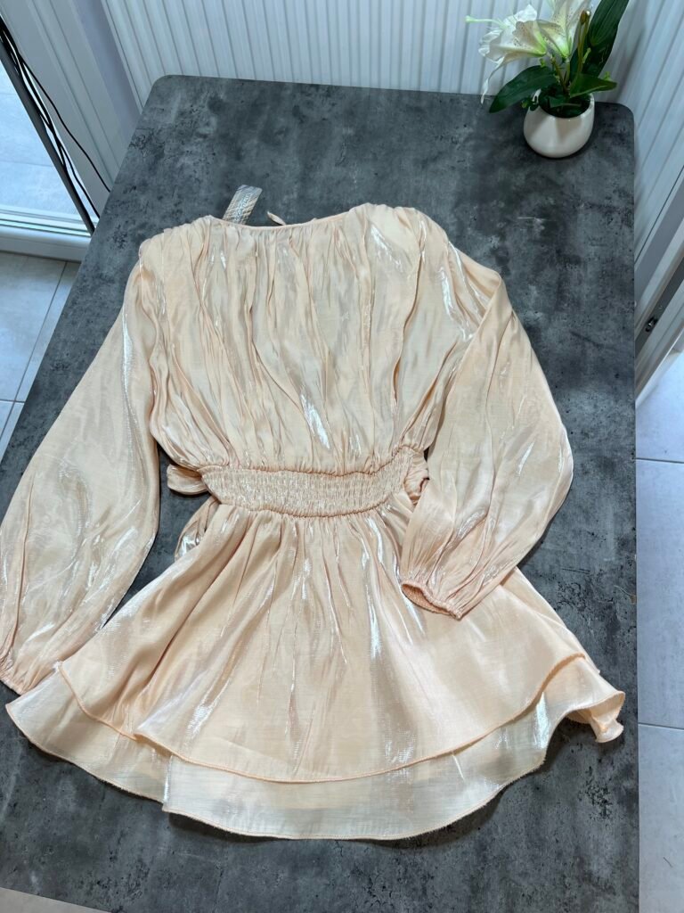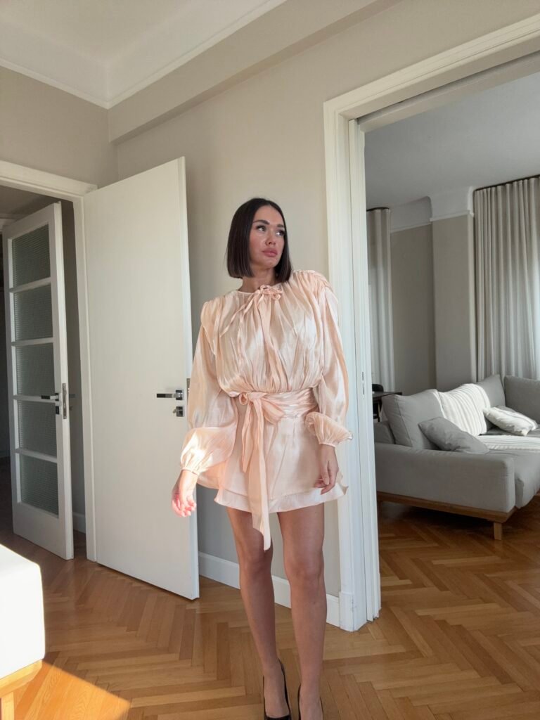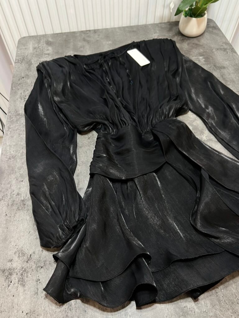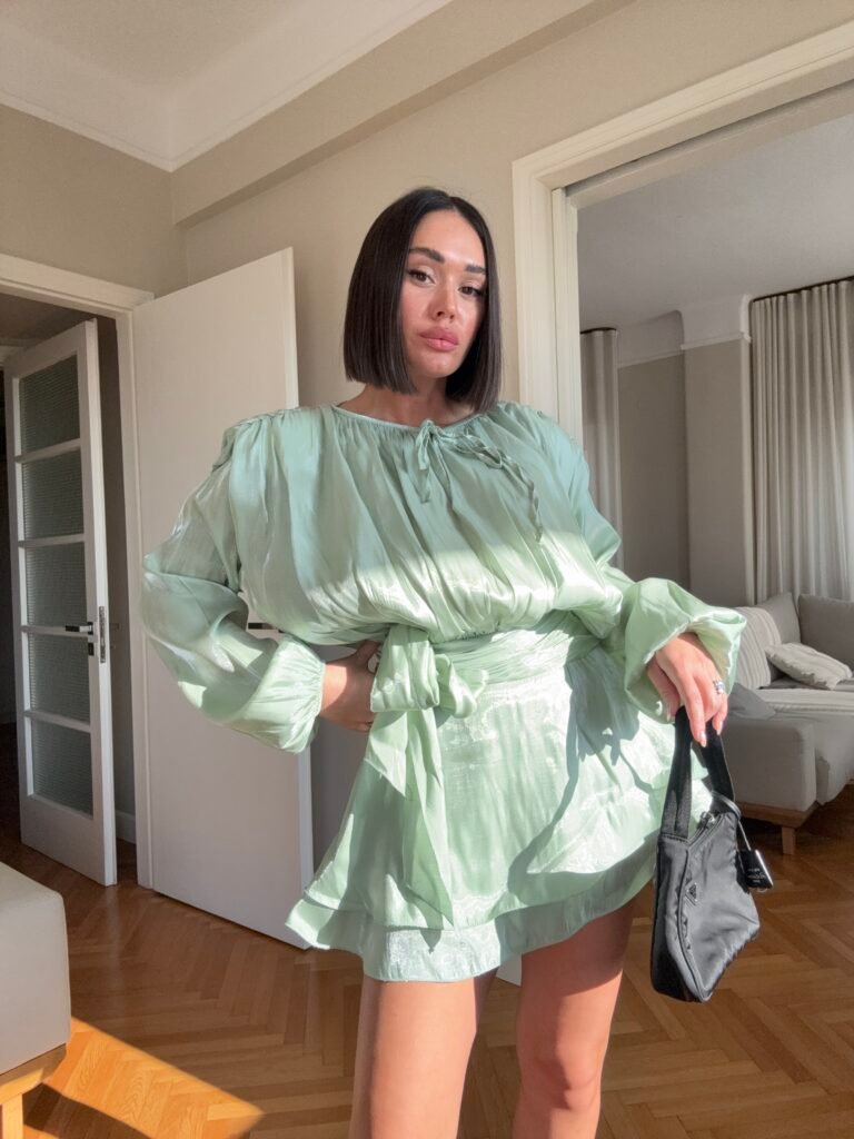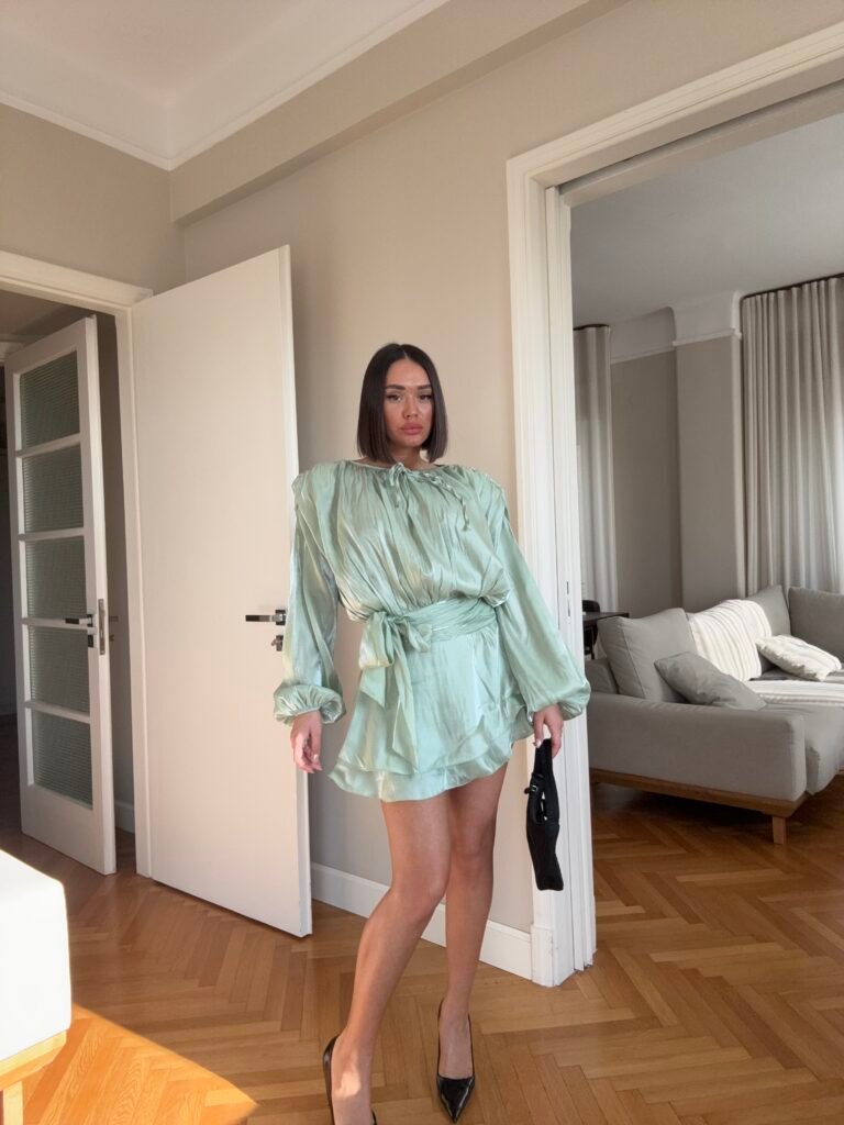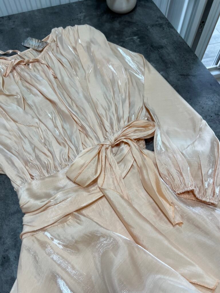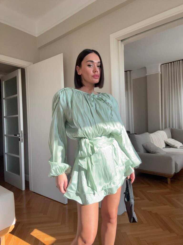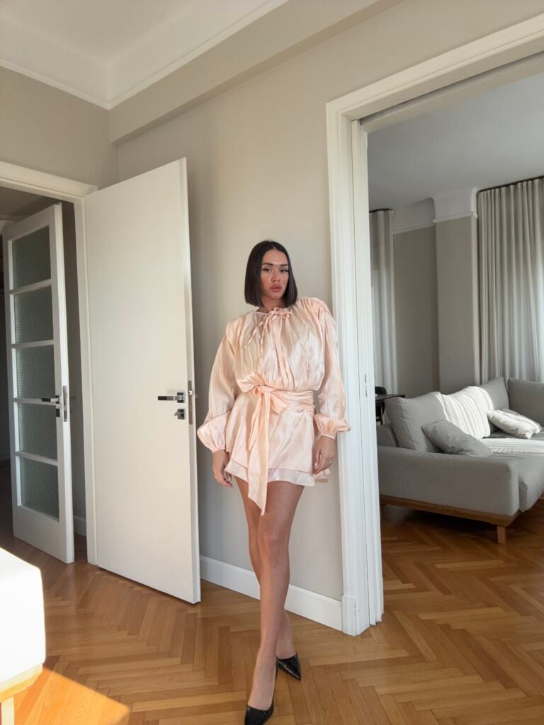 Me punim rrudhe në pjesën e siperme, vjen i lirshëm. Në bel përshtatet në bazë të llastikut, në fund punim me pala. Përmban lidhese anësore në formeë fjongo.