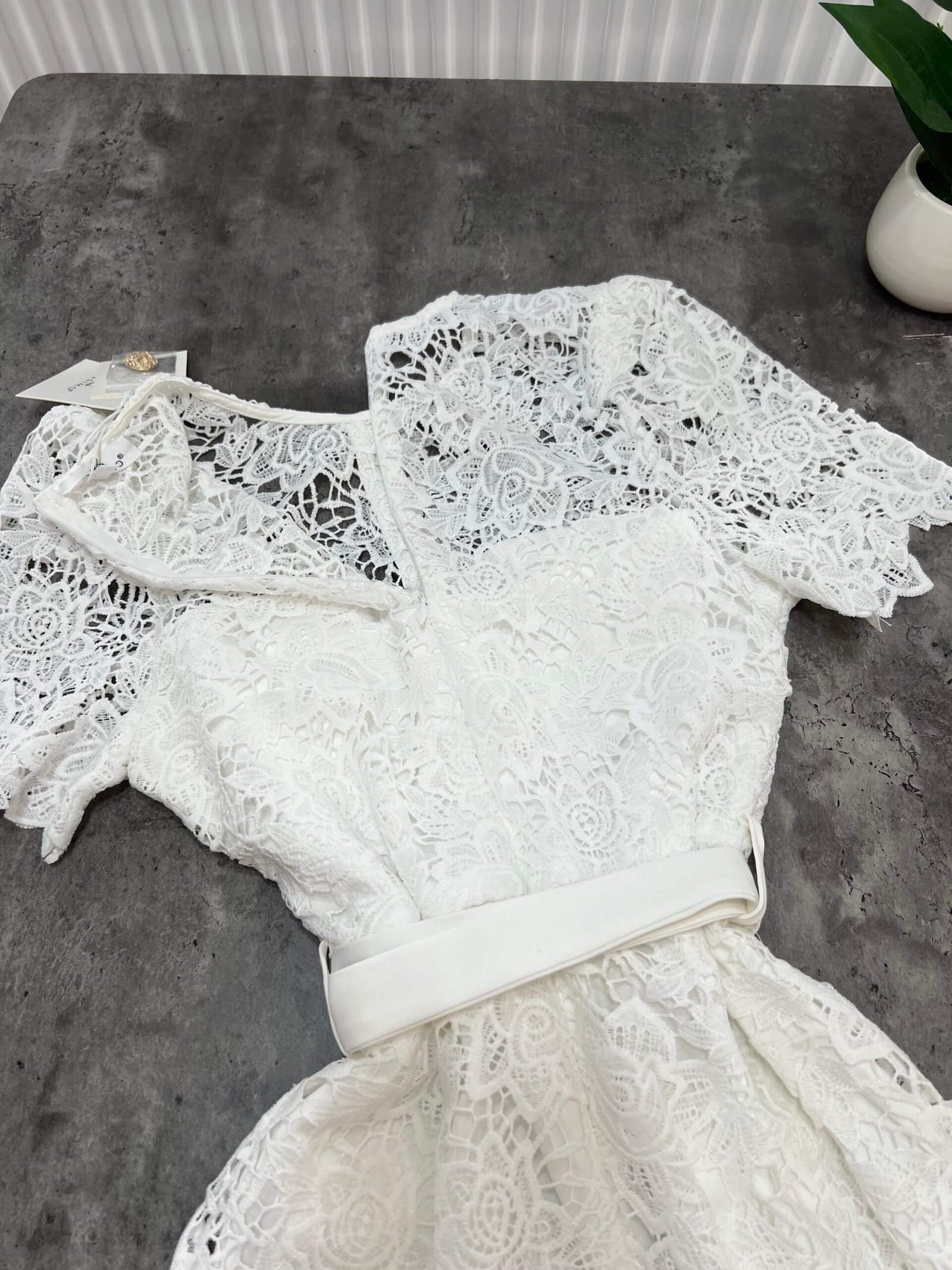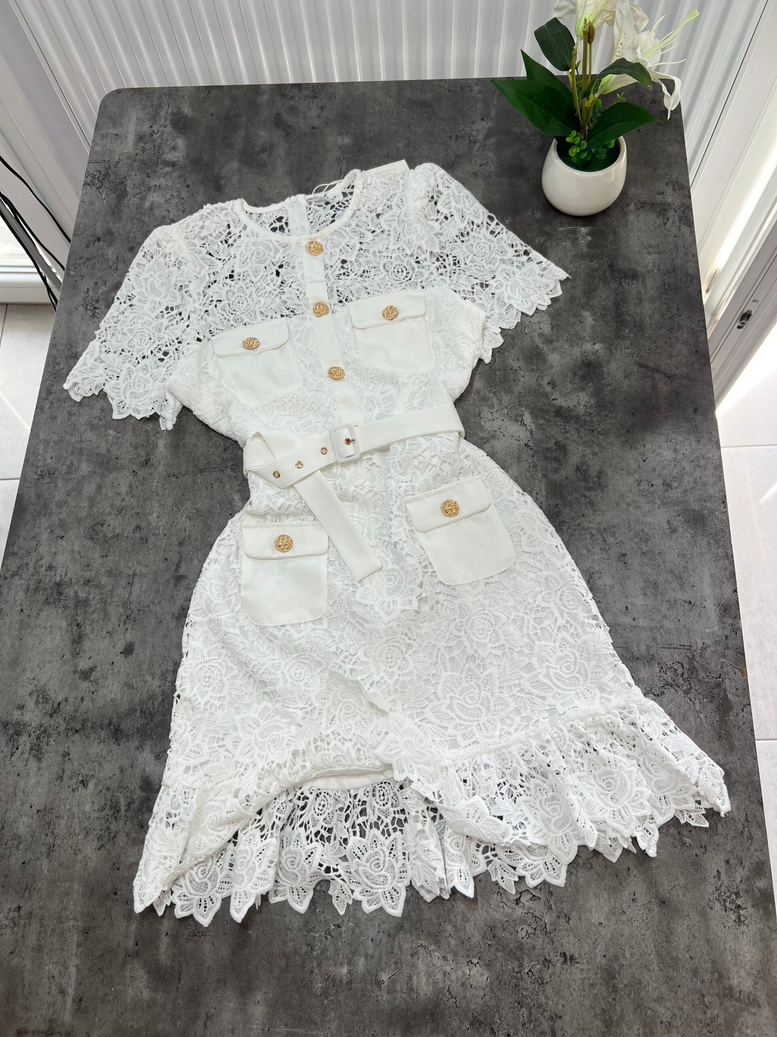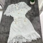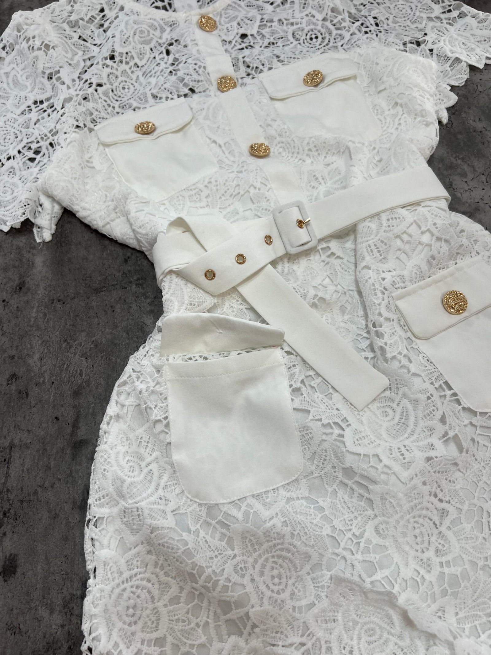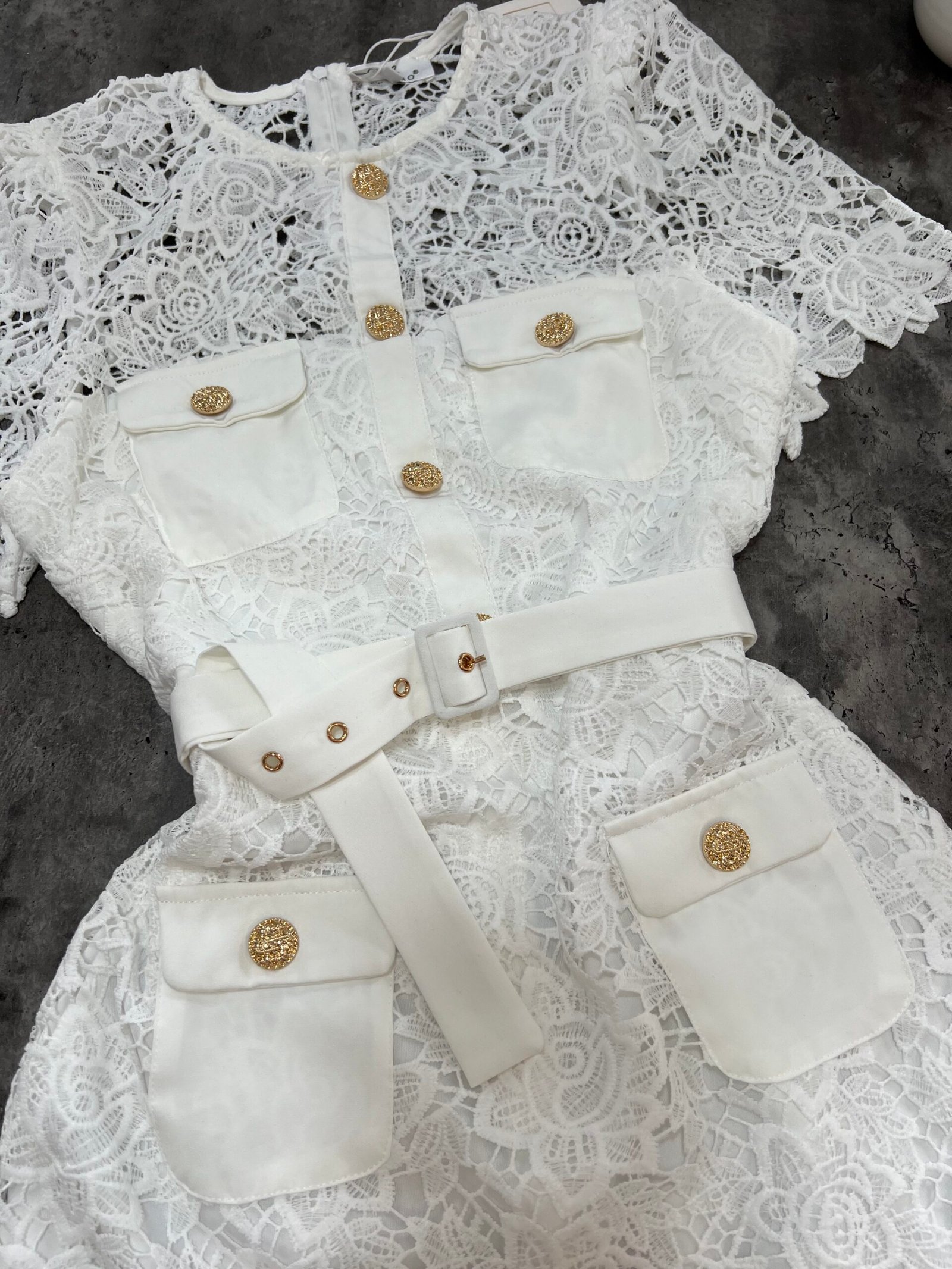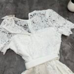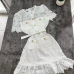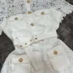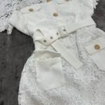 Në prerje të drejtë pas trupit, me astar brënda dhe copë tyli të punuar sipër. Mbërthim me zinxhir ne pjesën e pasme. Kopsa të medha figurante gold në pjesën e bustit dhe xhepave.