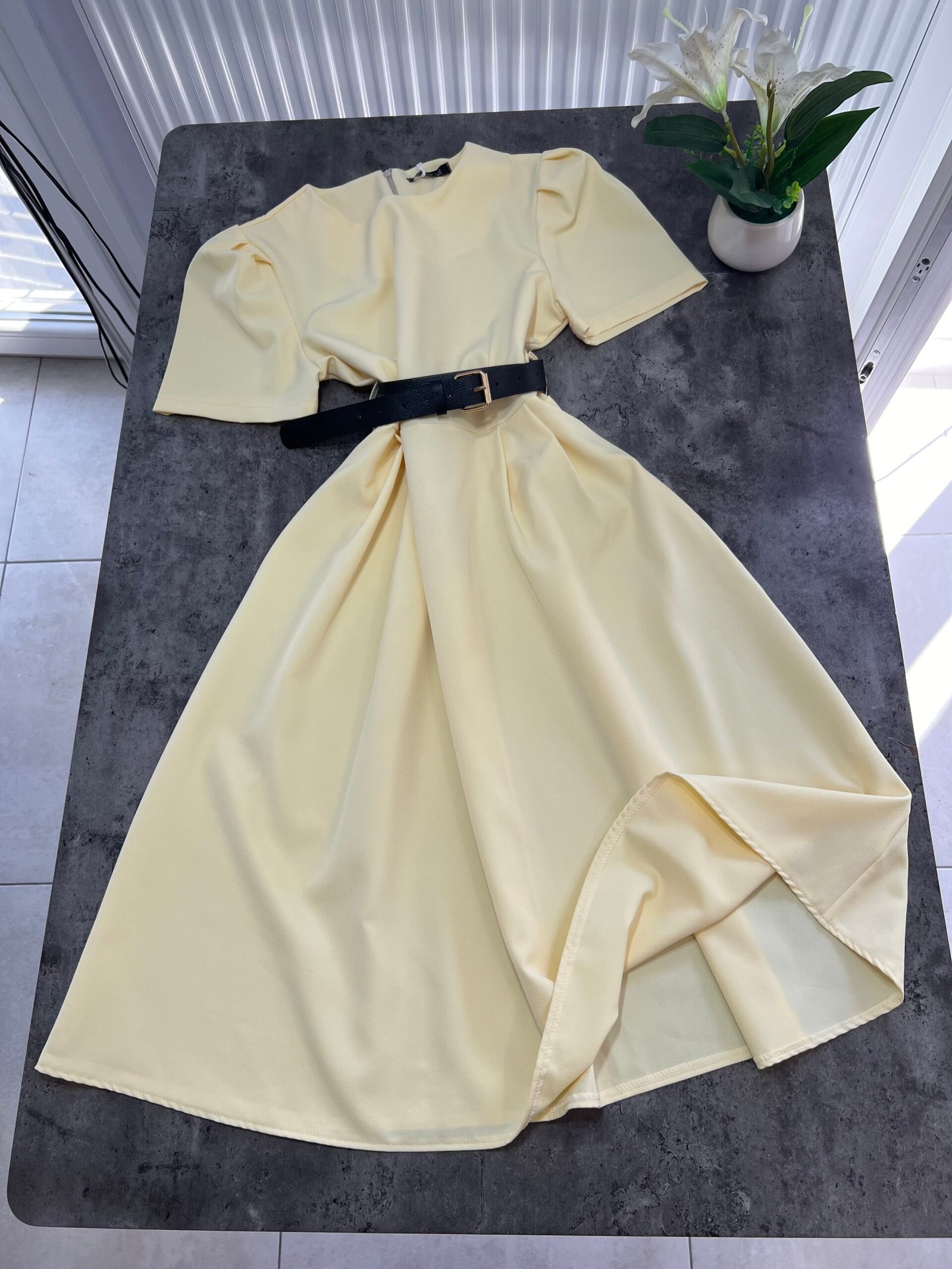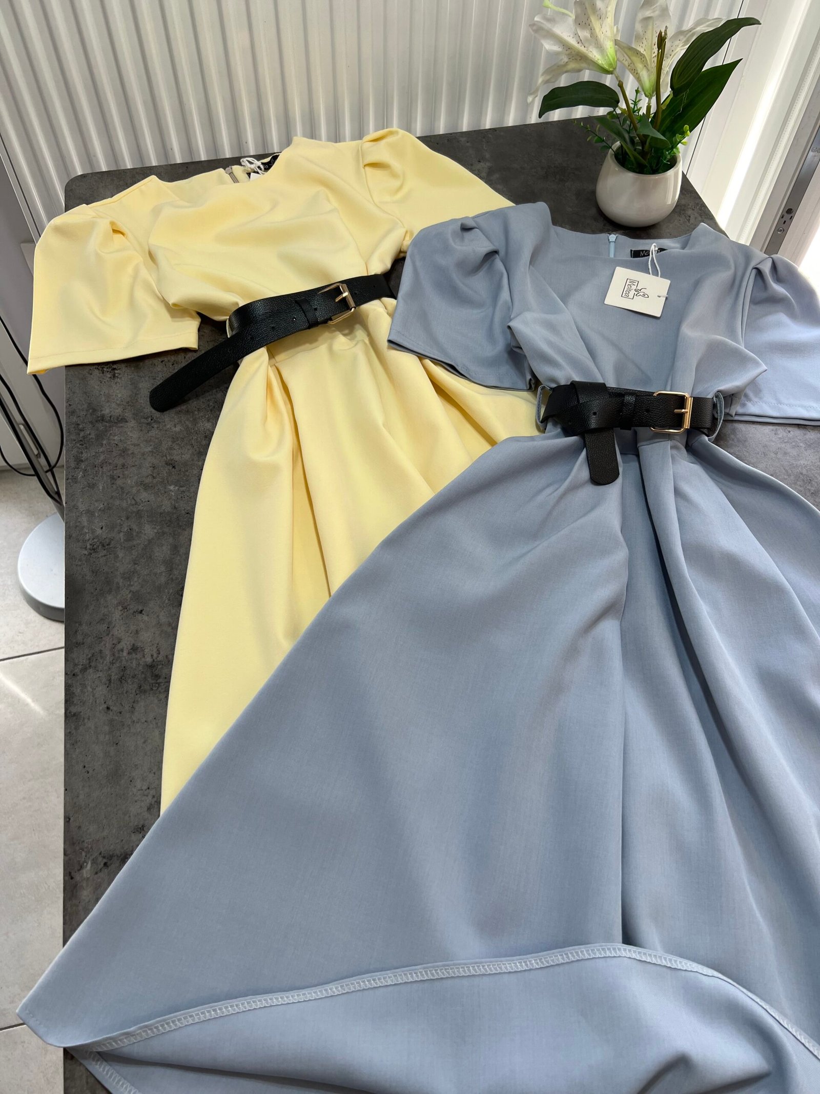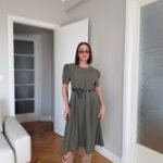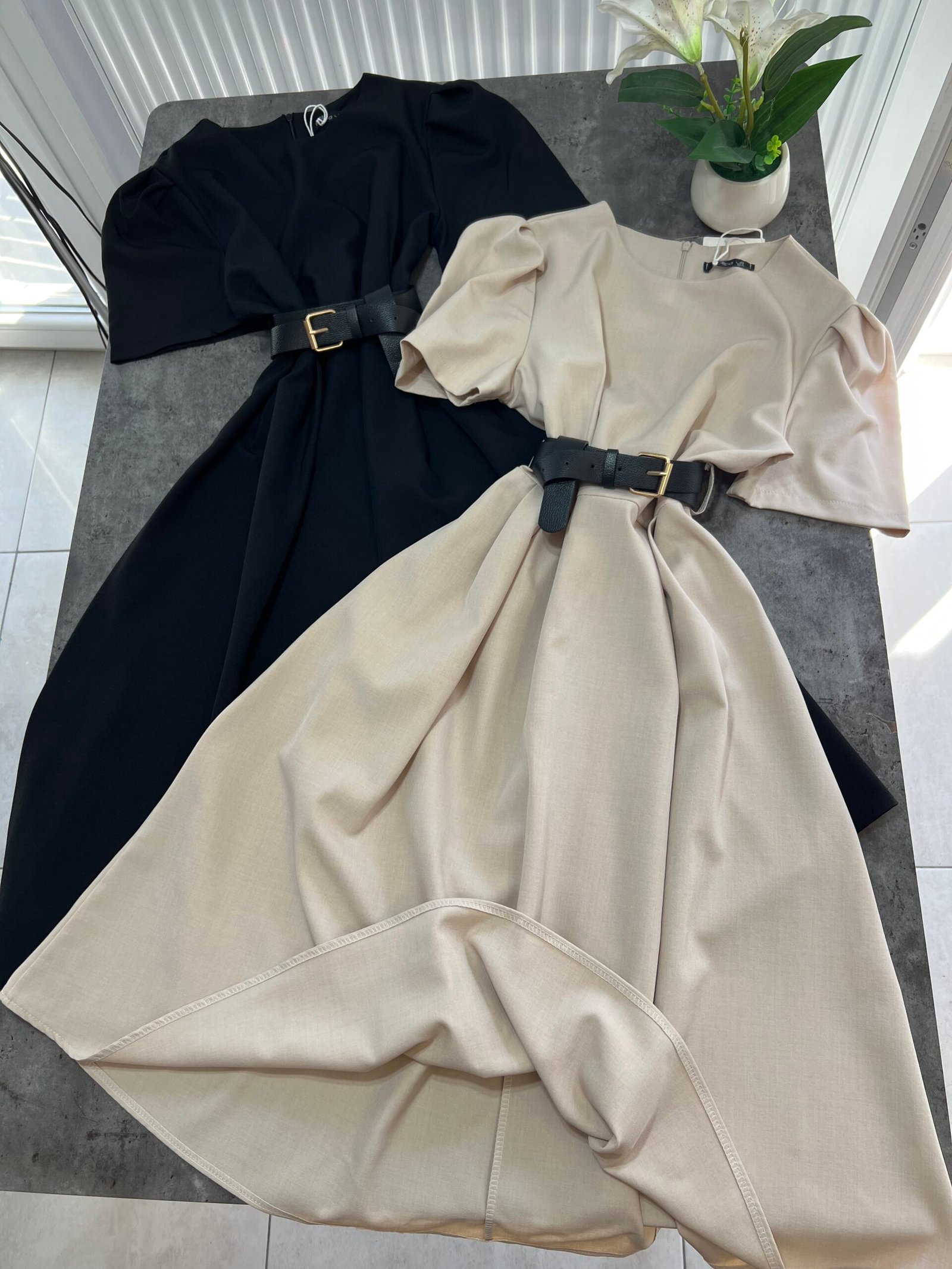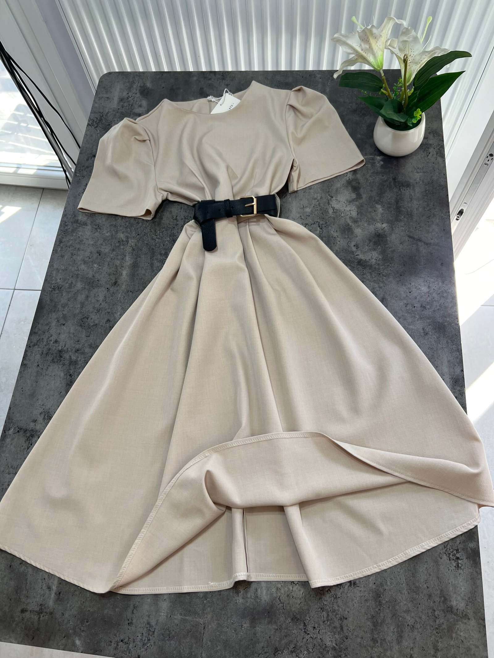Thekson pjesën e bustit, vjen i gjerë nga beli deri në fund. Me krahë të shkurtër në punim me penca. Mbërthehet me zinxhir pas. Rripi në bel i përfshire.