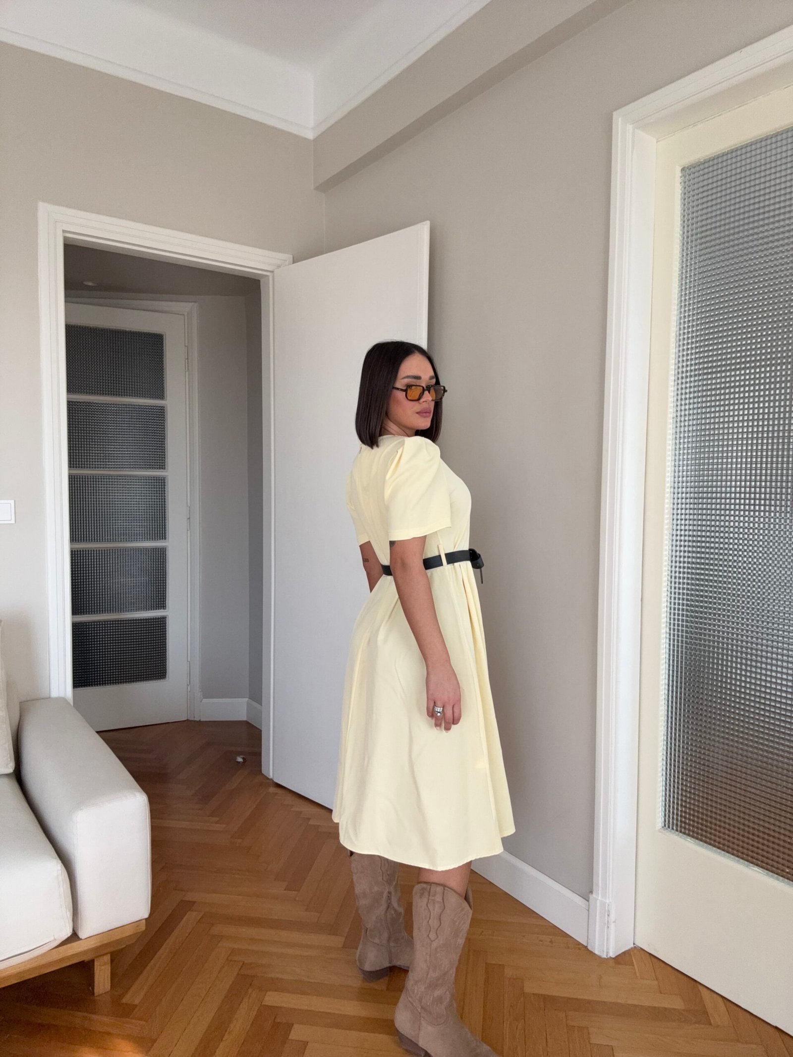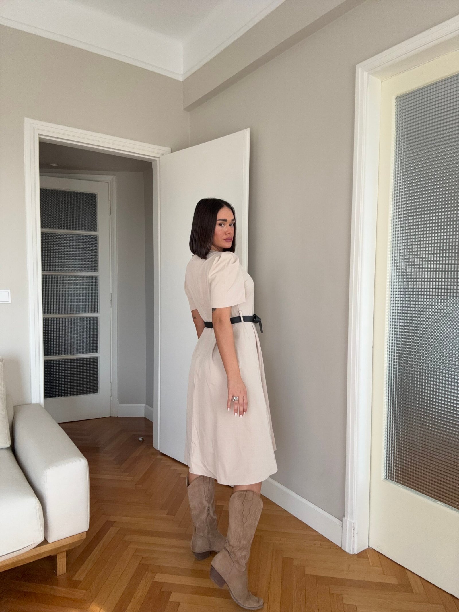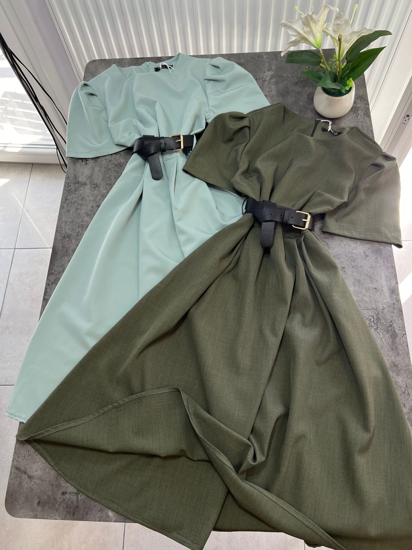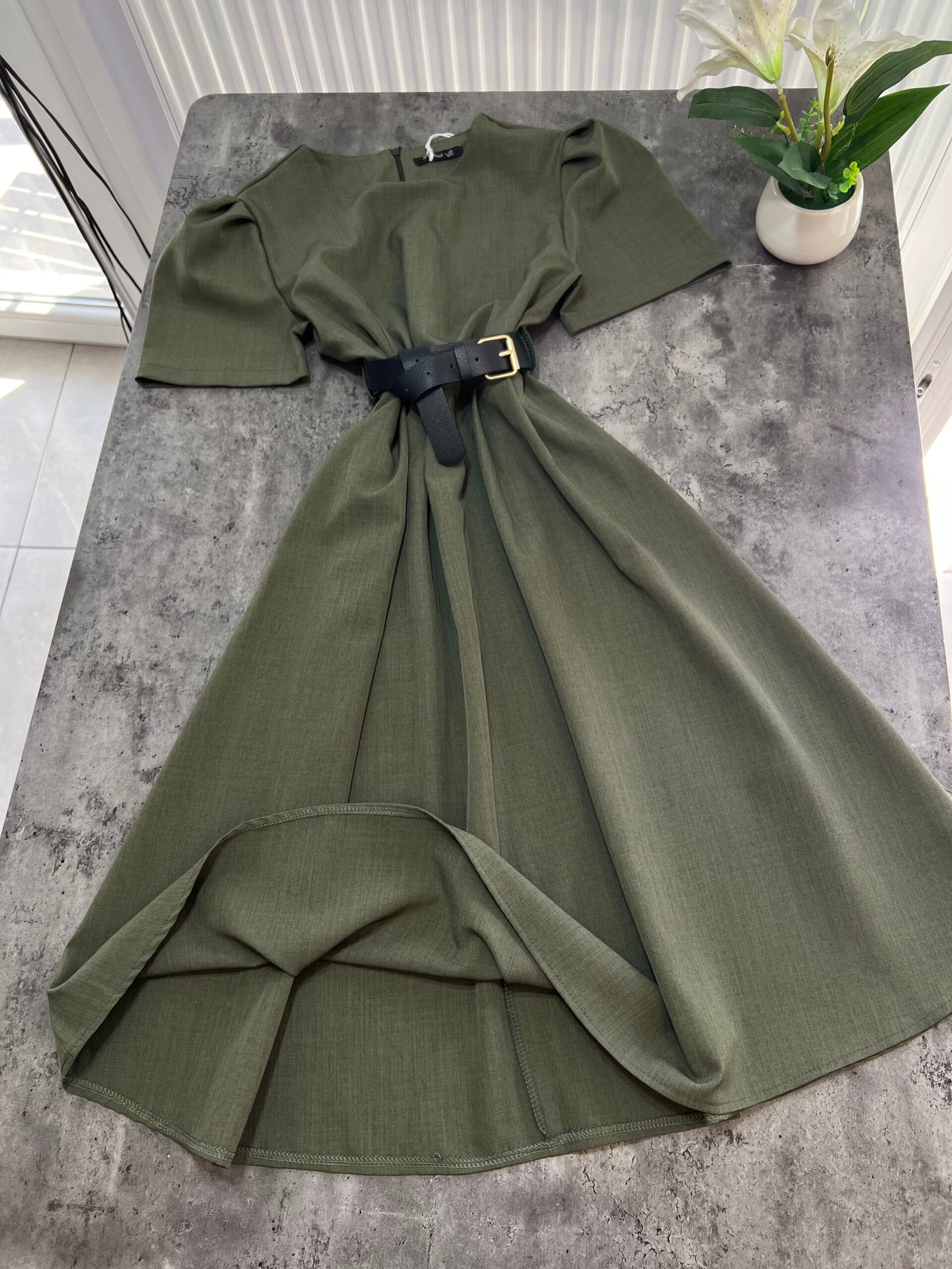 Thekson pjesën e bustit, vjen i gjerë nga beli deri në fund. Me krahë të shkurtër në punim me penca. Mbërthehet me zinxhir pas. Rripi në bel i përfshire.