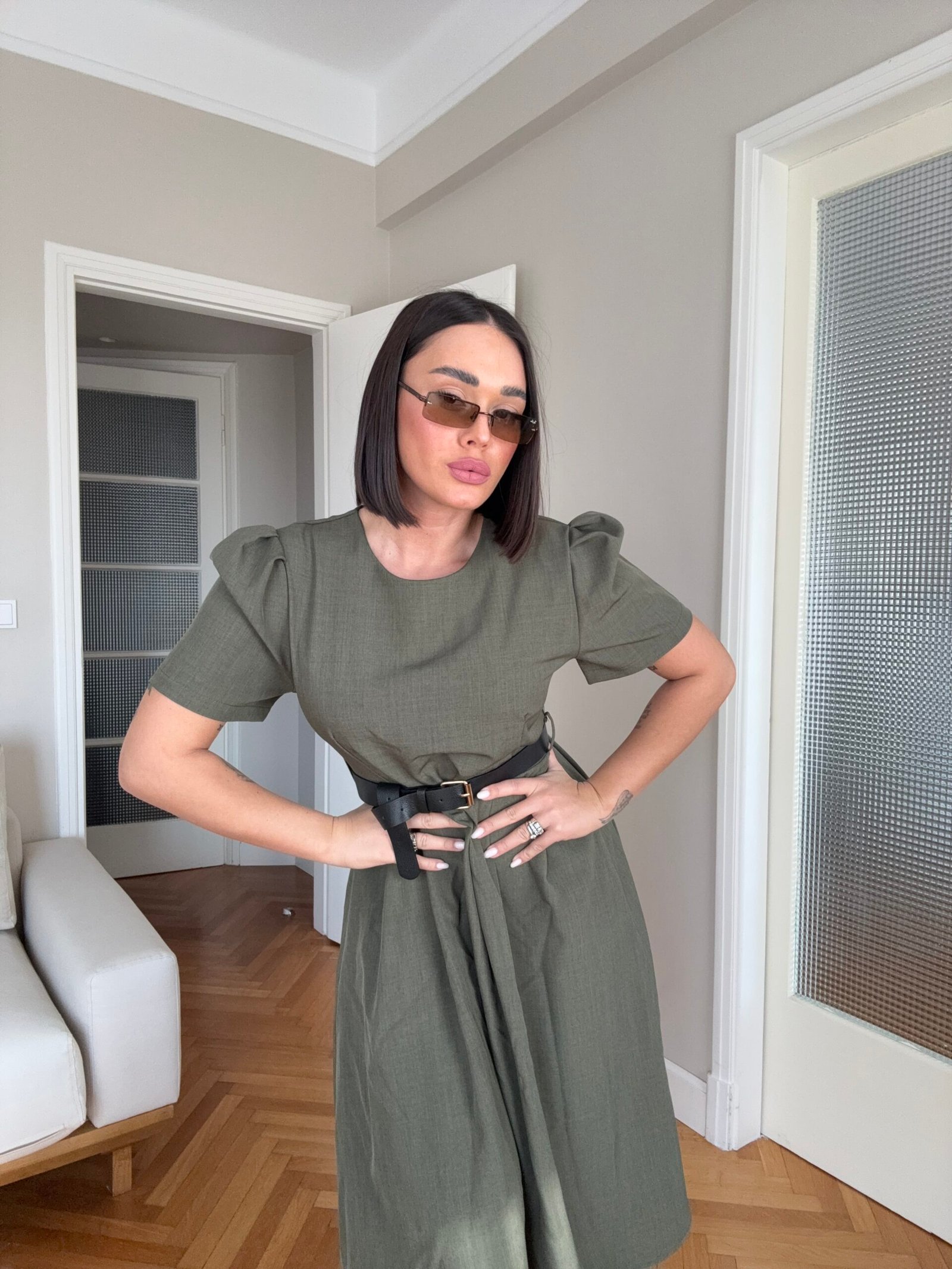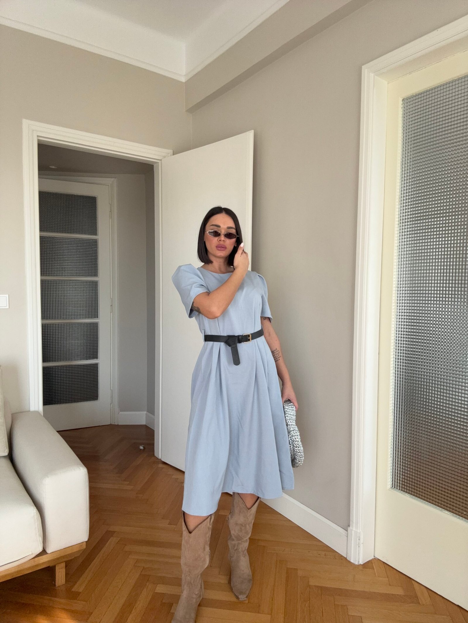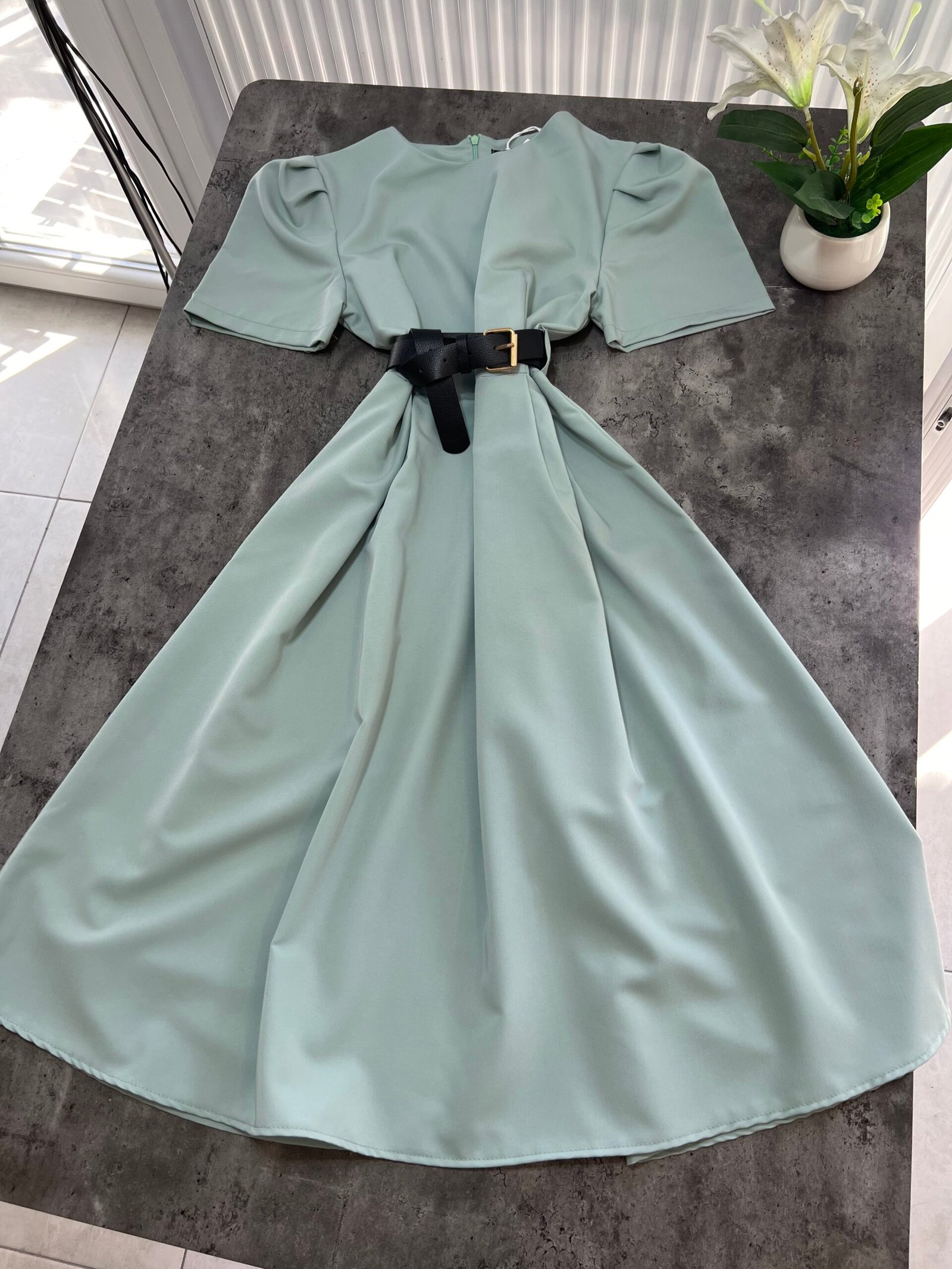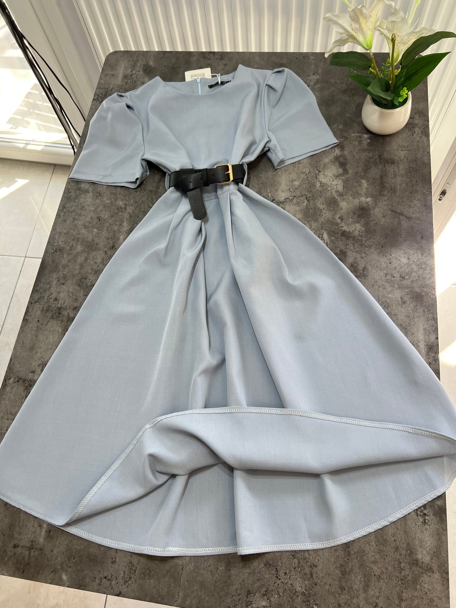 Thekson pjesën e bustit, vjen i gjerë nga beli deri në fund. Me krahë të shkurtër në punim me penca. Mbërthehet me zinxhir pas. Rripi në bel i përfshire.