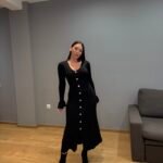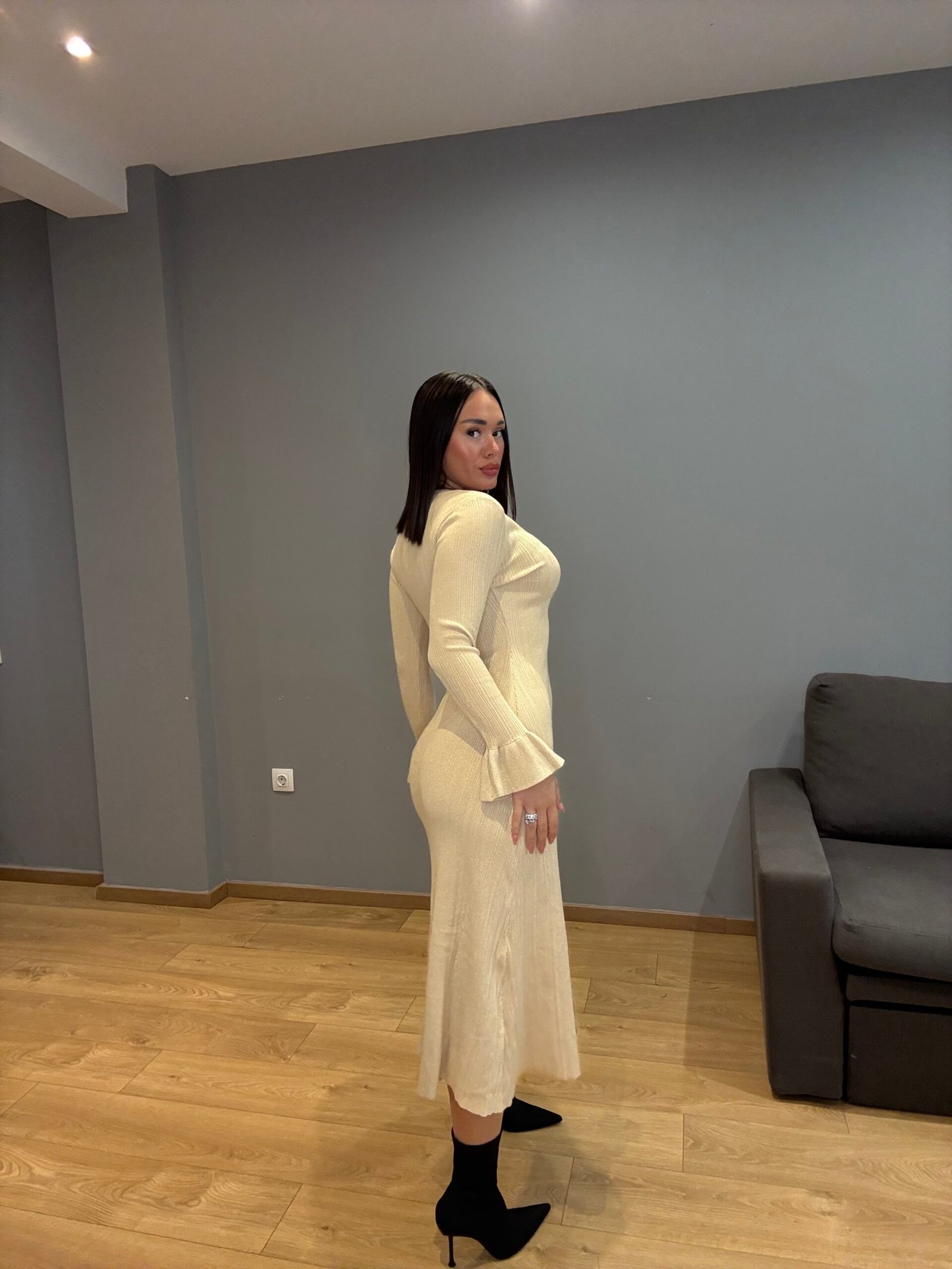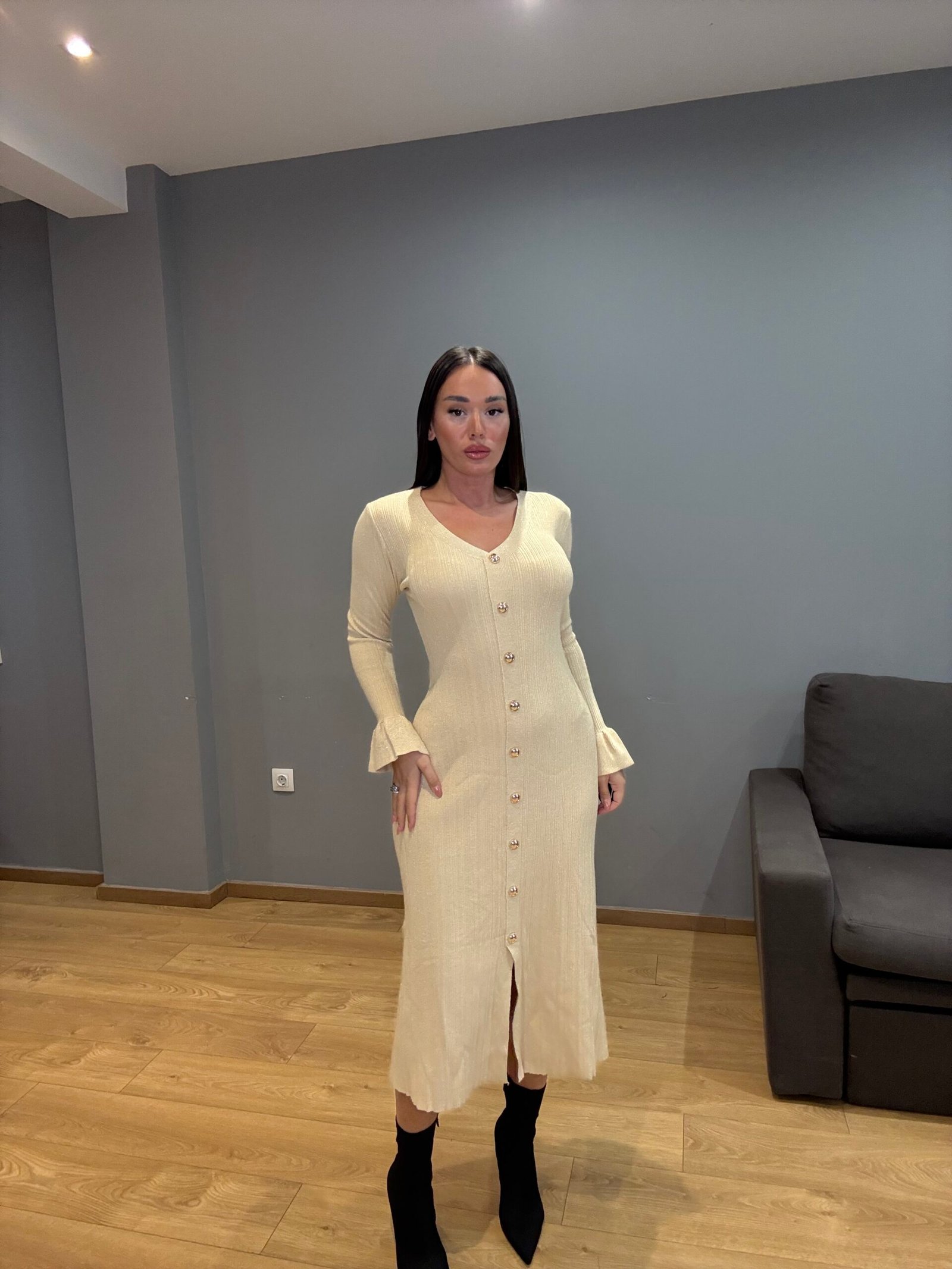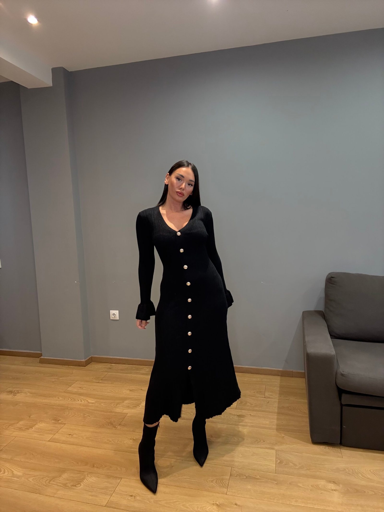 Fustan i gjatë trikotuar me material elastik, shkelqim minimalist, dhe strukturë me vija vertikale që theksojnë siluetën. Ka dekolte të thellë në formë V, mëngë të gjata dhe rresht kopsash metalike përgjatë gjithë gjatësisë për një pamje elegante dhe të rafinuar.