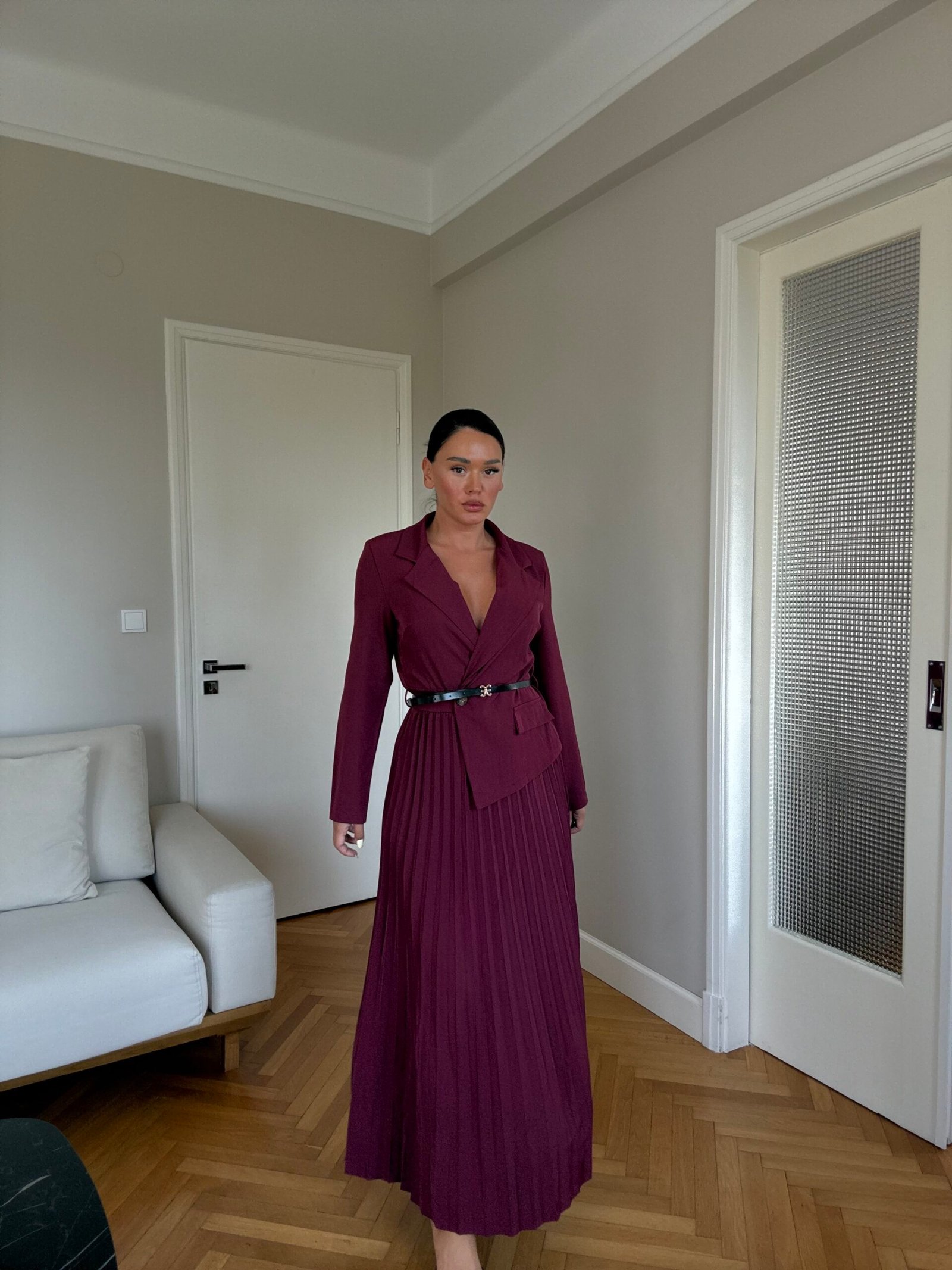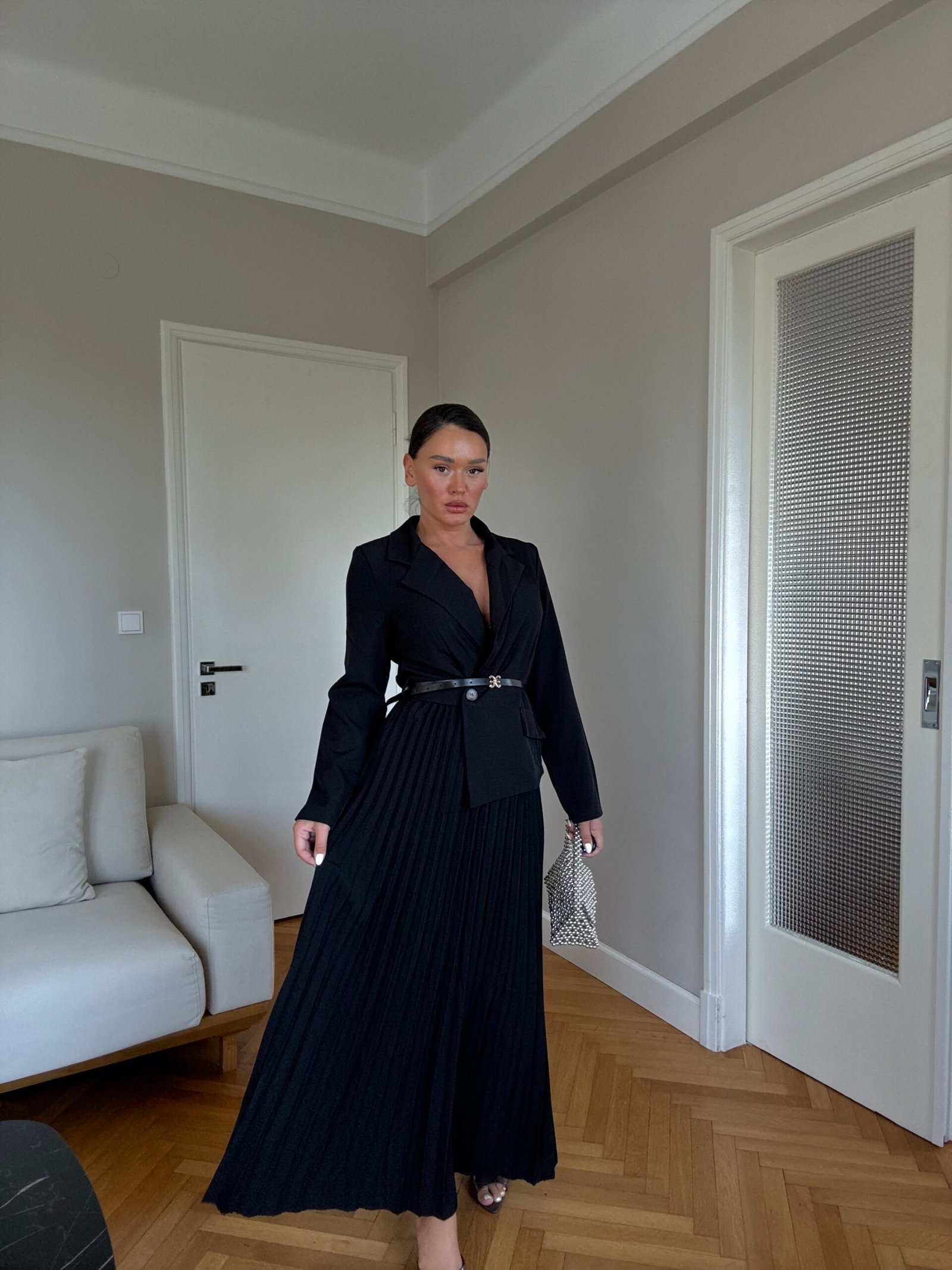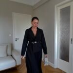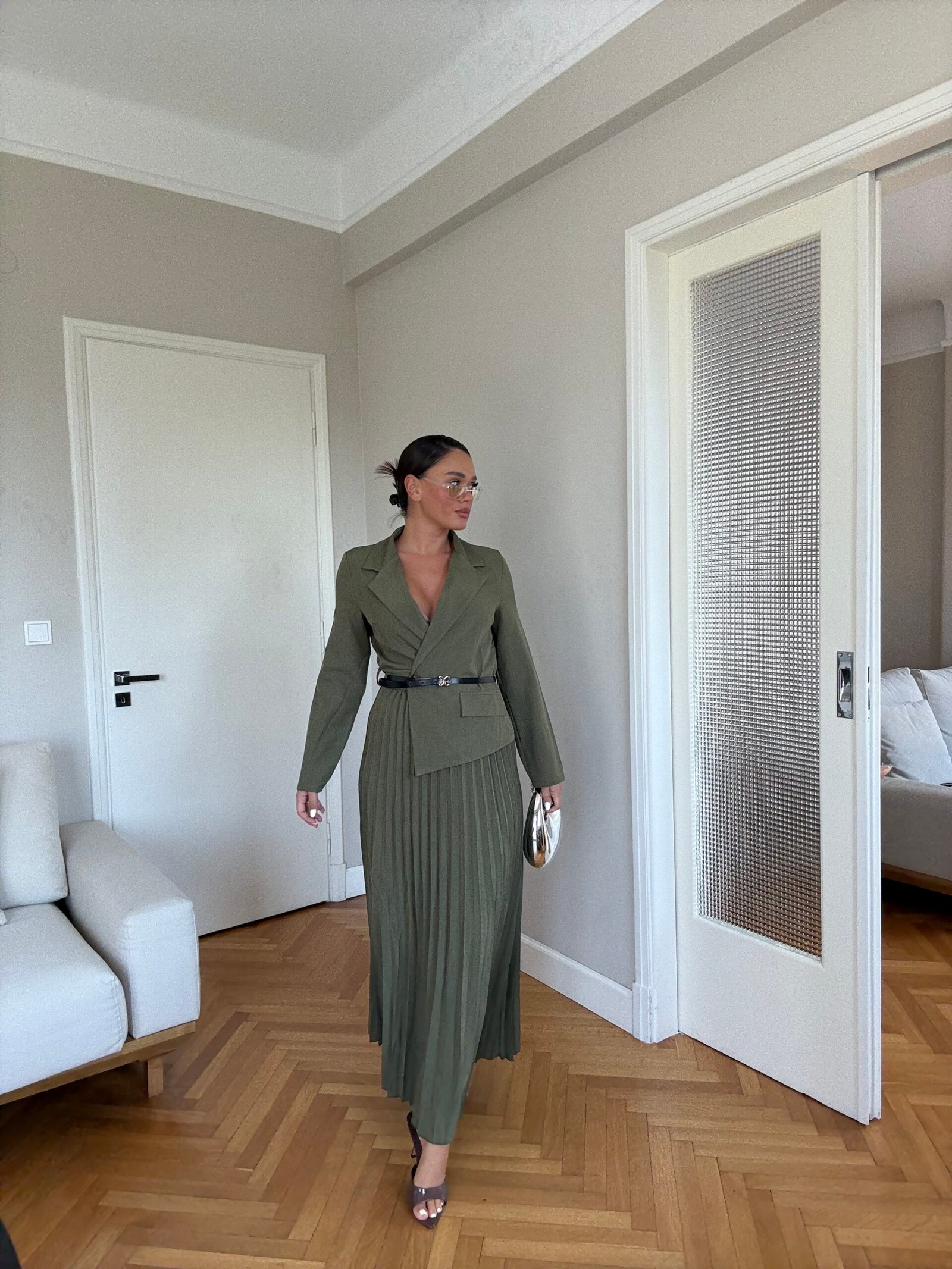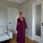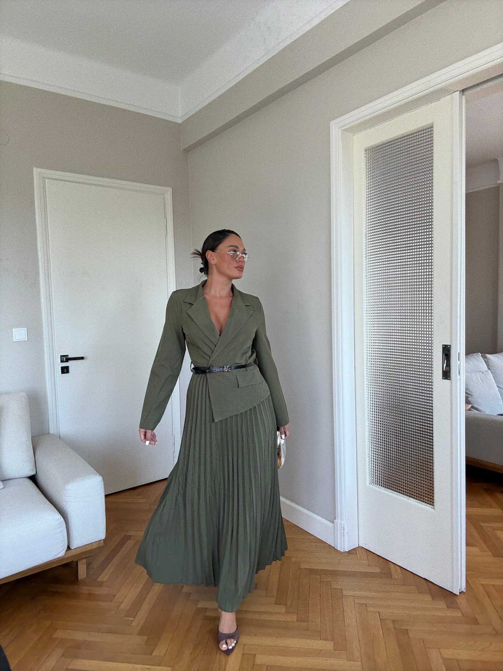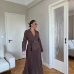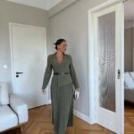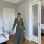 Ky fustan maxi kombinon hijeshinë klasike me detaje moderne. Me jakë kostumi elegante, pala të gjata që shtojnë lëvizshmëri dhe një rrip në bel që thekson siluetën, ky model është i përshtatshëm si për evente të veçanta, ashtu edhe për paraqitje formale.