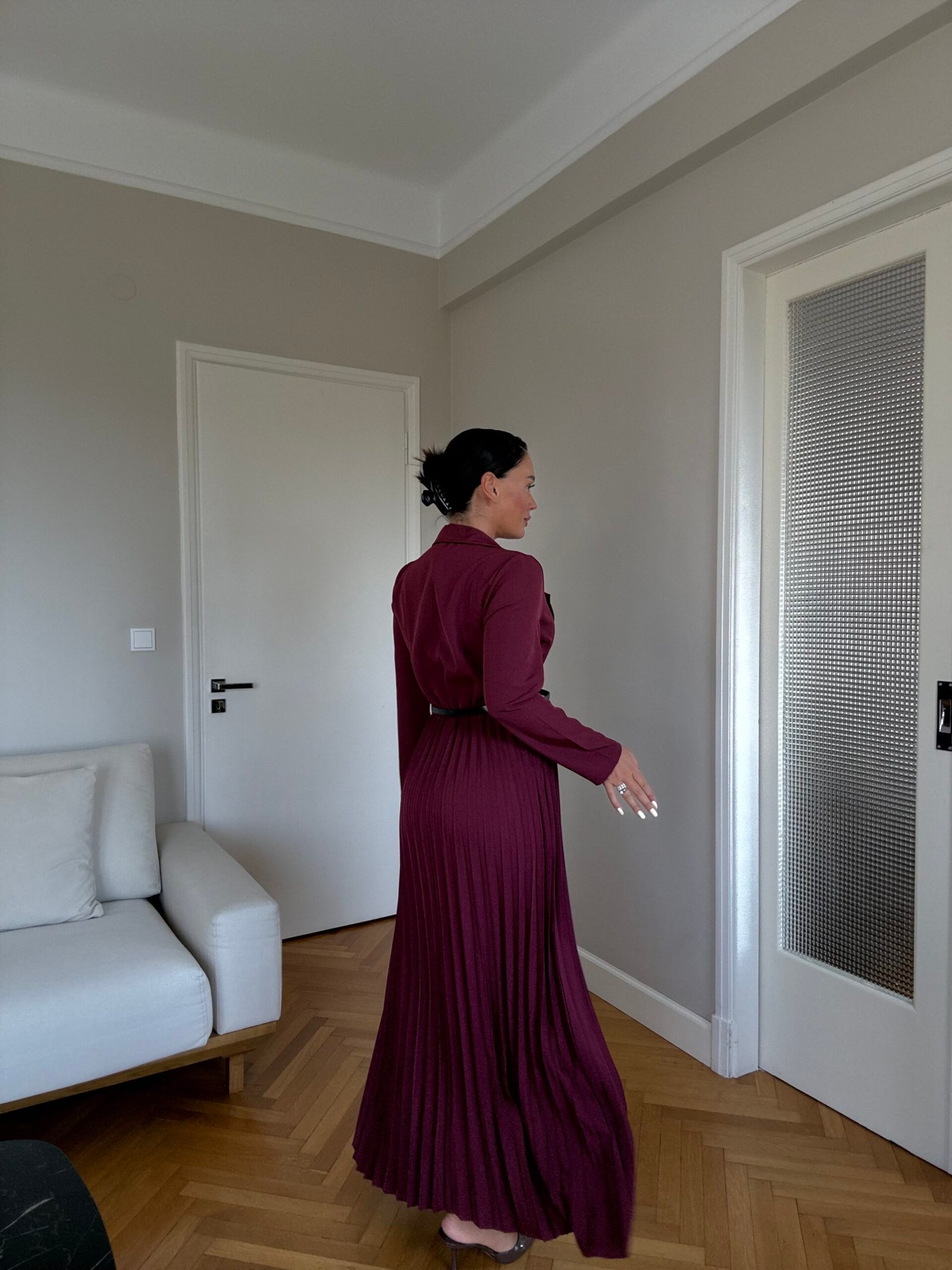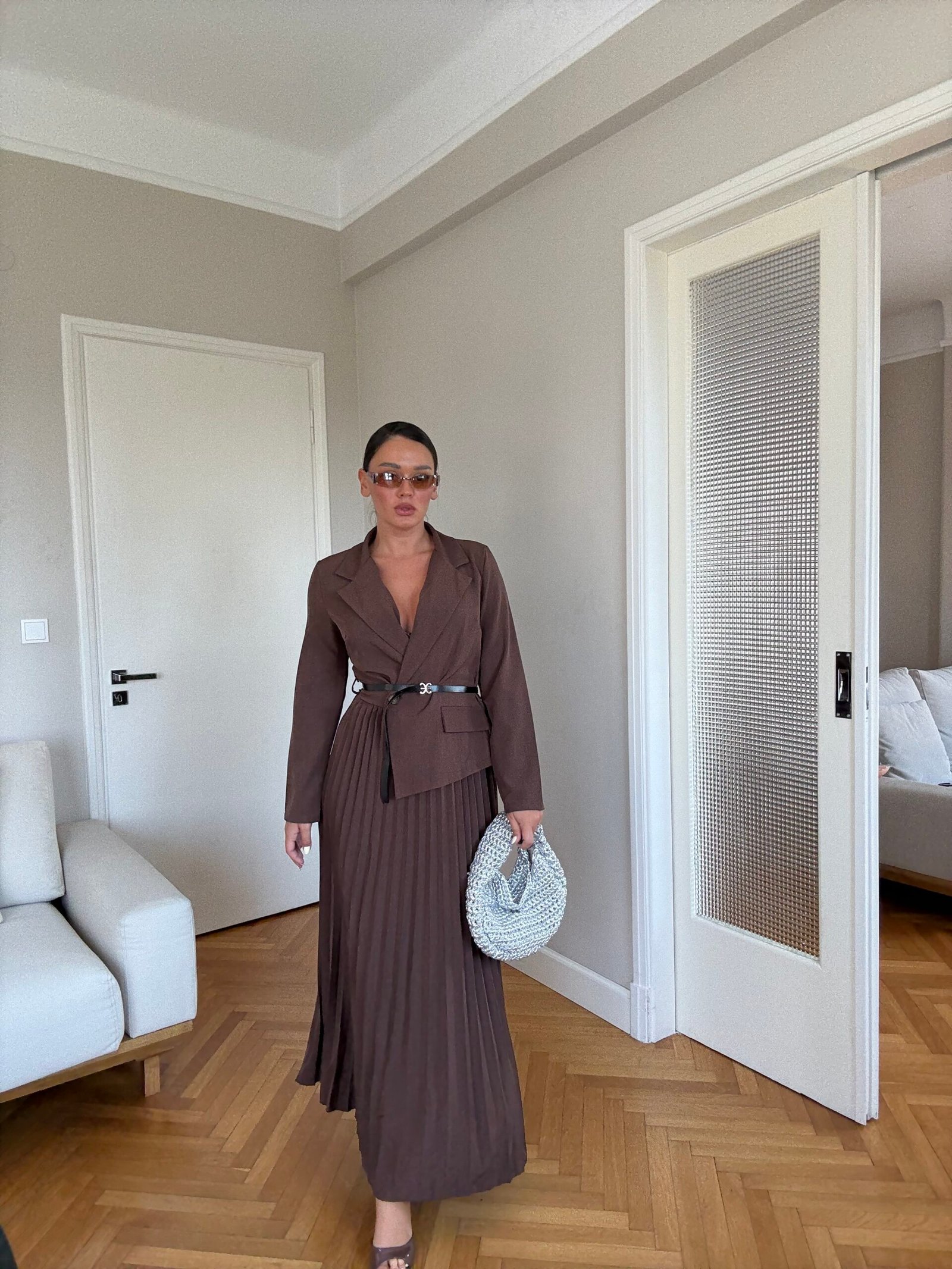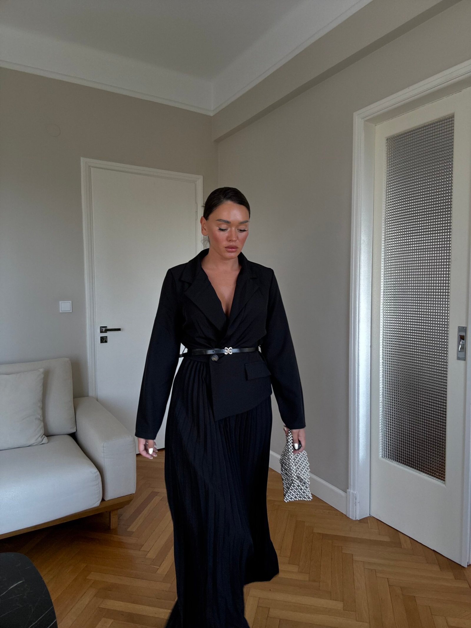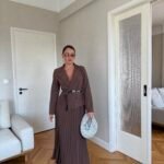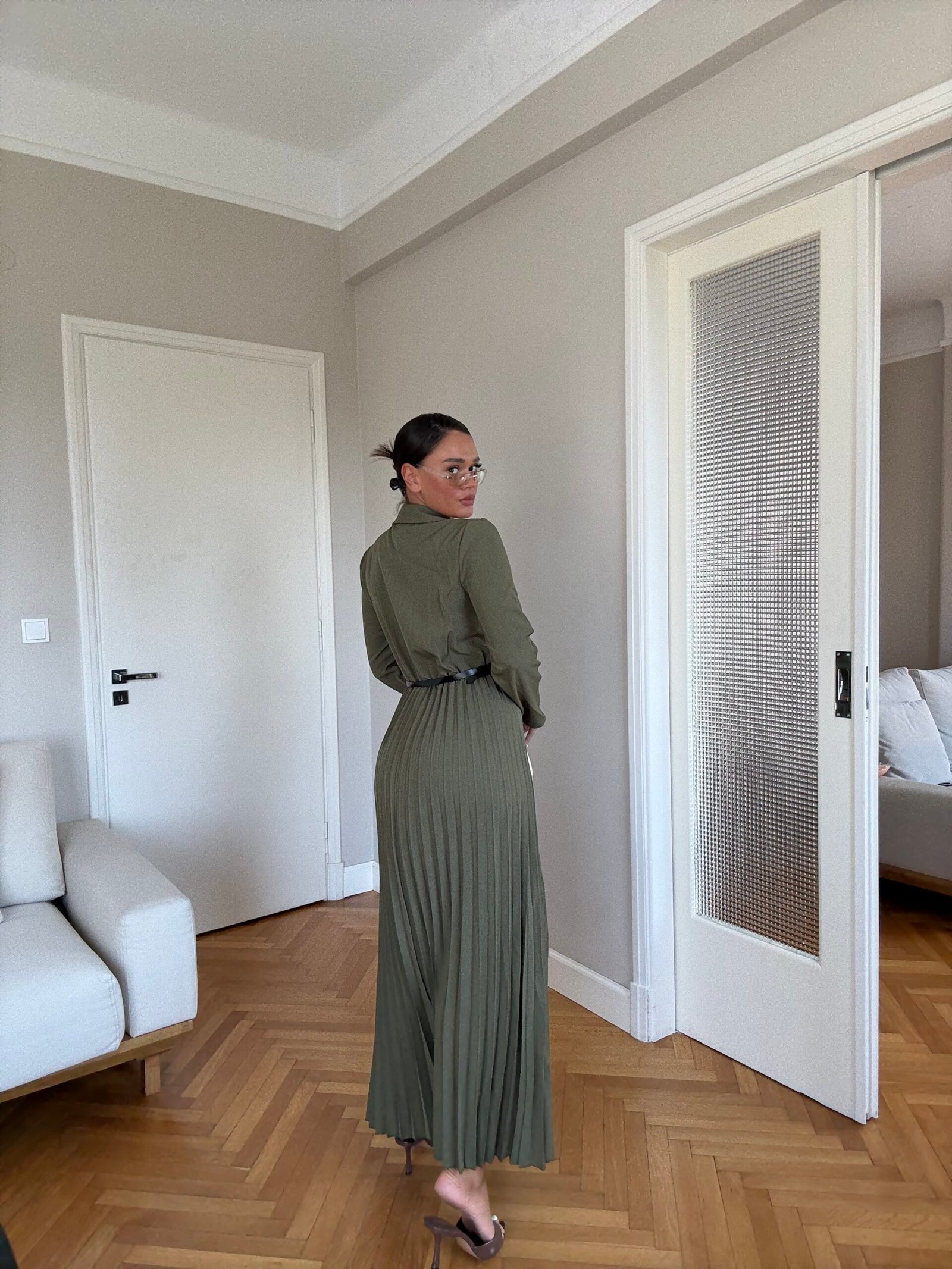 Ky fustan maxi kombinon hijeshinë klasike me detaje moderne. Me jakë kostumi elegante, pala të gjata që shtojnë lëvizshmëri dhe një rrip në bel që thekson siluetën, ky model është i përshtatshëm si për evente të veçanta, ashtu edhe për paraqitje formale.