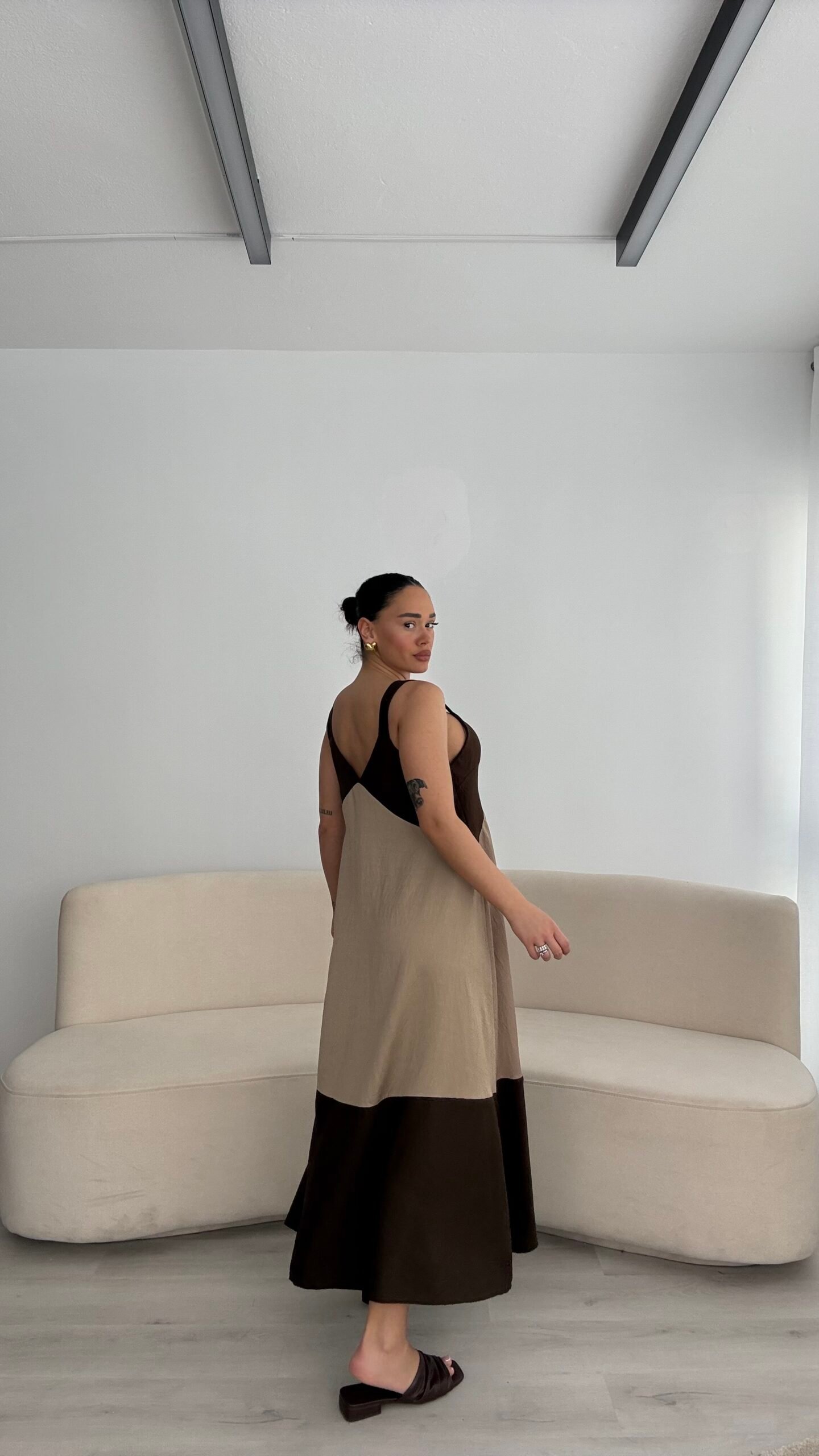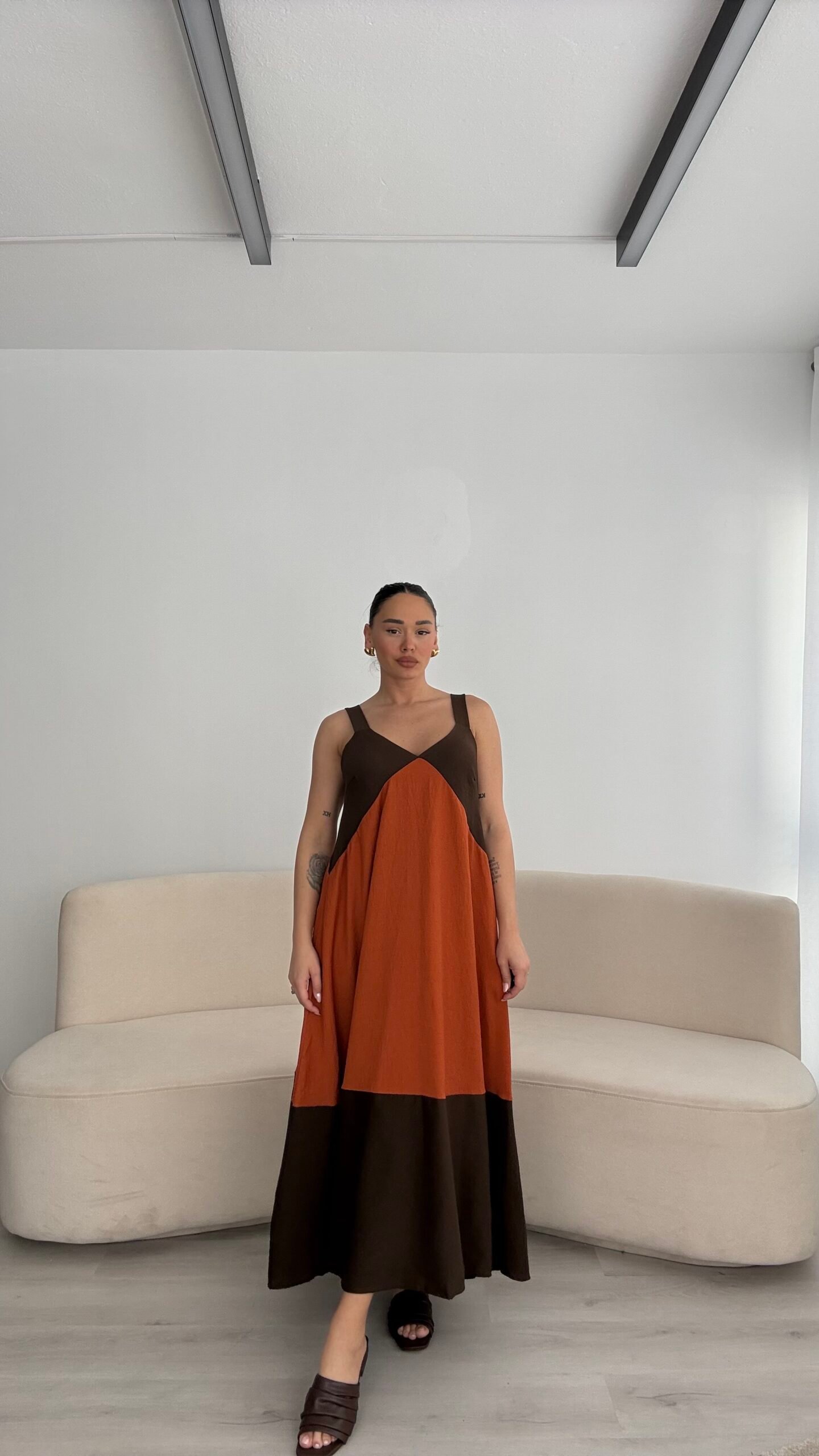 Fustan maxi me prerje të lirshme dhe rrjedhje elegante që jep rehati dhe stil effortless. Detaji i rripave lidhëse në supe i shton një prekje delikate dhe femërore, ndërsa prerja e hapur krijon lëvizje të bukur gjatë ecjes. Ideal për ditët e nxehta kur do të dukesh e rregullt pa u munduar shumë.