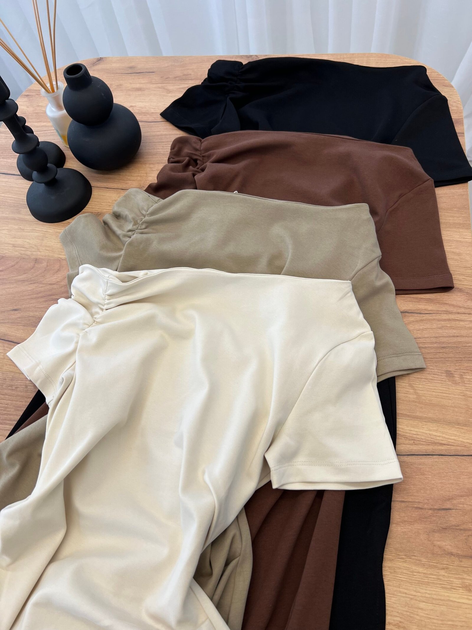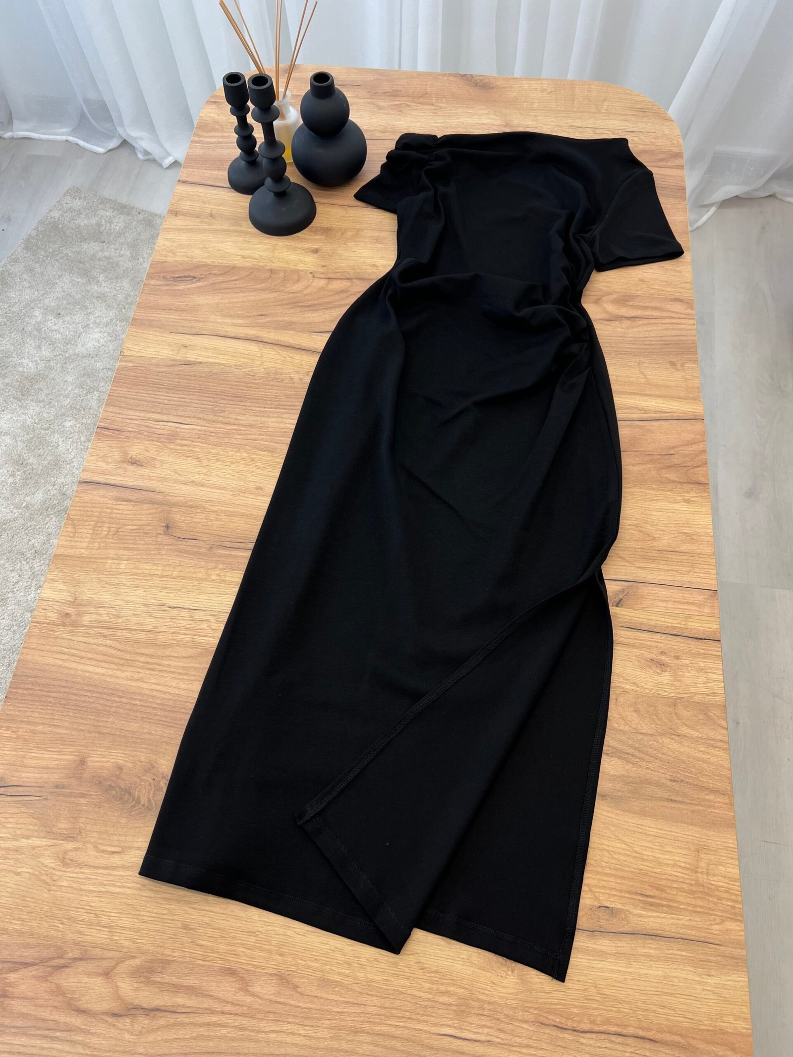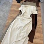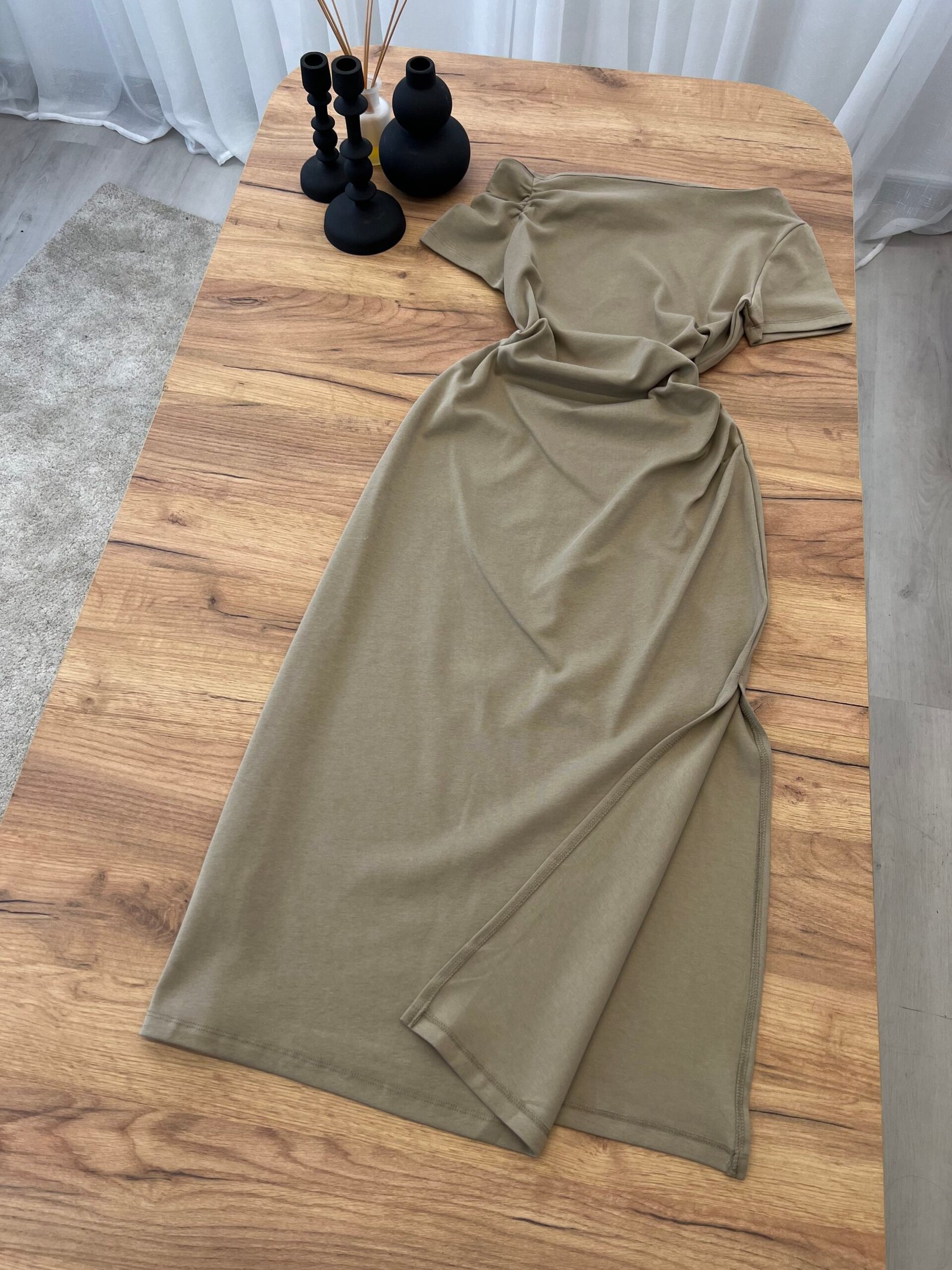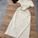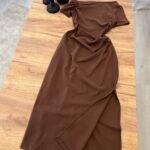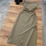 Fustan pambuk me dizajn off-shoulder dhe detaj drapimi që thekson linjat e trupit. Prerje e pastër dhe siluetë e rafinuar për një pamje femërore dhe moderne. Material i butë dhe komod. Zgjedhje perfekte për një look classy dhe tërheqës.
