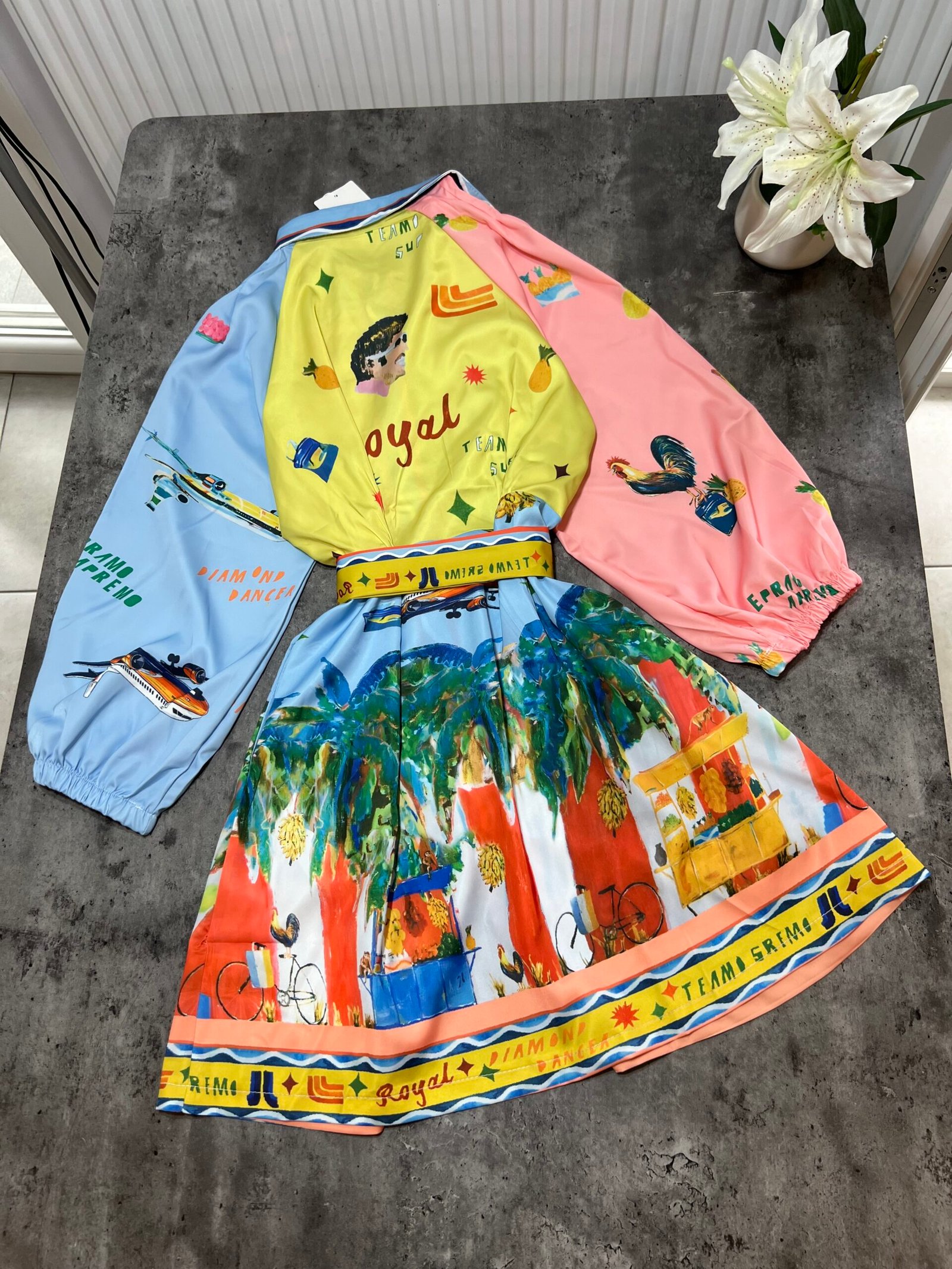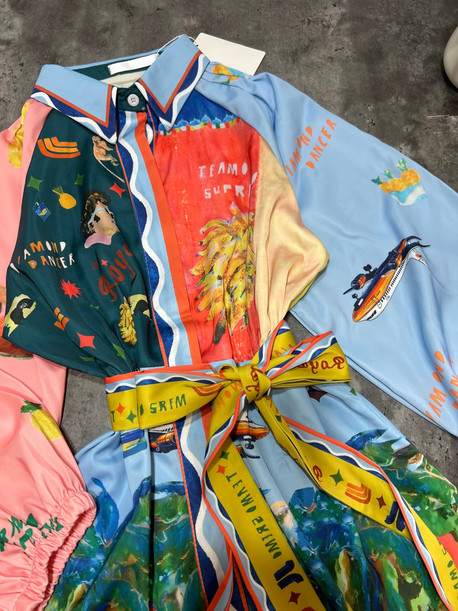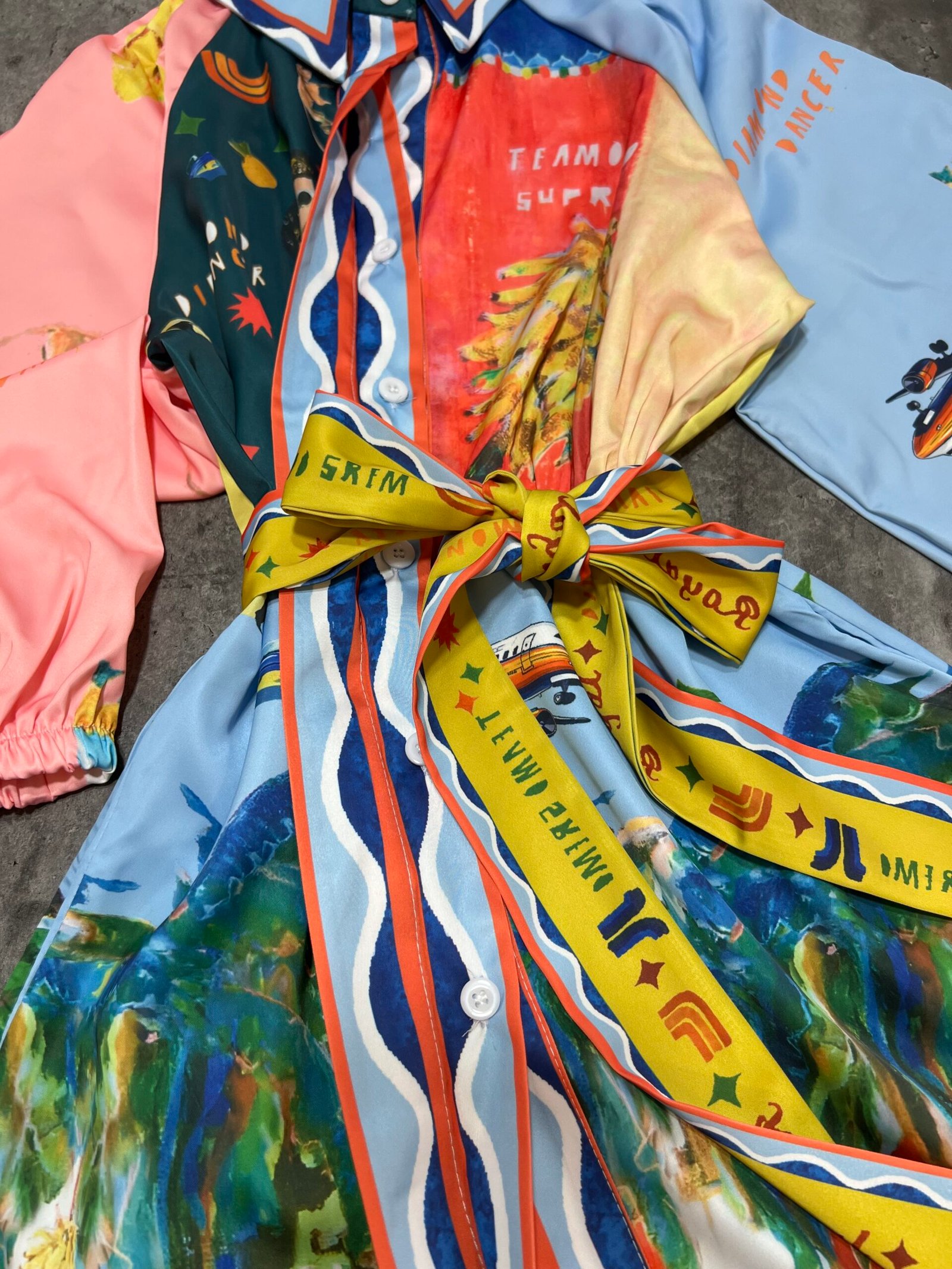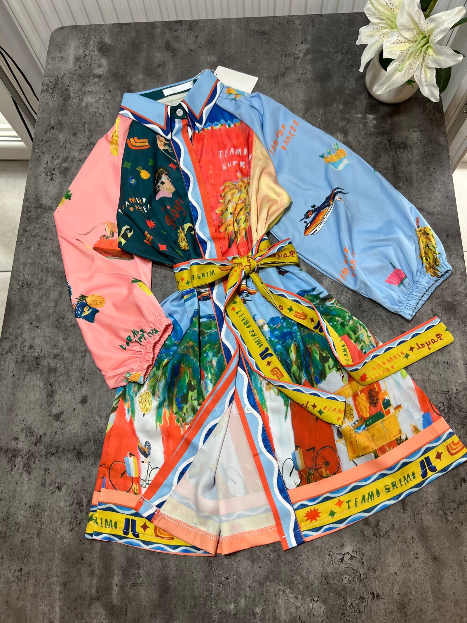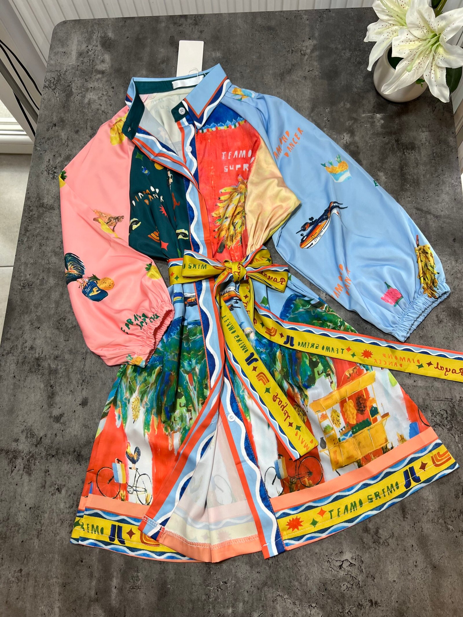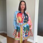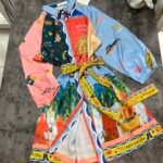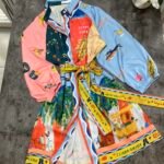 Ne stil këmishe me mbërthim kopsash të fshehura. Me xhepa funksionale. Mënge trecerekshe me llastik në pjesën fundore. Me lidhëse në bel për të definuar këtë të fundit. Sipër thekson bustin, poshtë vjen i lirshem.