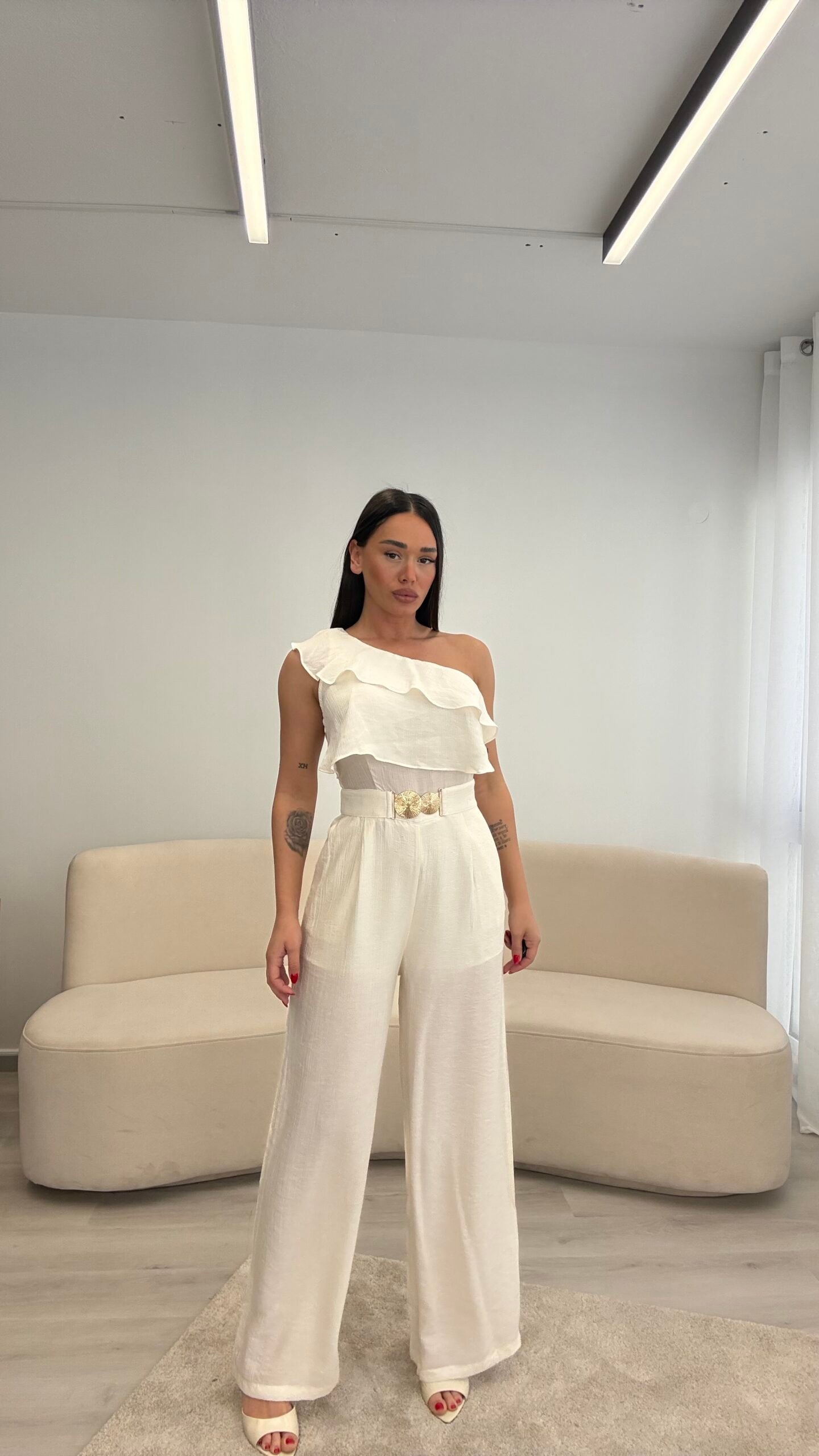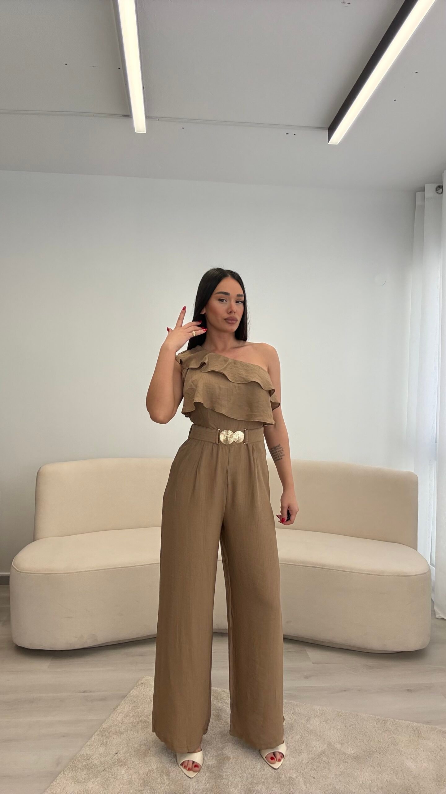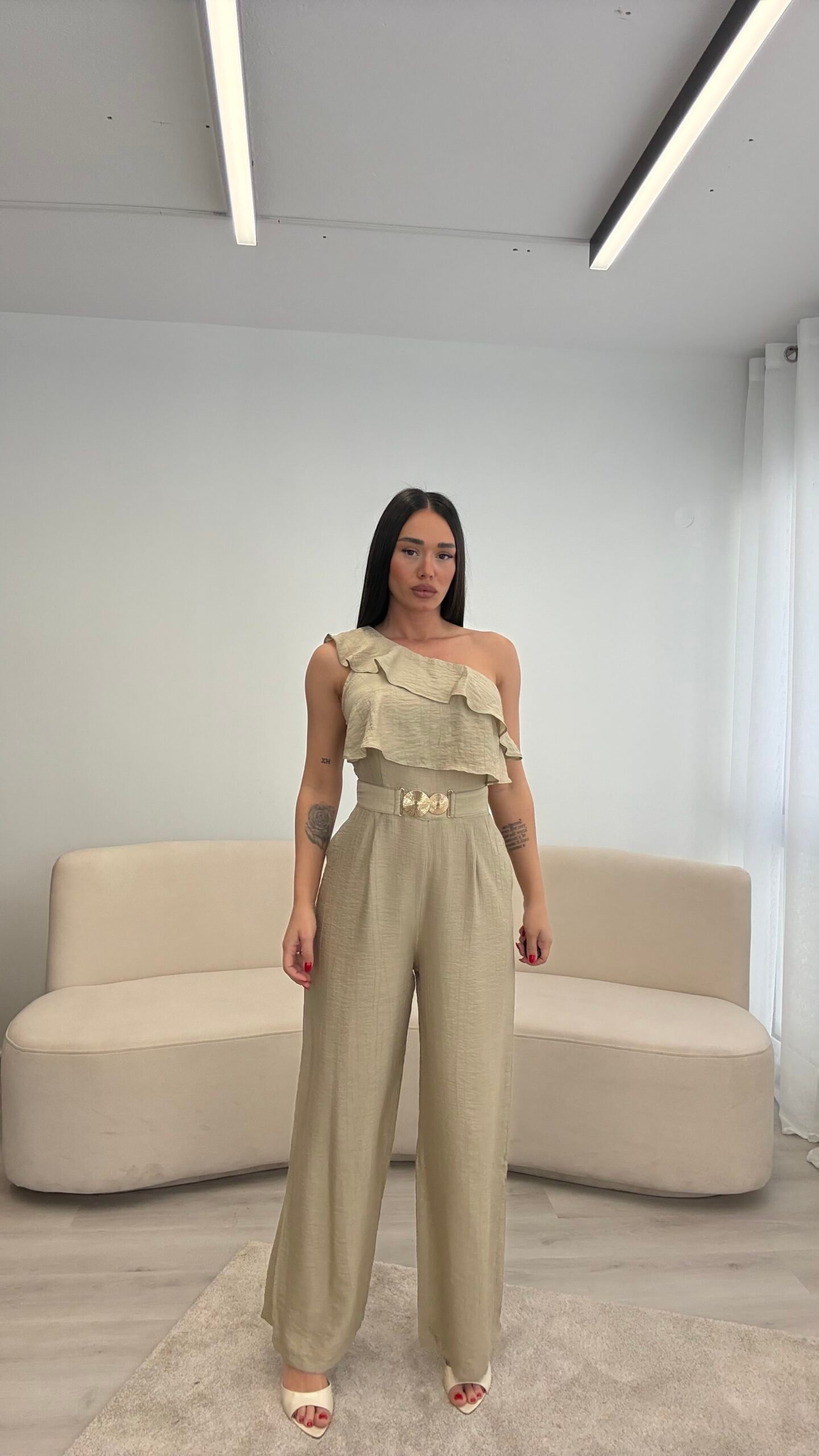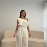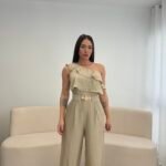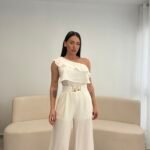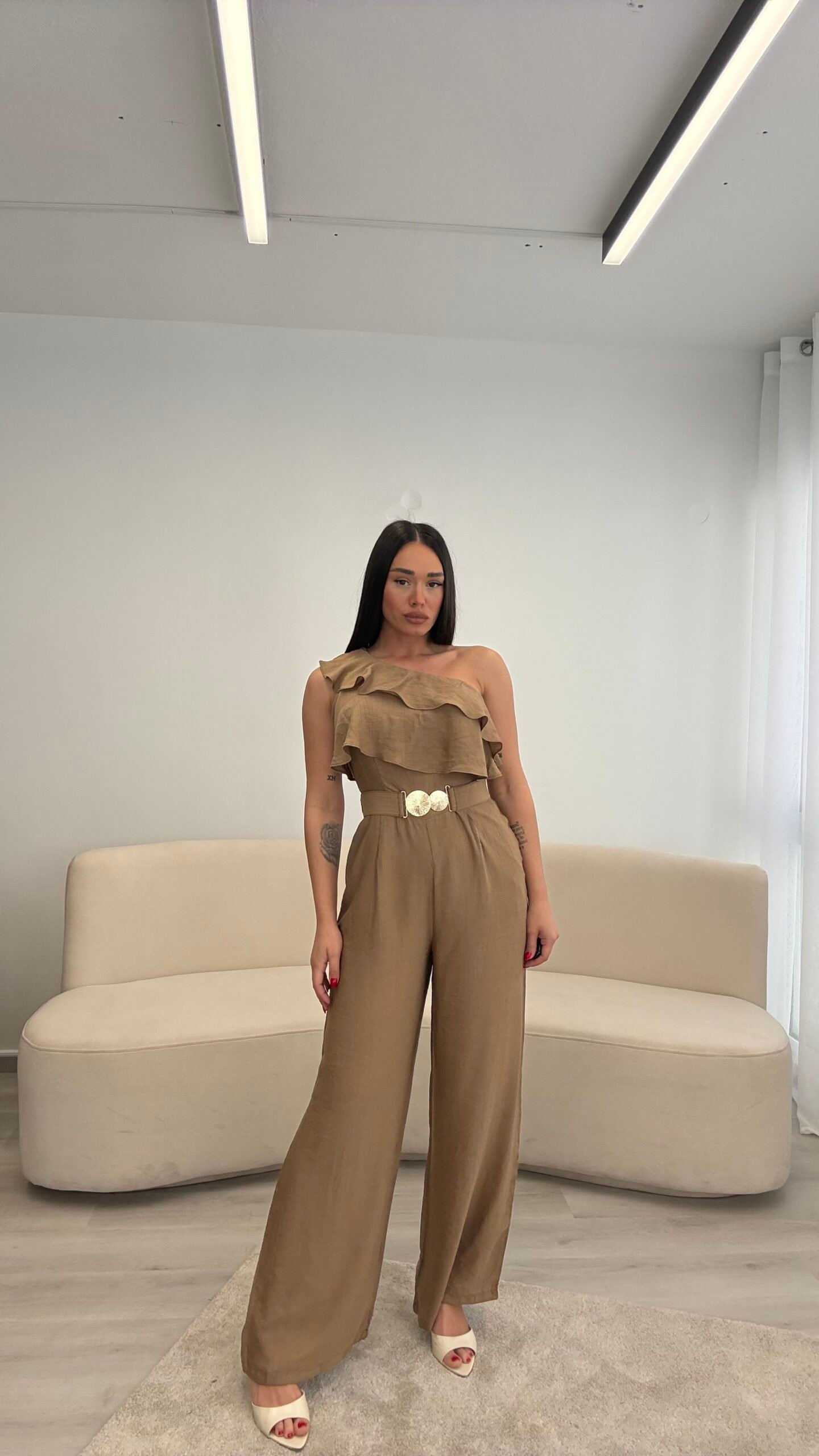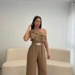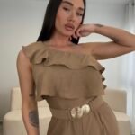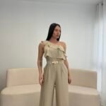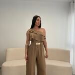 Jumpsuit elegant me një sup dhe detaj me pala në pjesën e sipërme, i kombinuar me pantallona të gjera për një siluetë të gjatë dhe elegante. Vjen me rrip dekorativ që thekson belin dhe i jep një look modern dhe classy. Material i lehtë dhe i rehatshëm, ideal për evente, darka dhe dalje speciale.
