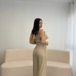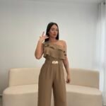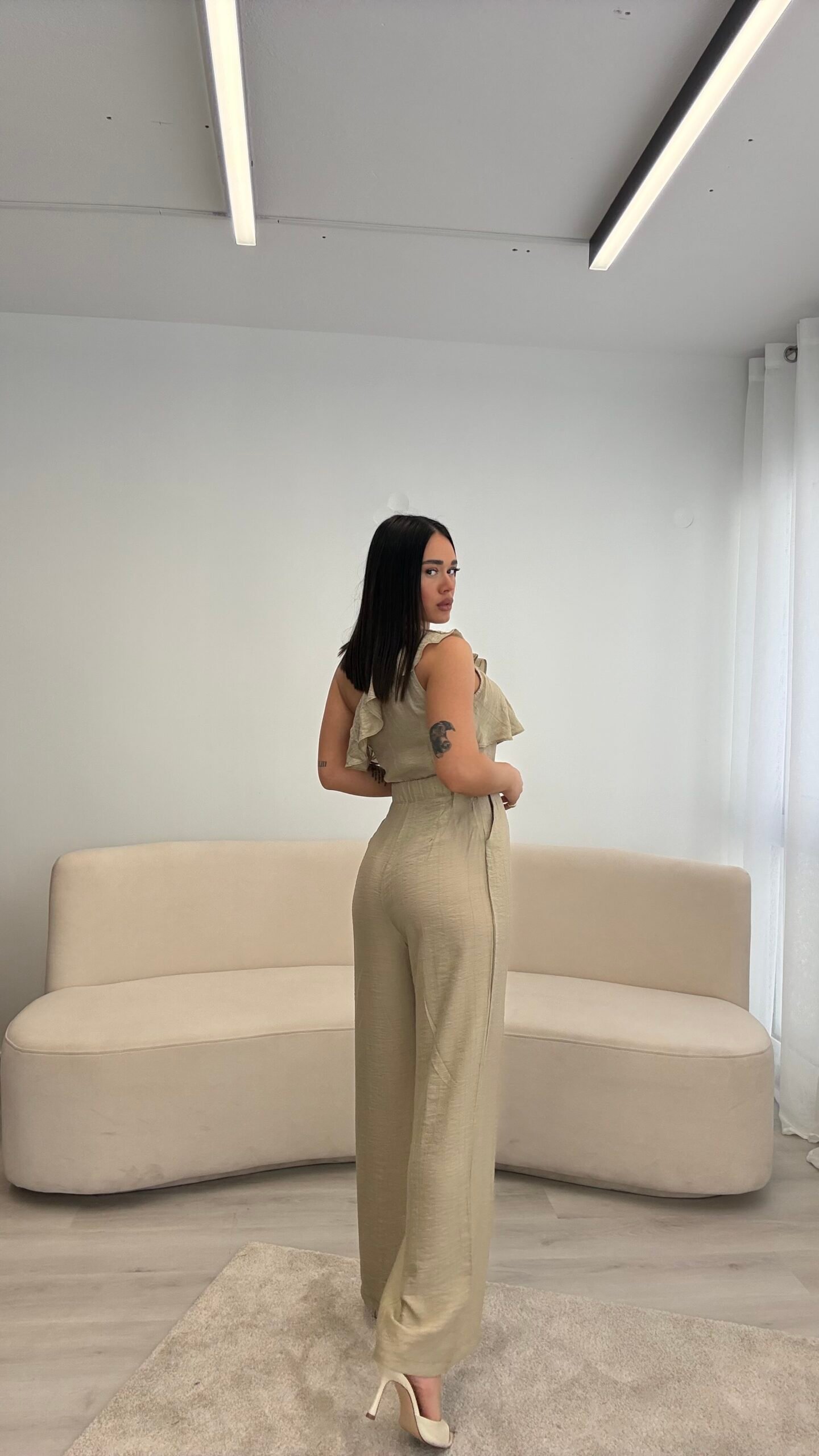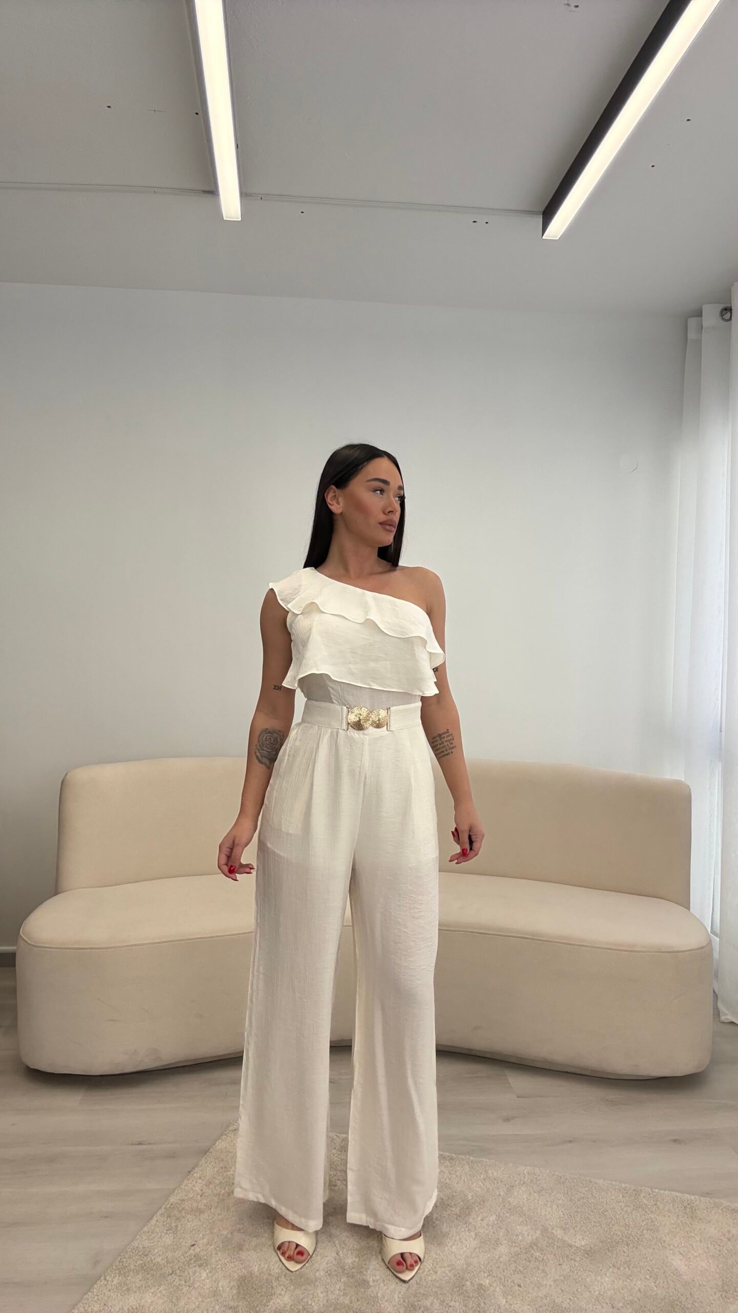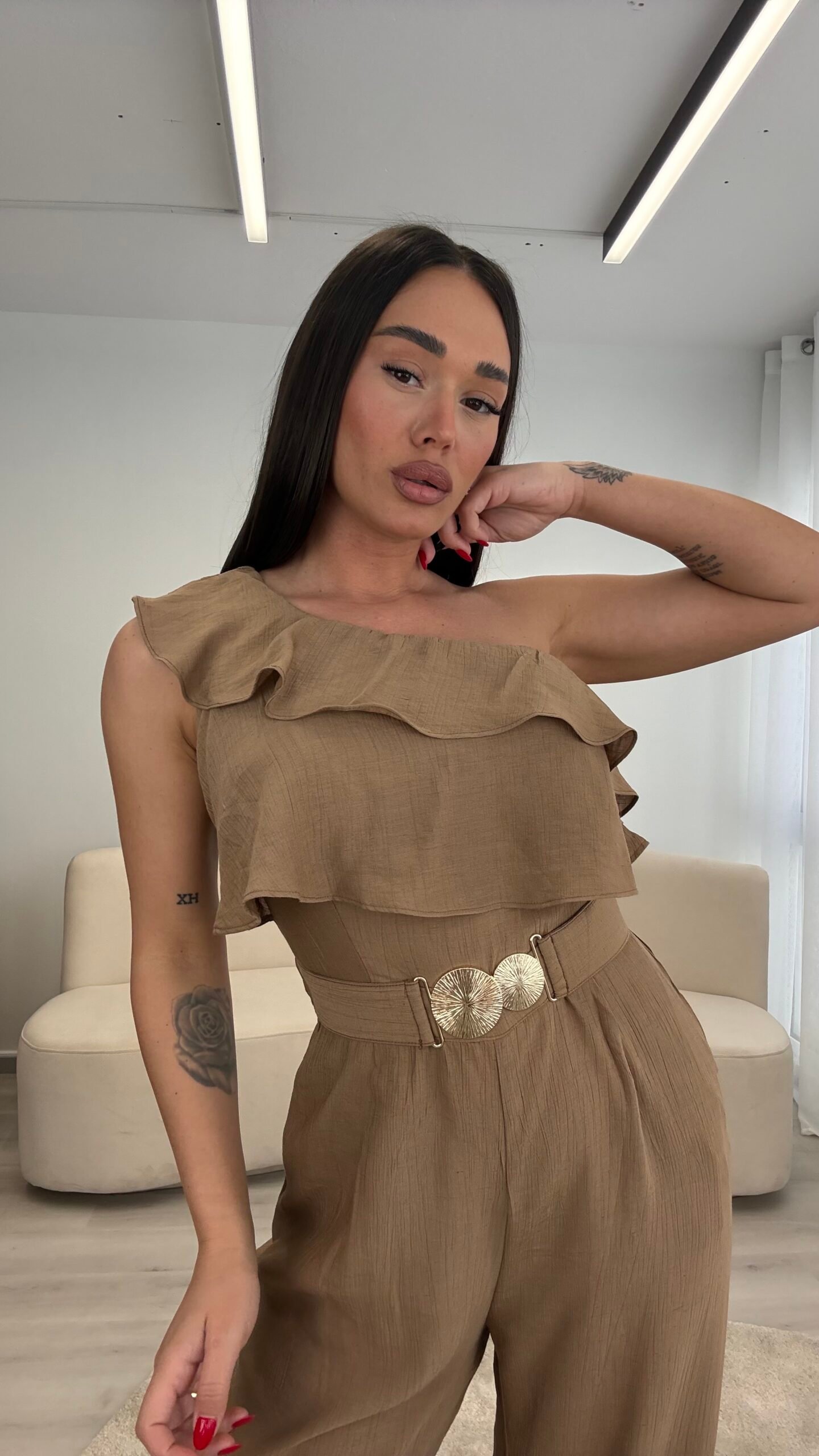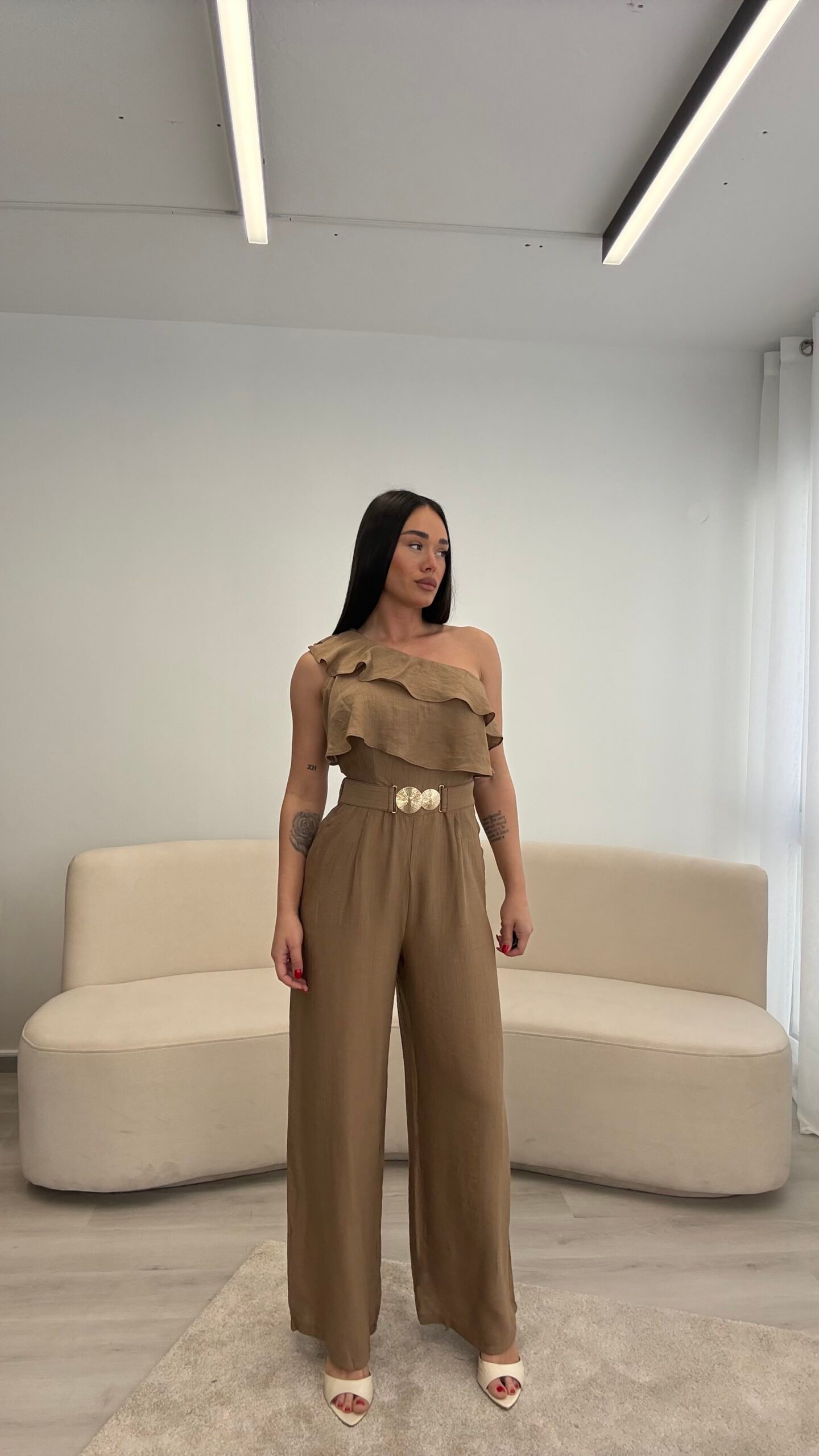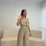 Jumpsuit elegant me një sup dhe detaj me pala në pjesën e sipërme, i kombinuar me pantallona të gjera për një siluetë të gjatë dhe elegante. Vjen me rrip dekorativ që thekson belin dhe i jep një look modern dhe classy. Material i lehtë dhe i rehatshëm, ideal për evente, darka dhe dalje speciale.