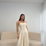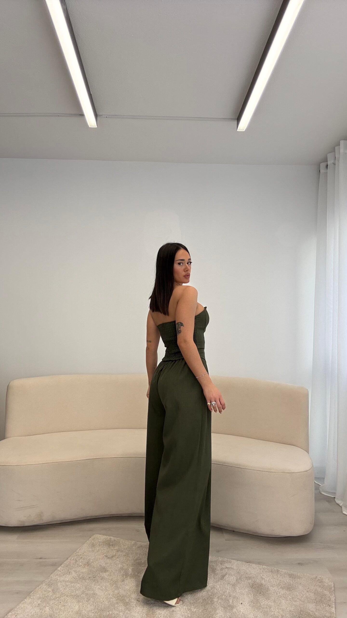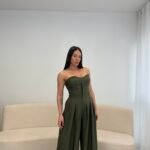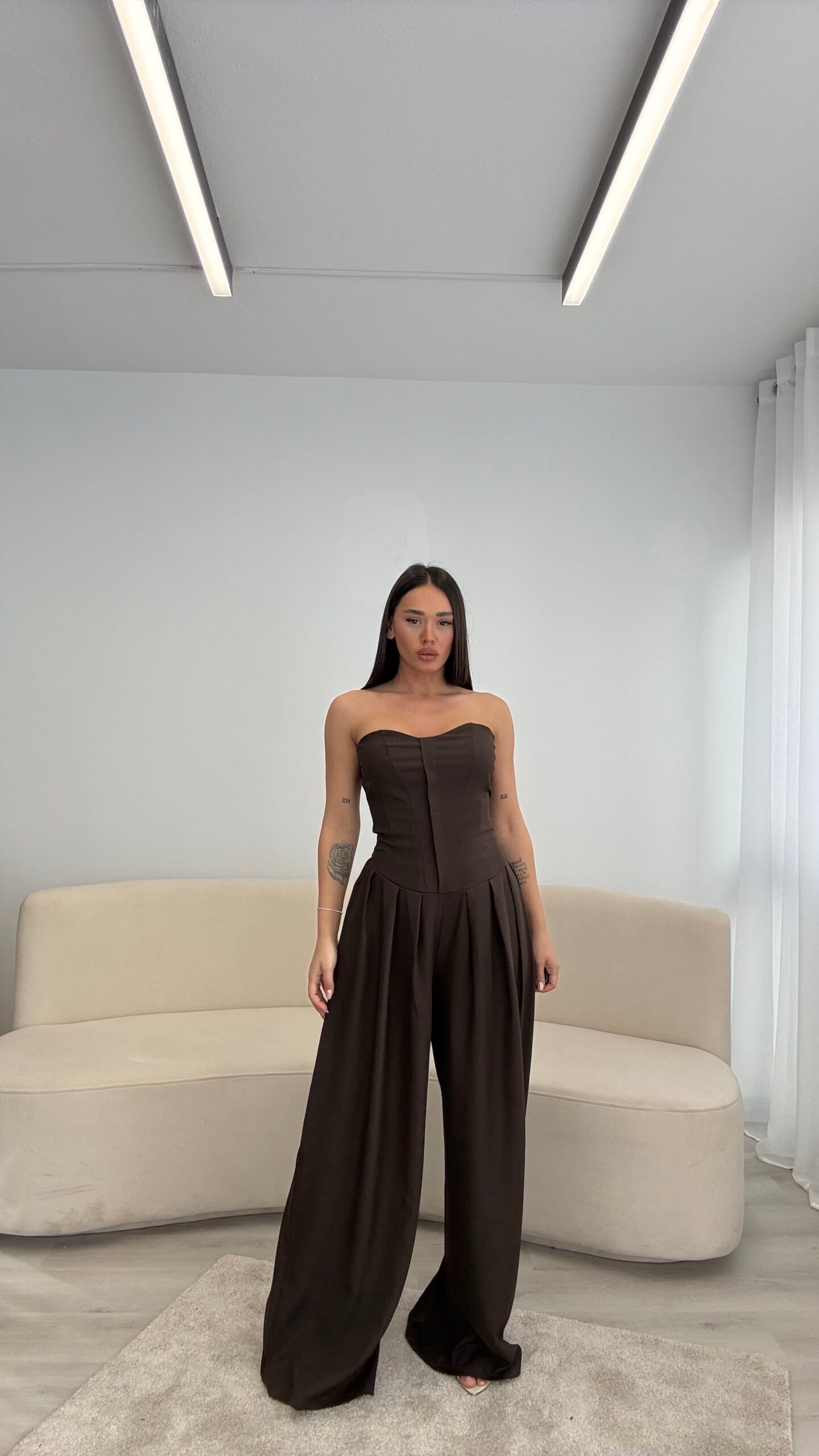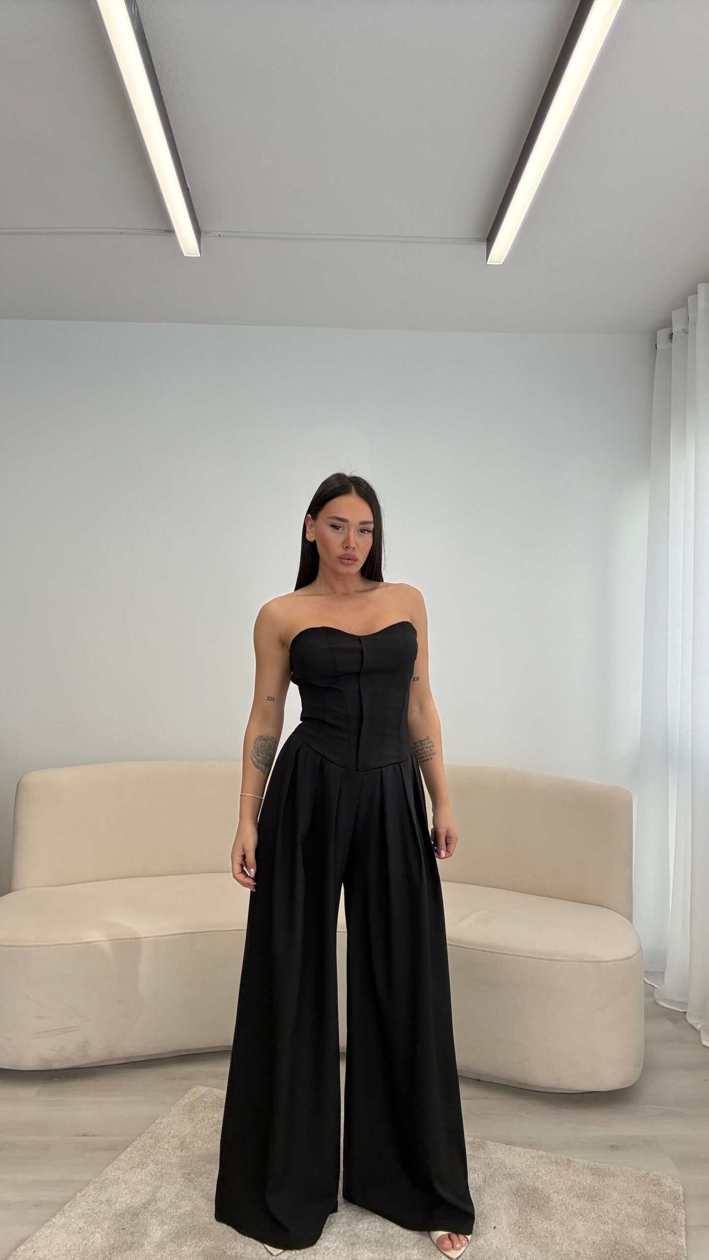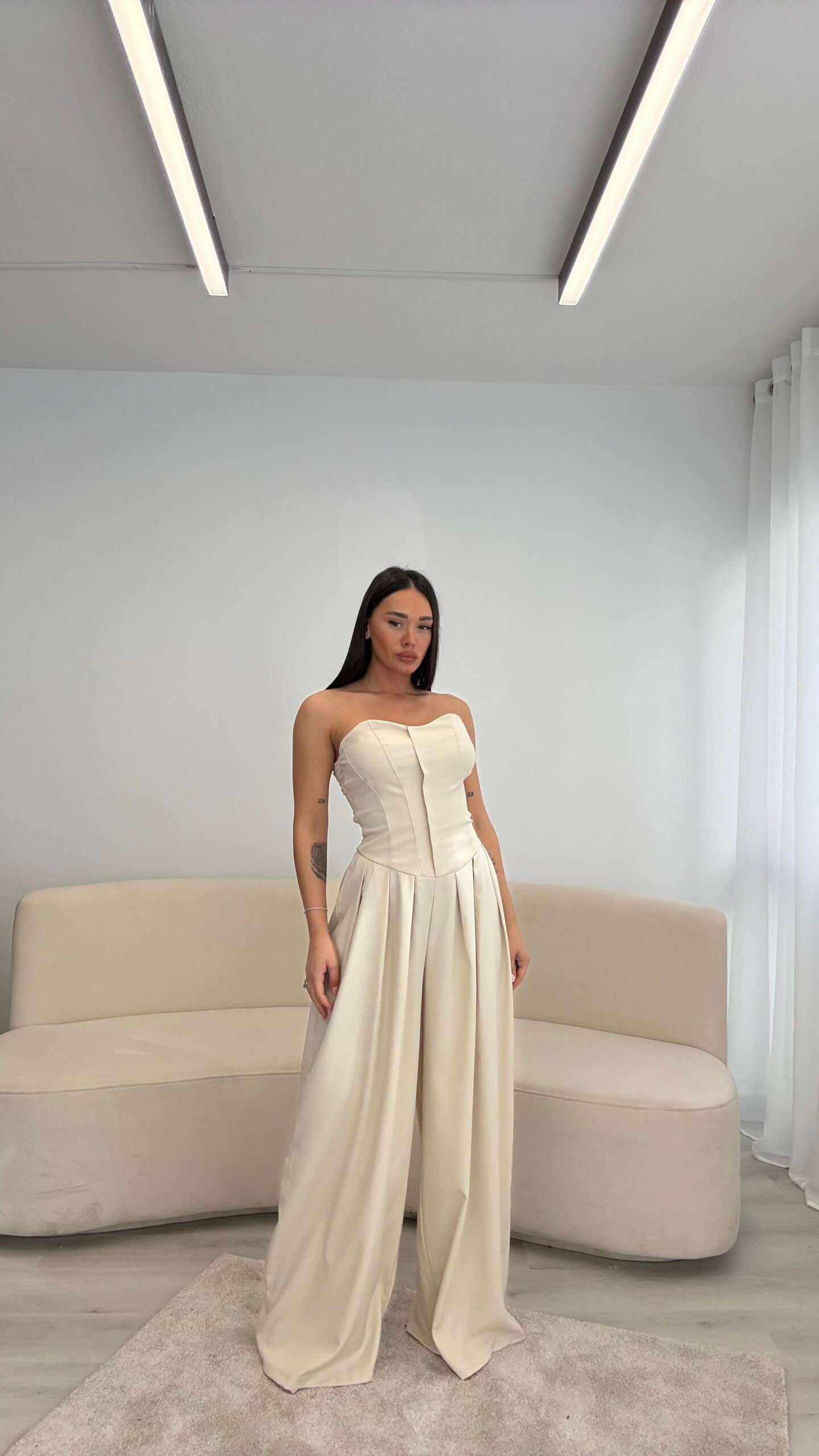 Jumpsuit modern me bust stil corset që formon bukur trupin dhe pantallona wide leg për elegancë dhe rehati. Material i lehtë dhe prerje fluide që jep look të pastër, chic dhe shumë femëror. Ideal për evente, darka apo outfit-e classy në verë.