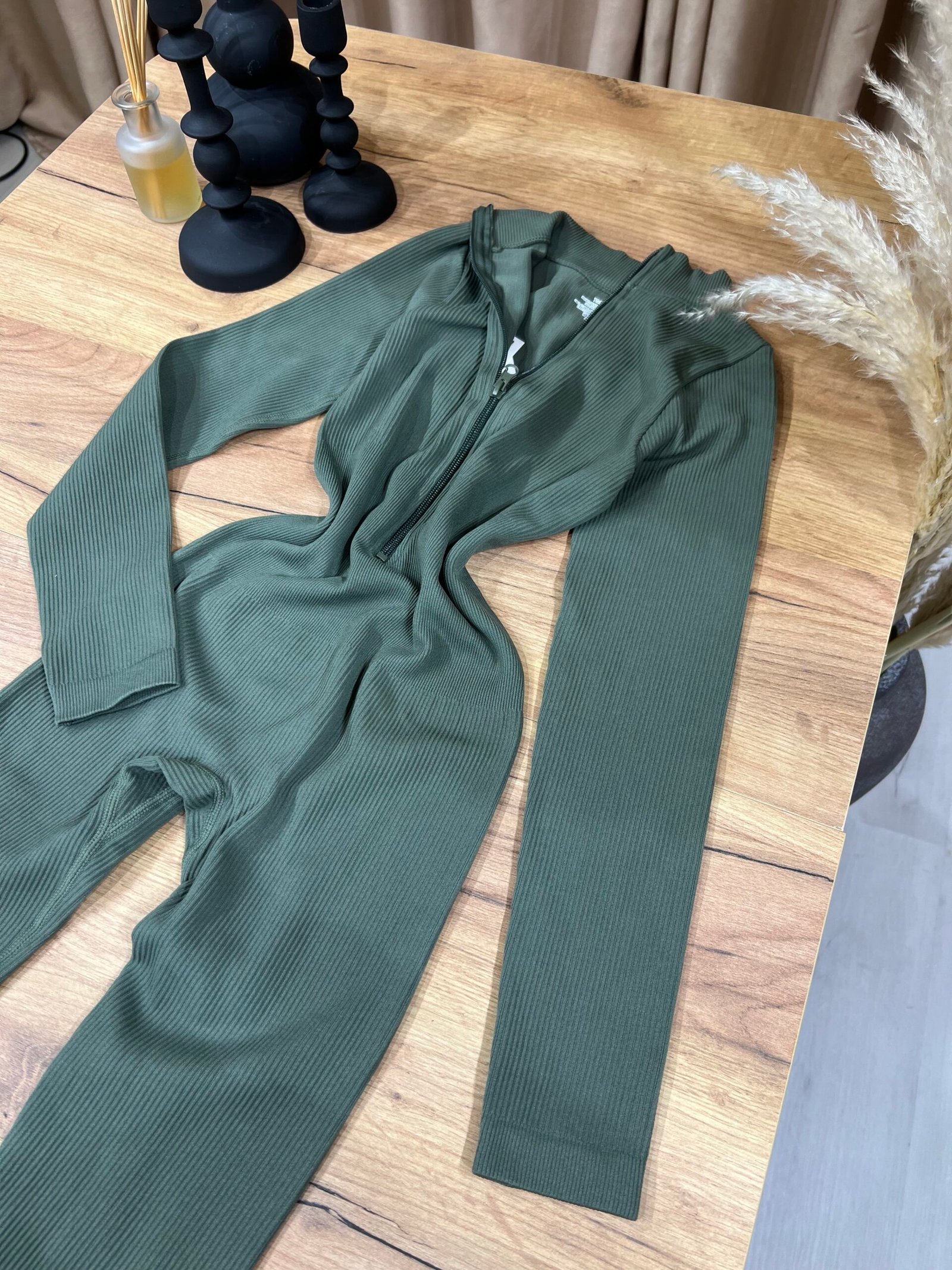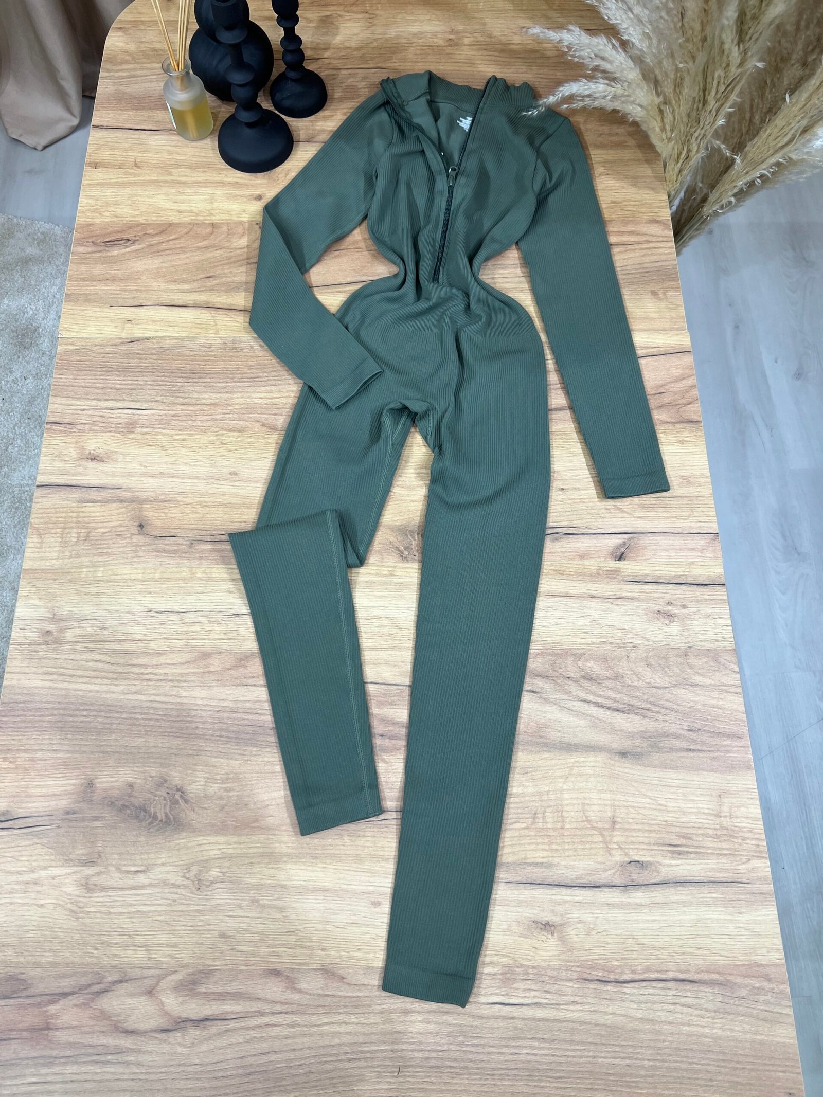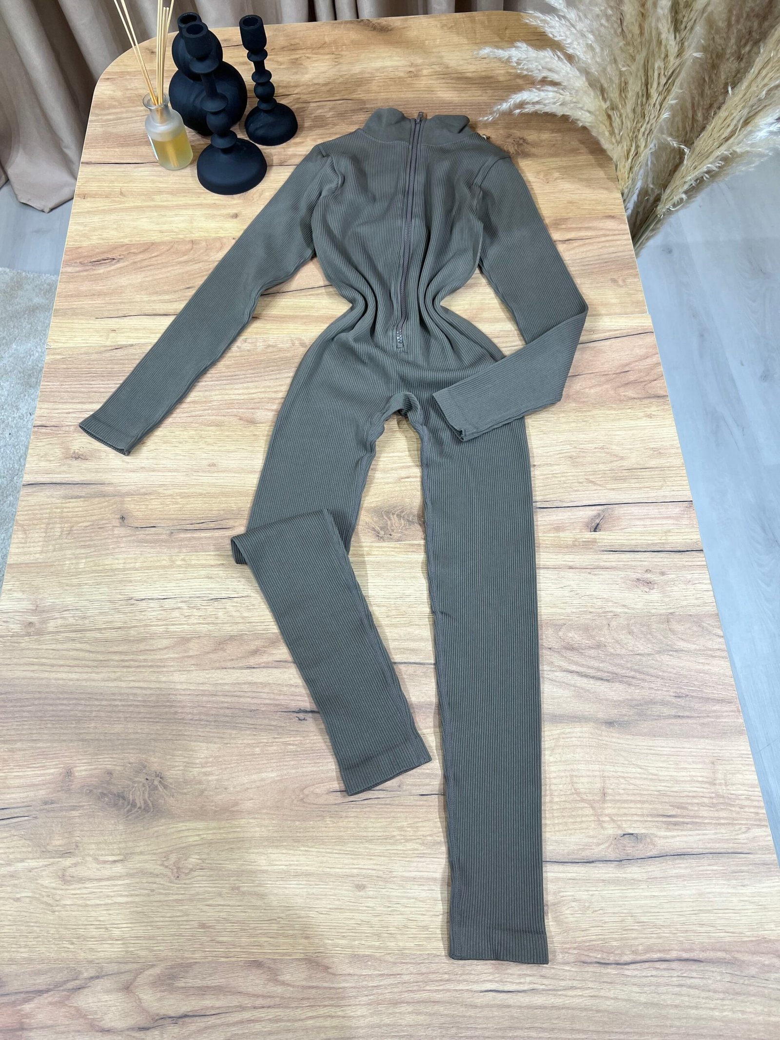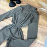 Jumpsuit modern me material ribbed elastik, prerje që përshtatet perfekt pas trupit dhe zinxhir përpara që thekson siluetën. Dizajni minimal me jakë të lartë krijon një look clean, sport-chic dhe shumë aktual. Ideal për veshje të përditshme, udhëtime, kombinime casual urbane apo stil athleisure me elegancë të thjeshtë.